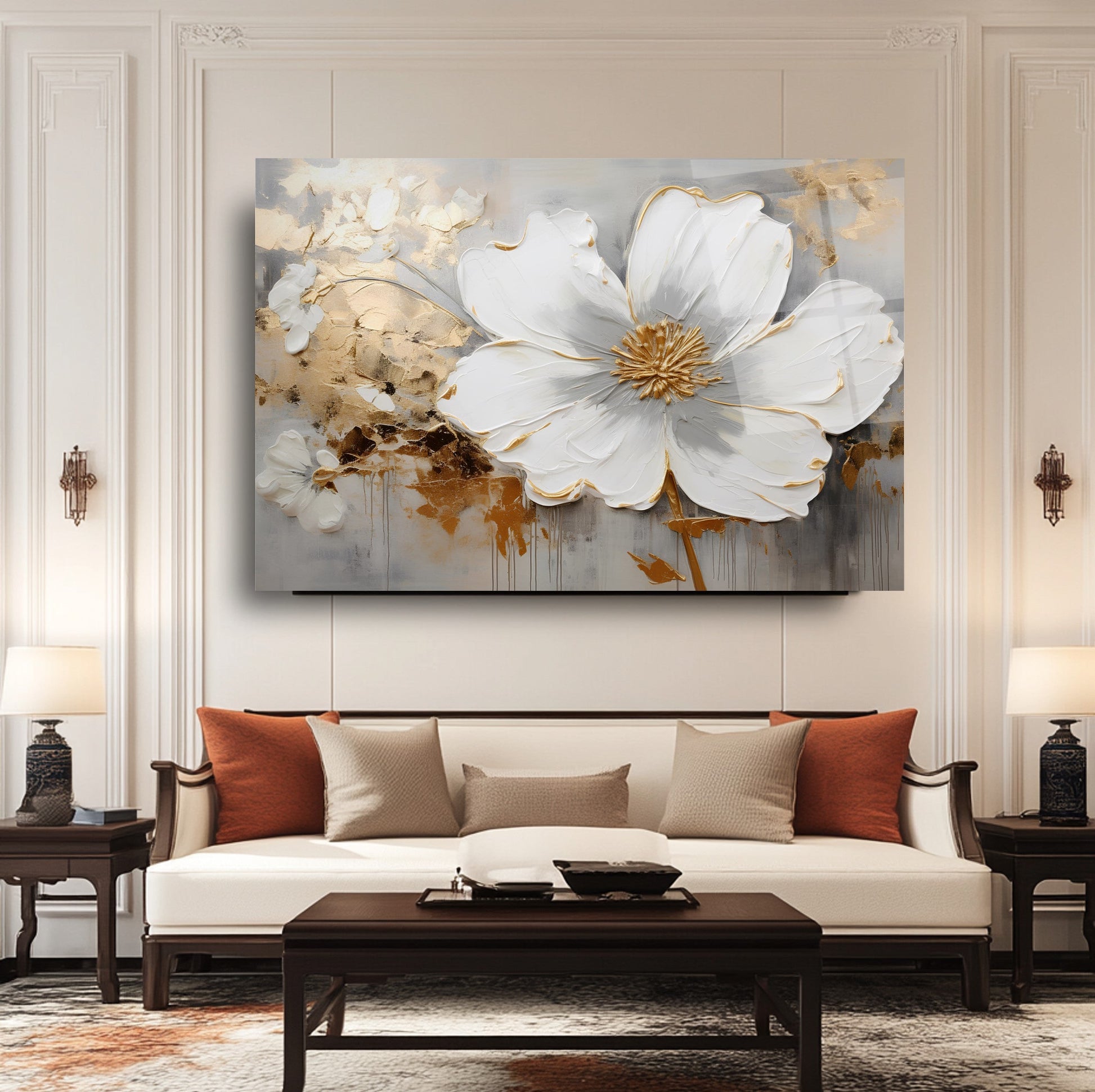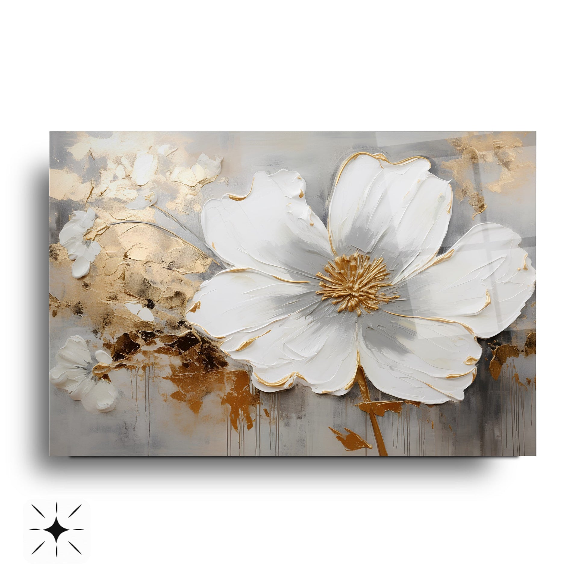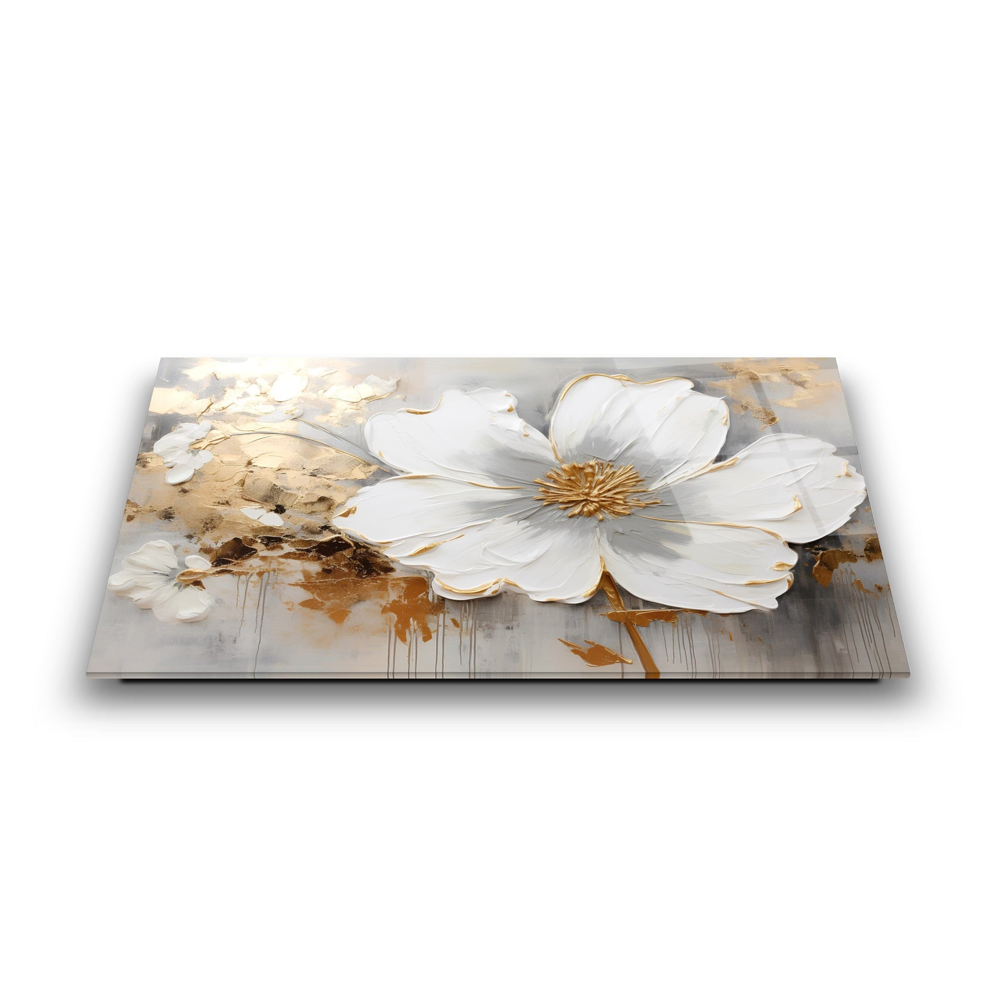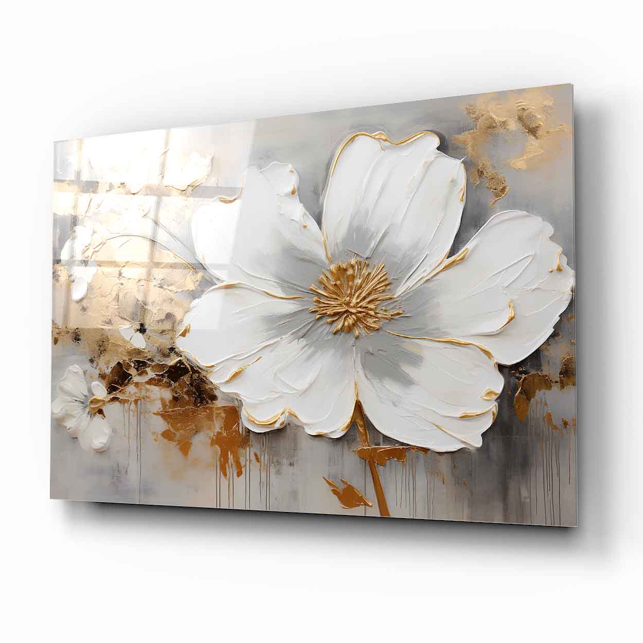 Camdeko'nun Gold Detay Beyaz Çiçekler Cam Tablosu, zarif tasarımıyla yaşam alanlarınıza sofistike bir dokunuş katıyor. Beyaz çiçeklerin altın detaylarla buluştuğu bu tablo, modern ve şık bir atmosfer yaratır.