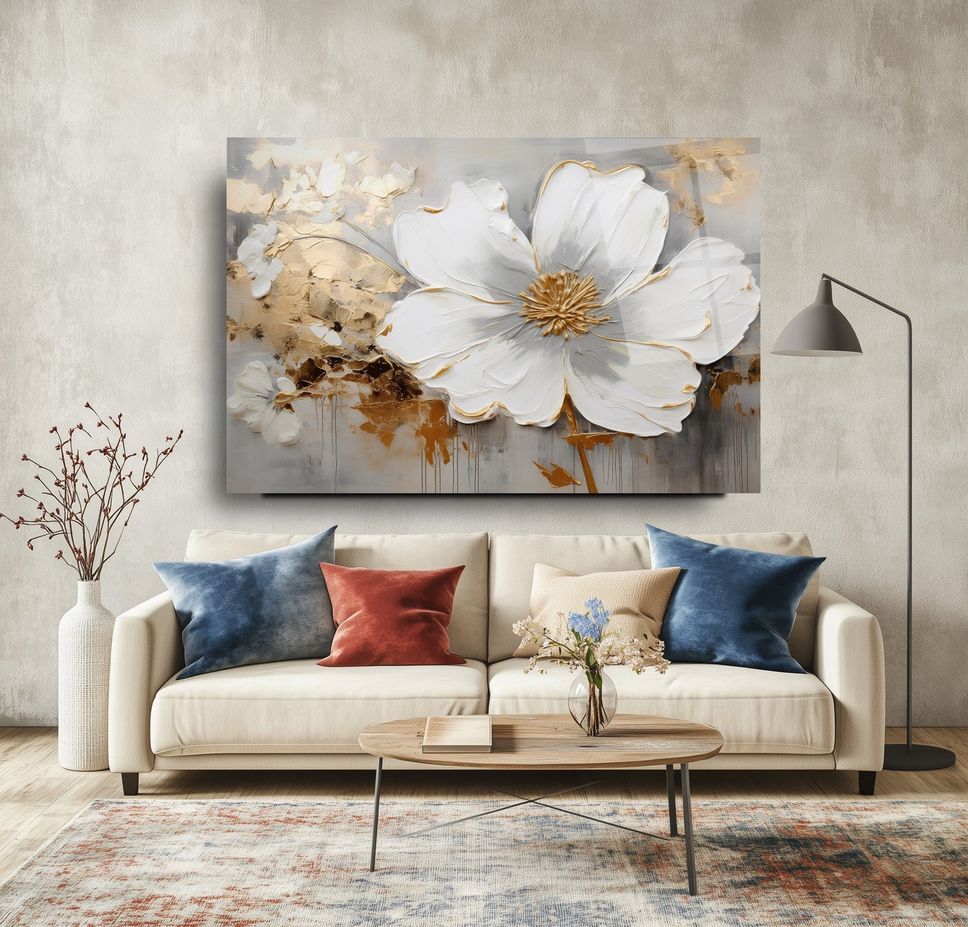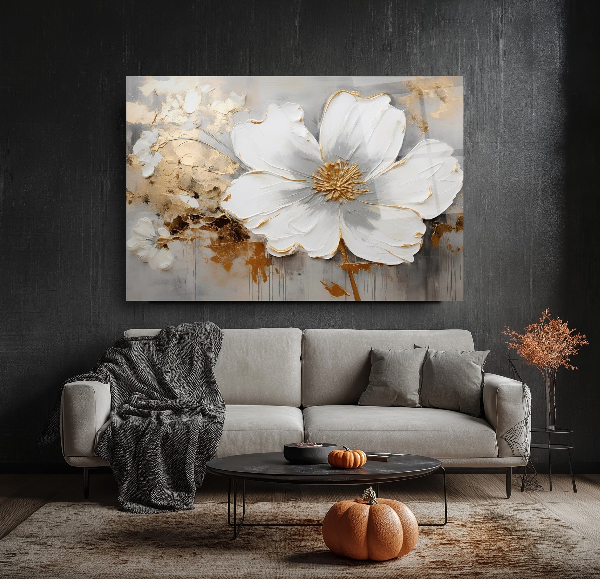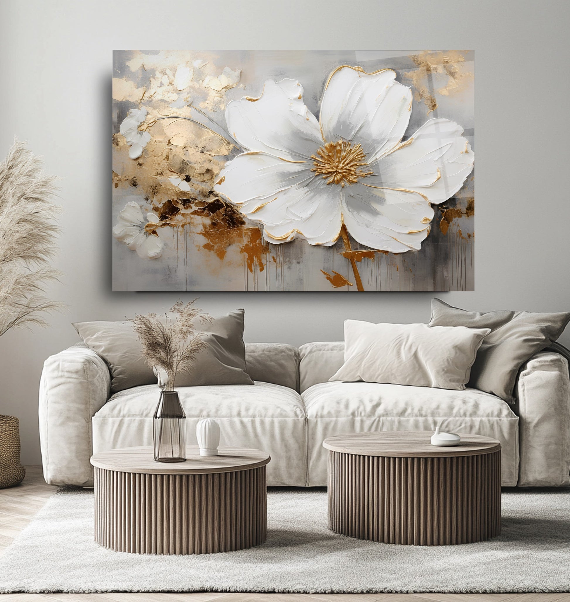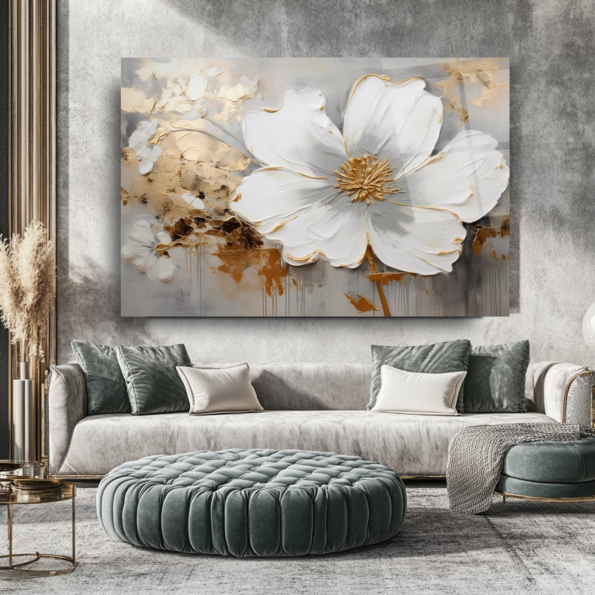 Camdeko'nun Gold Detay Beyaz Çiçekler Cam Tablosu, zarif tasarımıyla yaşam alanlarınıza sofistike bir dokunuş katıyor. Beyaz çiçeklerin altın detaylarla buluştuğu bu tablo, modern ve şık bir atmosfer yaratır.