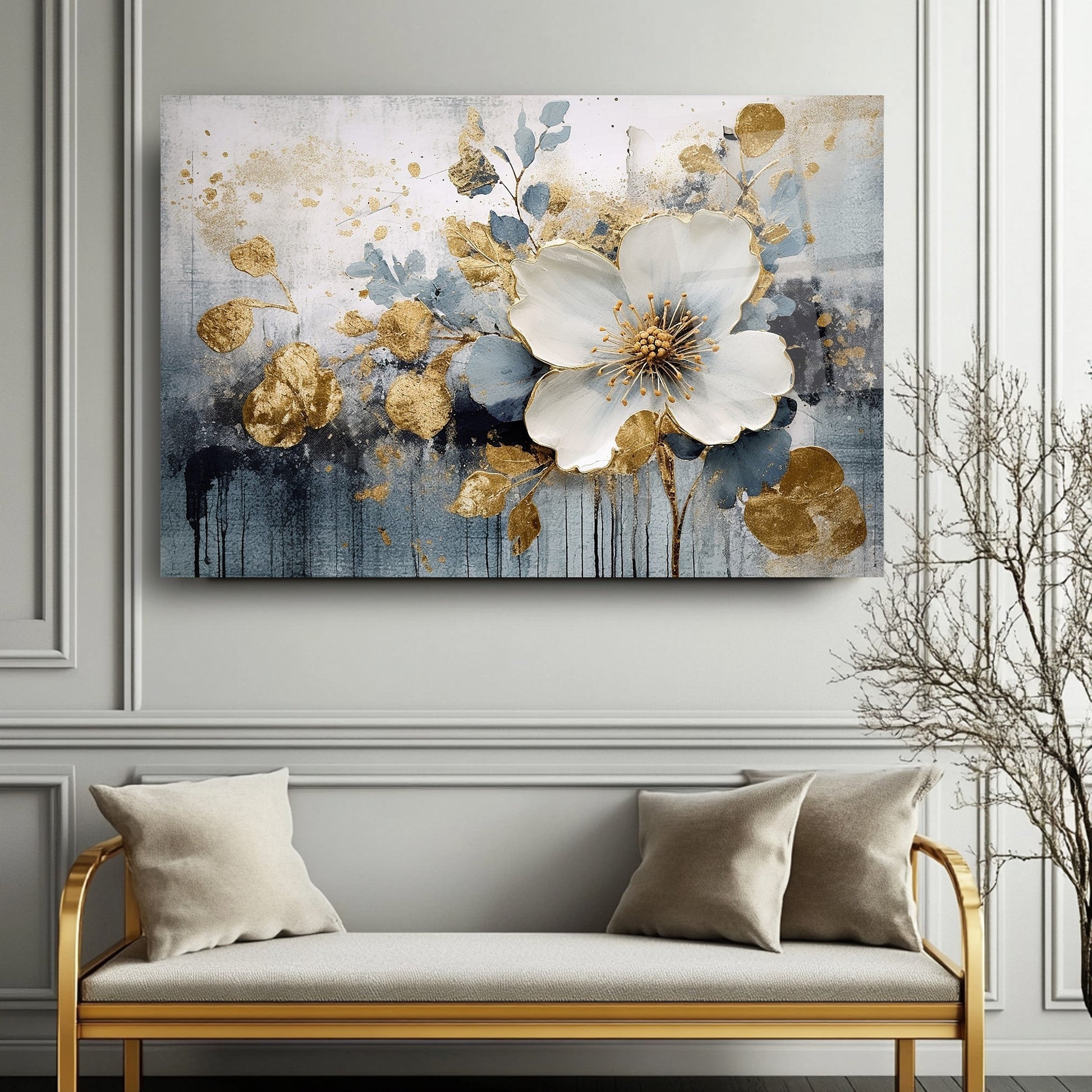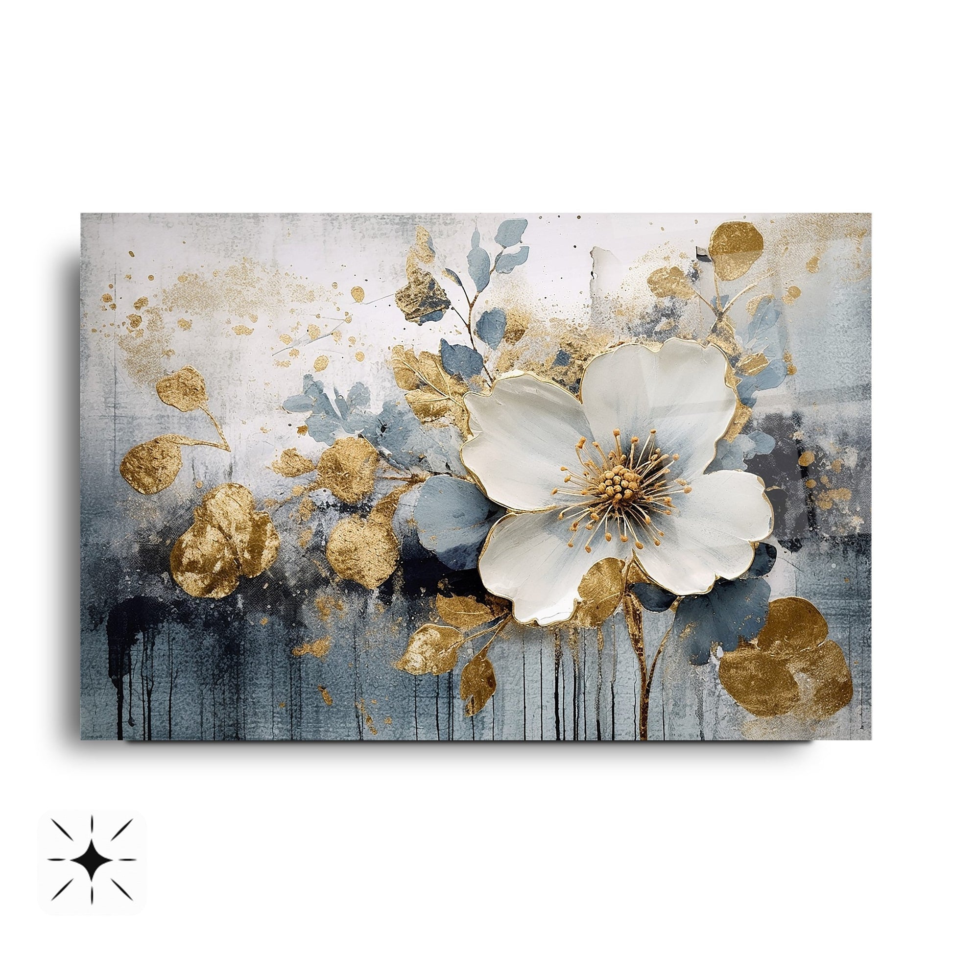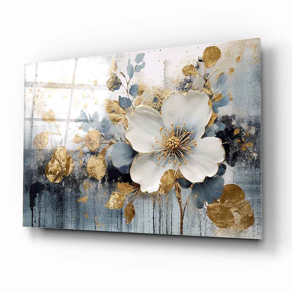 Gold detayların beyaz ve lacivert eskitme dokusuyla buluştuğu bu 3 boyutlu gerçek cam tablo, şıklığı ve derinliği yaşam alanlarına taşır. Kırılmaz cam tablo yapısıyla dayanıklı ve estetik bir dekorasyon seçeneğidir. Modern ve klasik mekanlarda fark yaratmak isteyenler için ideal bir cam tablo tercihidir.