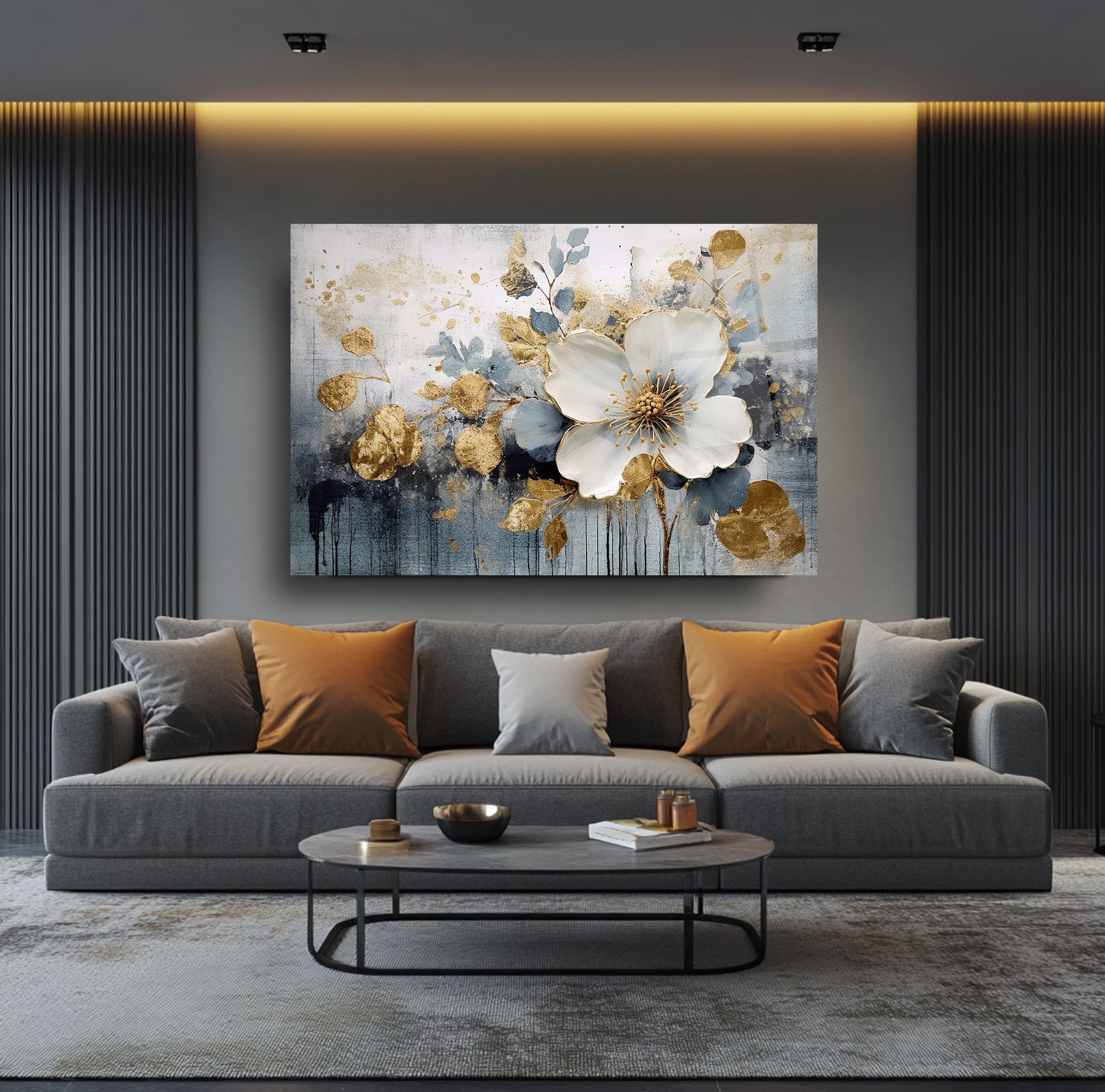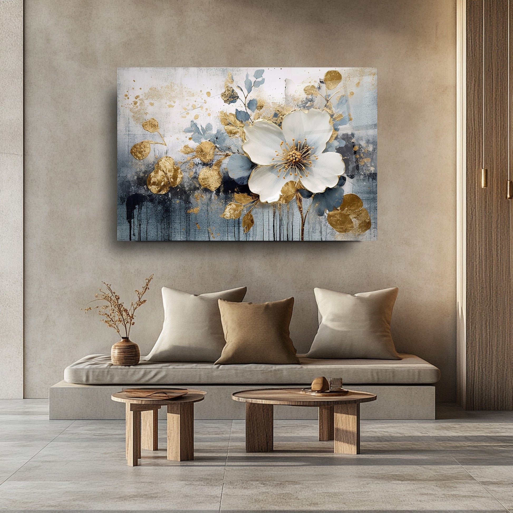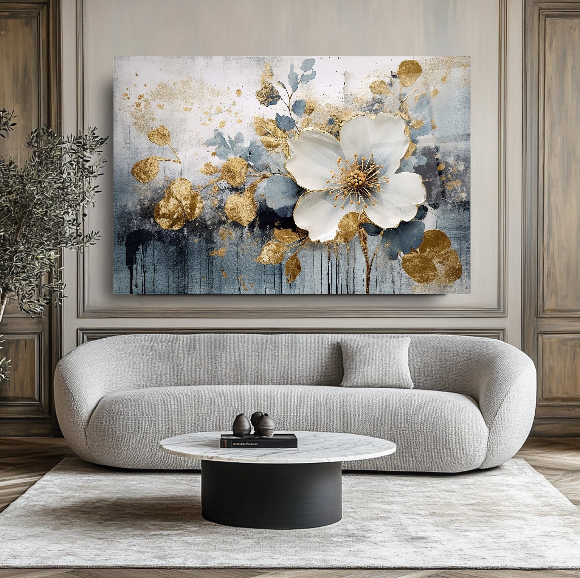 Gold detayların beyaz ve lacivert eskitme dokusuyla buluştuğu bu 3 boyutlu gerçek cam tablo, şıklığı ve derinliği yaşam alanlarına taşır. Kırılmaz cam tablo yapısıyla dayanıklı ve estetik bir dekorasyon seçeneğidir. Modern ve klasik mekanlarda fark yaratmak isteyenler için ideal bir cam tablo tercihidir.