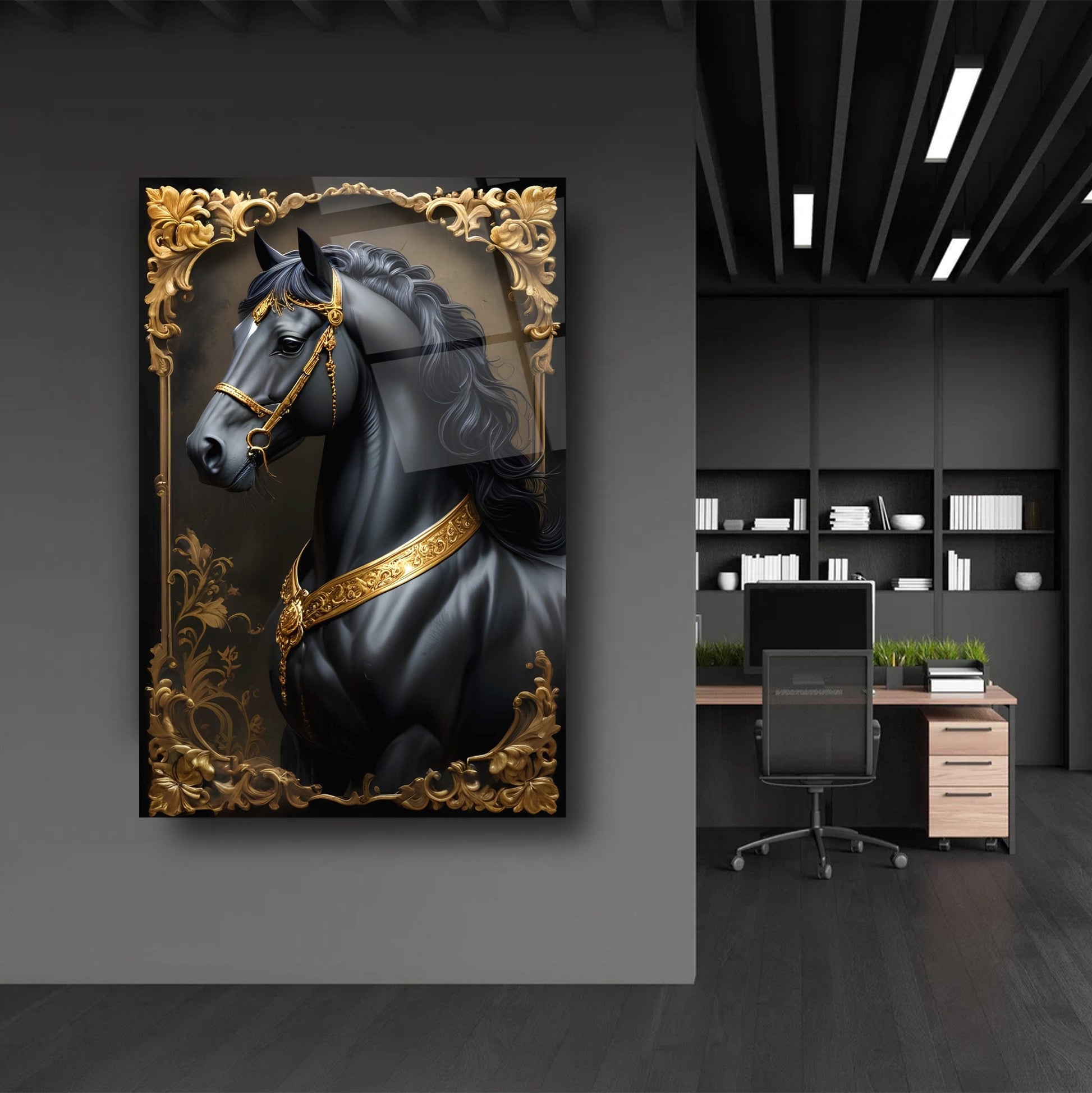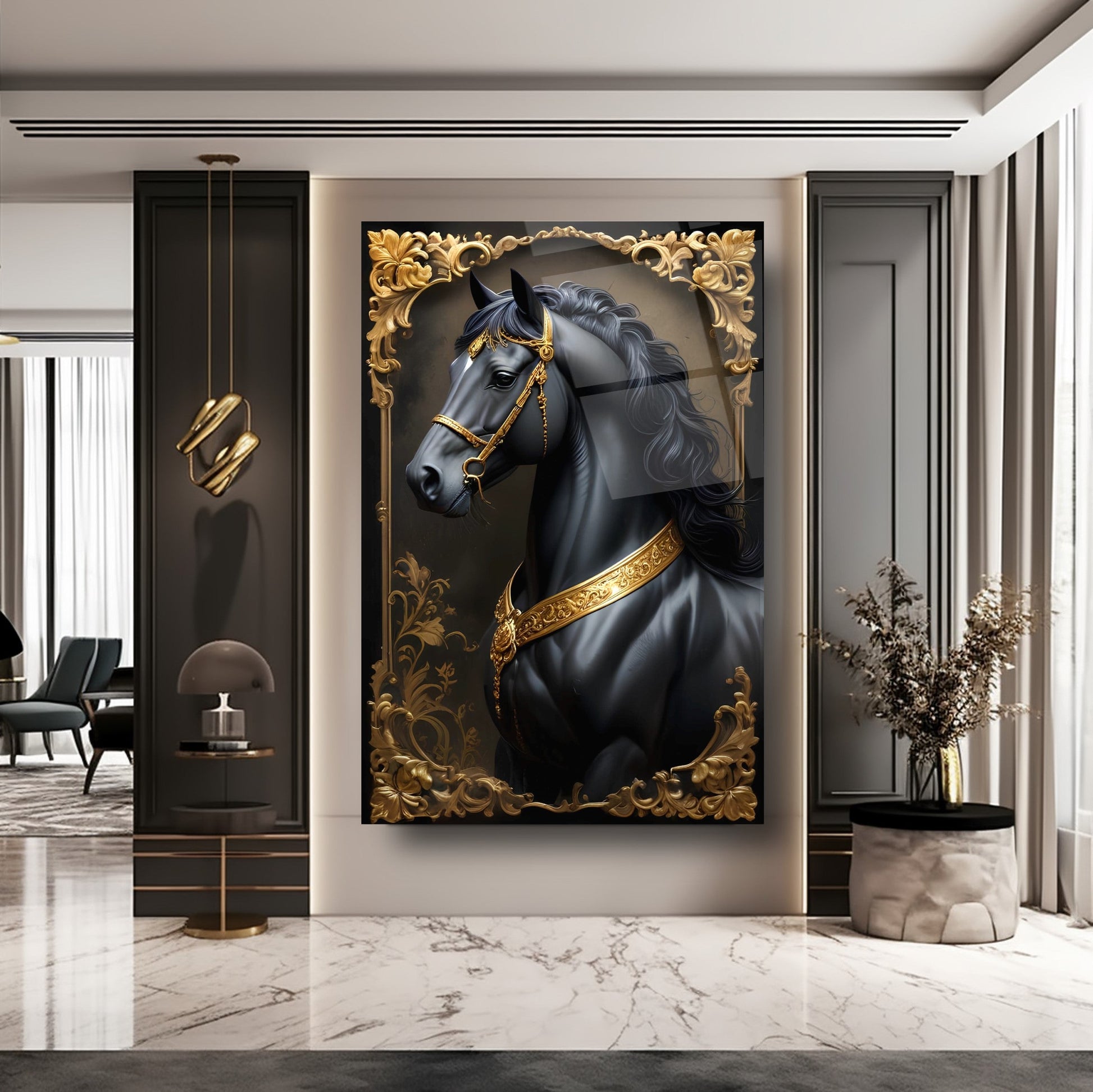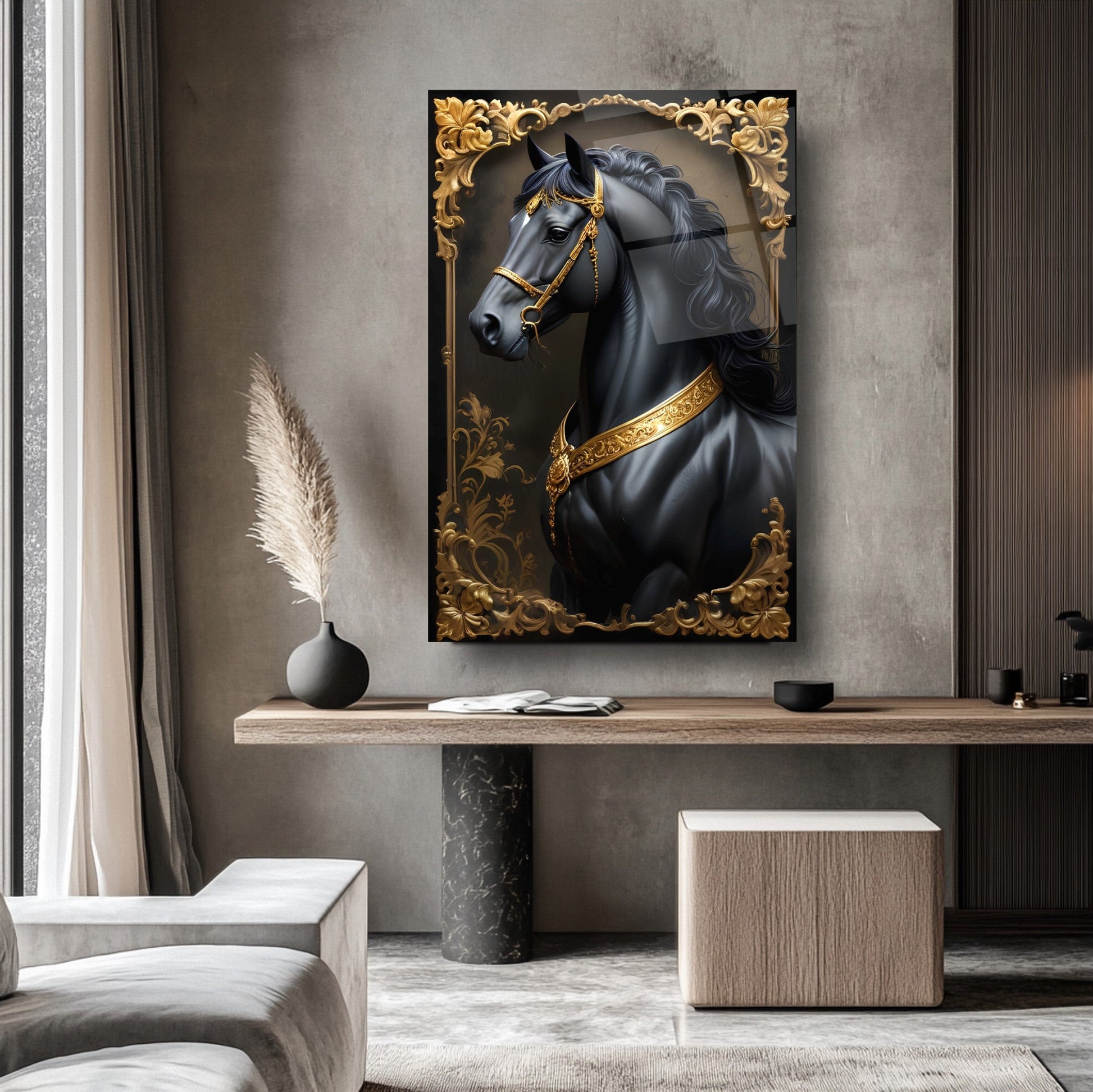 Vahşi Asaletin Lüks Yorumu: Gold Detay Çerçeve Siyah At Cam Tablo