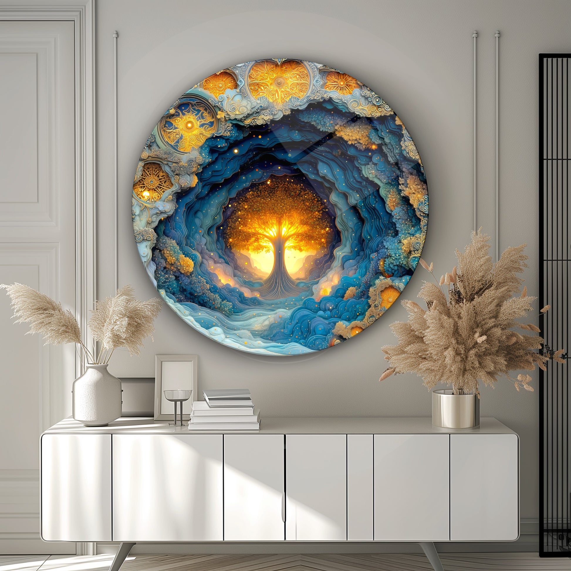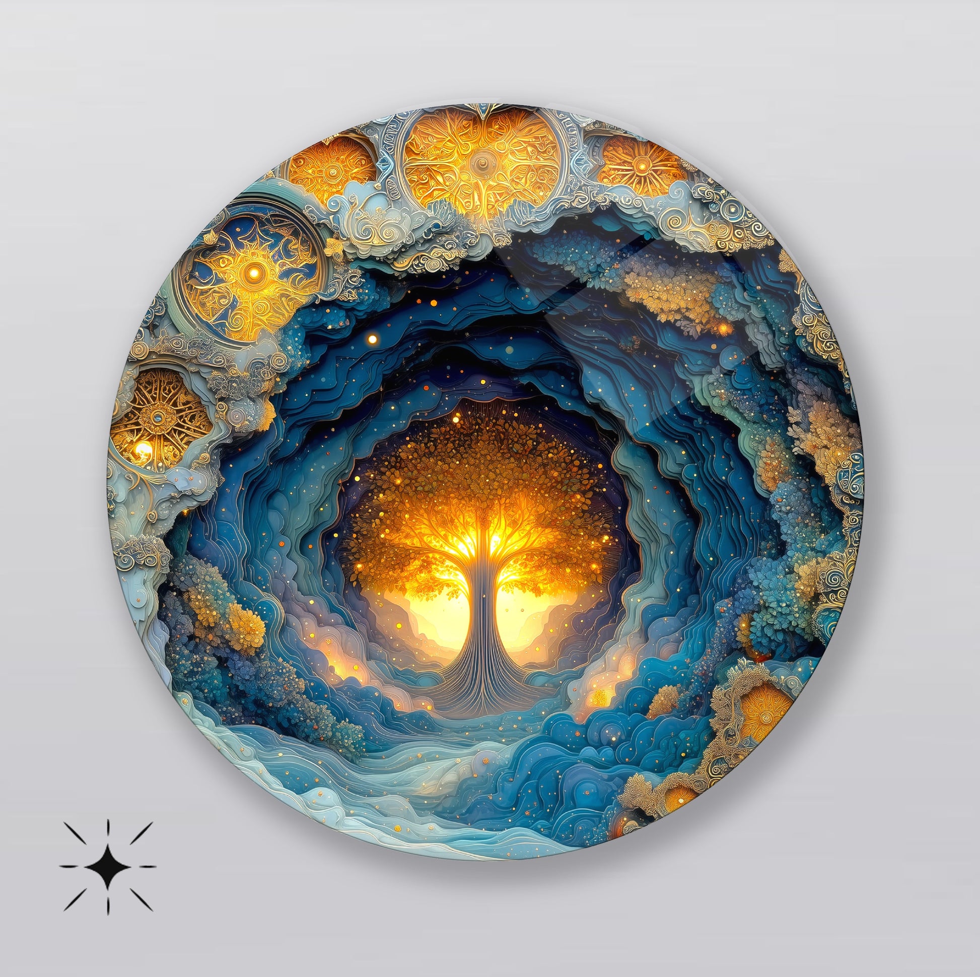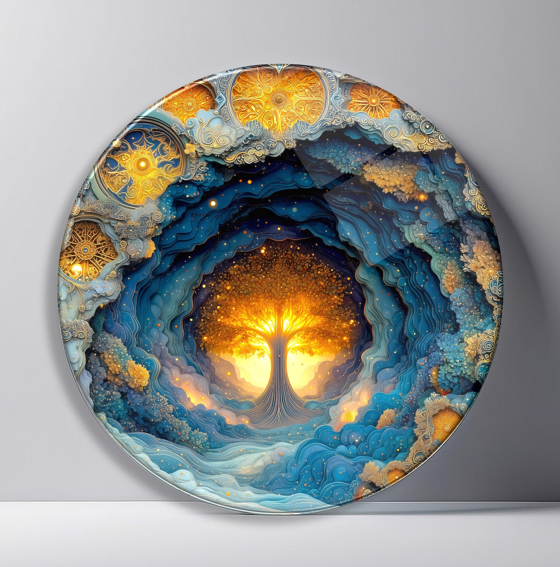 Gold Detay Hayat Ağacı Yuvarlak Cam Tablo