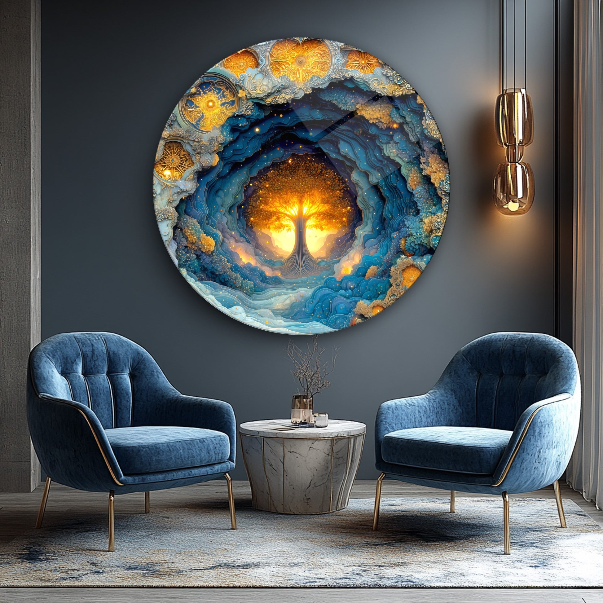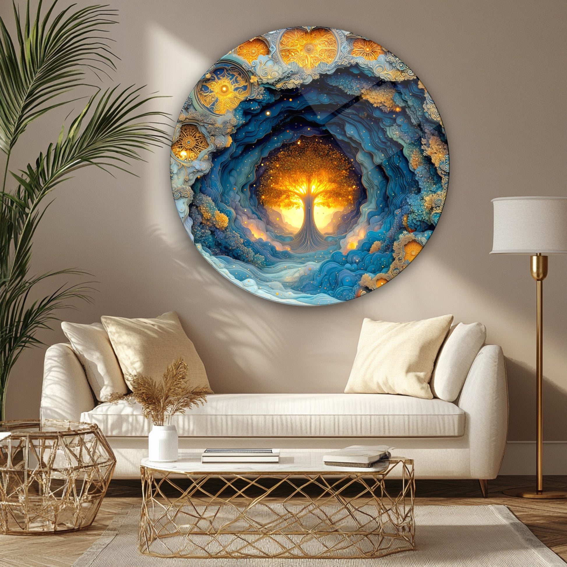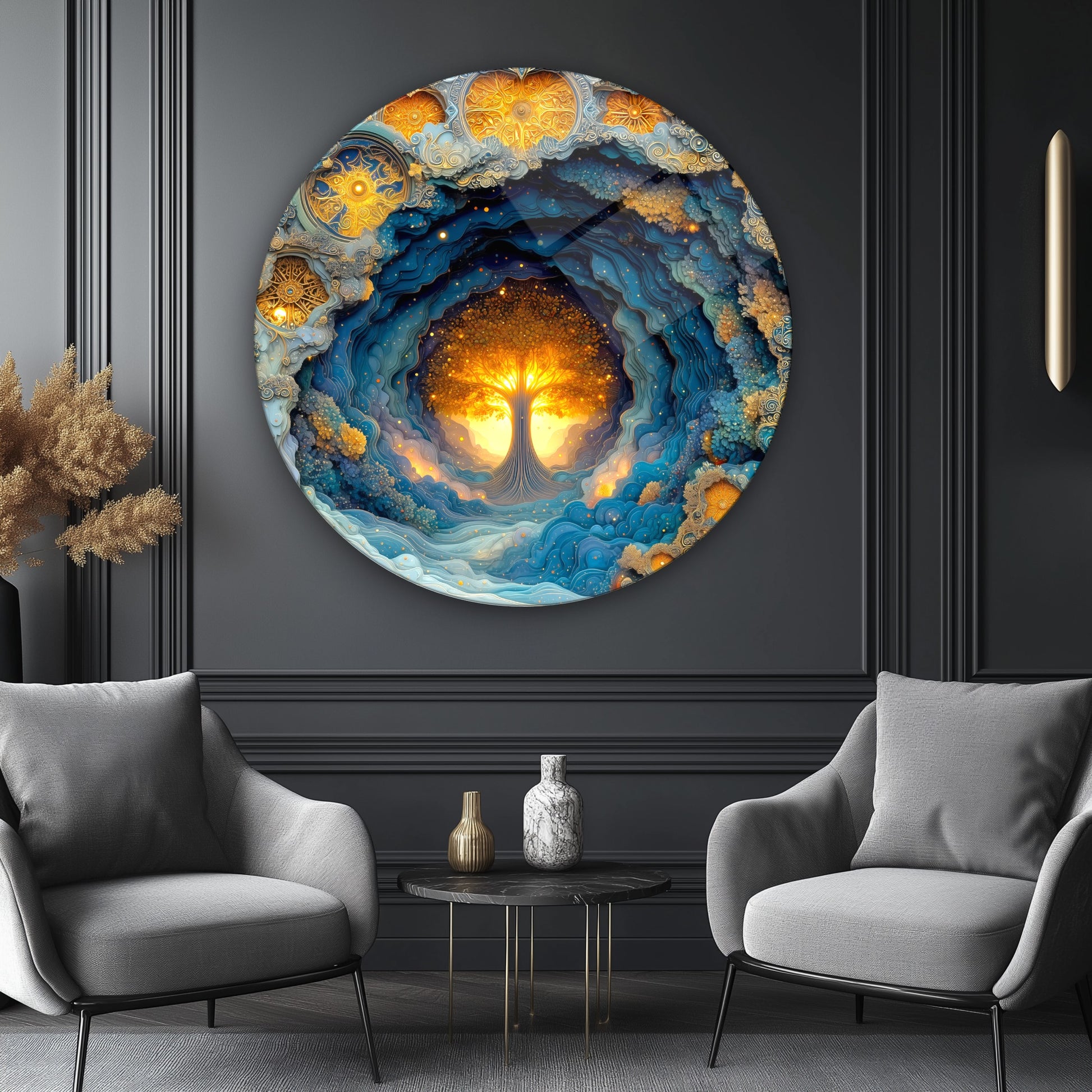 Gold Detay Hayat Ağacı Yuvarlak Cam Tablo