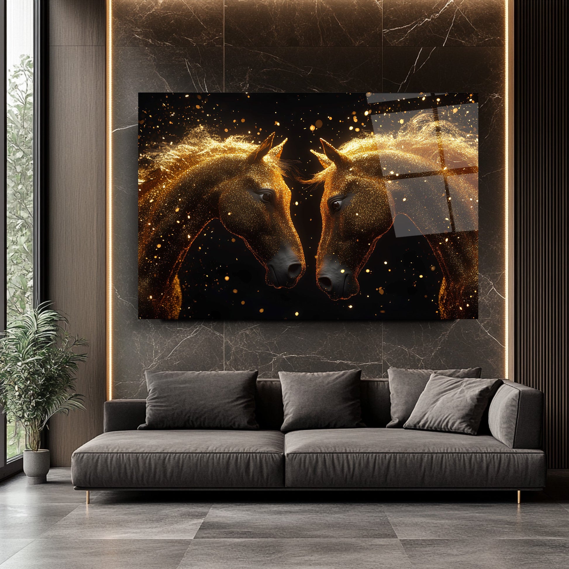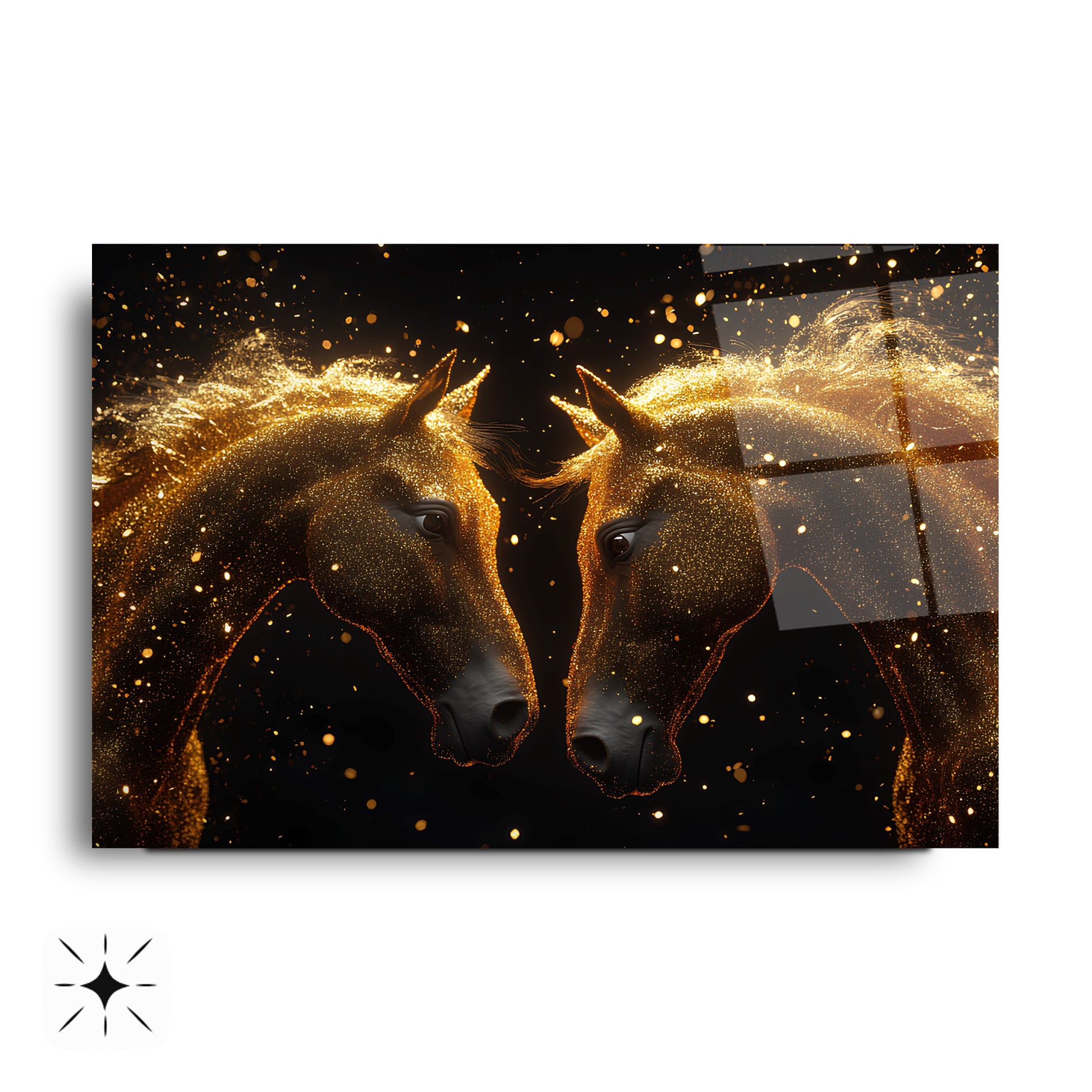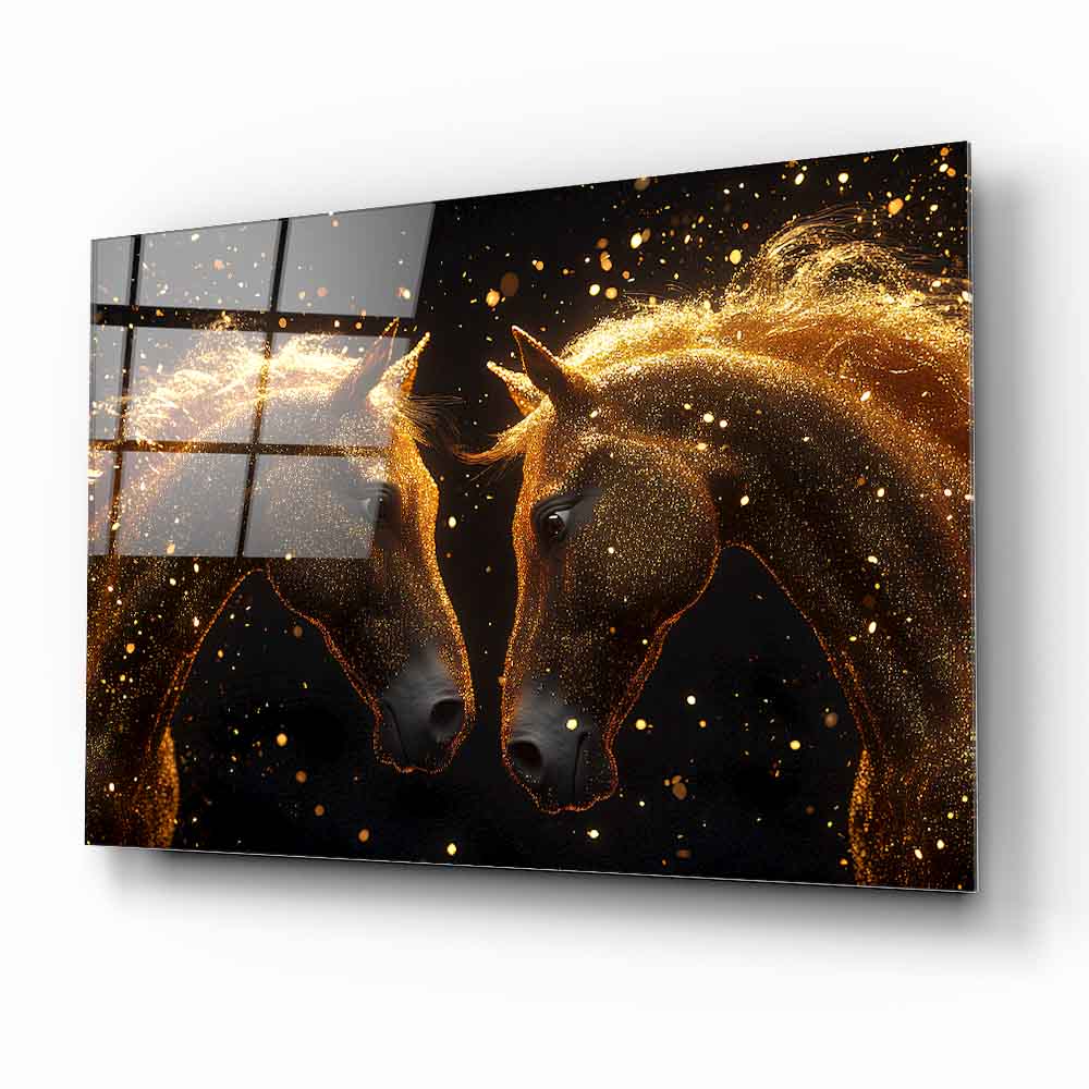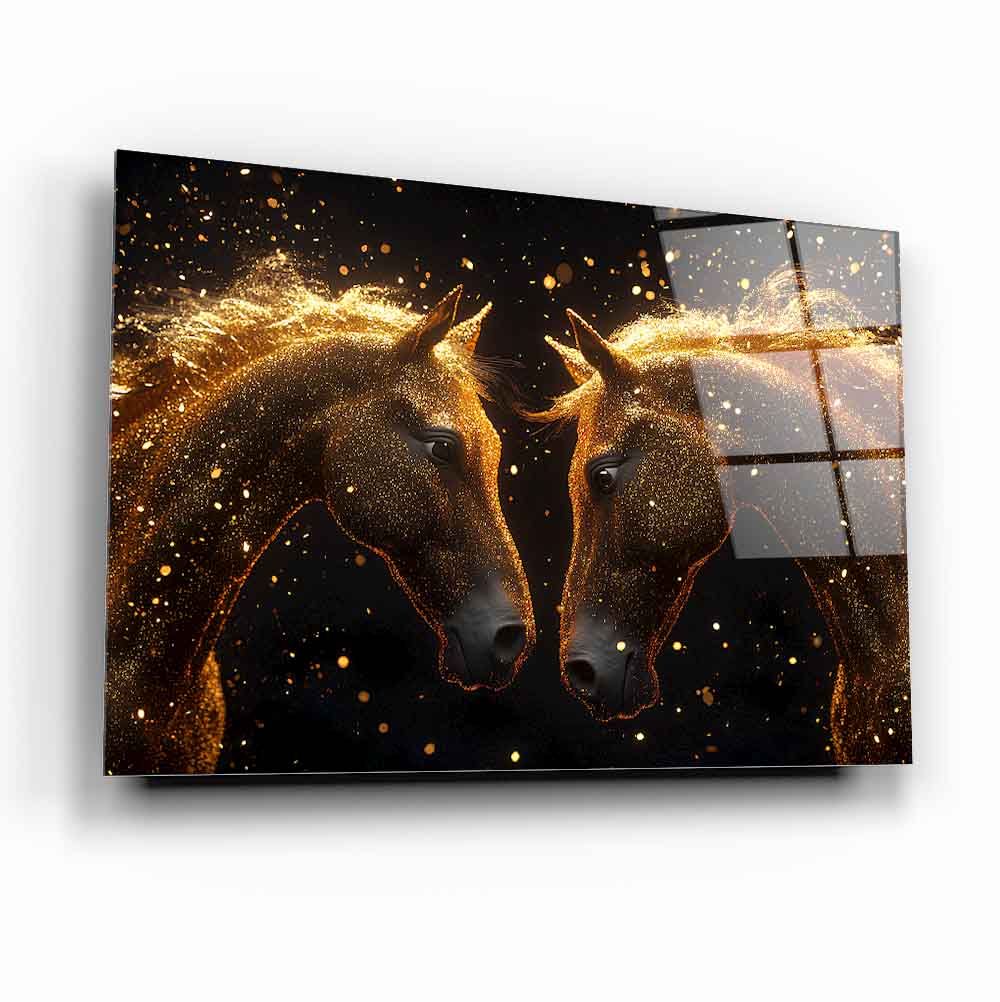 Gold detaylar ve ışık efektiyle öne çıkan çift at figürü, bu gerçek cam tabloya büyüleyici bir hareket katar. Kırılmaz cam tablo yapısıyla hem dayanıklı hem estetik bir dekorasyon seçeneğidir. Modern yaşam alanlarında şıklık ve güç arayanlar için etkileyici bir cam tablo tercihidir.