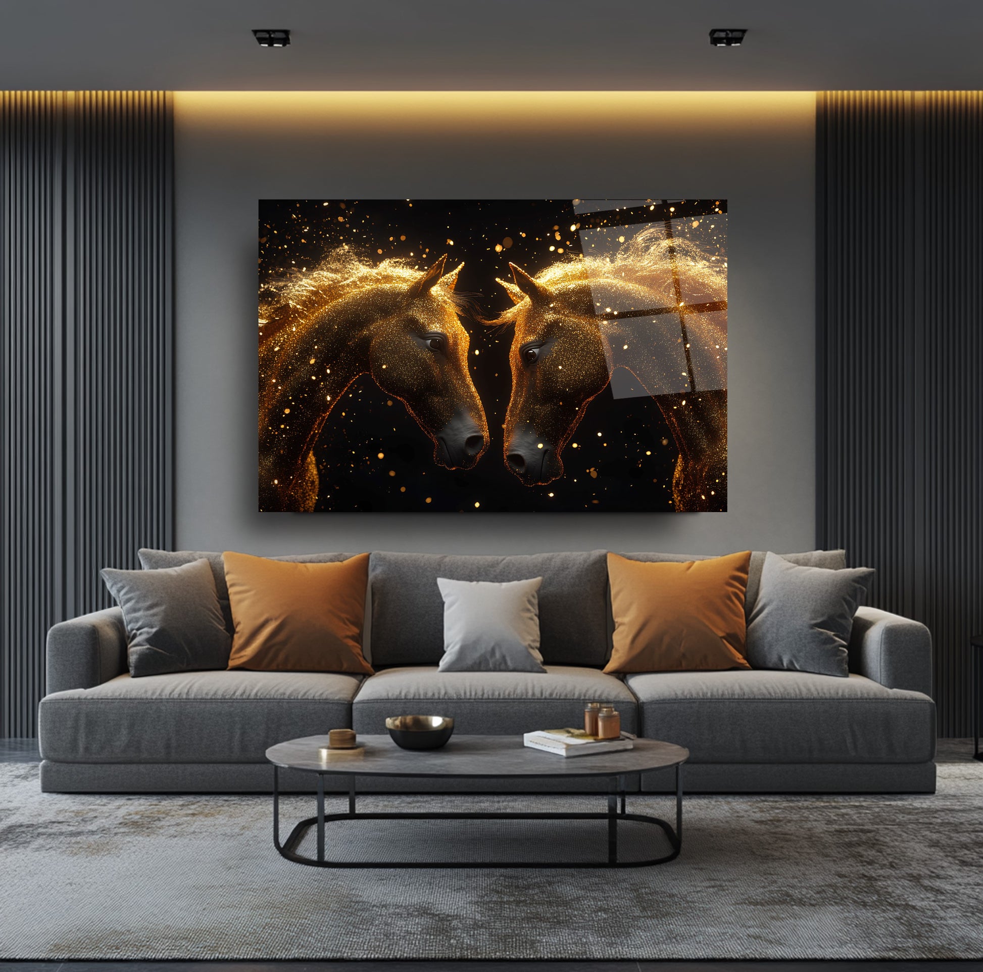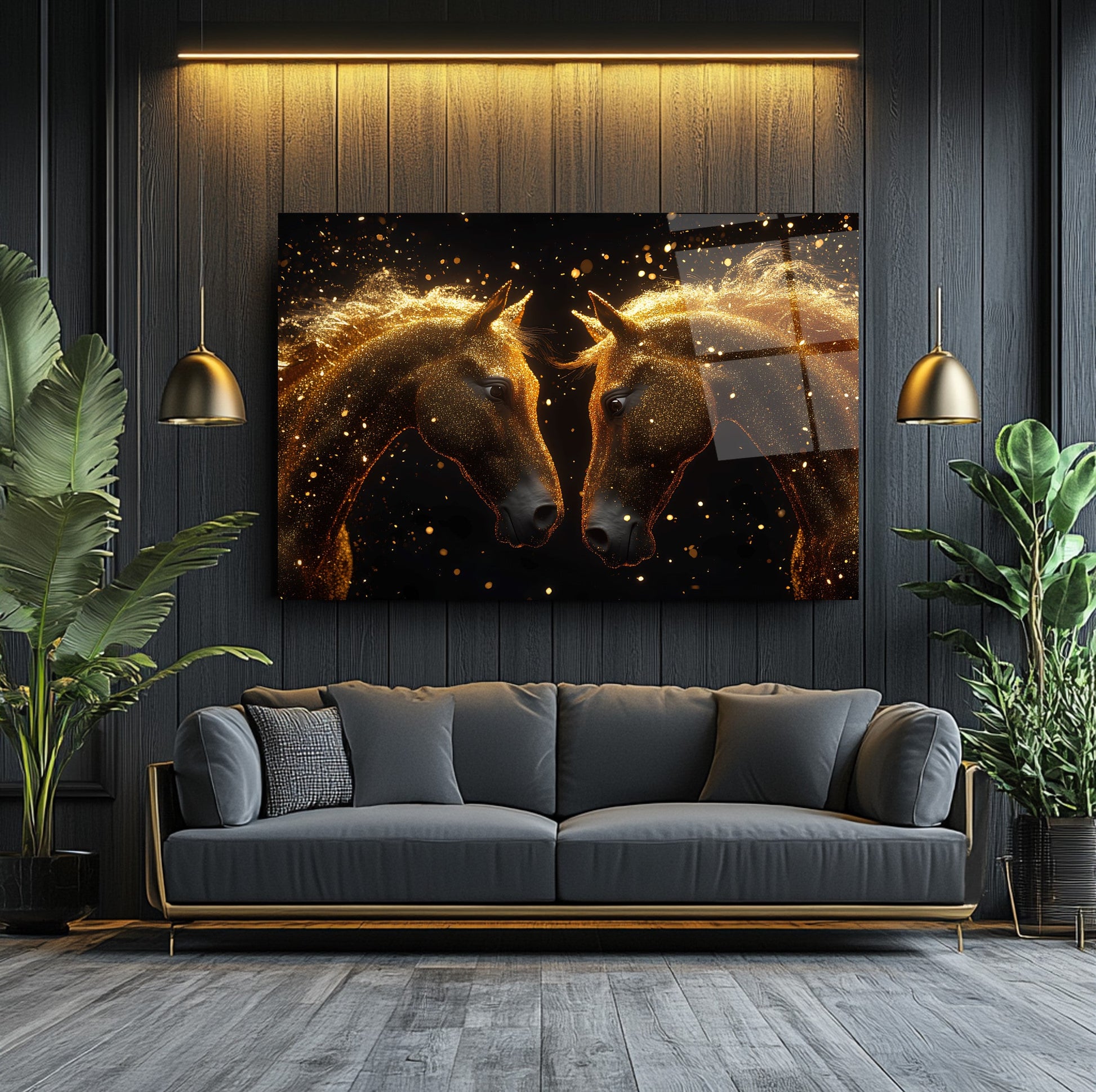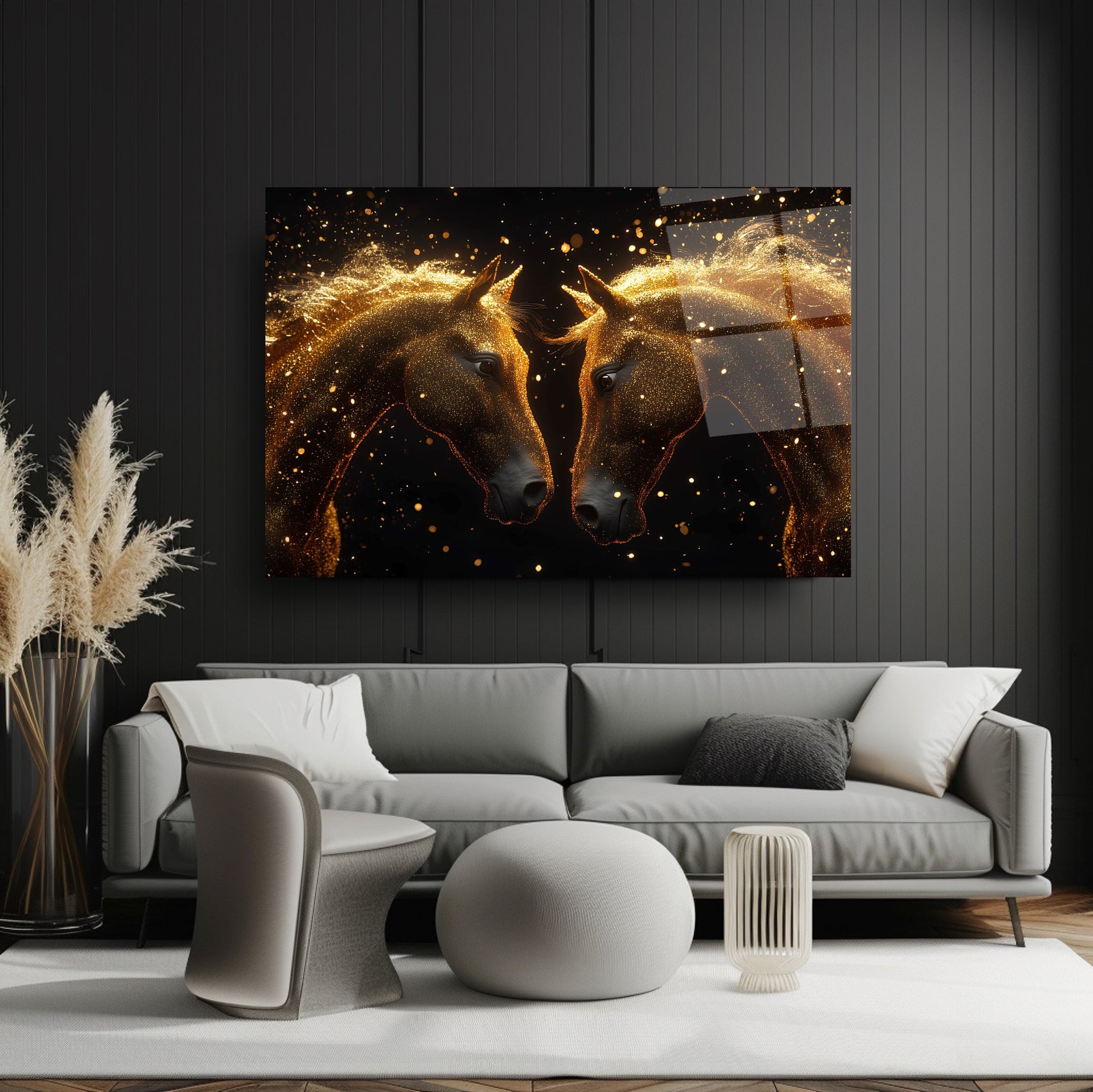 Gold detaylar ve ışık efektiyle öne çıkan çift at figürü, bu gerçek cam tabloya büyüleyici bir hareket katar. Kırılmaz cam tablo yapısıyla hem dayanıklı hem estetik bir dekorasyon seçeneğidir. Modern yaşam alanlarında şıklık ve güç arayanlar için etkileyici bir cam tablo tercihidir.