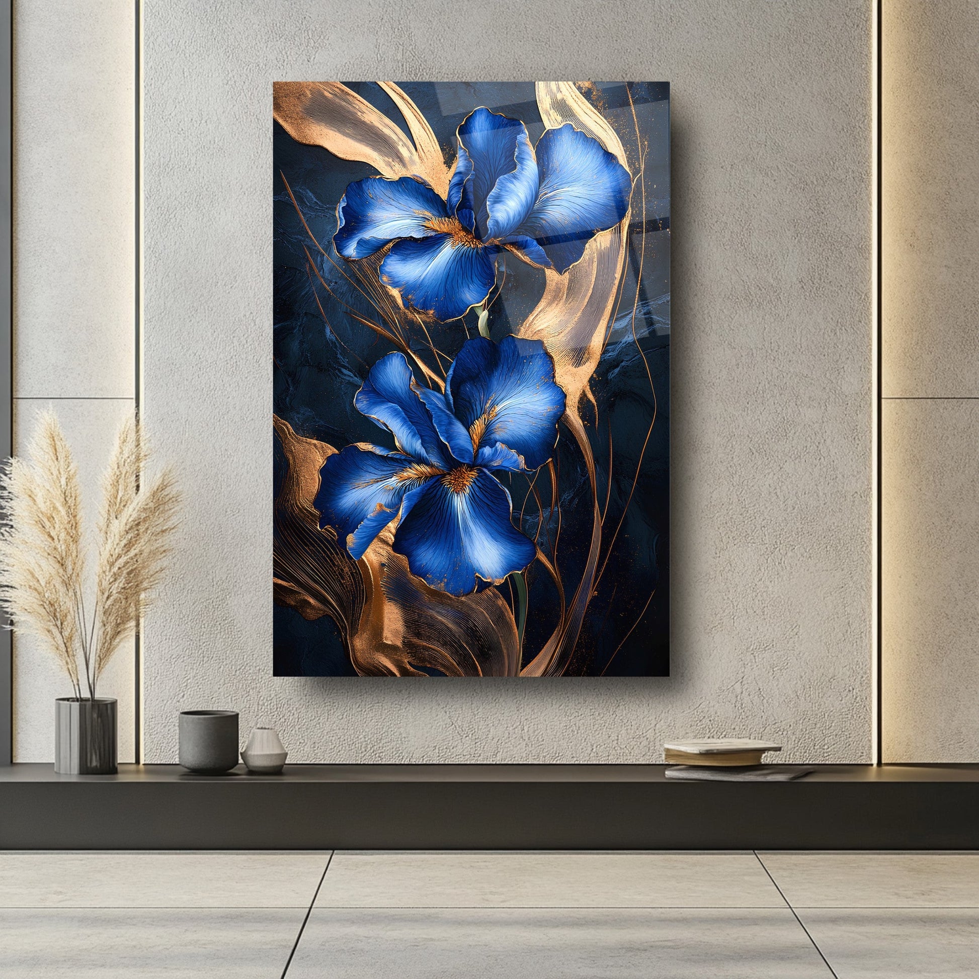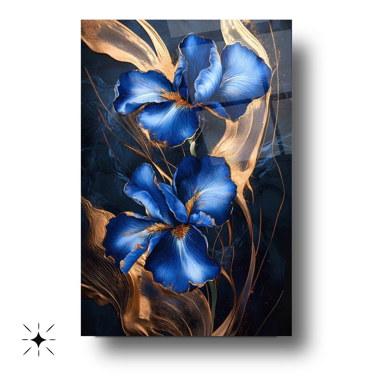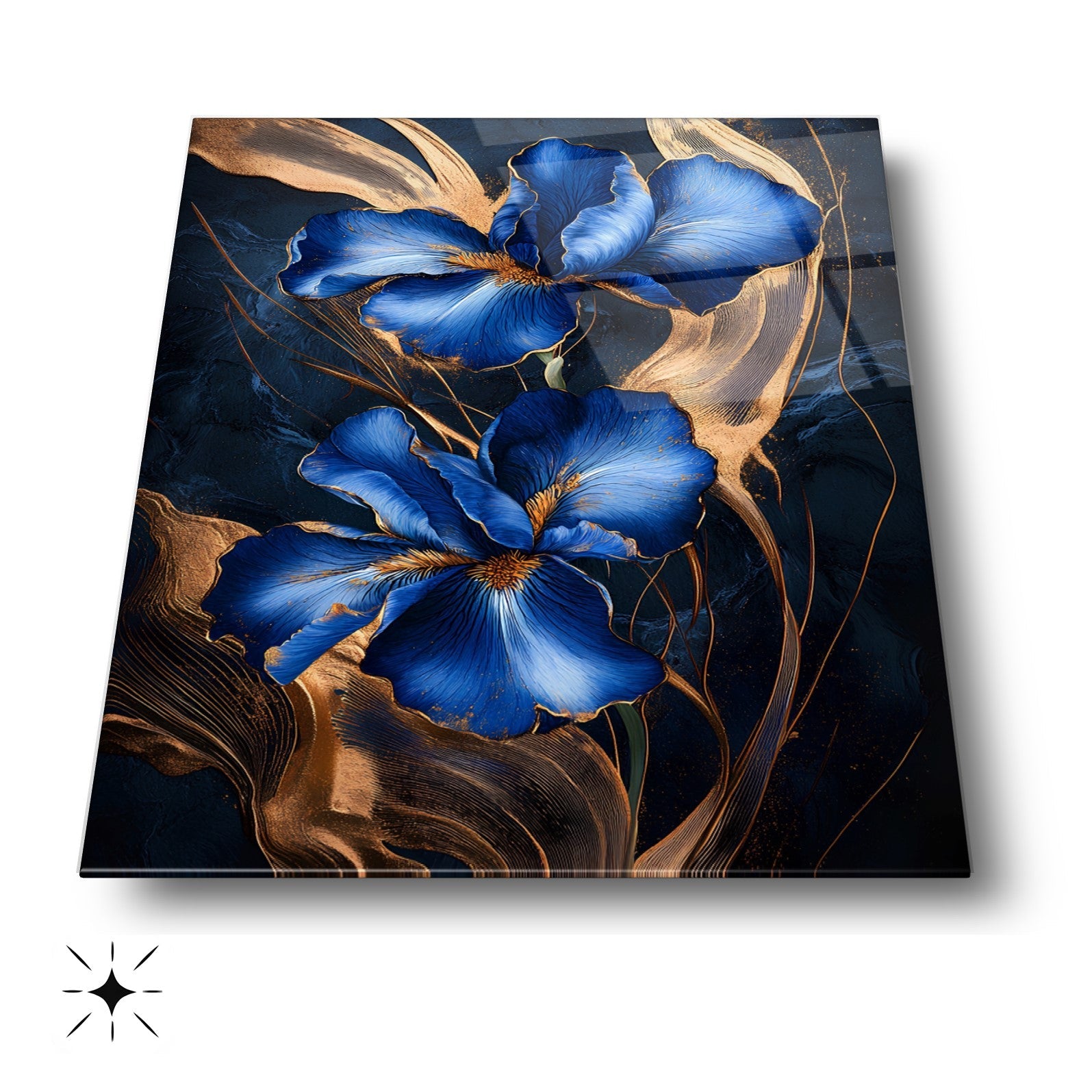 CamDeko'dan ev ve iş yerlerinize asalet ve modern bir dokunuş katan özel bir eser: Gold Detay Lacivert Mavi Çiçek Modern Gerçek Kırılmaz Kaliteli Cam Tablo! Gecenin derinliğini ve doğanın zarafetini simgeleyen, büyüleyici lacivert-mavi çiçeklerin göz alıcı gold detaylarla buluştuğu bu tablo, mekanlarınıza huzurlu bir atmosfer katıyor.