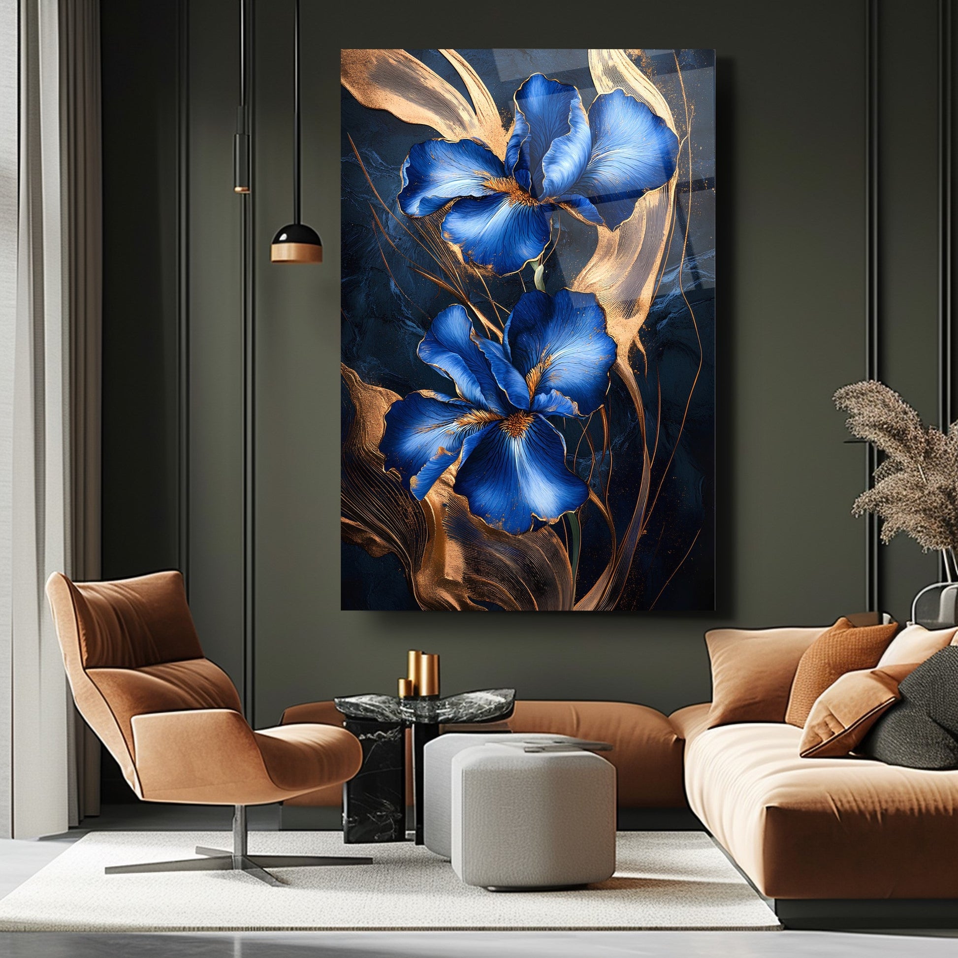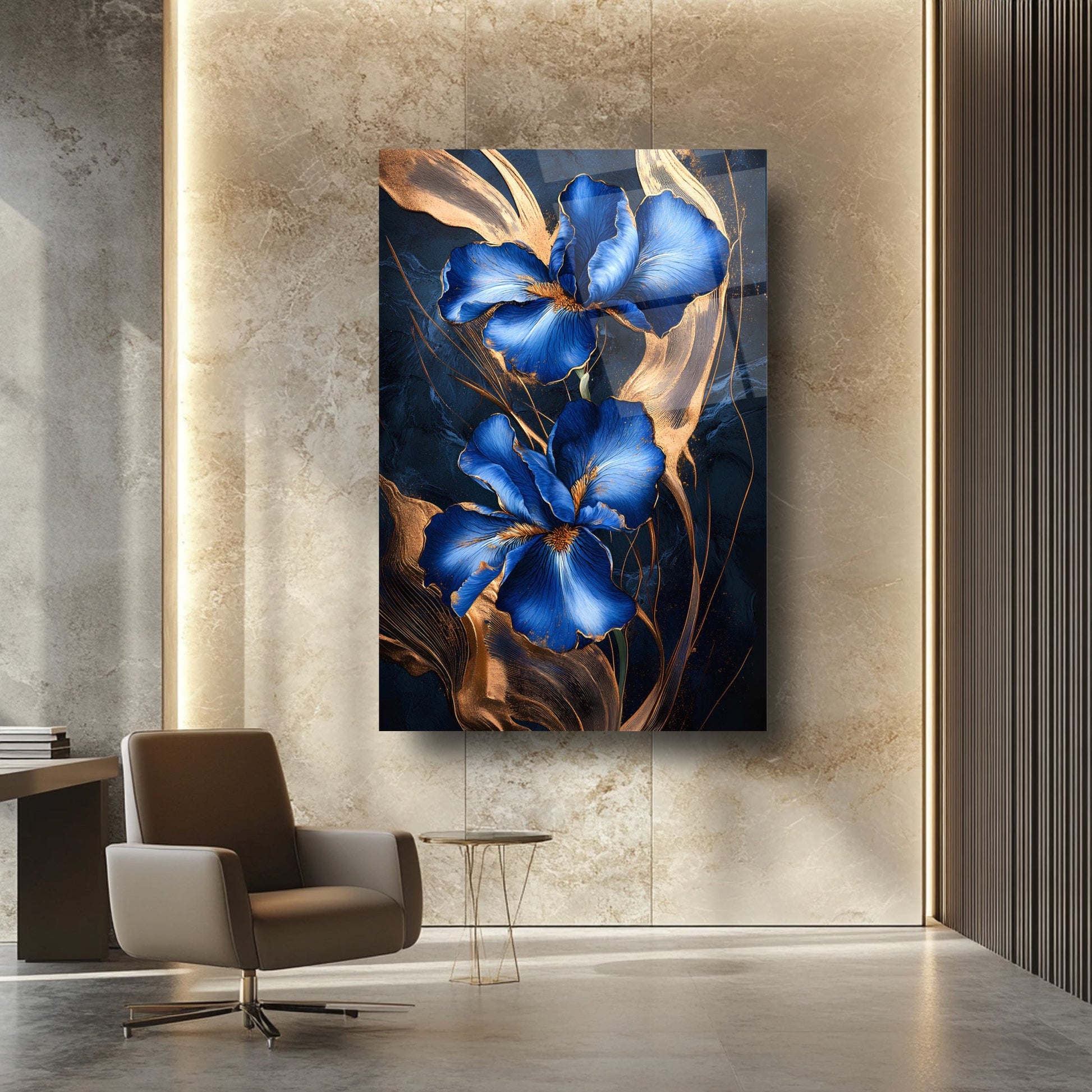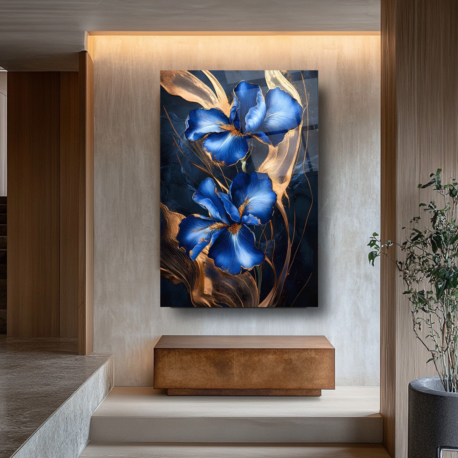 Mekanlarınıza Derin Bir Zarafet: Gold Detay Lacivert Mavi Çiçek Cam Tablo