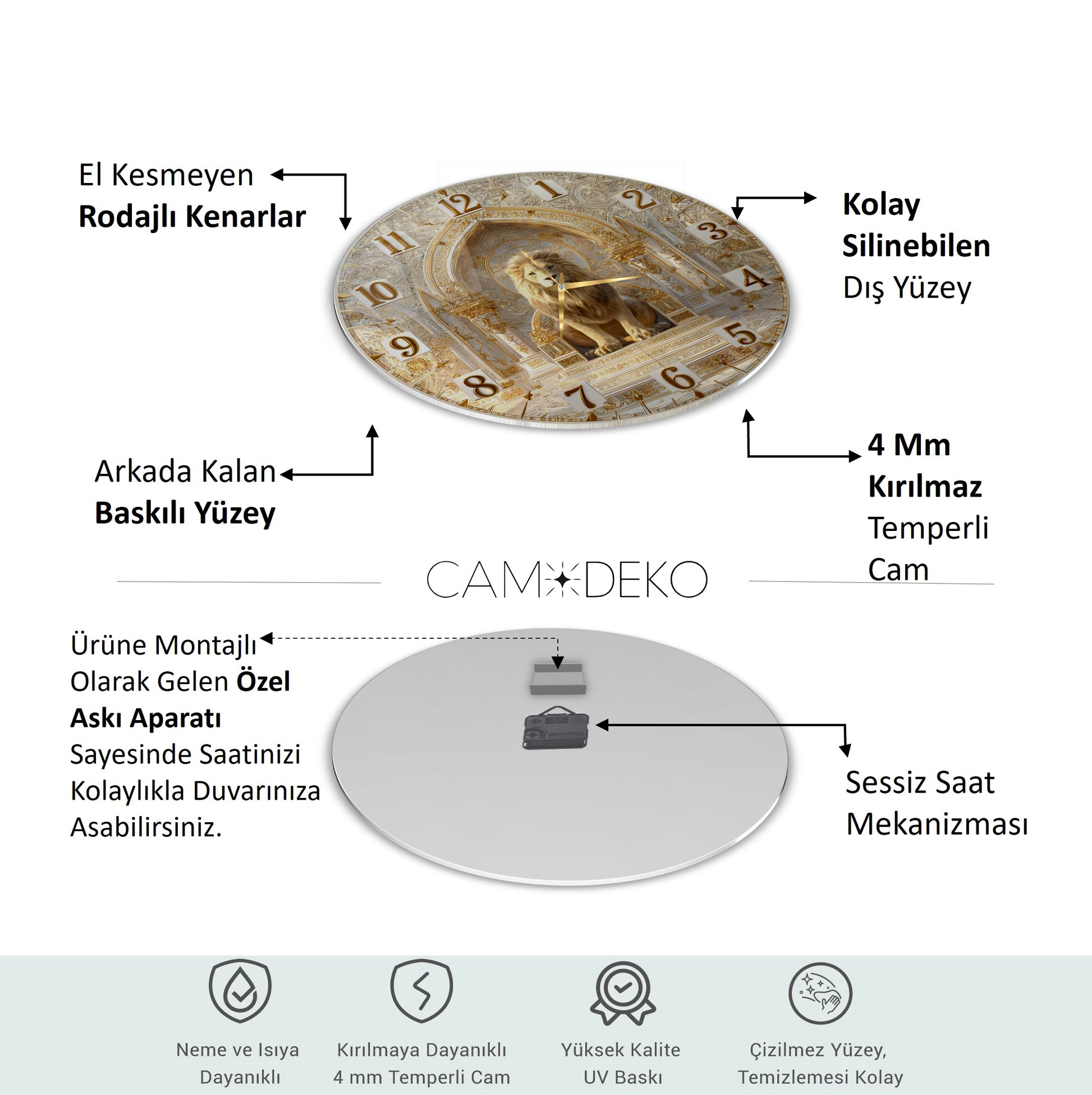 Cam saatlerimiz, son teknoloji UV baskı makineleriyle doğrudan cama uygulanır. Kağıt veya folyo yapıştırma kullanılmaz; baskılar camın arka yüzeyine işlenerek uzun ömürlü ve dayanıklı hale getirilir. Ek olarak, fırınlama boya işlemi ile güçlendirilerek solmaya ve deformasyona karşı ekstra koruma sağlanır.