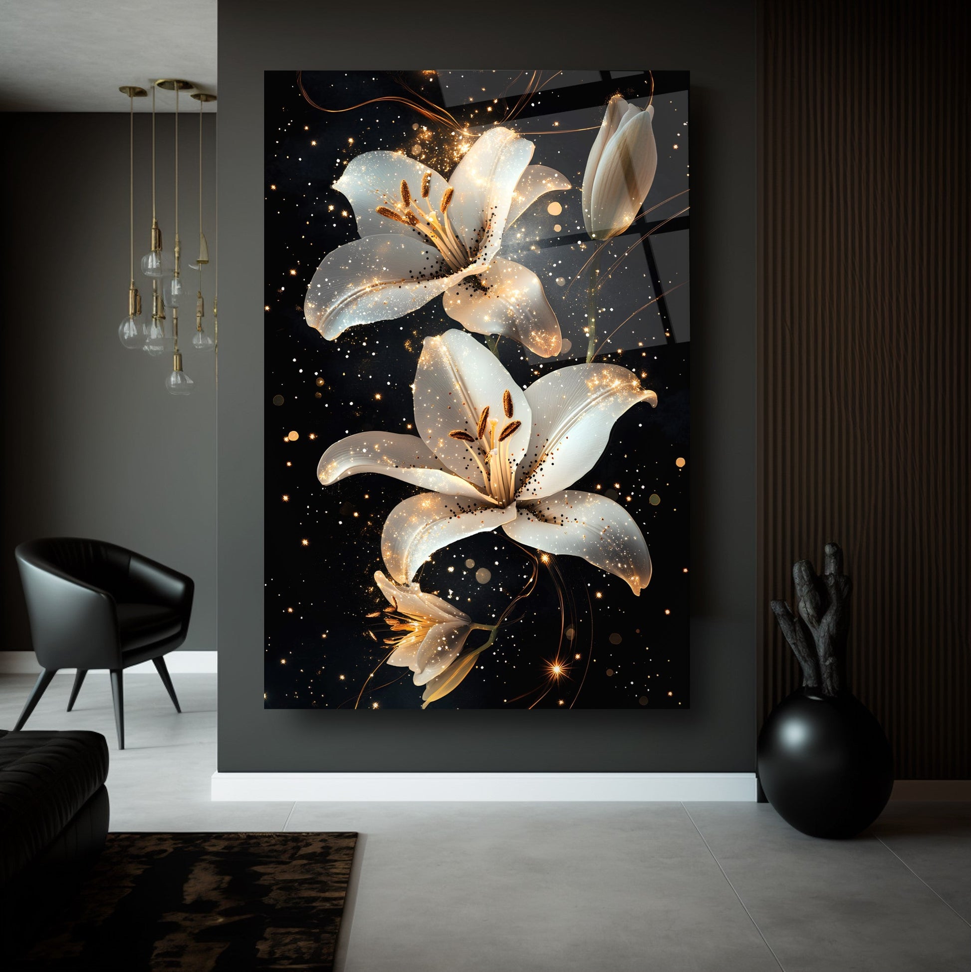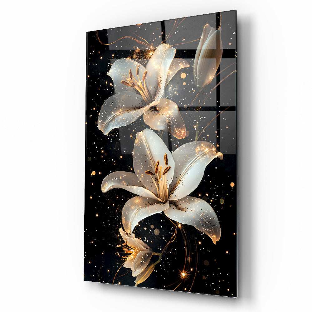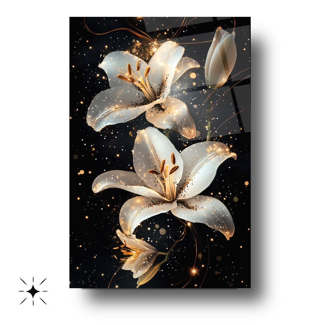 Mekanlarınıza Işıltılı Bir Doğa Dokunuşu: Gold Detaylı Beyaz Çiçekler Cam Tablo