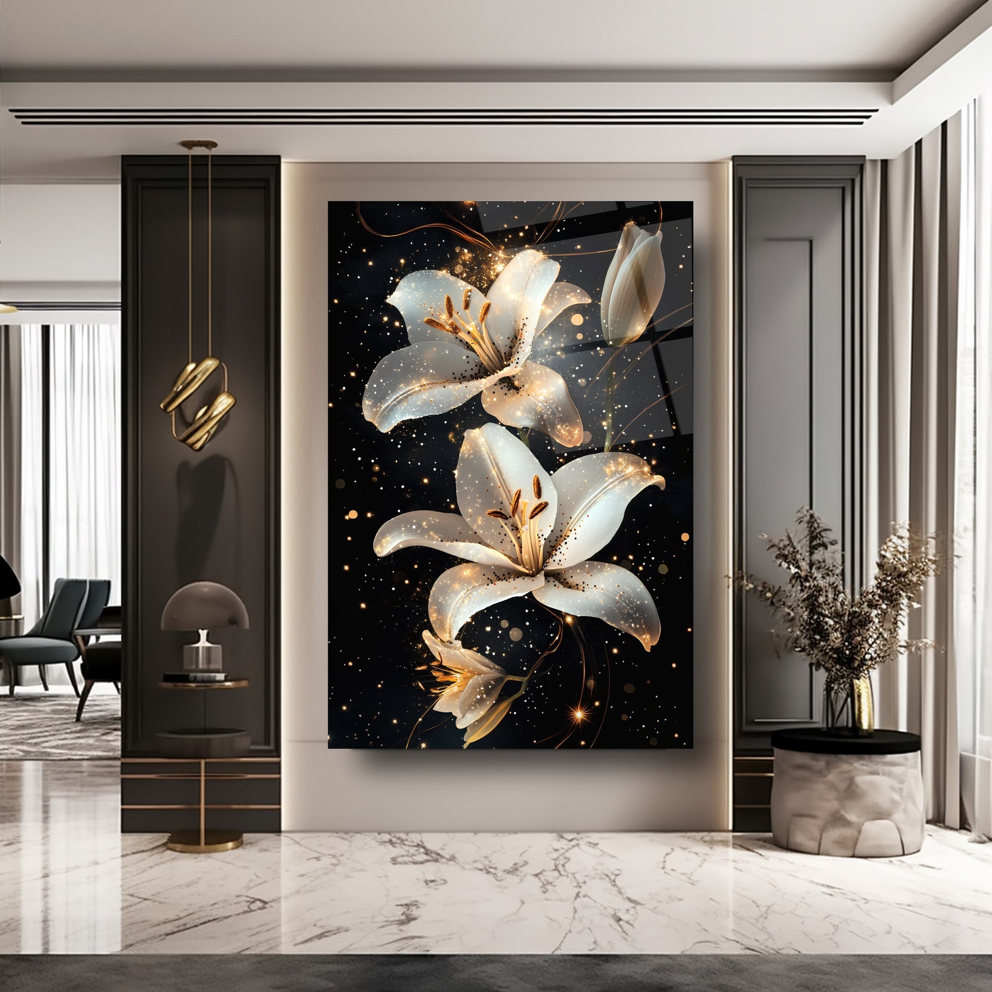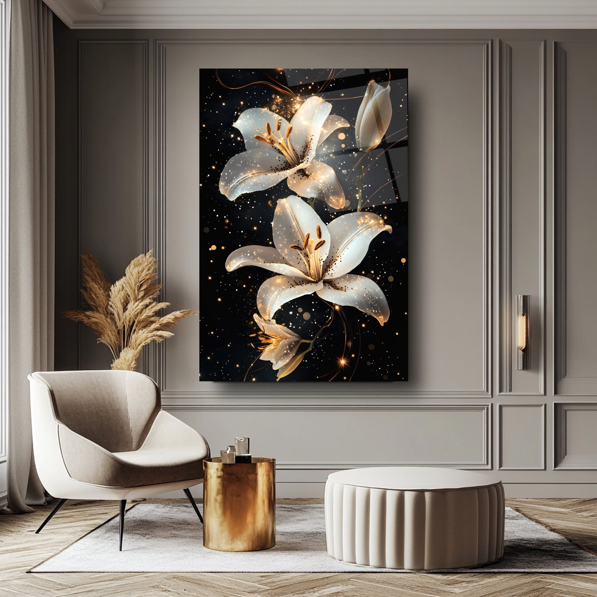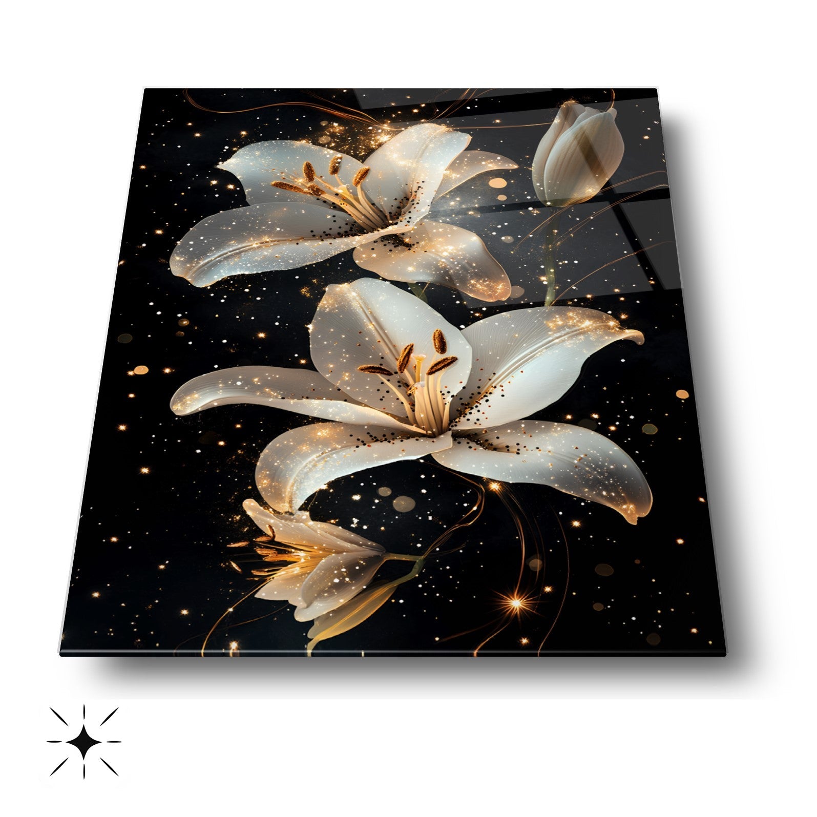 Mekanlarınıza Işıltılı Bir Doğa Dokunuşu: Gold Detaylı Beyaz Çiçekler Cam Tablo