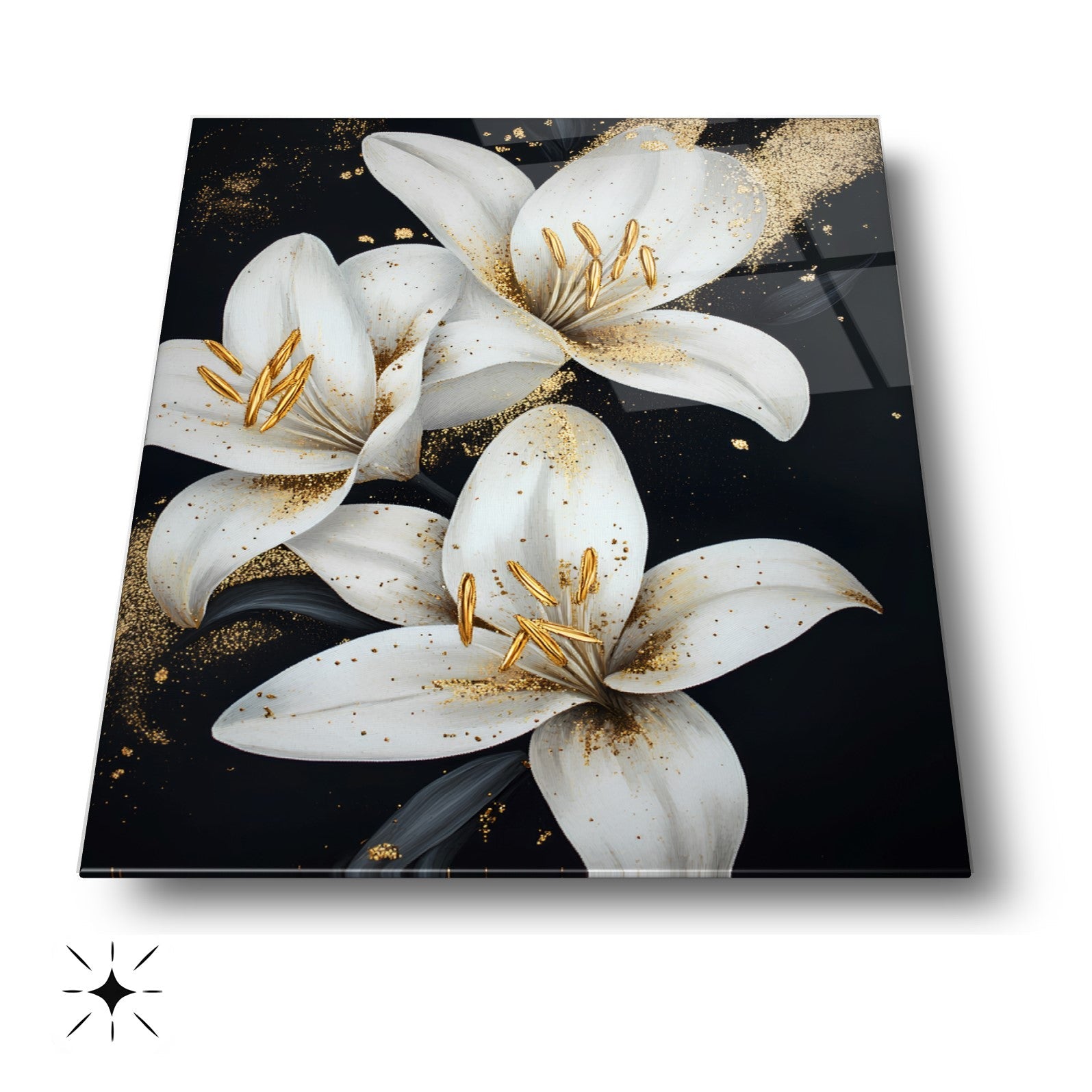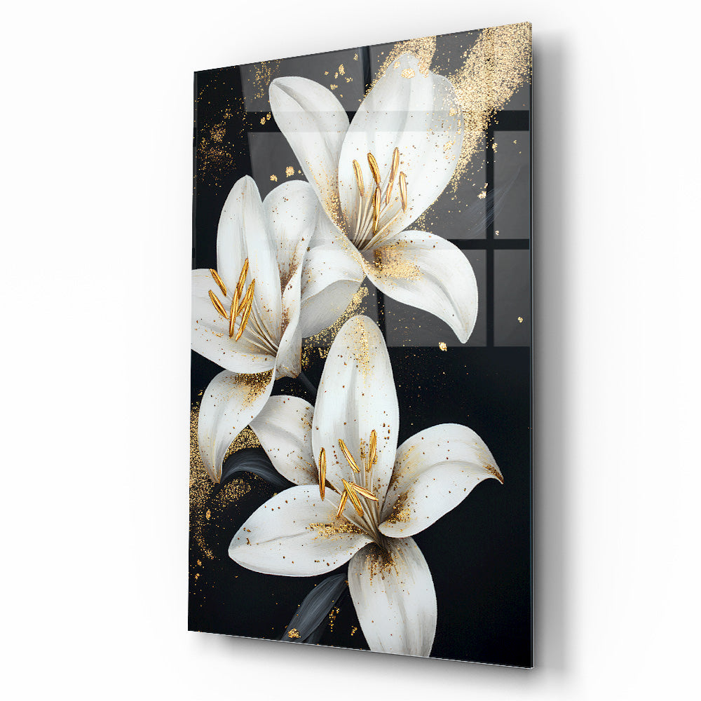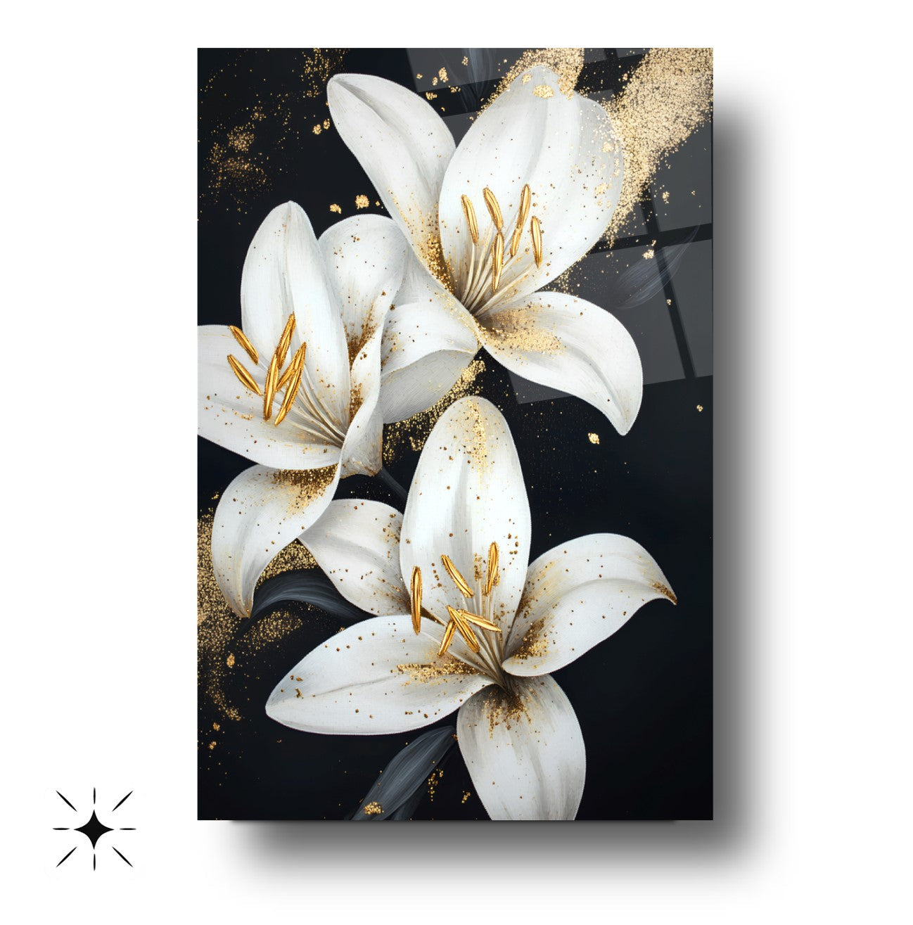 Mekanlarınıza Altın Işıltılı Bir Çiçek Dokunuşu: Gold Detaylı Beyaz Çiçekler Cam Tablo