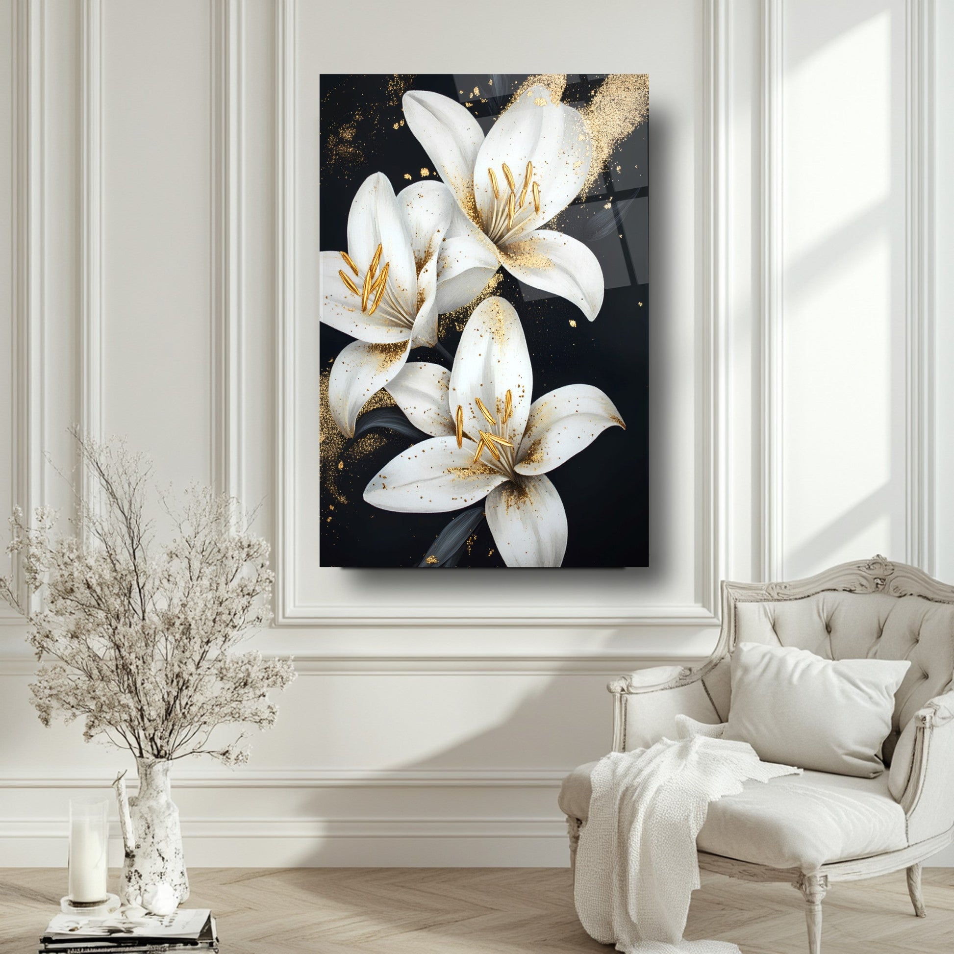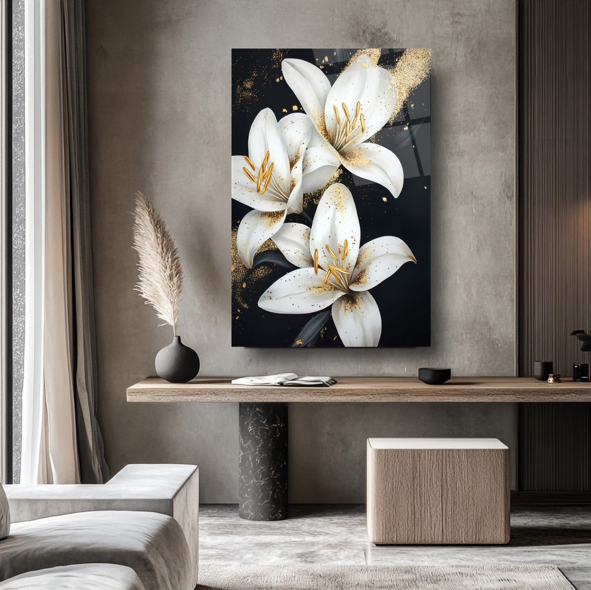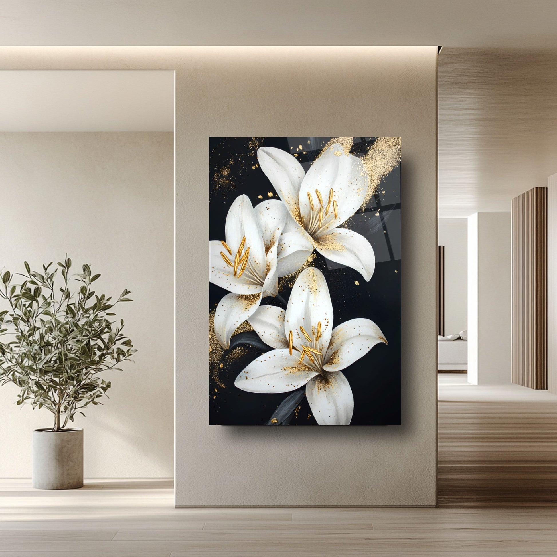 Mekanlarınıza Altın Işıltılı Bir Çiçek Dokunuşu: Gold Detaylı Beyaz Çiçekler Cam Tablo