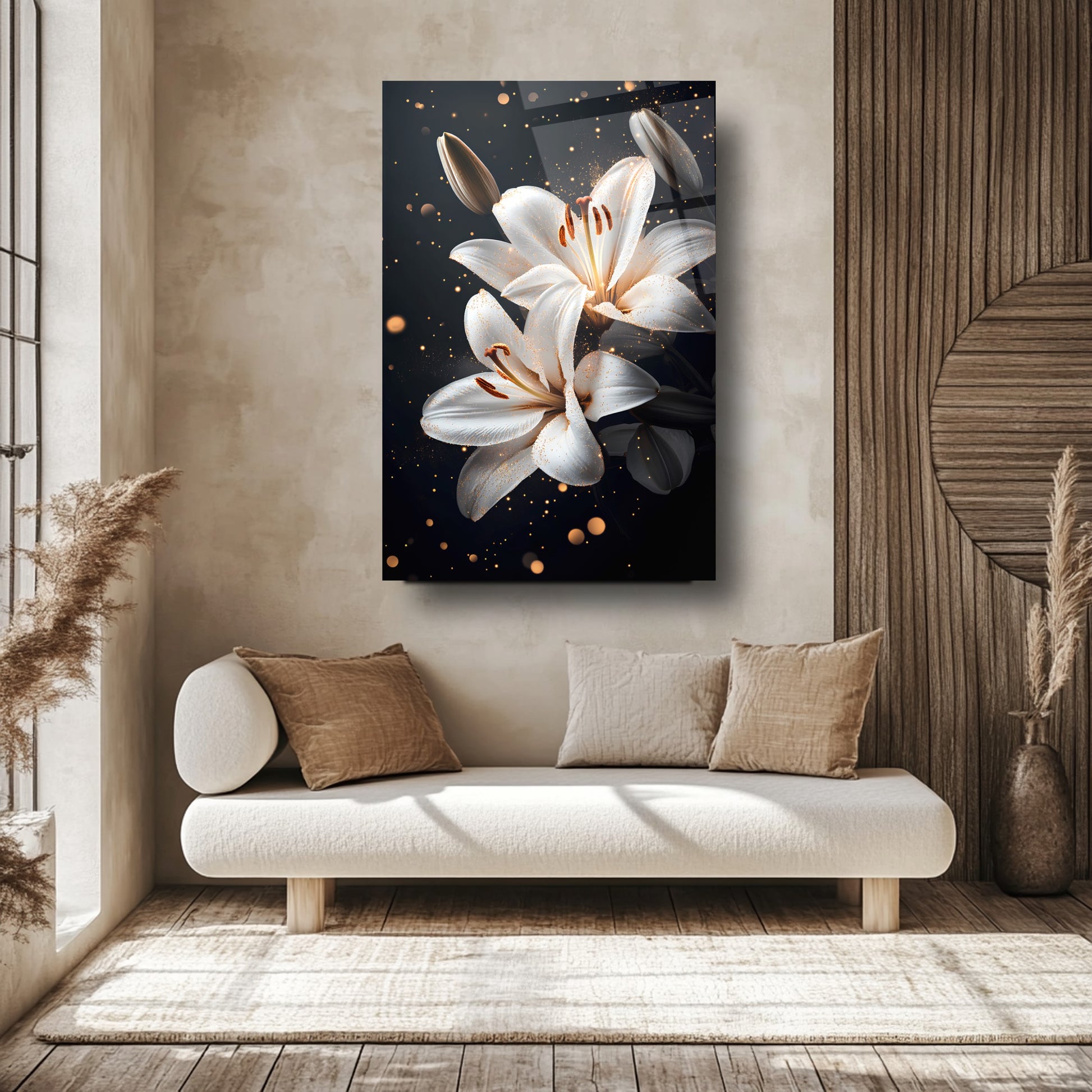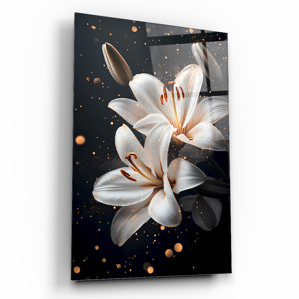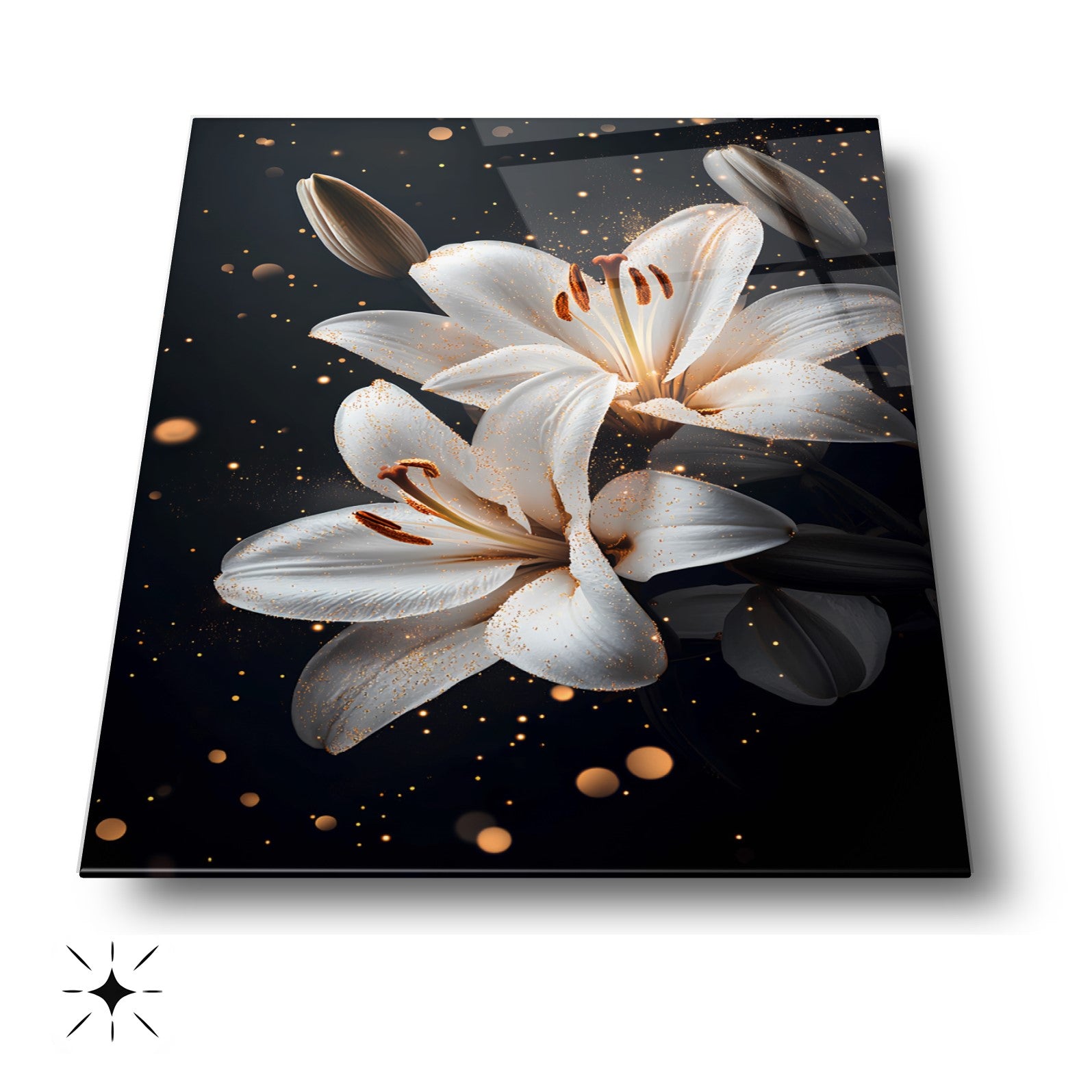 Mekanlarınıza Altın Işıltılı Doğa Esintisi: Gold Detaylı Beyaz Çiçekler Cam Tablo