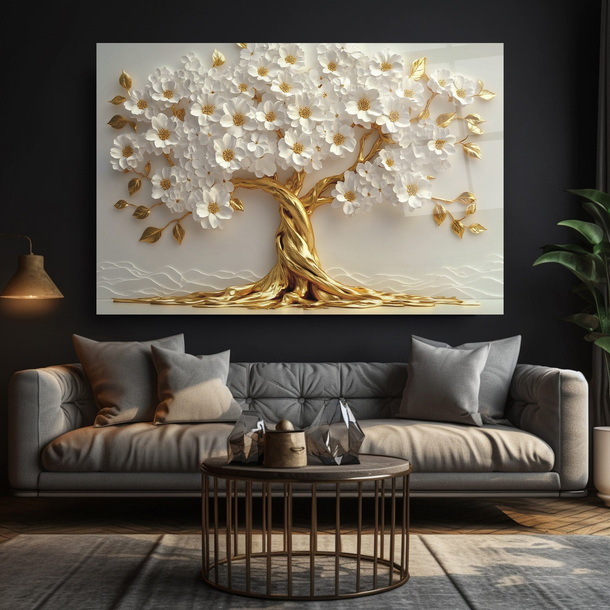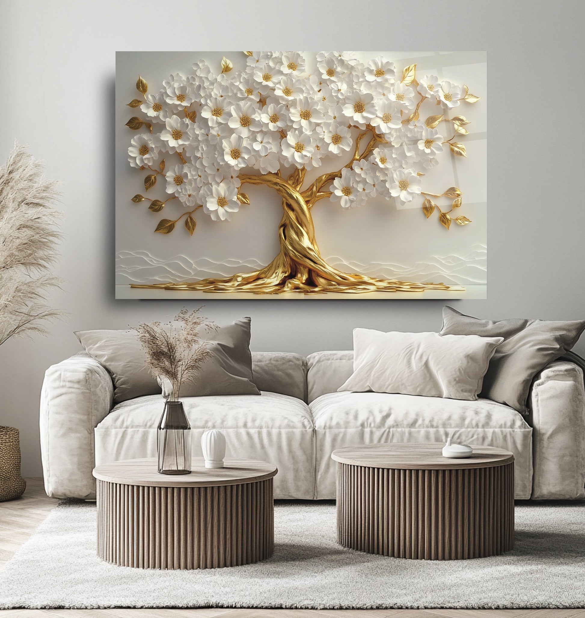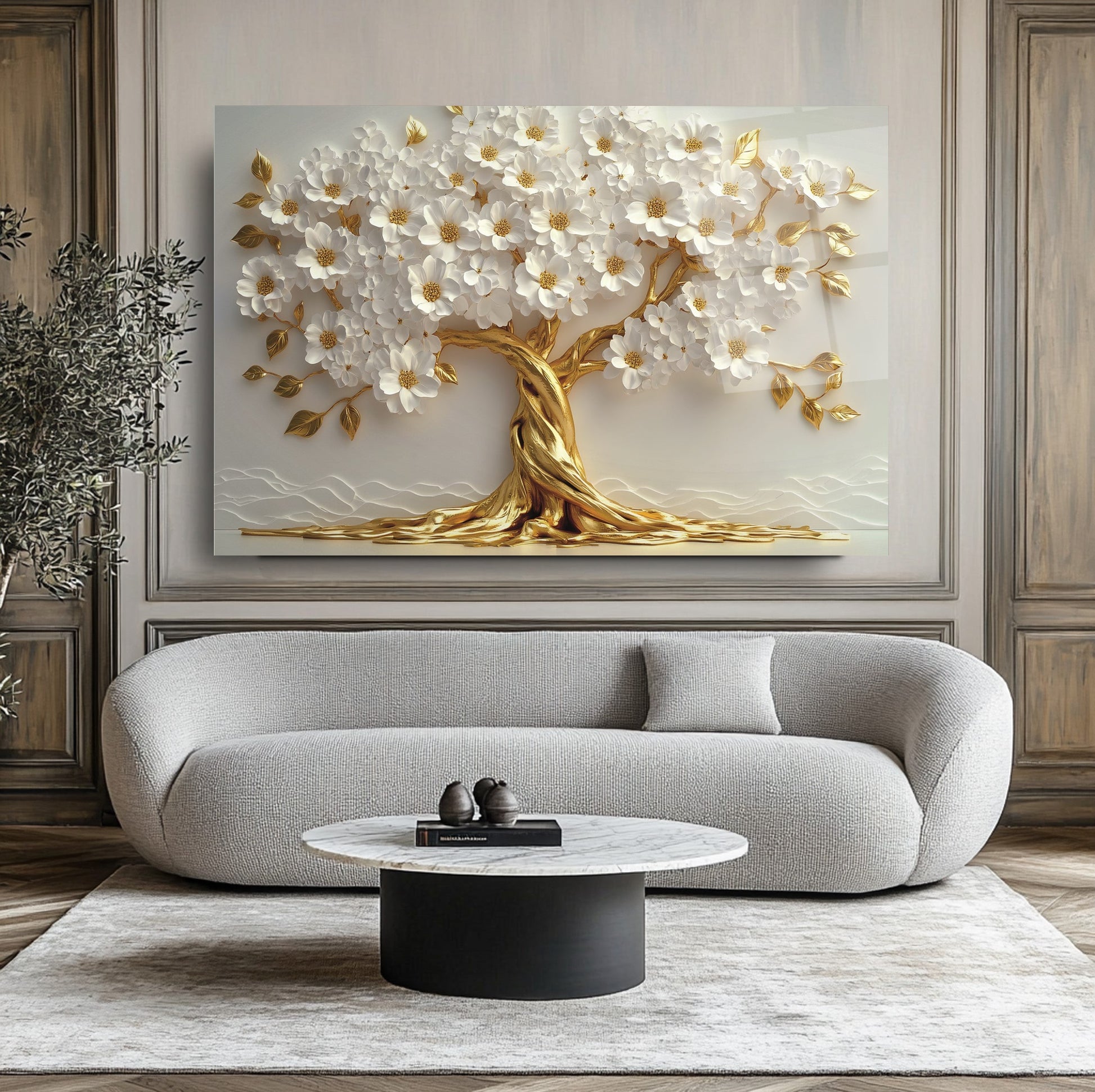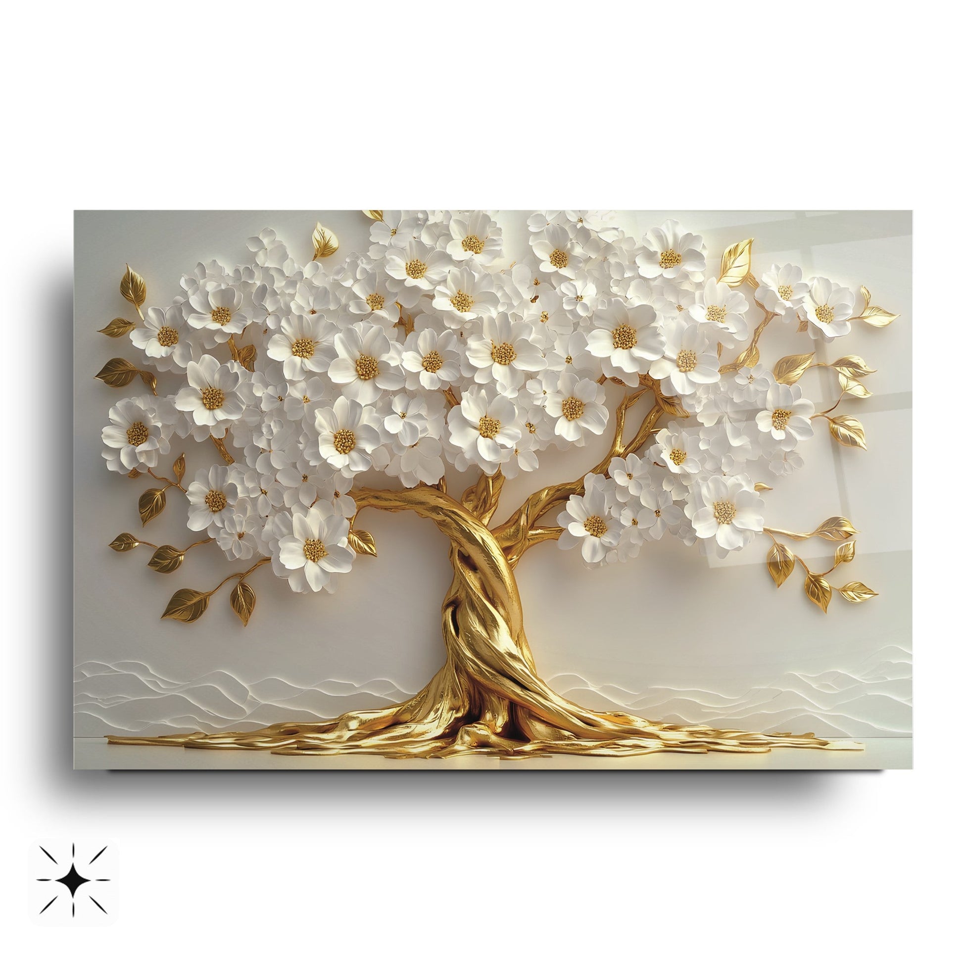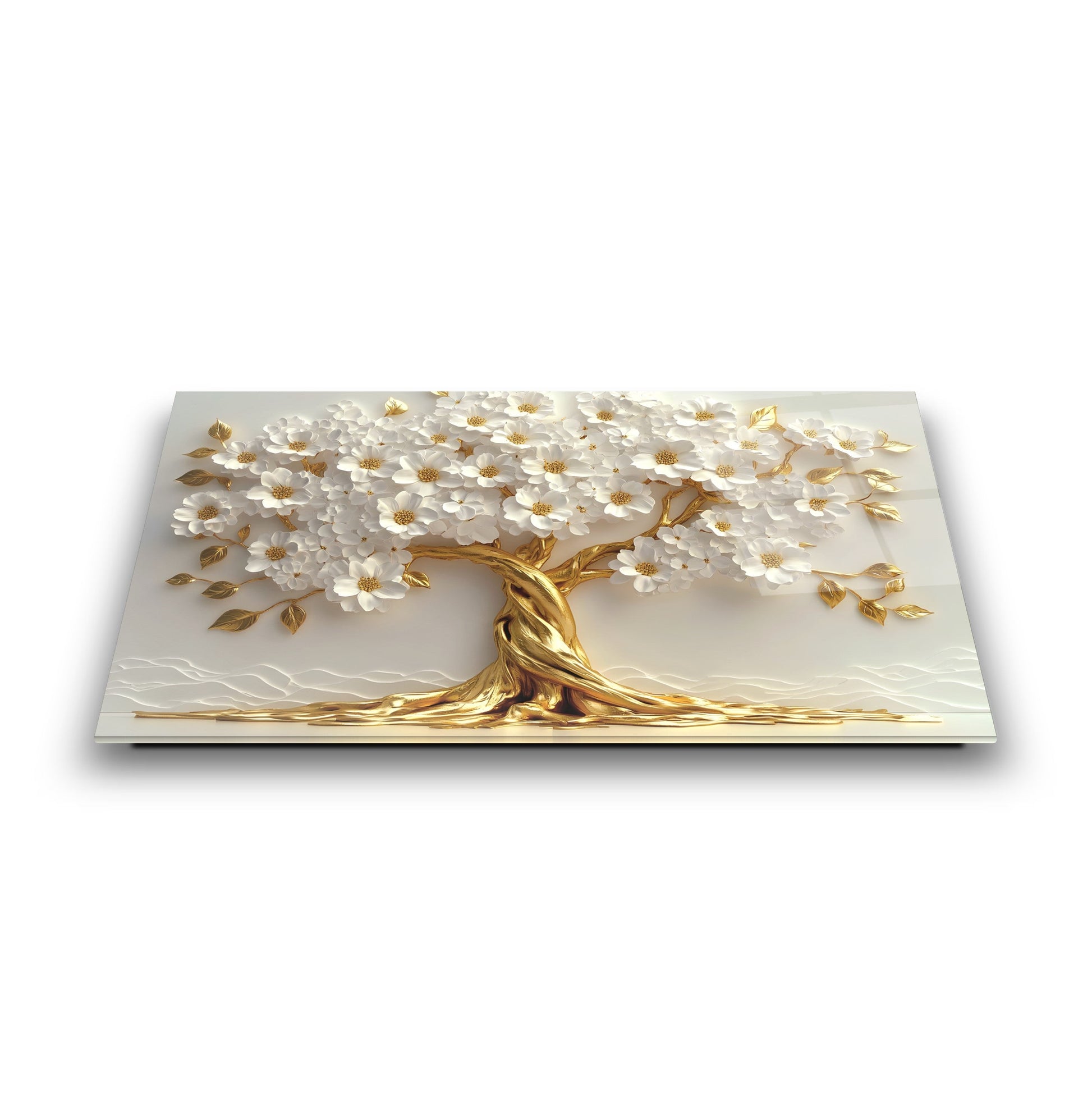 Beyaz Çiçekli Gold Hayat Ağacı Cam Tablo
