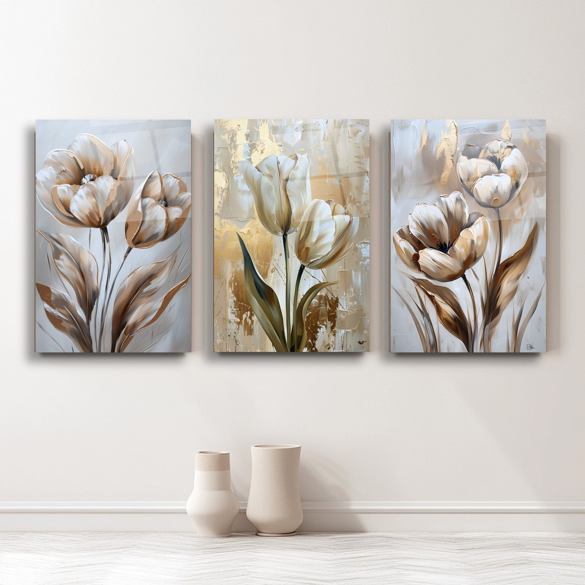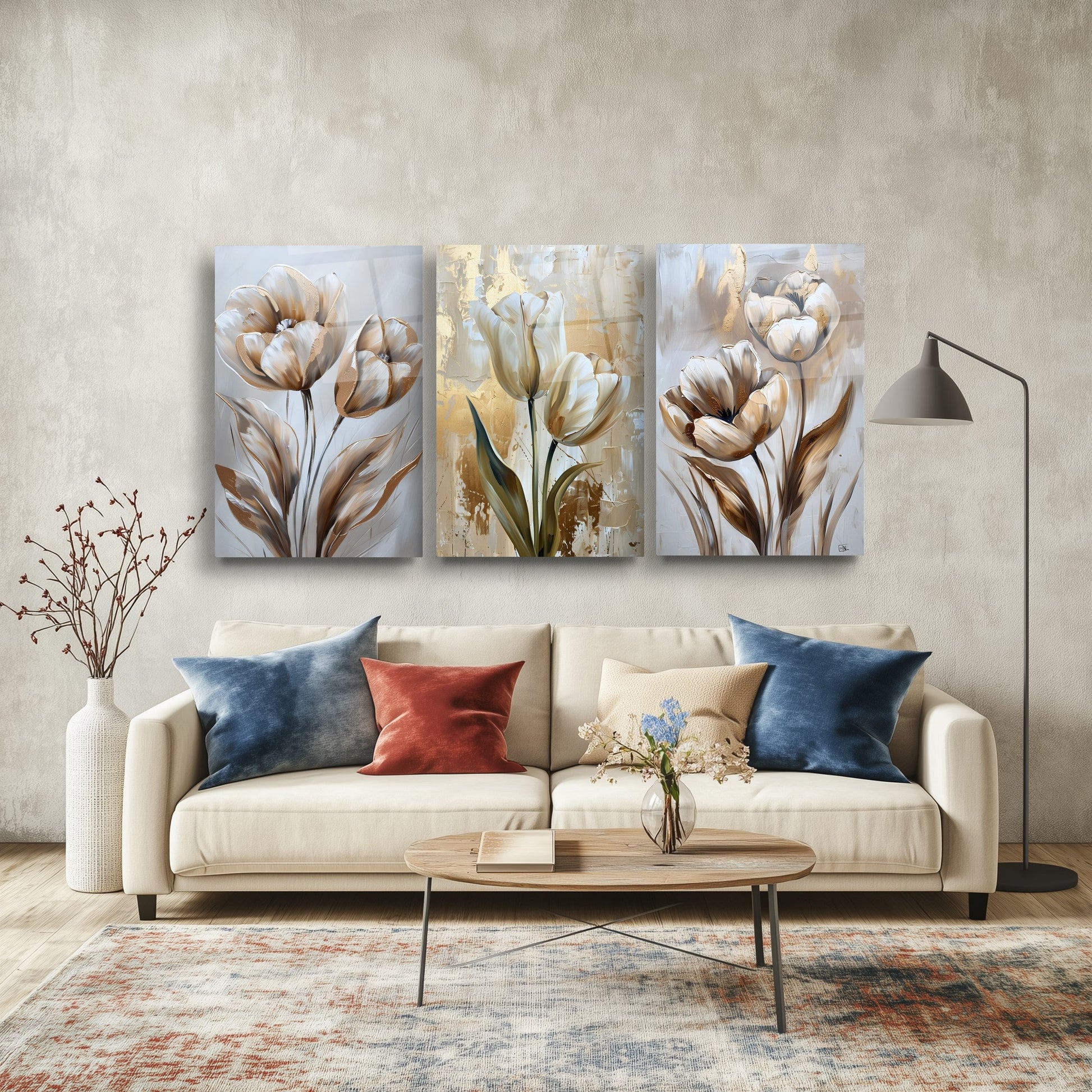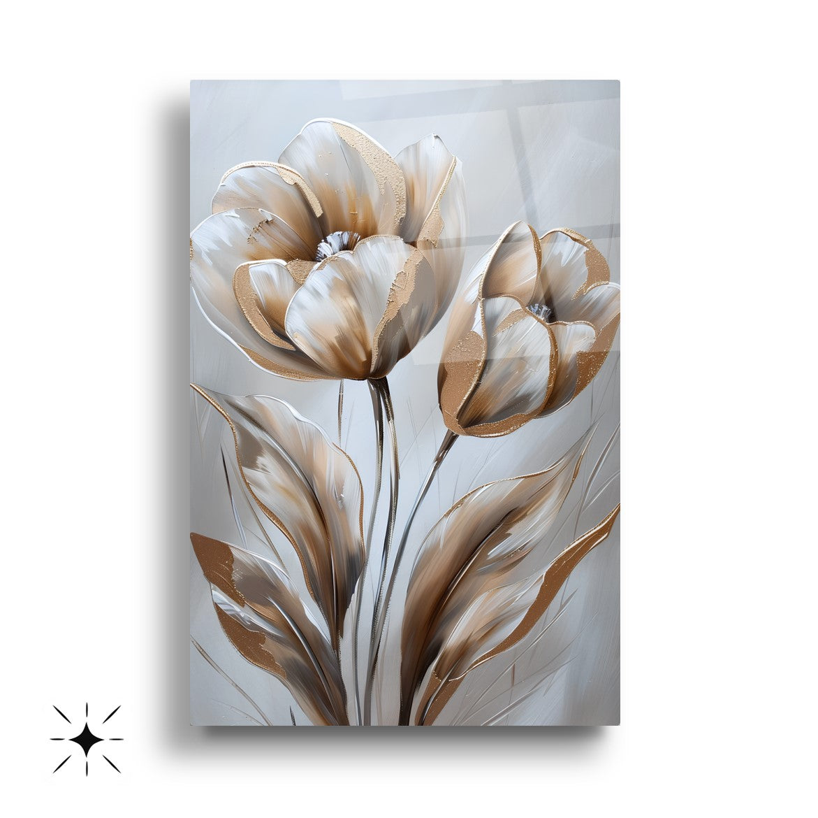 Gold ve gümüş tonlarıyla işlenen eskitme tarzı lale desenleri, bu büyük boy kırılmaz cam tablo setine klasik ve zarif bir hava katar. Temperli cam yüzeyiyle hem şıklık hem de dayanıklılık sunar. Salon dekorasyonu için sofistike ve estetik bir seçenek olan bu tablo, çiçeklerin zarafetini modern bir stille birleştirir. Minimal detaylarla zamansız bir atmosfer oluşturur.