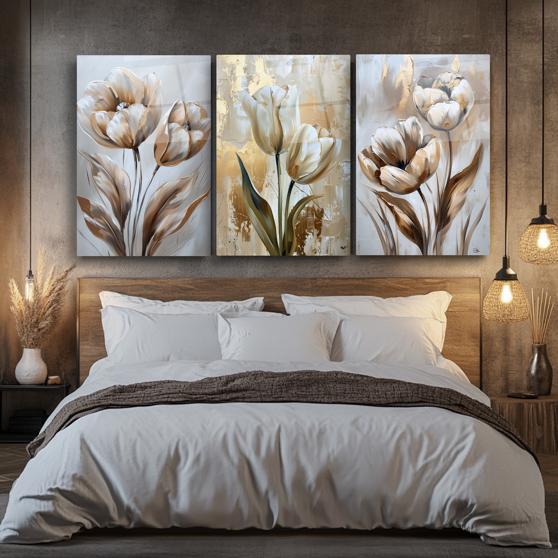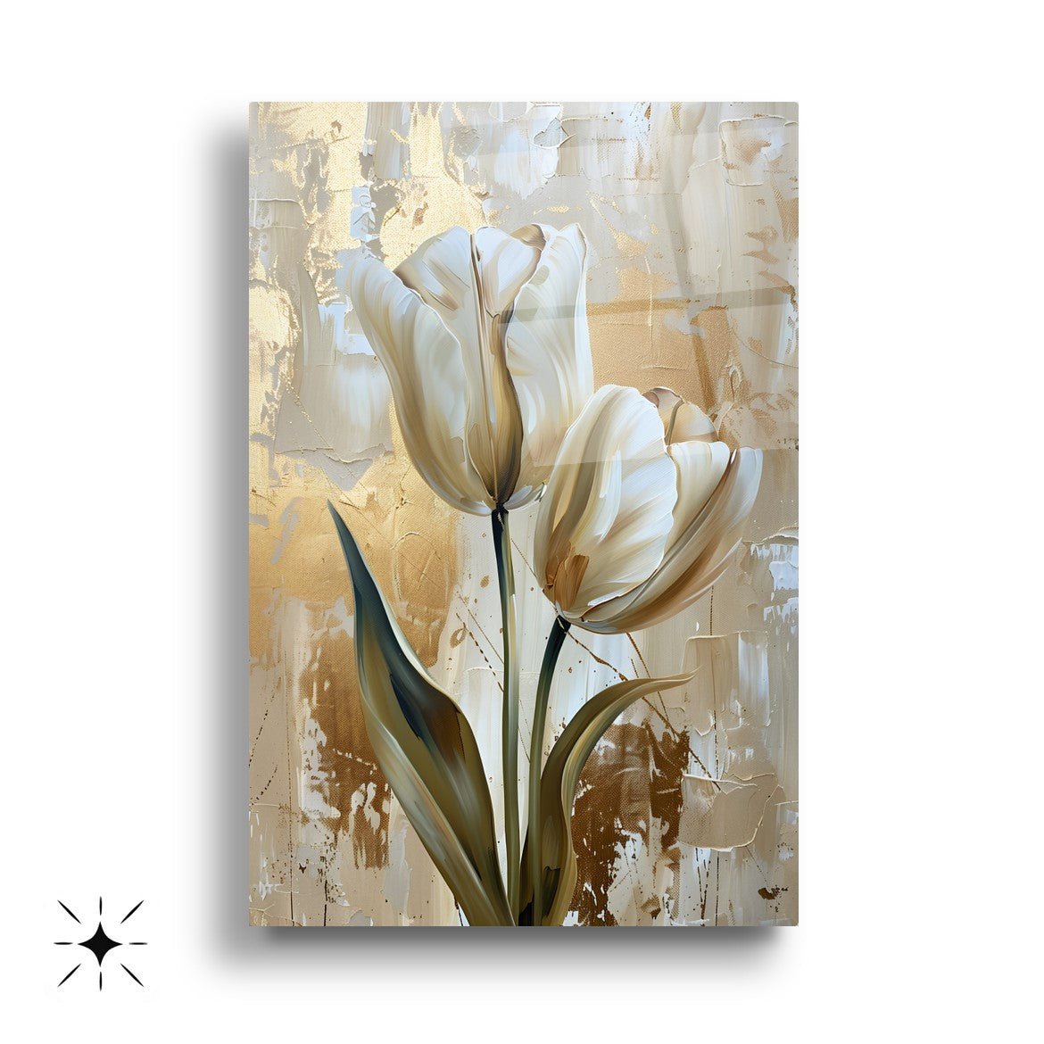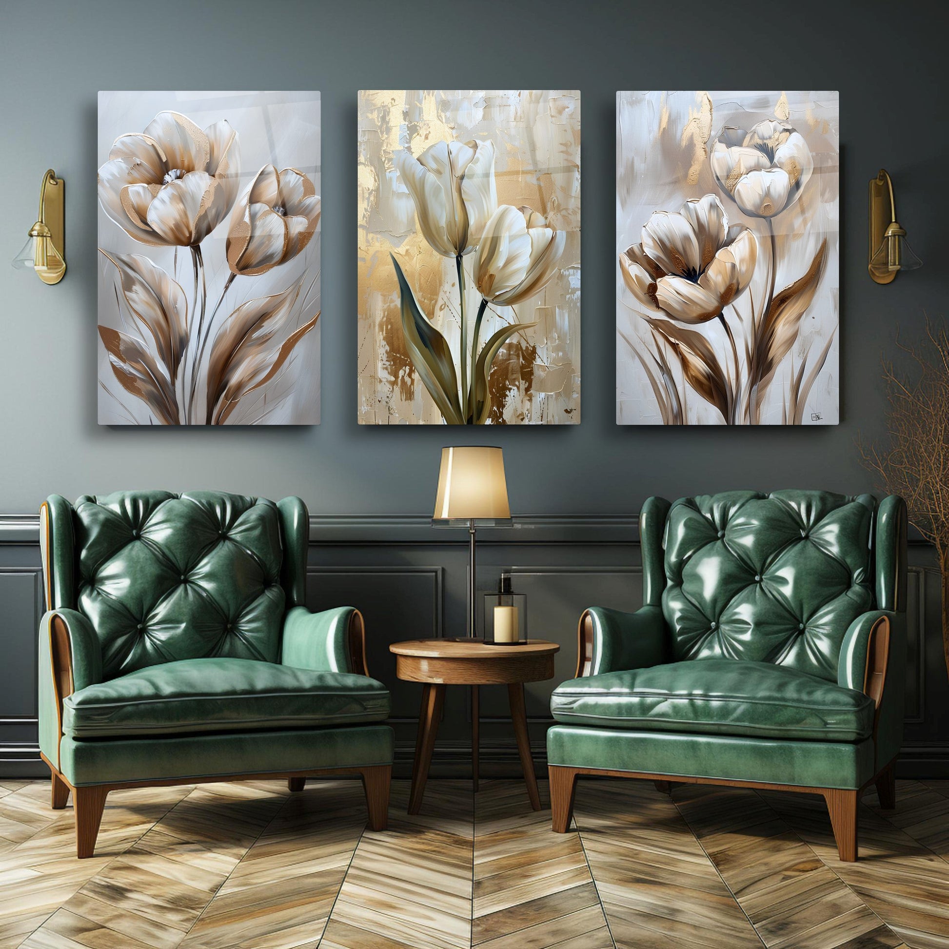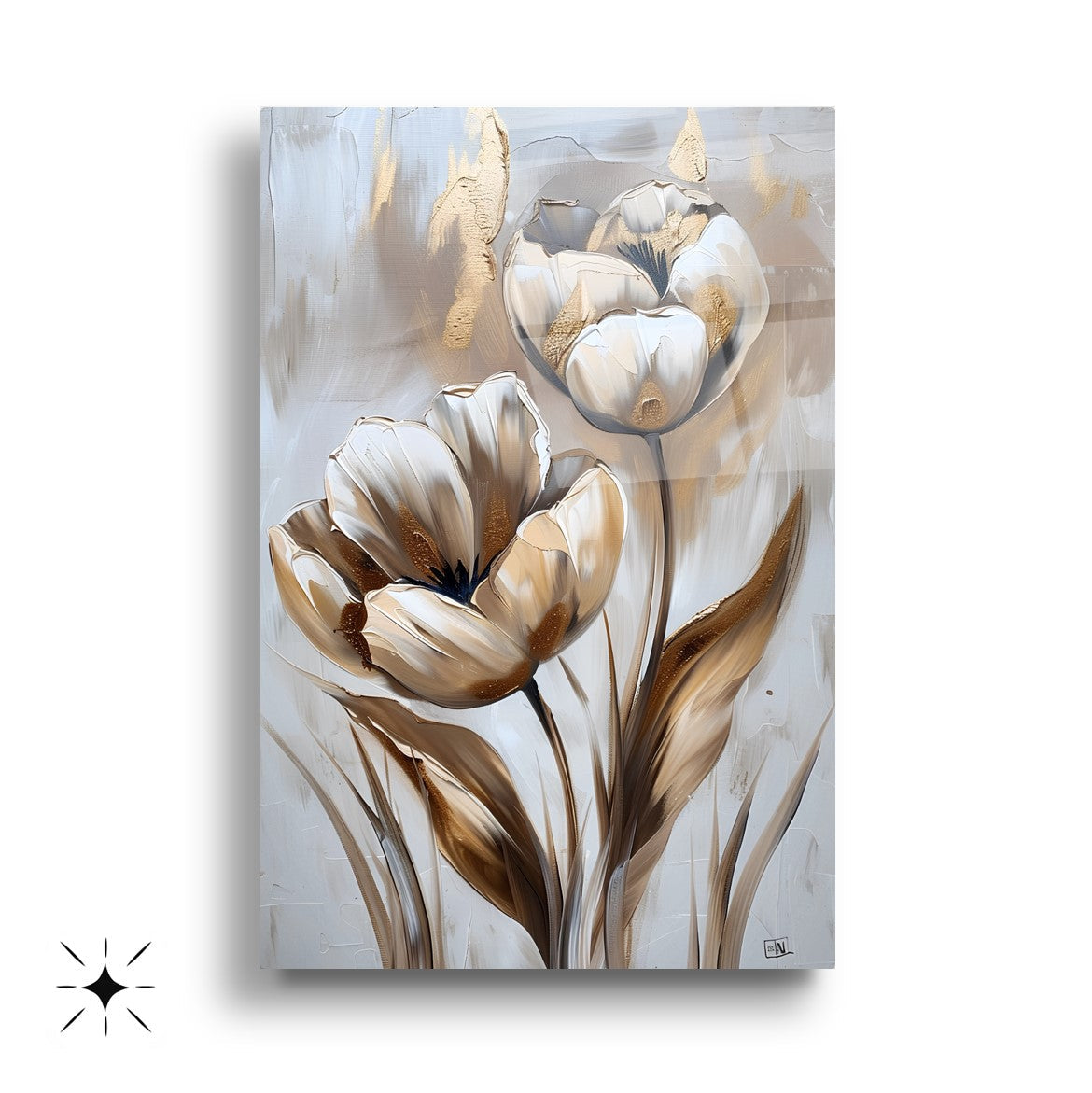 Gold ve gümüş tonlarıyla işlenen eskitme tarzı lale desenleri, bu büyük boy kırılmaz cam tablo setine klasik ve zarif bir hava katar. Temperli cam yüzeyiyle hem şıklık hem de dayanıklılık sunar. Salon dekorasyonu için sofistike ve estetik bir seçenek olan bu tablo, çiçeklerin zarafetini modern bir stille birleştirir. Minimal detaylarla zamansız bir atmosfer oluşturur.