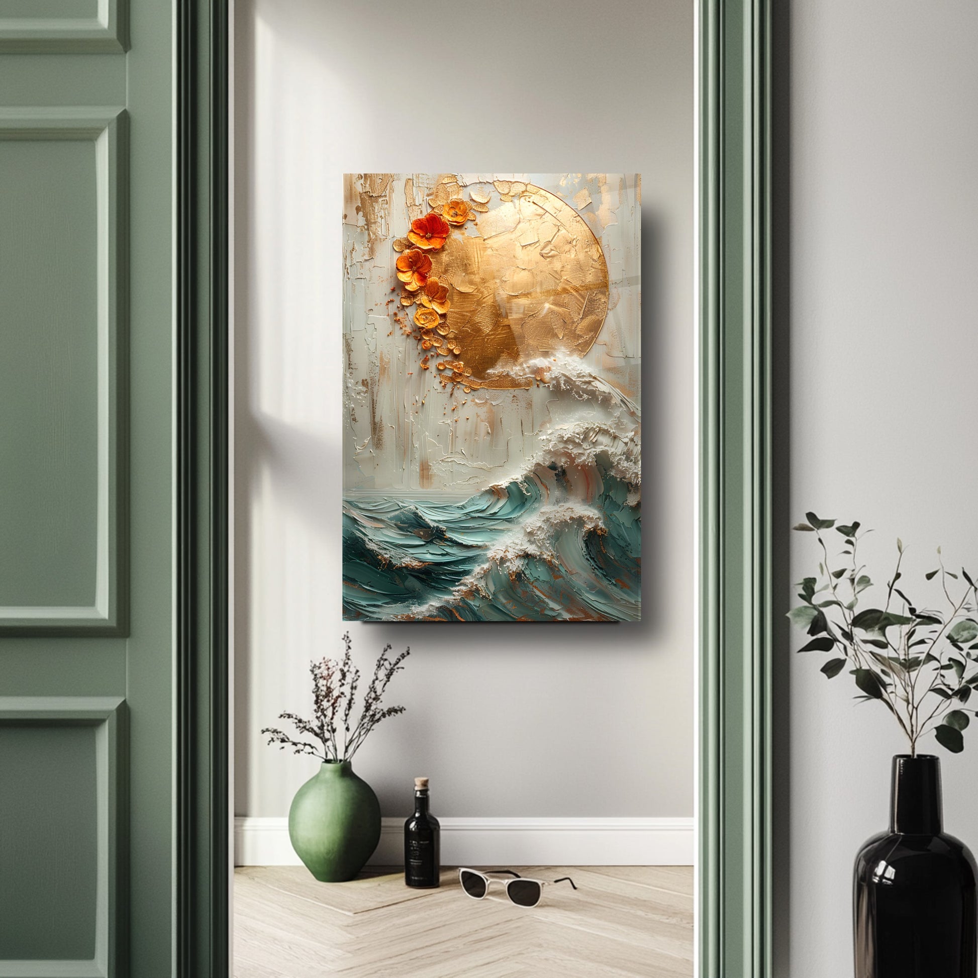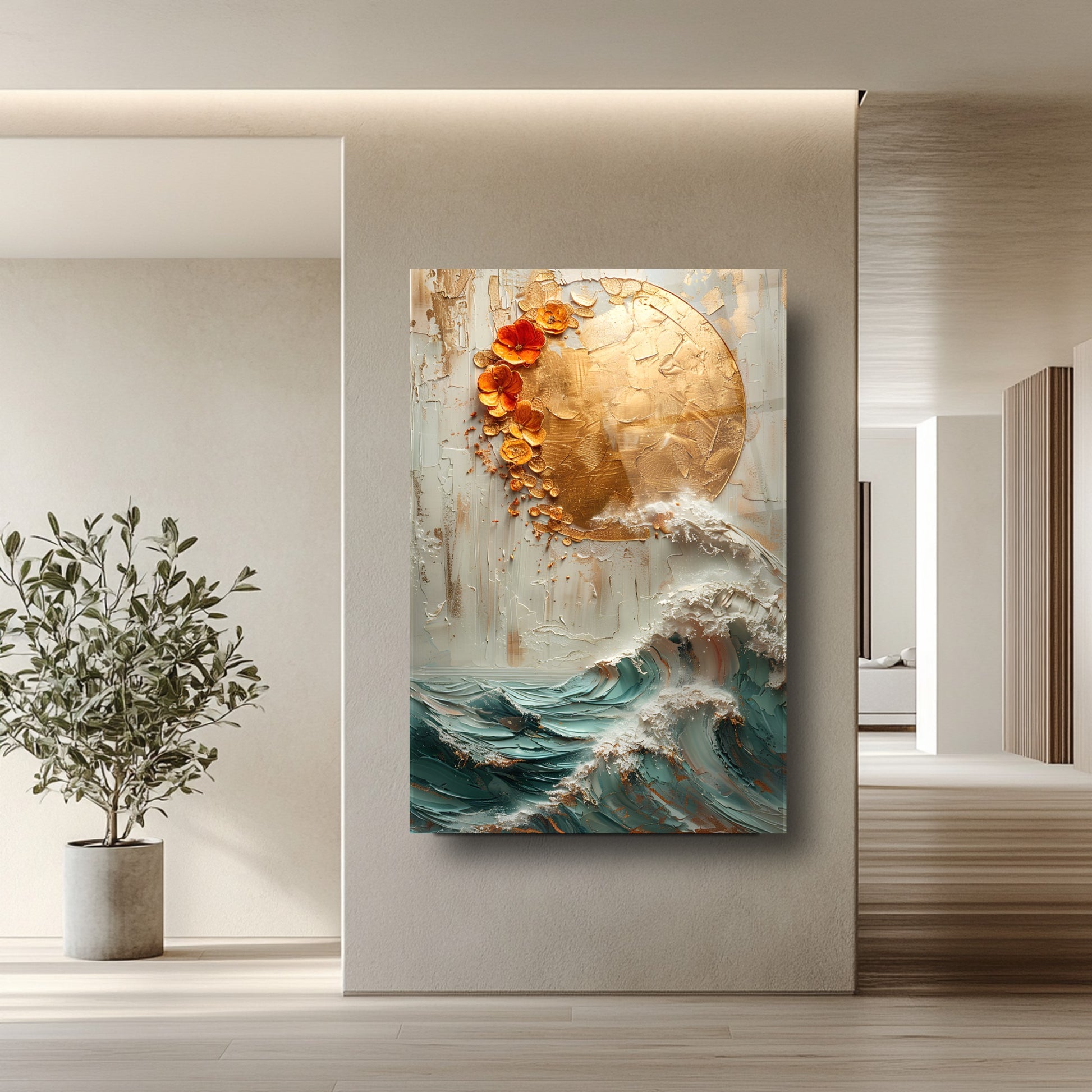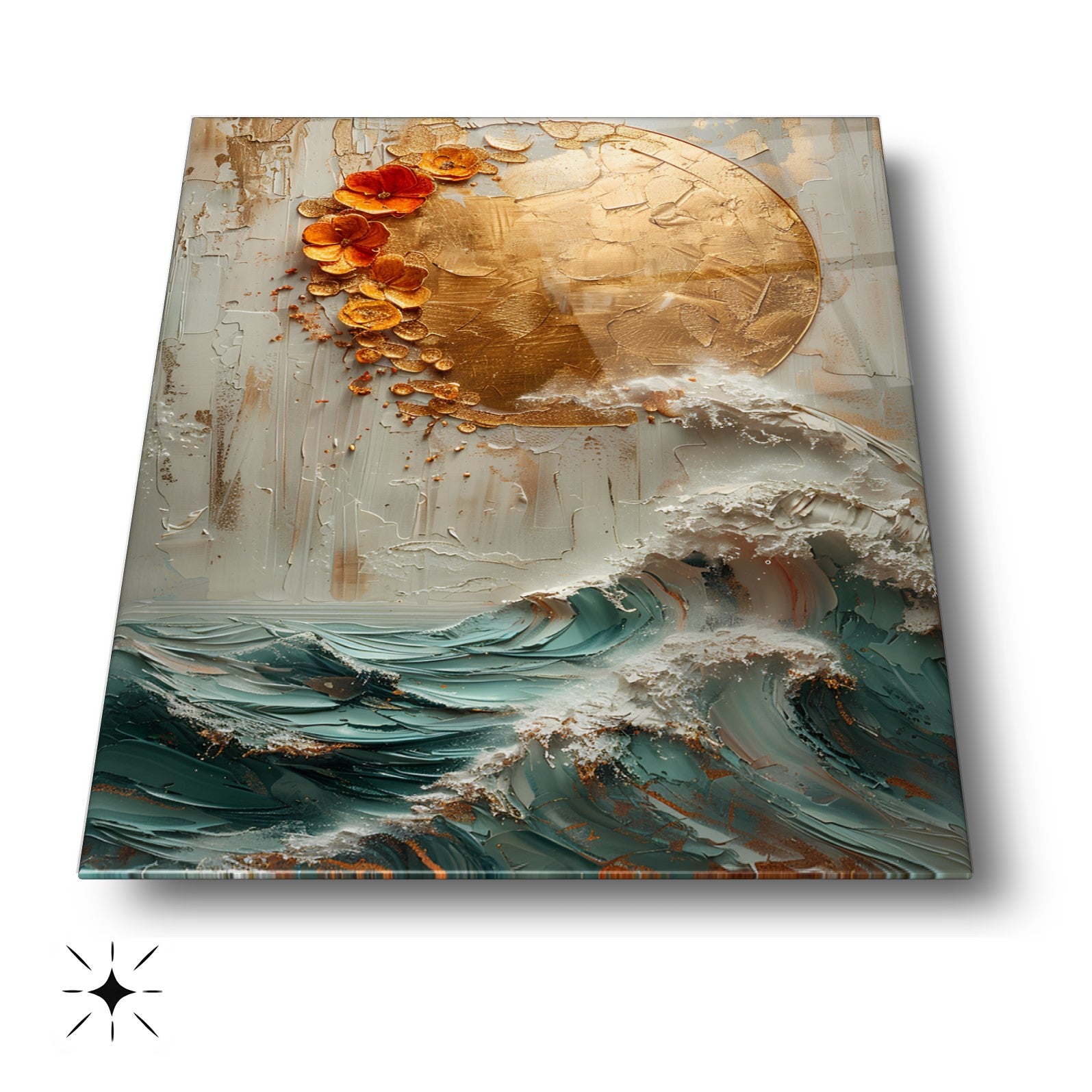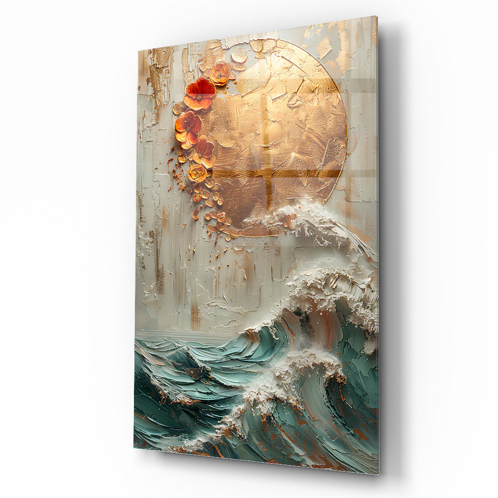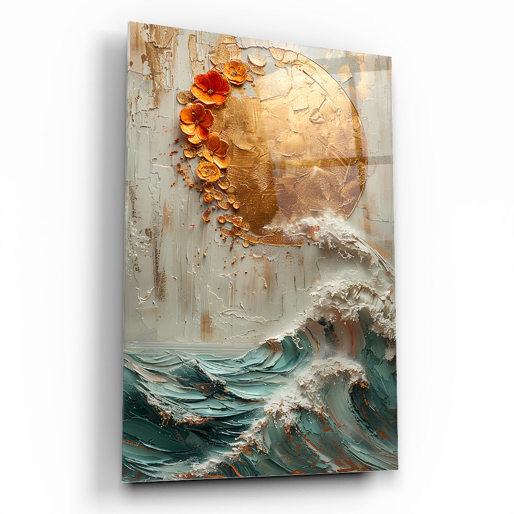 Doğadan ilham alan bu kırılmaz cam tablo, dayanıklı temperli camdan üretilmiş gerçek cam tablodur. Gold detaylarla süslenmiş güneş ve deniz dalgası kabartma deseni, ev ve ofis dekorasyonlarına zarif ve şık bir dokunuş katar. Uzun ömürlü yapısıyla mekanlarınıza estetik ve modern bir hava sağlar.