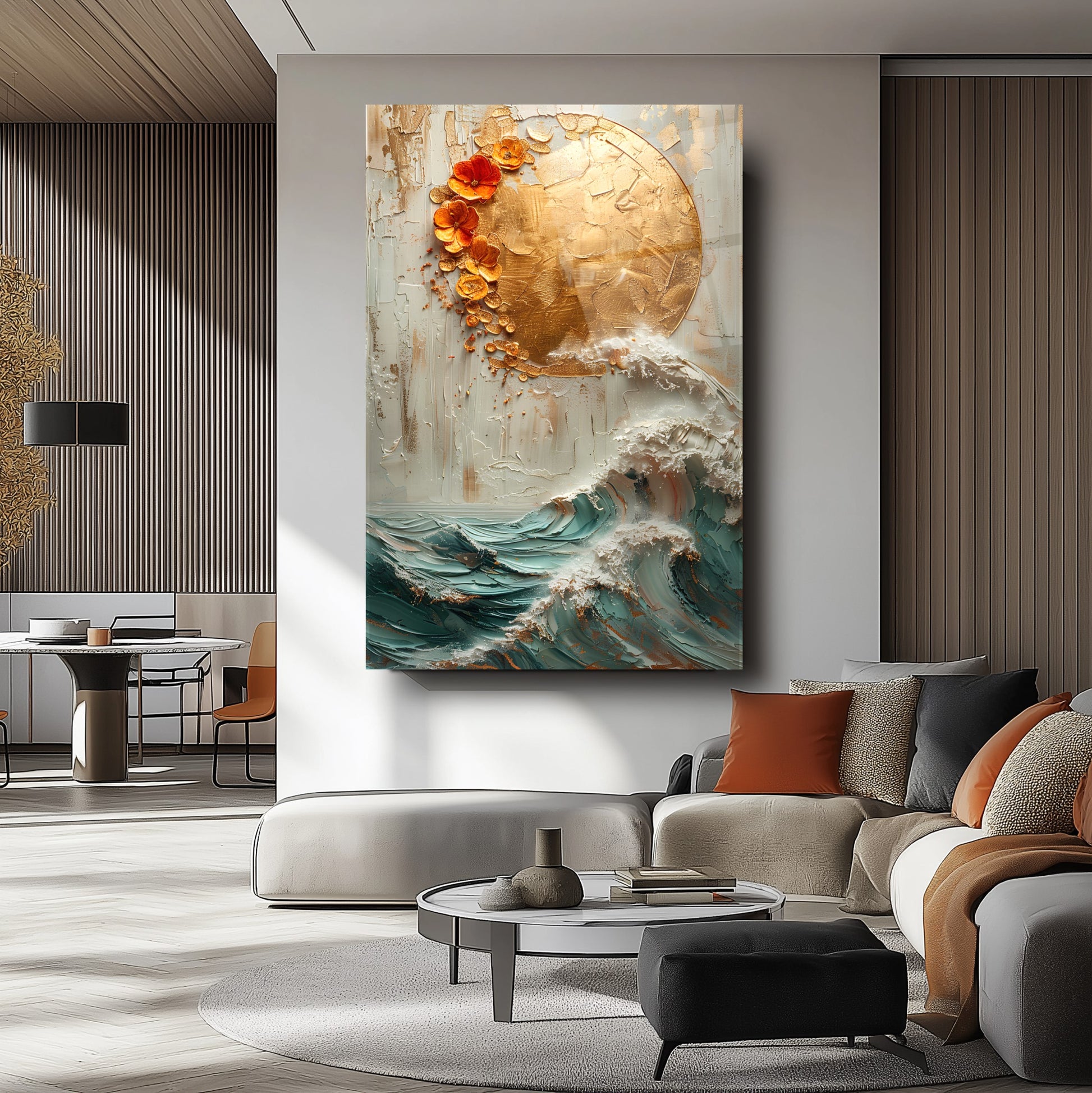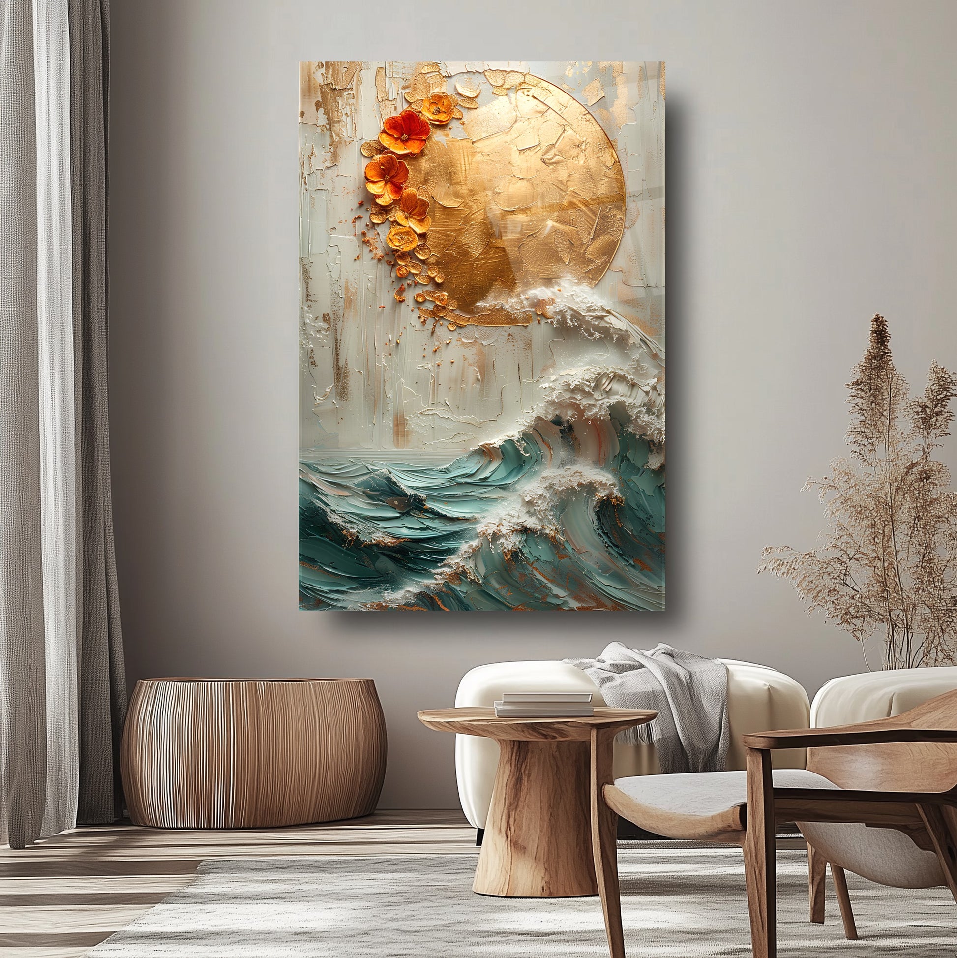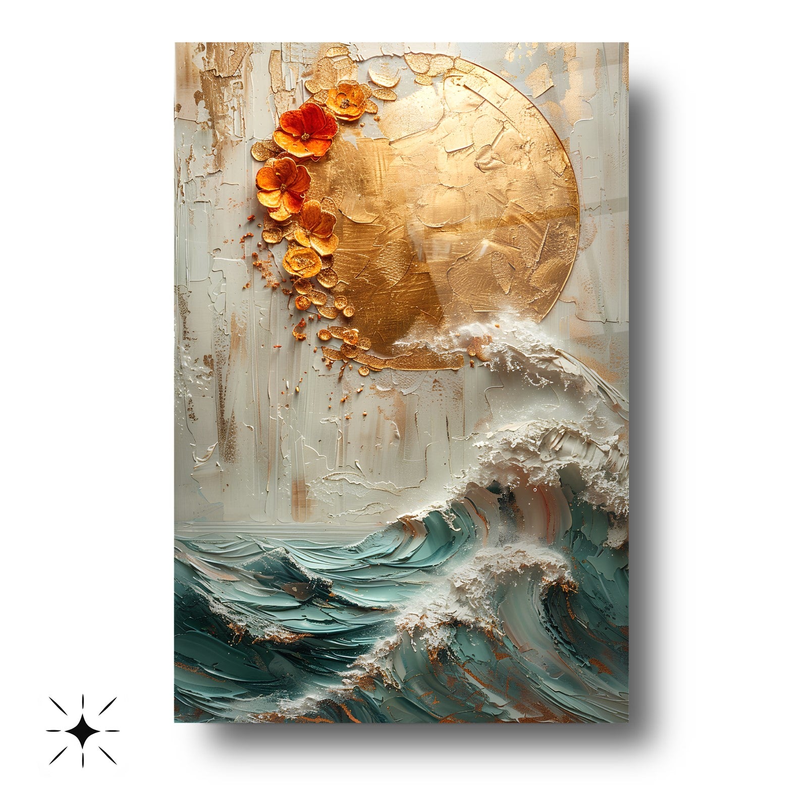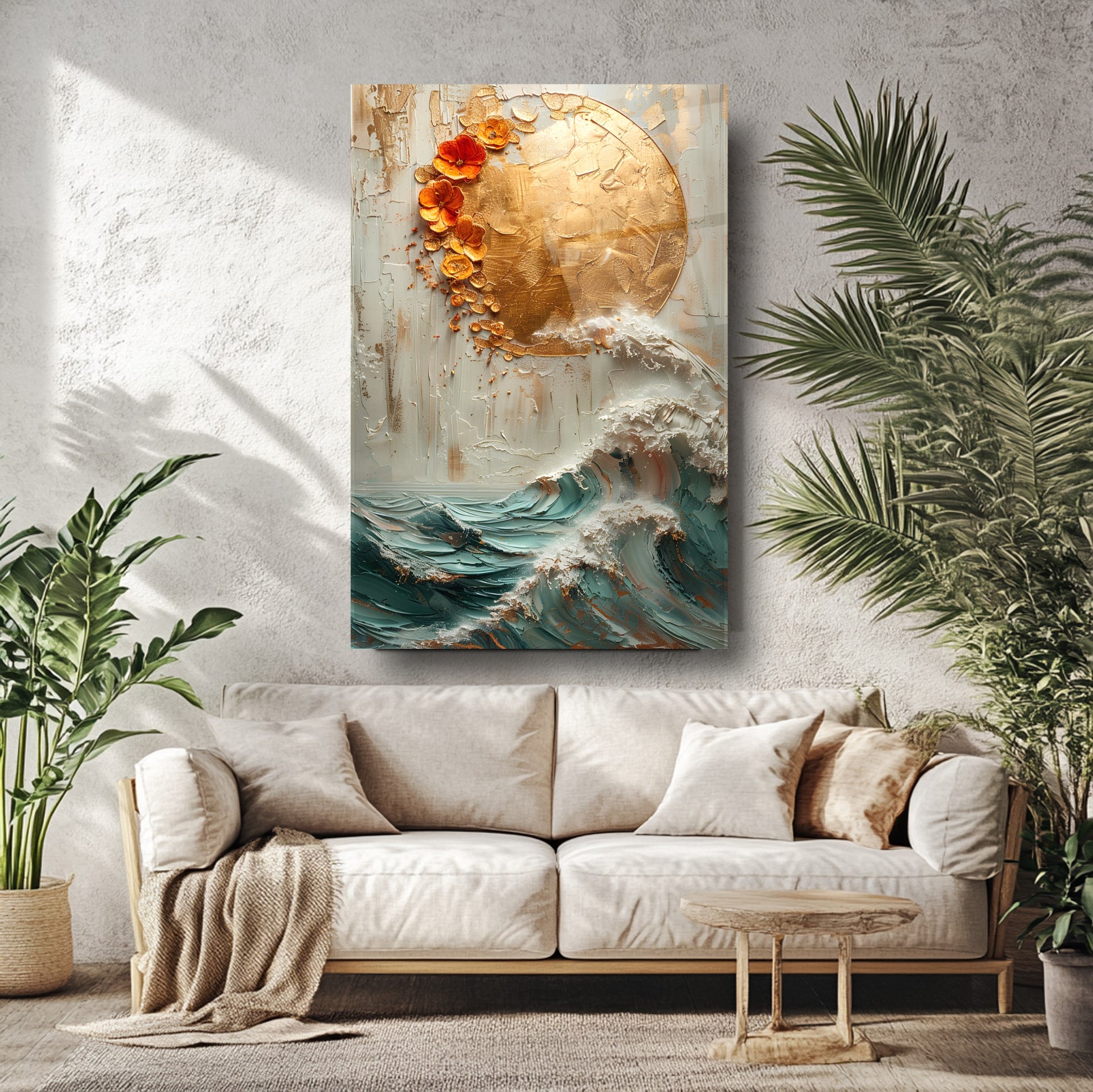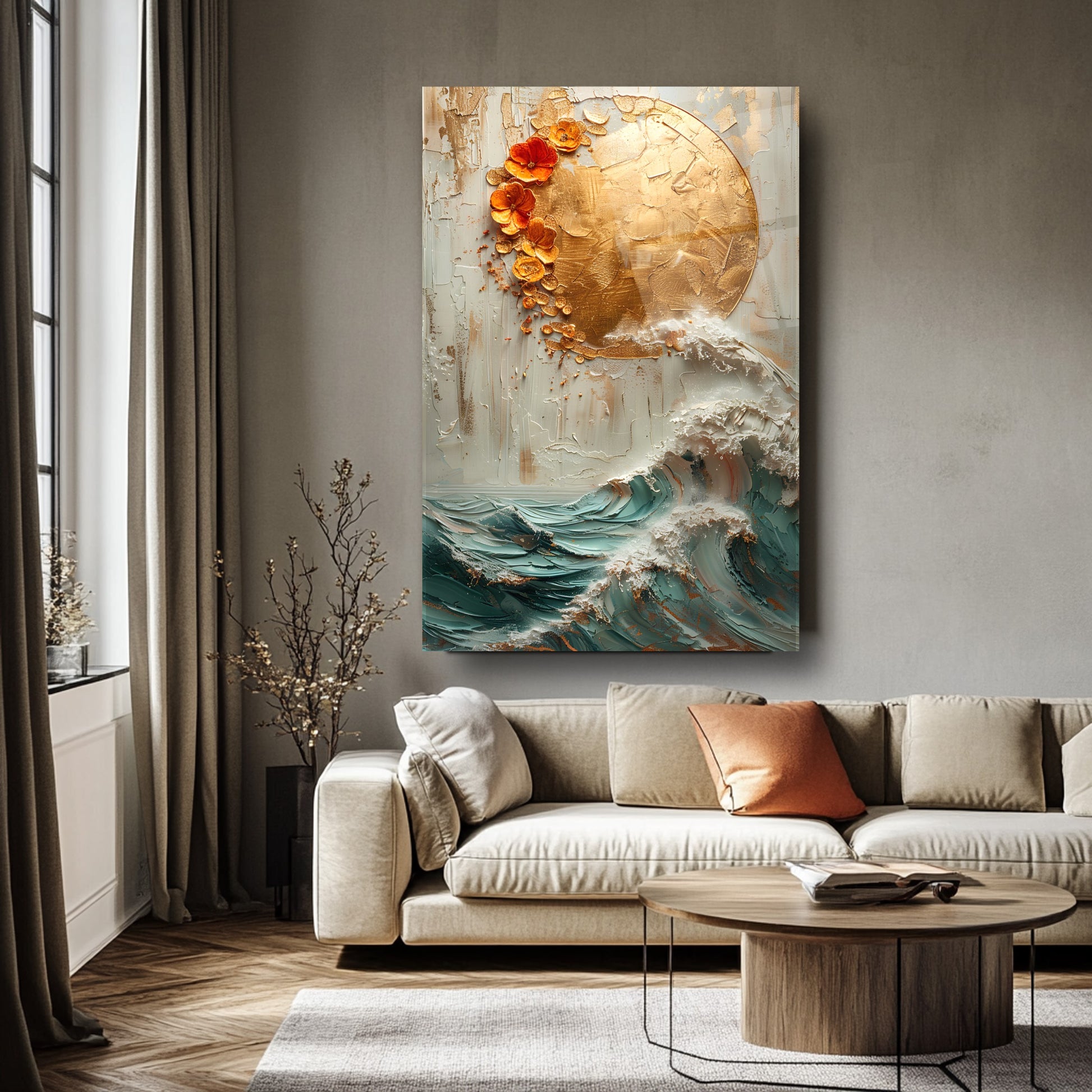 Doğadan ilham alan bu kırılmaz cam tablo, dayanıklı temperli camdan üretilmiş gerçek cam tablodur. Gold detaylarla süslenmiş güneş ve deniz dalgası kabartma deseni, ev ve ofis dekorasyonlarına zarif ve şık bir dokunuş katar. Uzun ömürlü yapısıyla mekanlarınıza estetik ve modern bir hava sağlar.