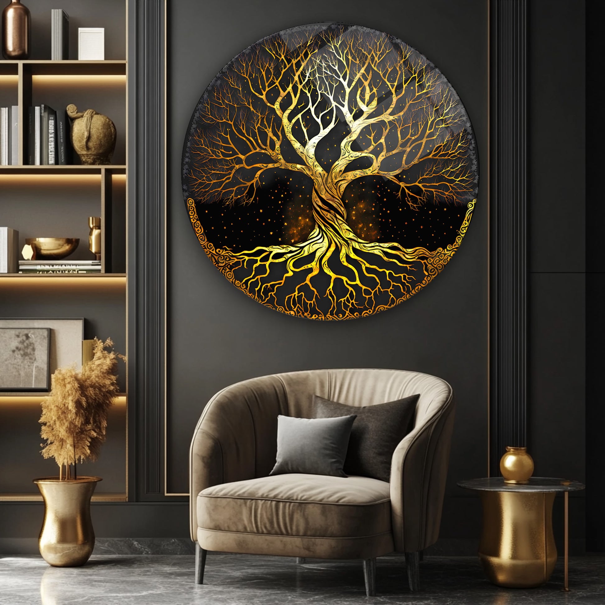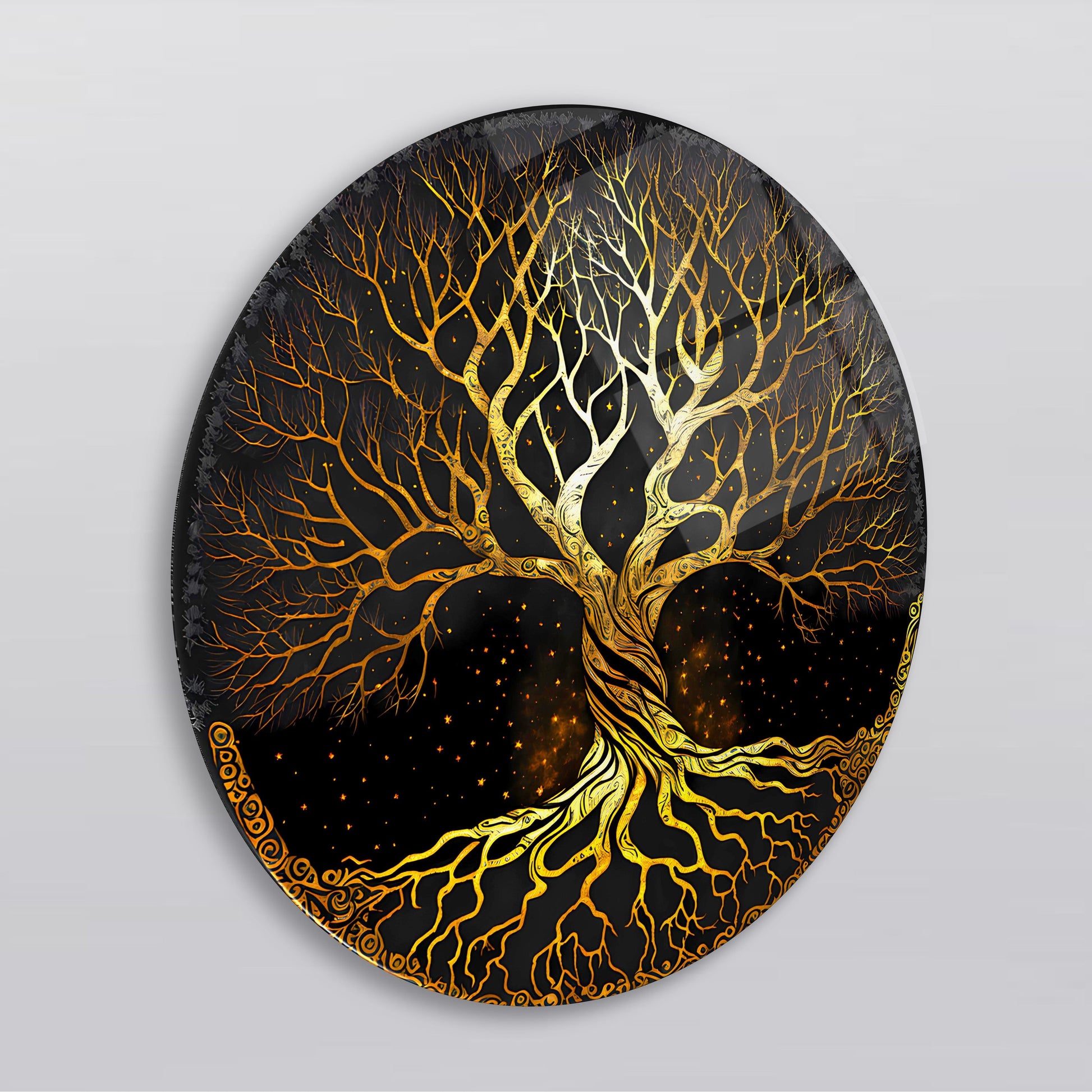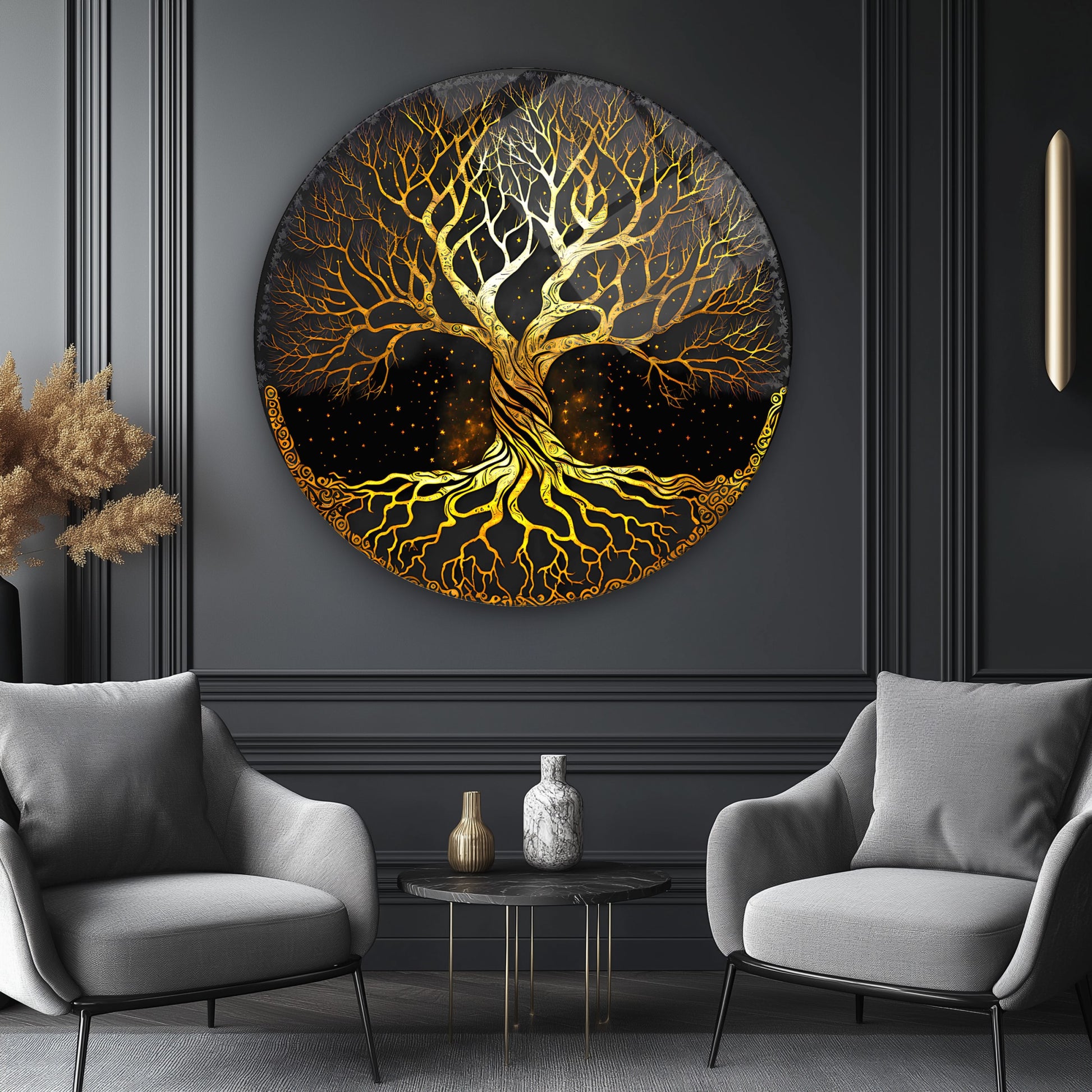Gold Hayat Ağacı Yuvarlak Cam Tablo