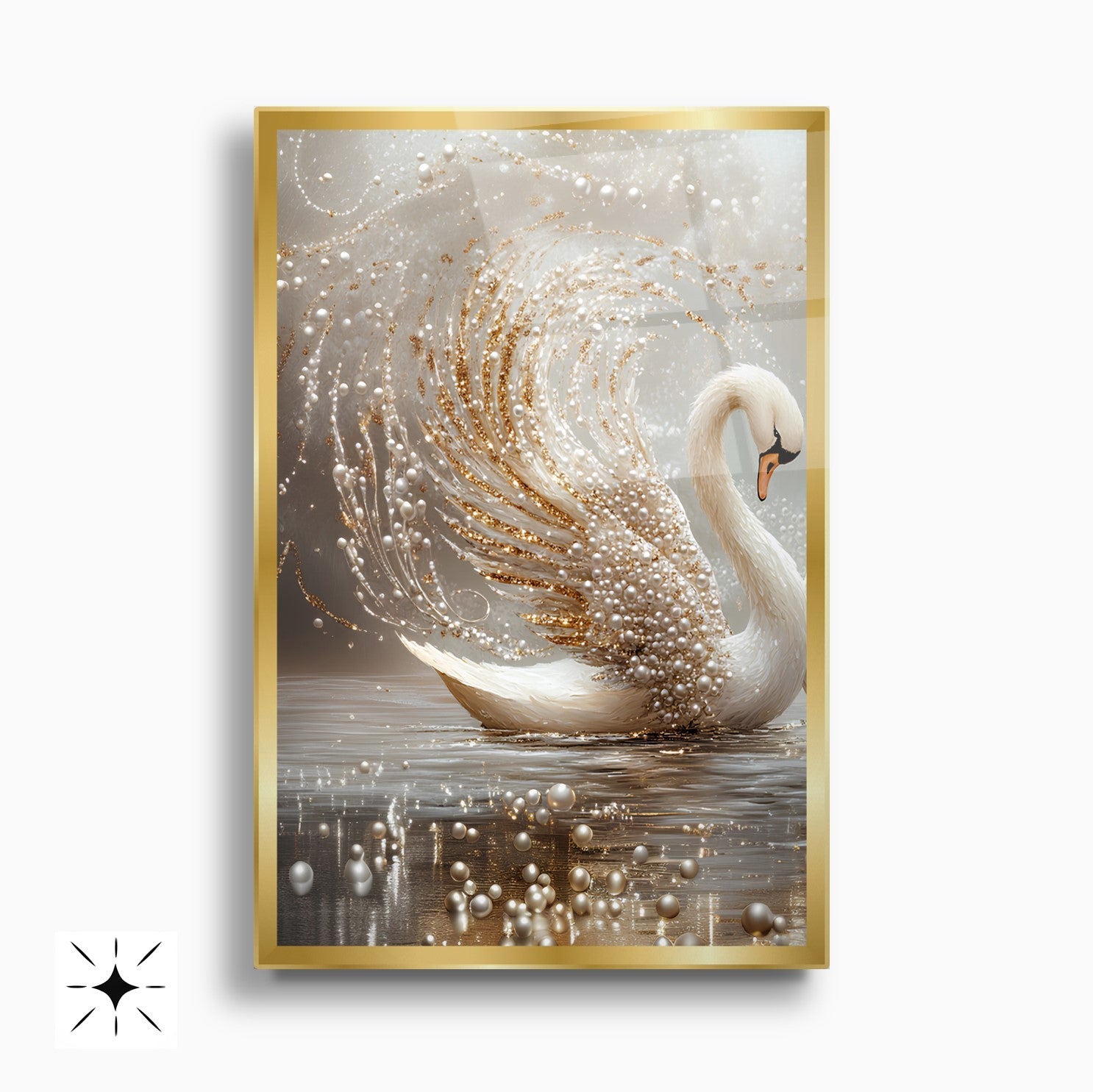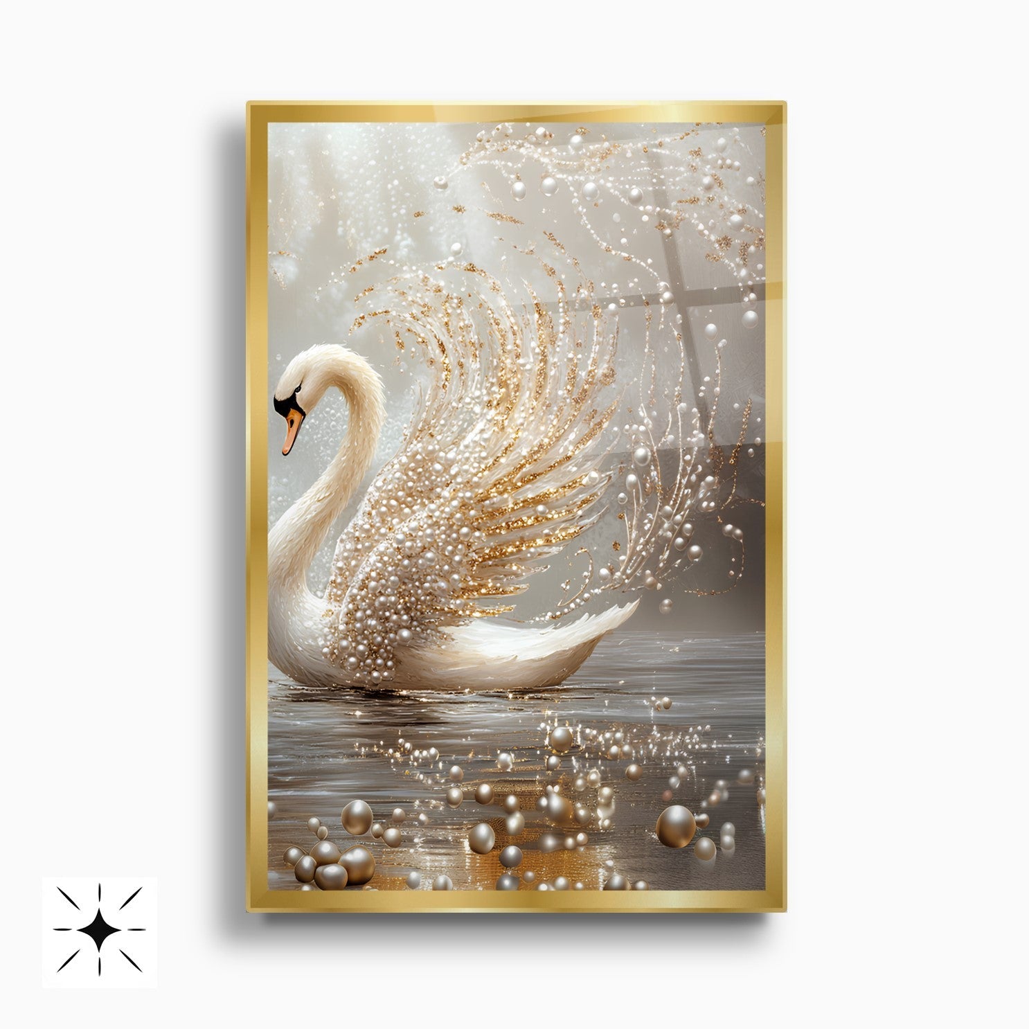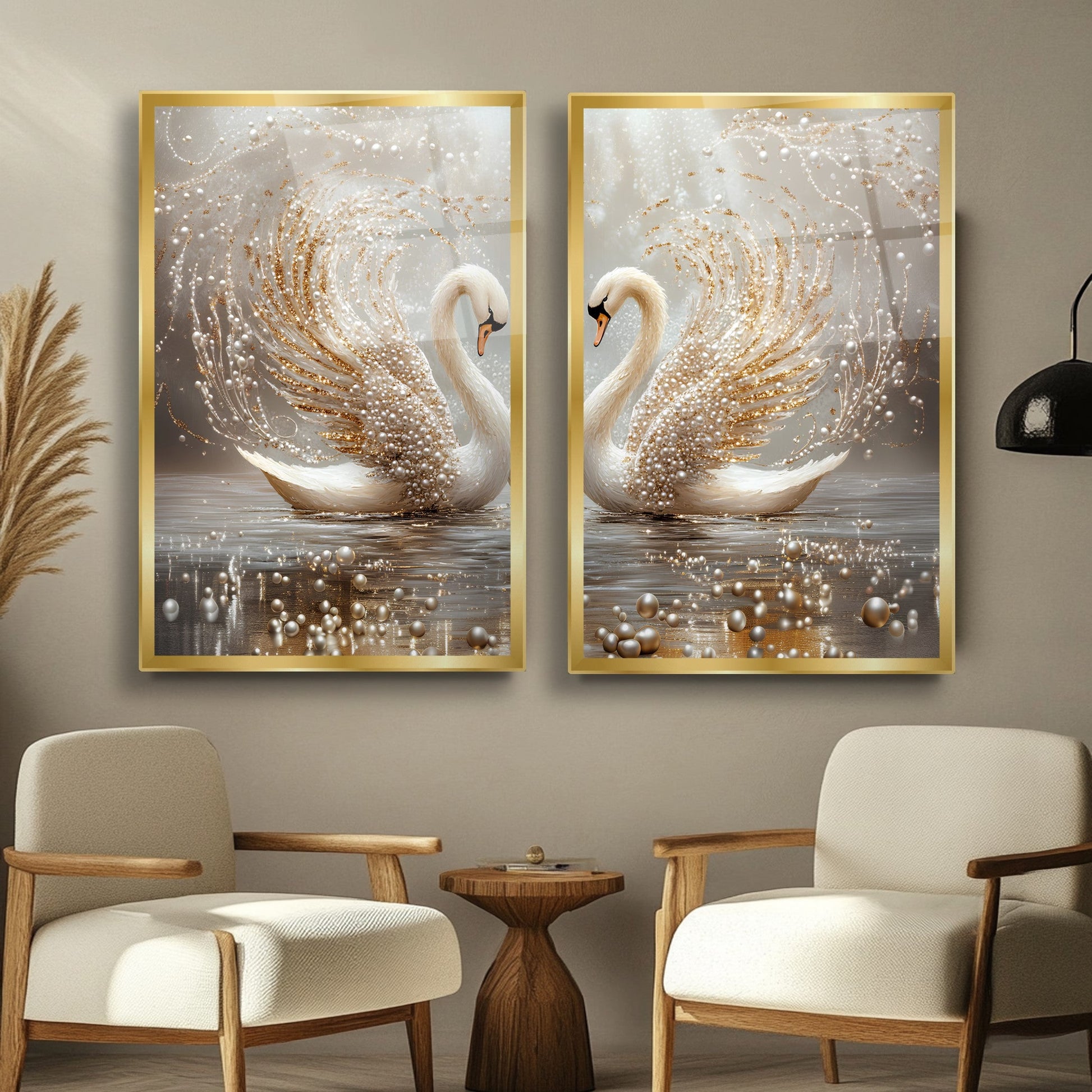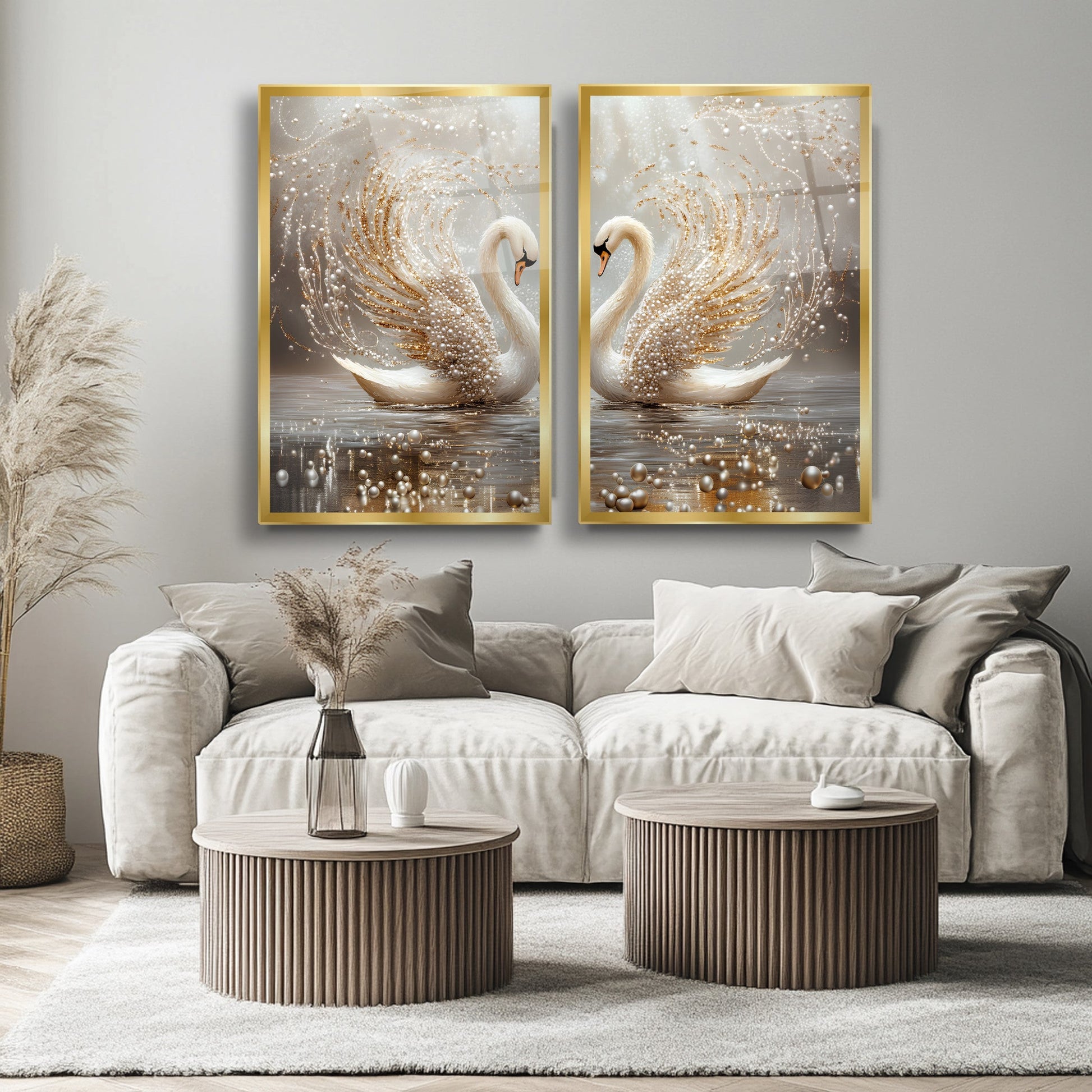 Gold İncili Çifte Kuğular İkili Set Cam Tablo