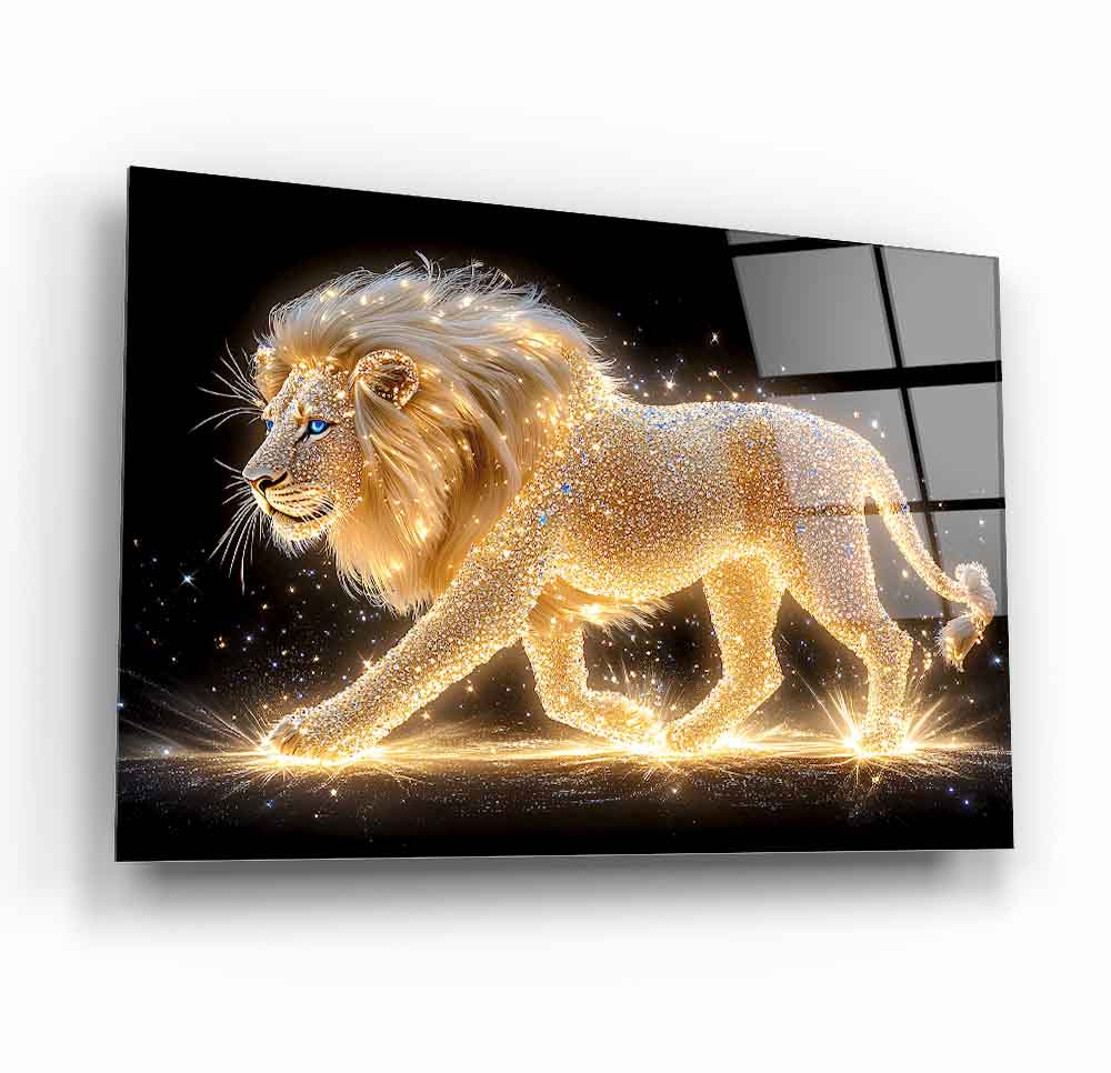 Gücün ve İhtişamın Parıltısı: Gold Işıklı Aslan Modern Kırılmaz Cam Tablo