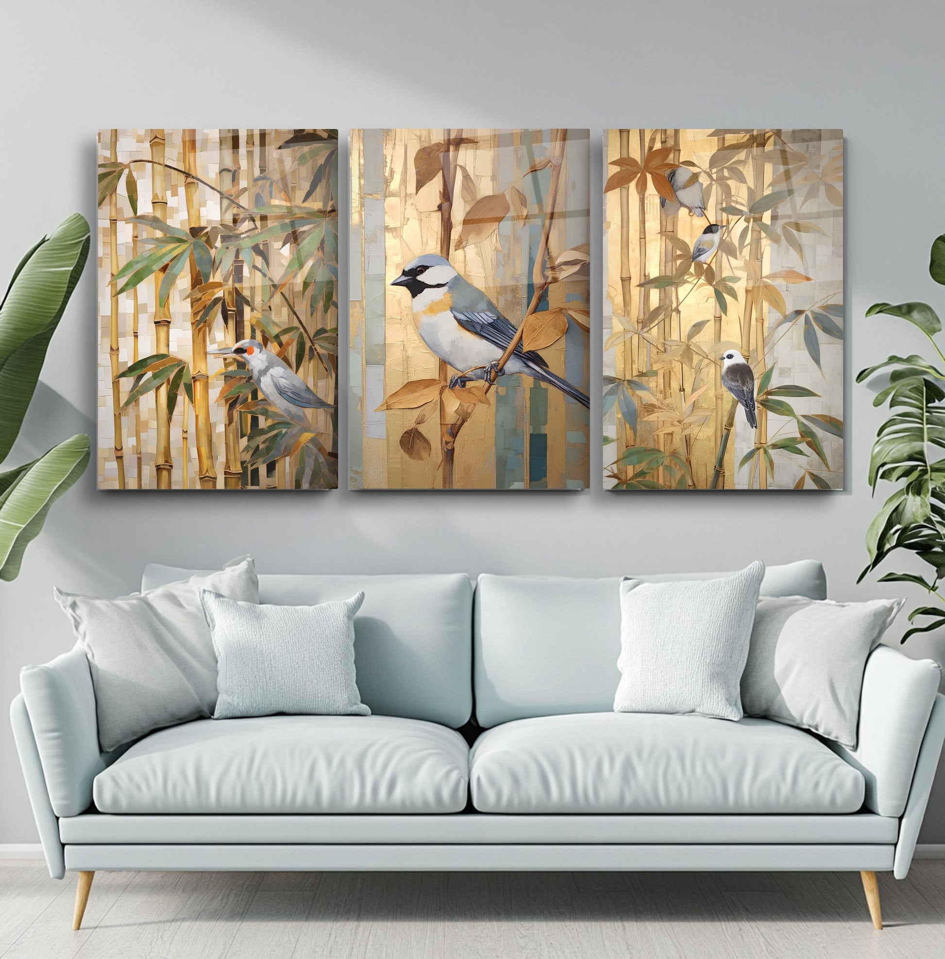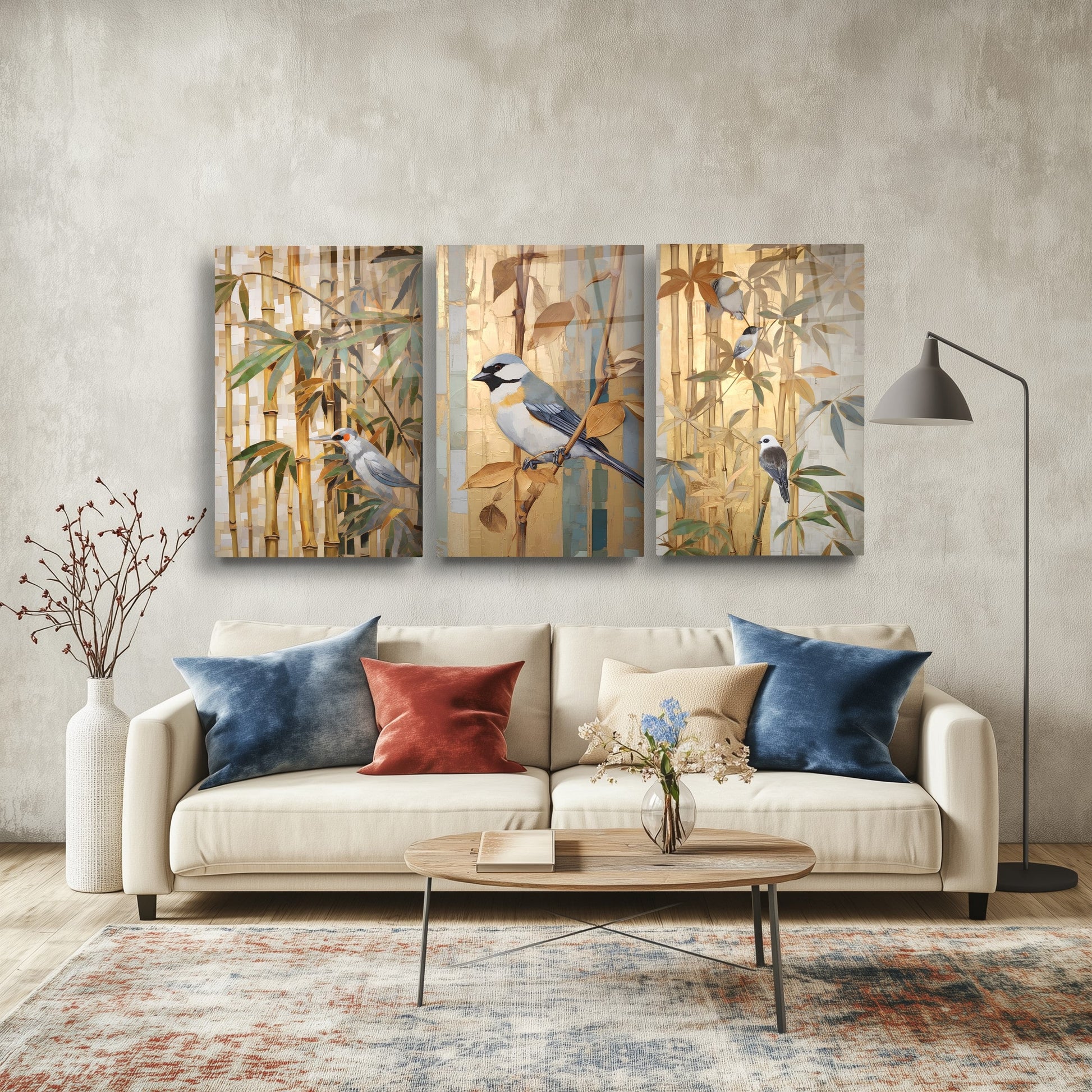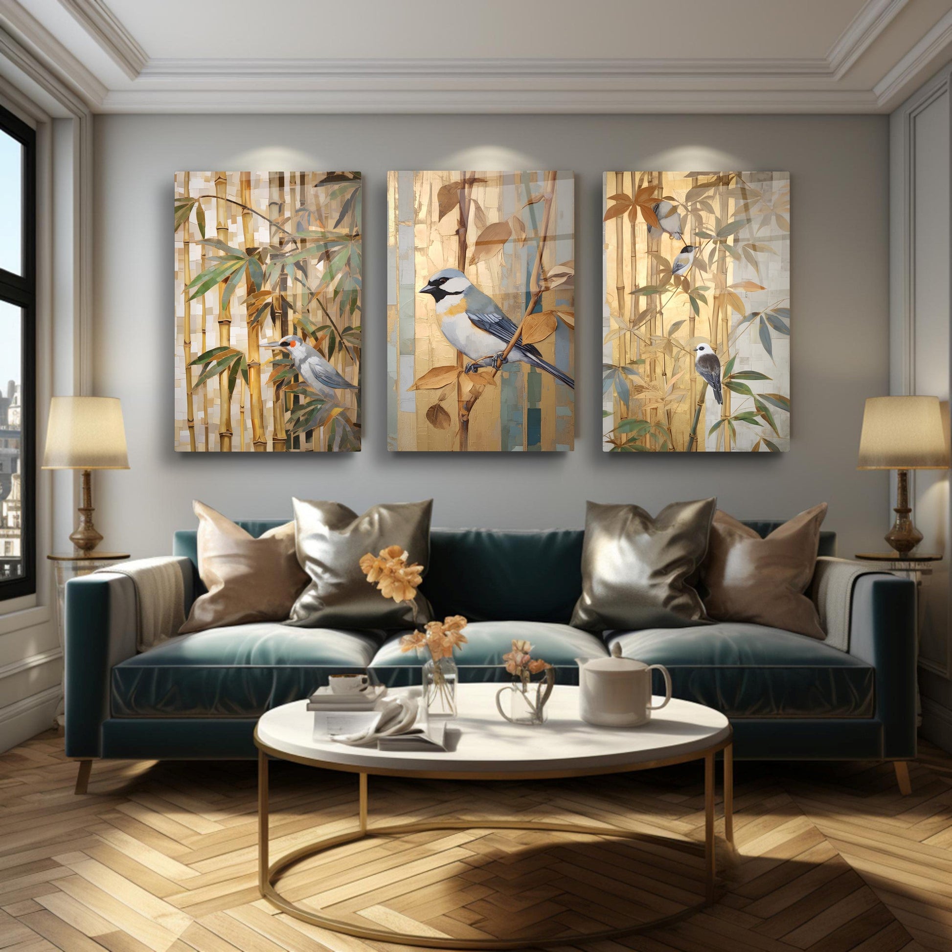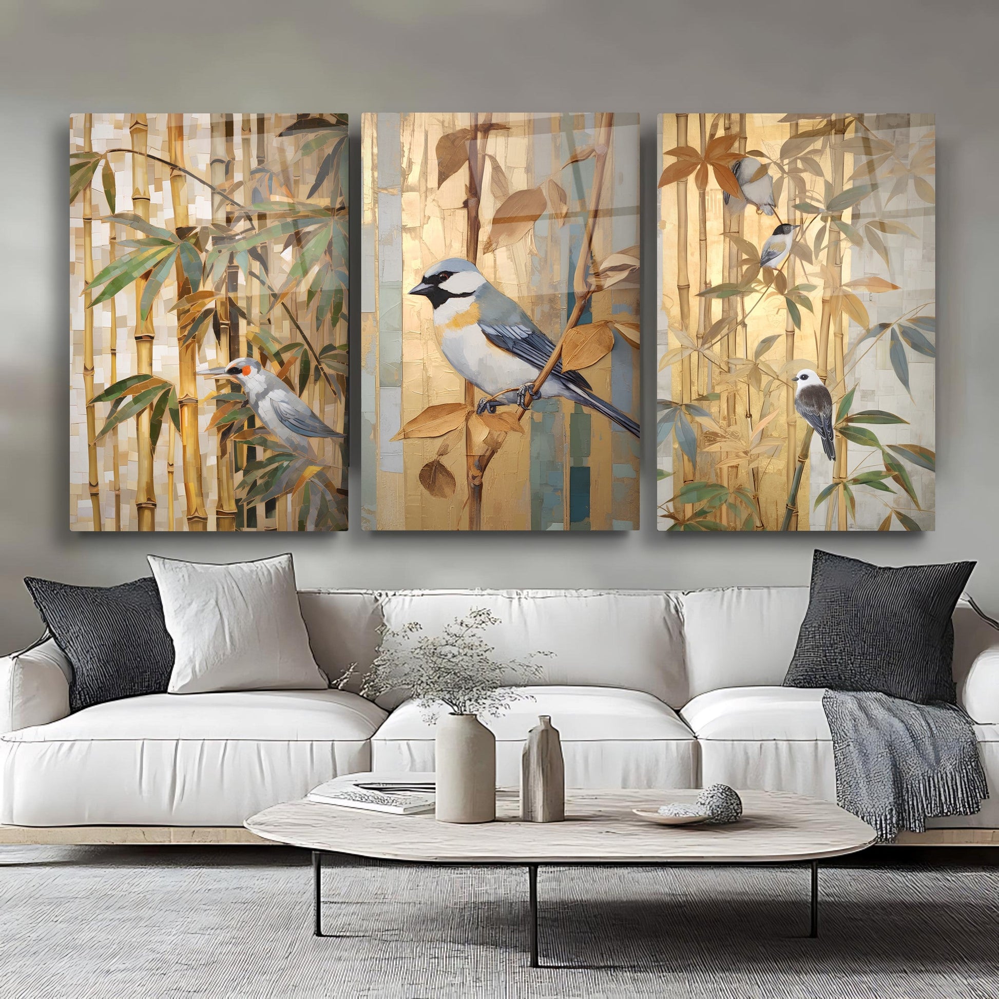 Gold ve kahve tonlarıyla betimlenen bambu ağacı ve serçe kuşları, bu büyük boy kırılmaz cam tablo setine doğal ve huzur verici bir atmosfer kazandırır. Minimal dokunuşlarla oluşturulan tasarım, salon dekorasyonu için zarif bir seçenek sunar. Temperli cam yüzeyiyle dayanıklı, uzun ömürlü ve şık bir üründür. Doğa temalı detayları sevenler için modern ve sıcak bir tercih oluşturur.