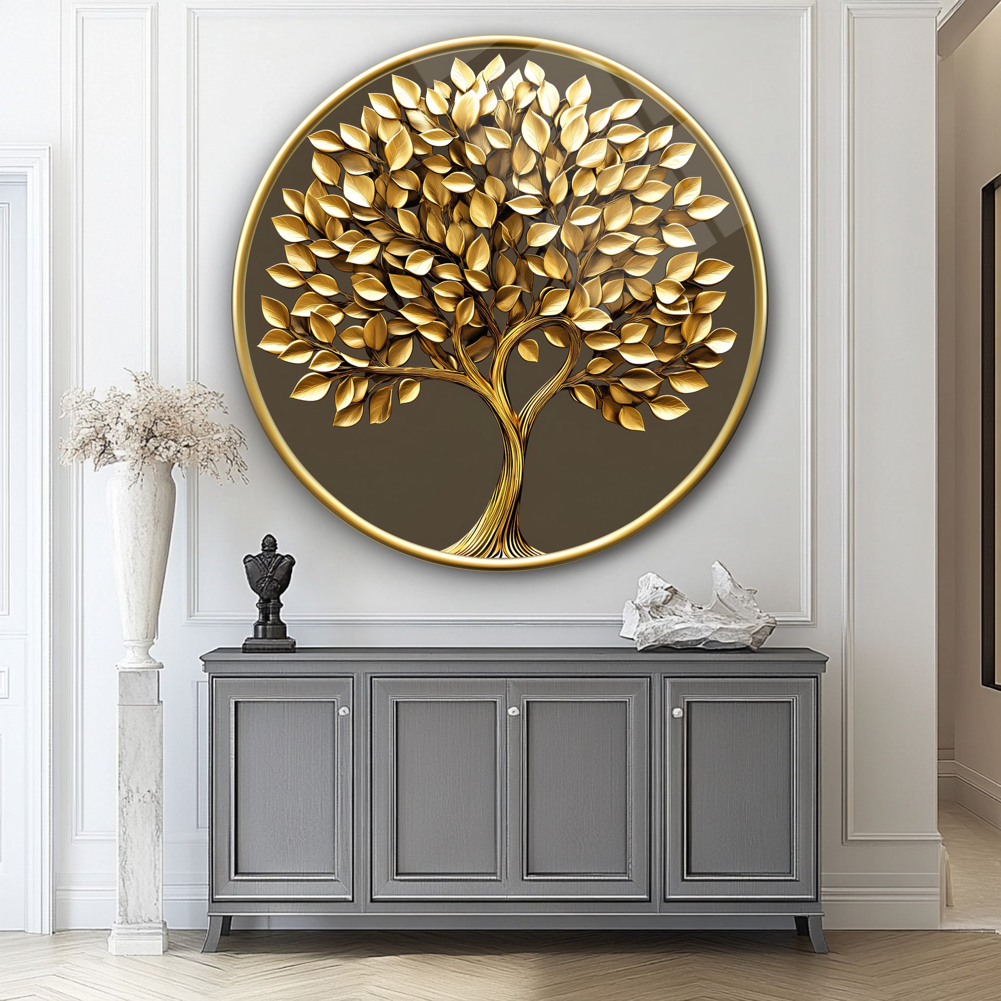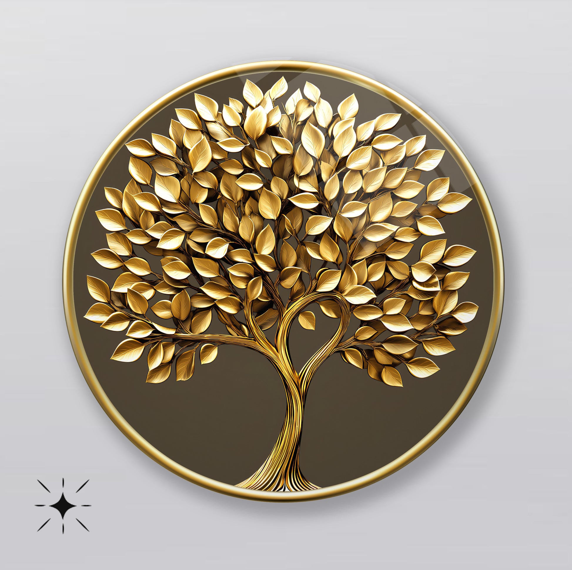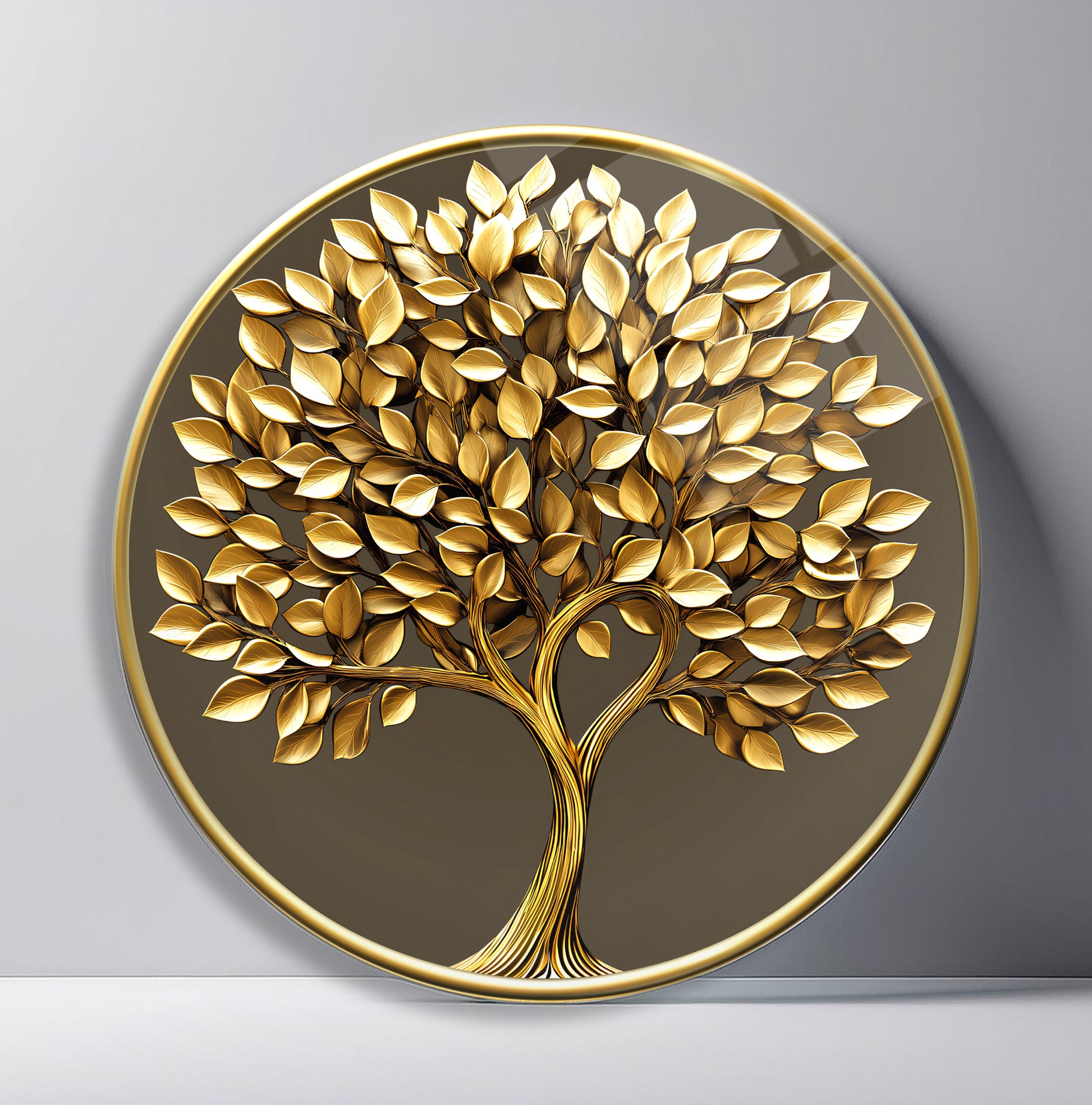 Gold Hayat Ağacı Yuvarlak Cam Tablo