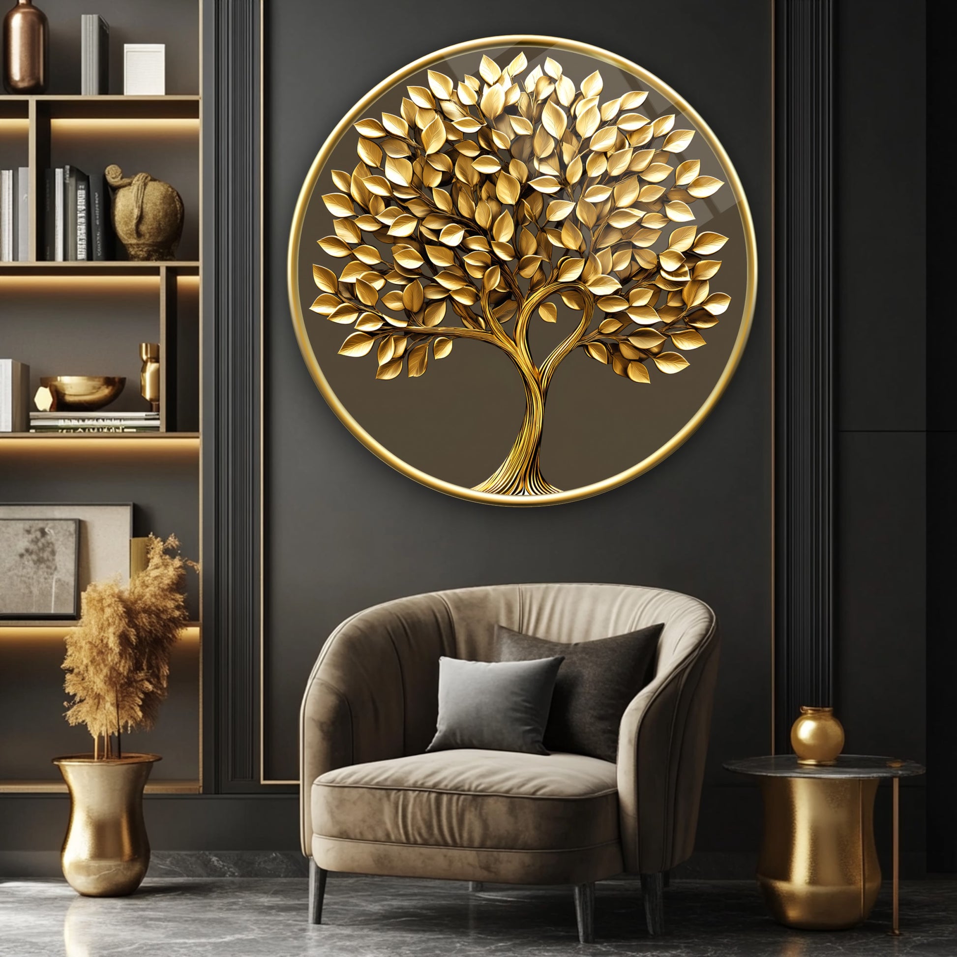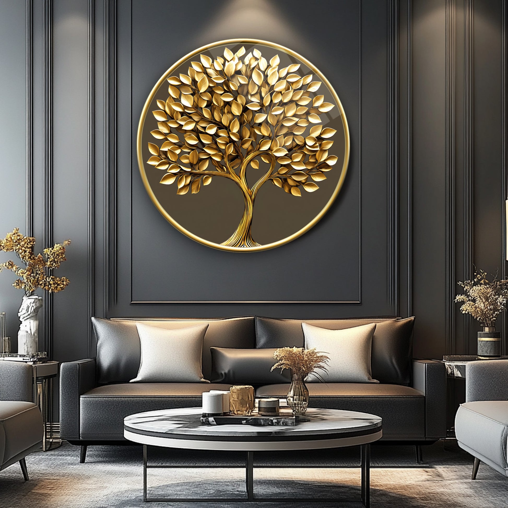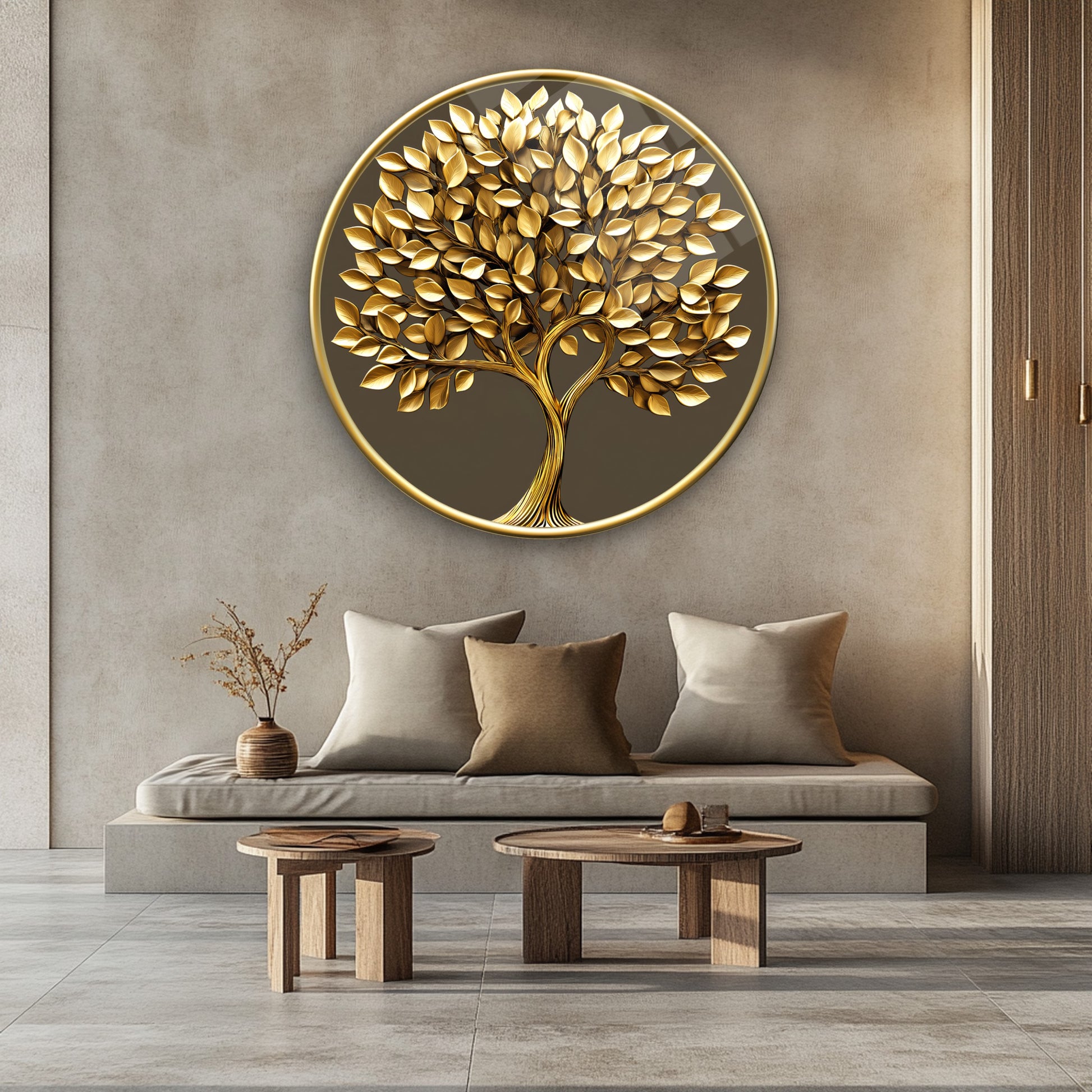 Gold Hayat Ağacı Yuvarlak Cam Tablo