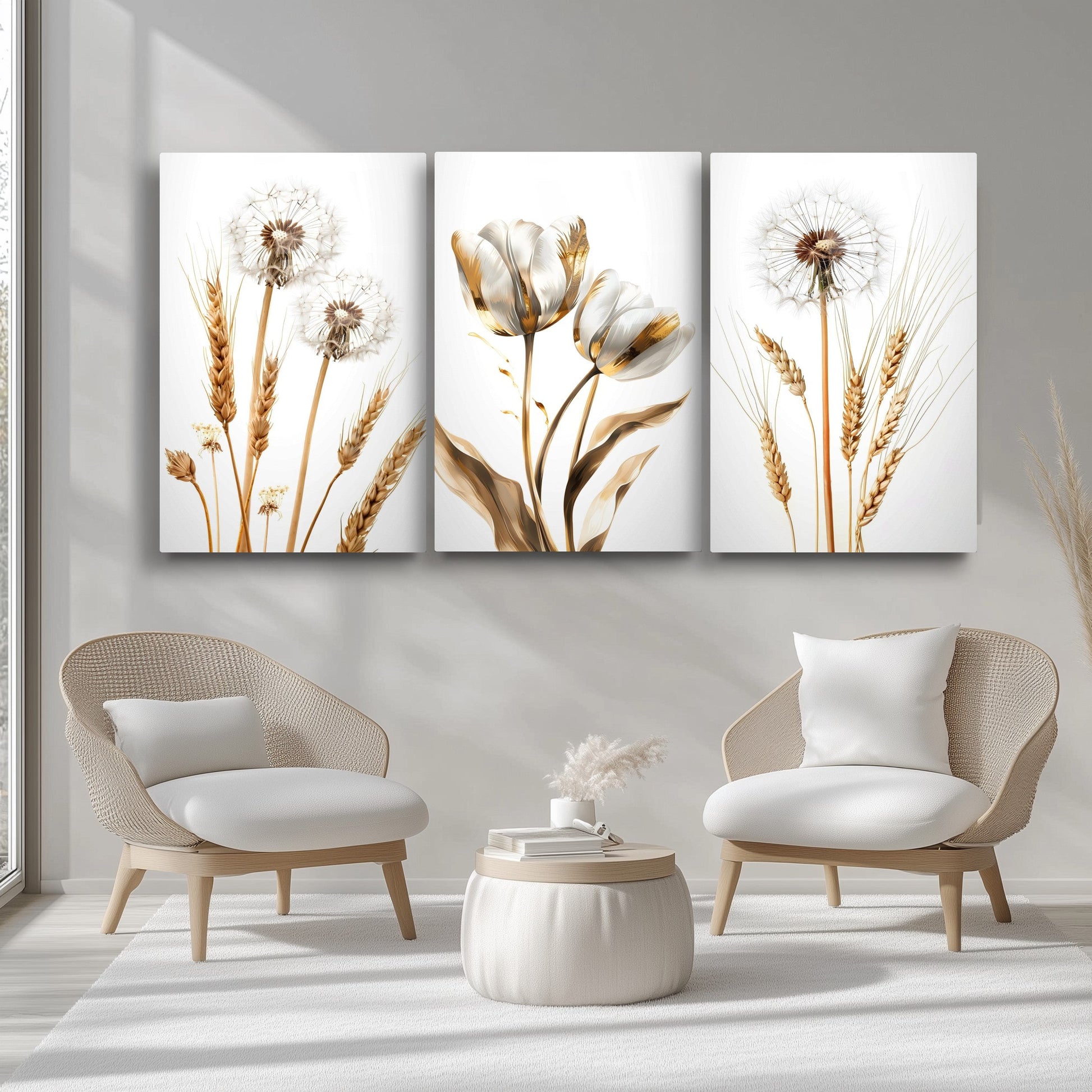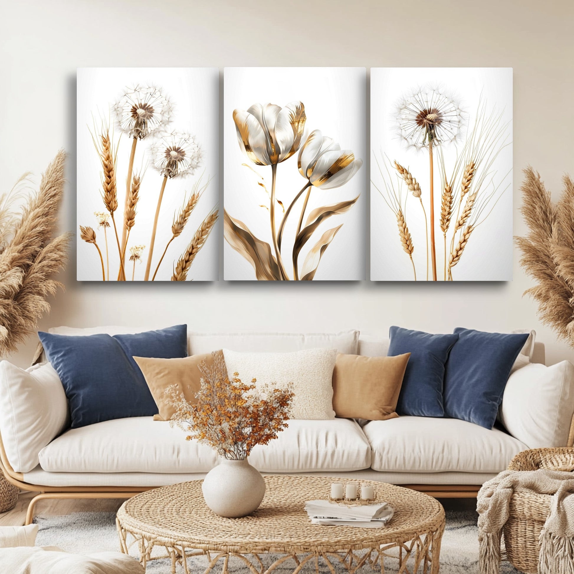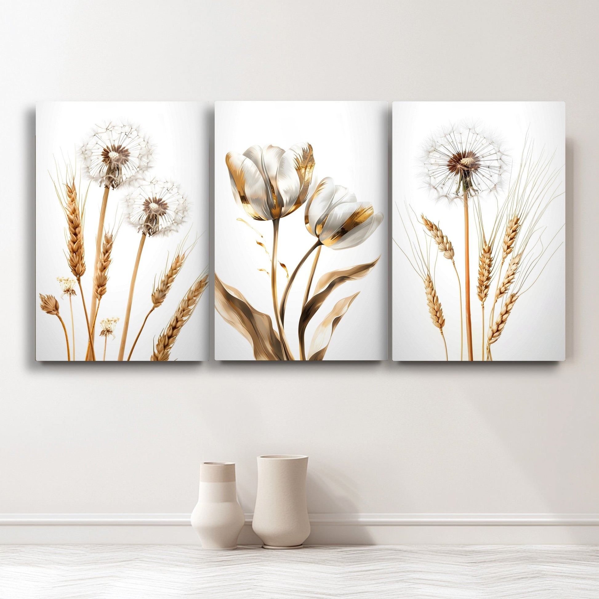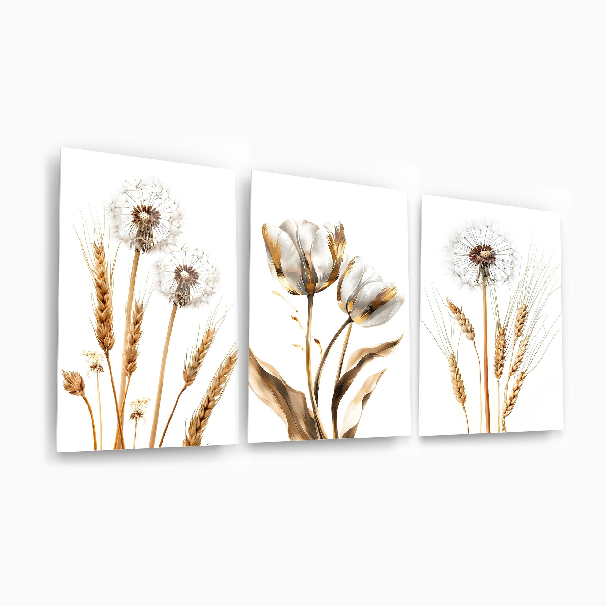 Gold laleler ve karahindiba detaylarıyla süslenmiş bu üçlü cam tablo seti, beyaz arka planı sayesinde ferah ve zarif bir görünüm sunar. Minimal tasarımıyla özellikle modern, sade ve aydınlık dekorasyon stillerine mükemmel uyum sağlar. Salon, yatak odası, antre veya ofis gibi alanlarda hem şıklık hem de huzur etkisi yaratır. UV baskı tekniğiyle hazırlanan desenler, canlılığını uzun yıllar korurken, kırılmaz temperli cam yapısı ile güvenli bir kullanım sunar. Cam baskı modern dekorun vazgeçilmez parçalarından biri olurken, bu tablo seti zarif bir atmosfer arayanlar için etkileyici bir tercih sunar.