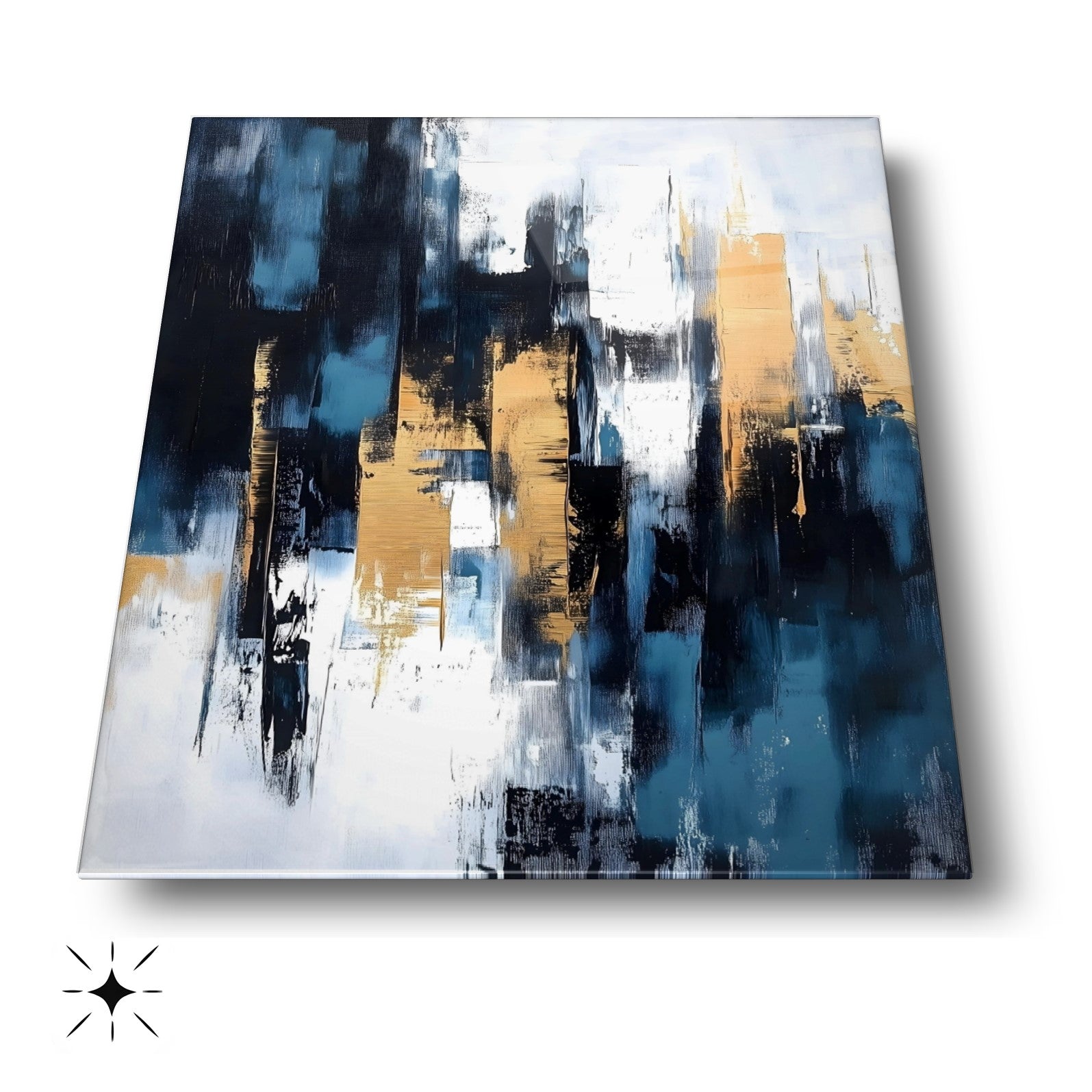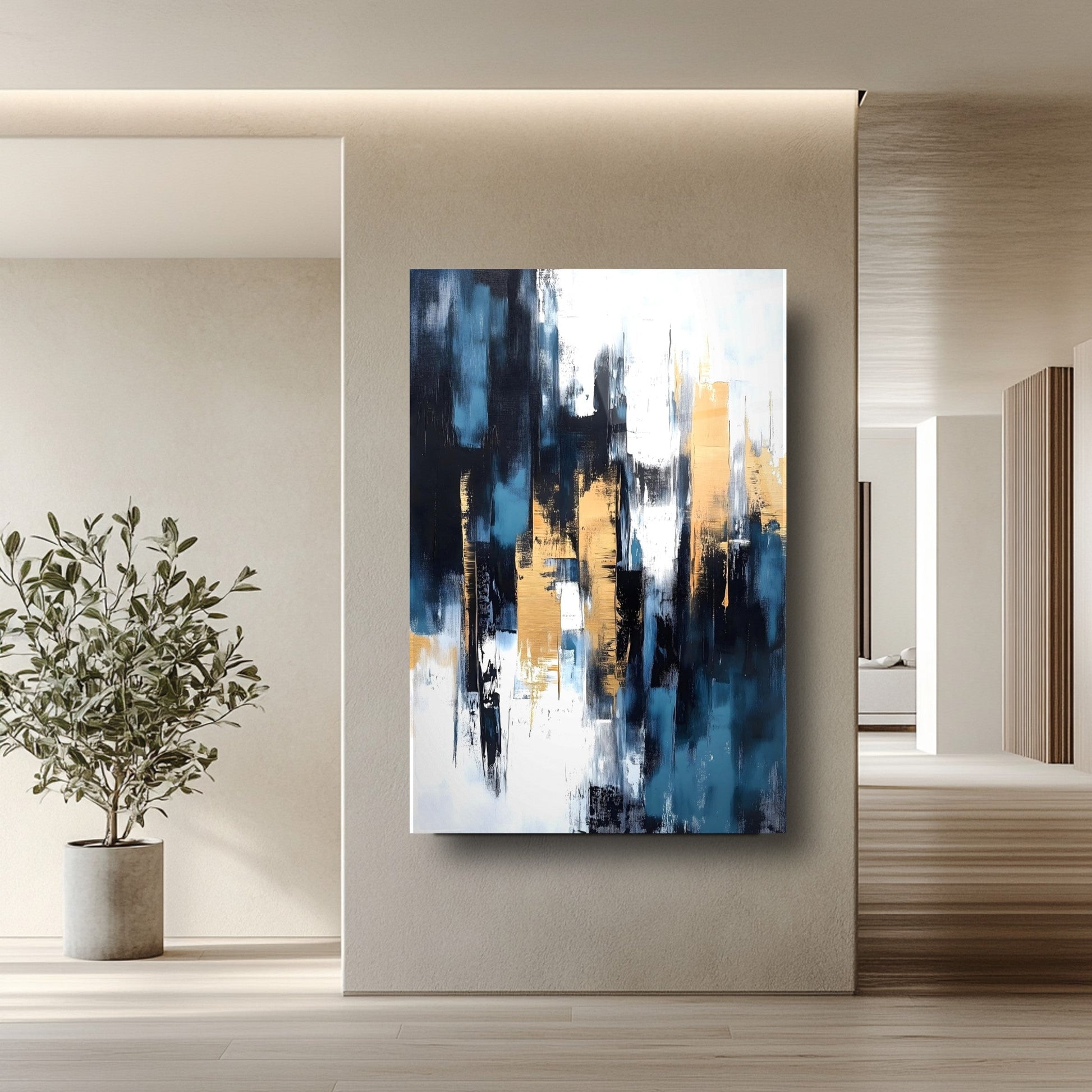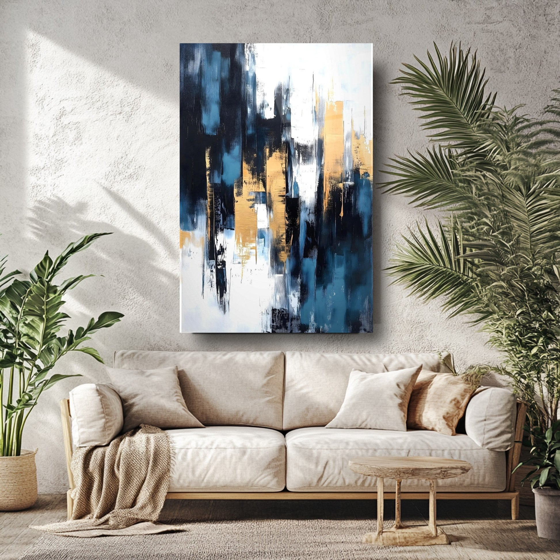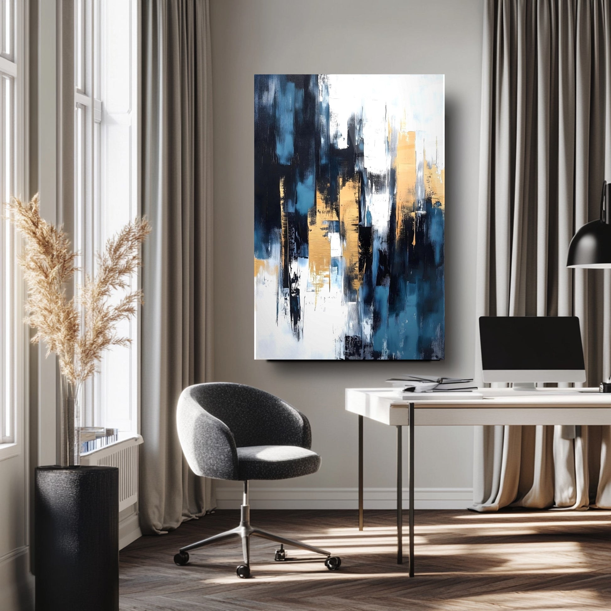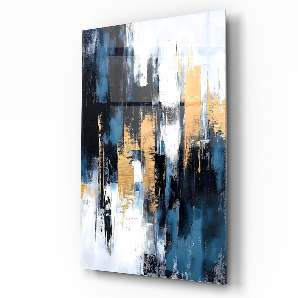 Gold ve mavi tonların uyumu, sade ve modern bir tarzla buluşarak bu cam tabloyu zamansız bir dekor haline getiriyor. Soyut yağlı boya görünümü sayesinde sanatsal bir derinlik sunarken, kırılmaz temperli cam yüzeyiyle dayanıklılığı estetikle bir araya getiriyor. Oturma odasından ofise kadar her alanda şıklık ve zarafet arayanlar için ideal bir modern cam tablo seçeneğidir.