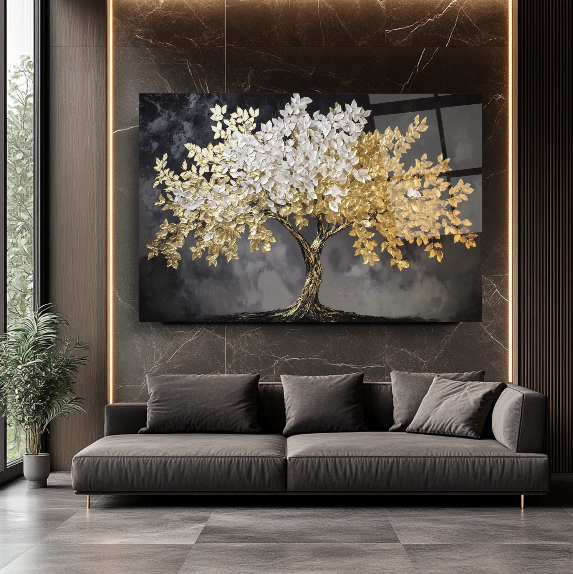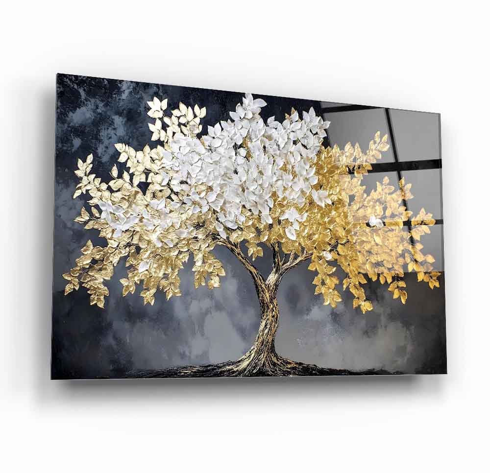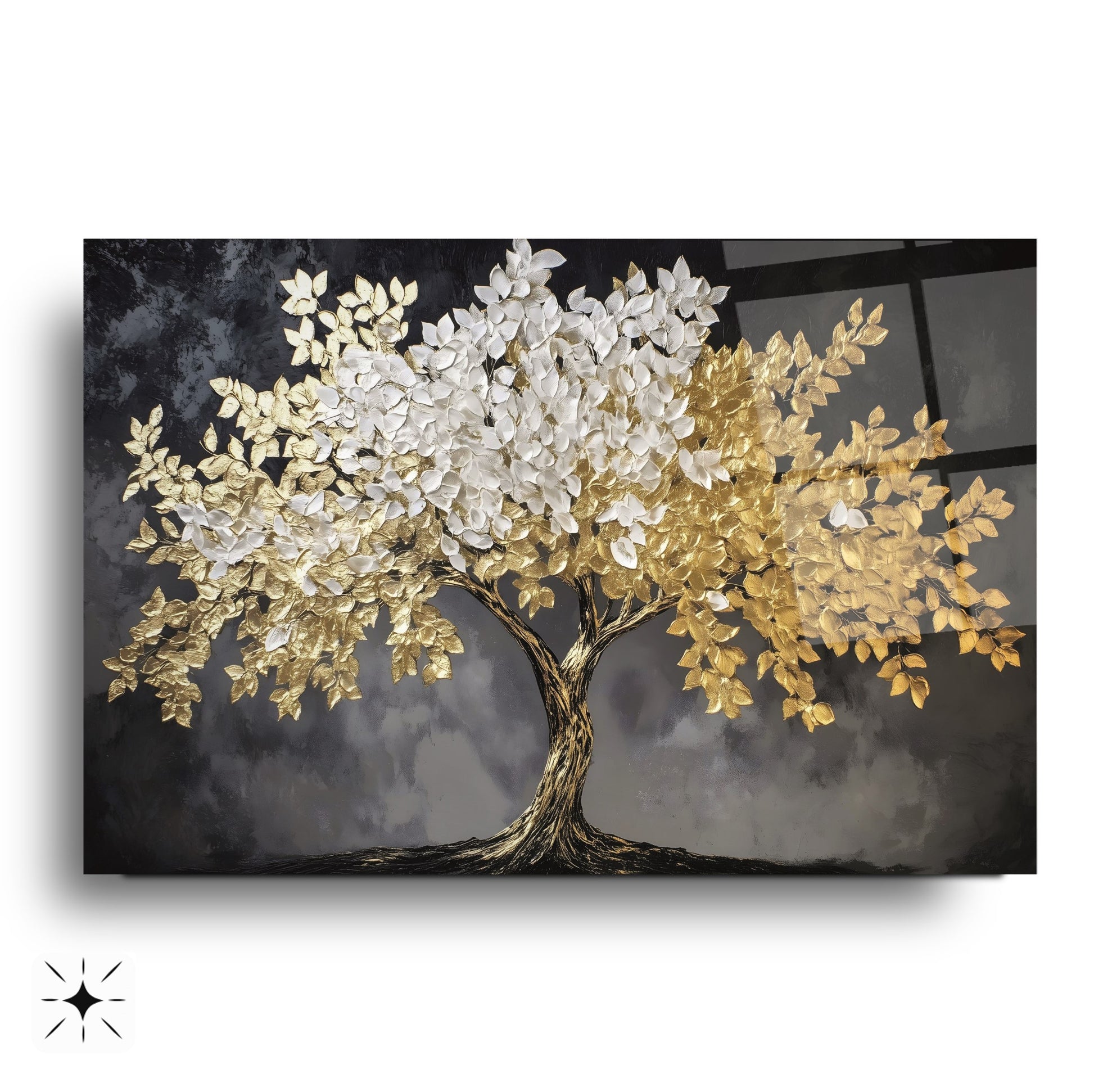 Mekanlarınıza Altın Işıltılı ve Asil Bir Yaşam: Gold Siyah Arkaplan Hayat Ağacı Cam Tablo