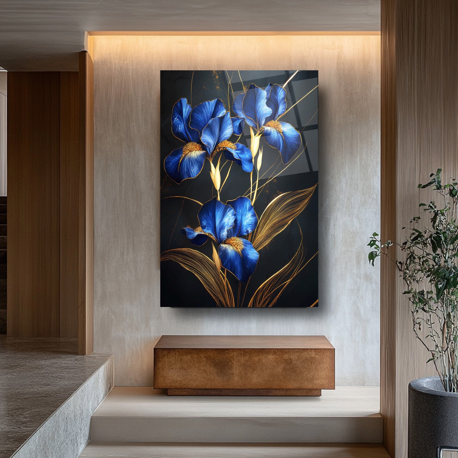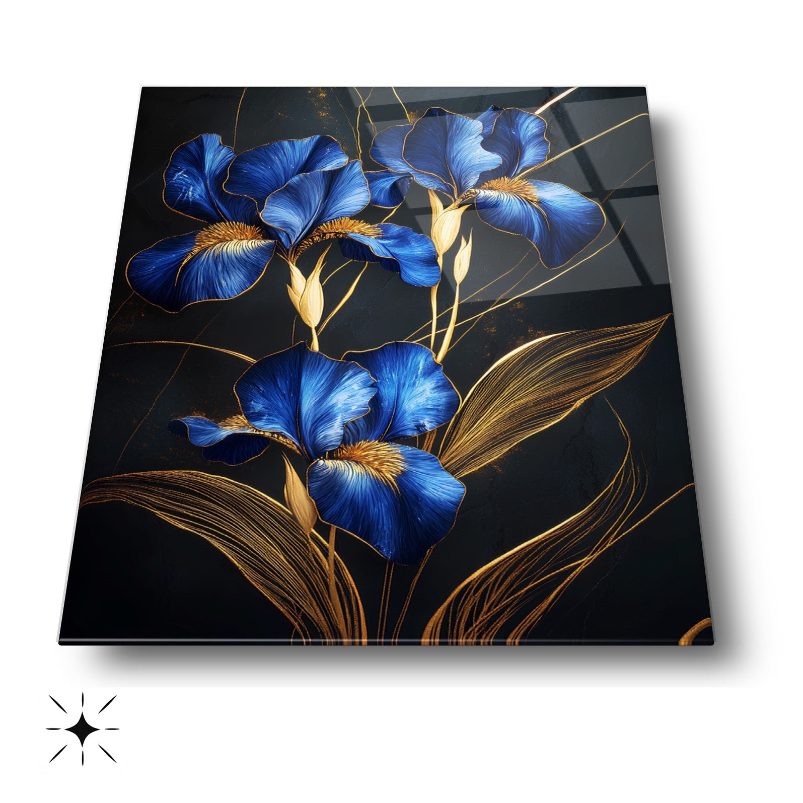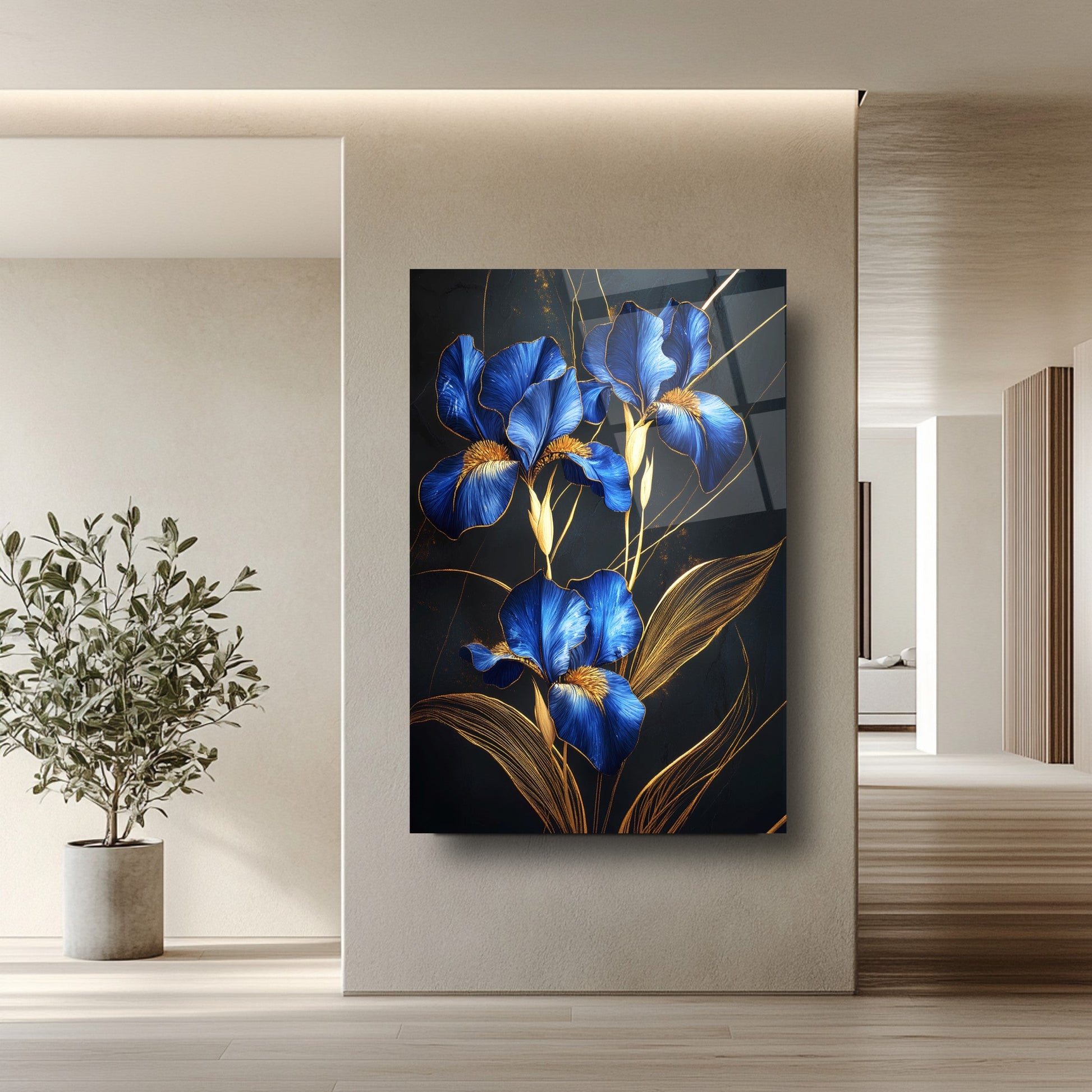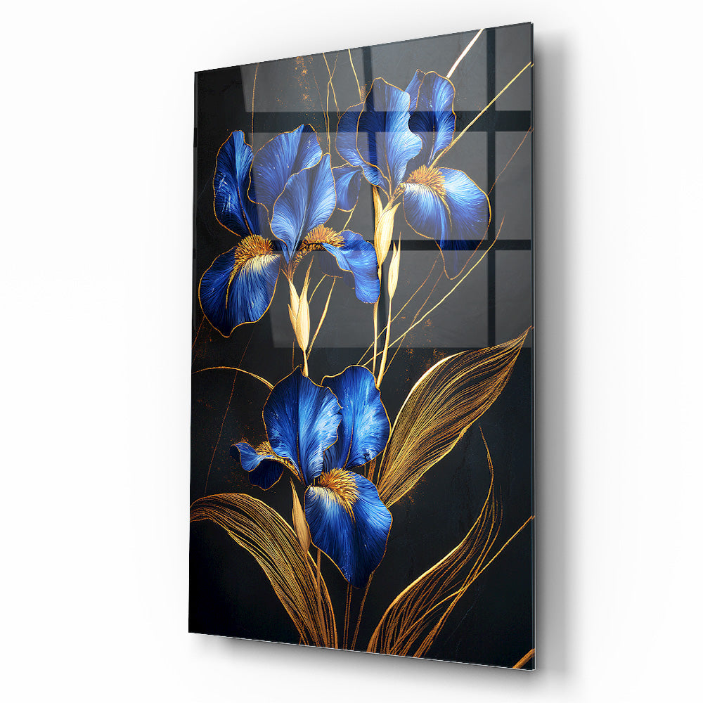 Duvarlarınıza Doğanın Işıltısı: Gold Detay Mavi Çiçek Modern Kırılmaz Cam Tablo