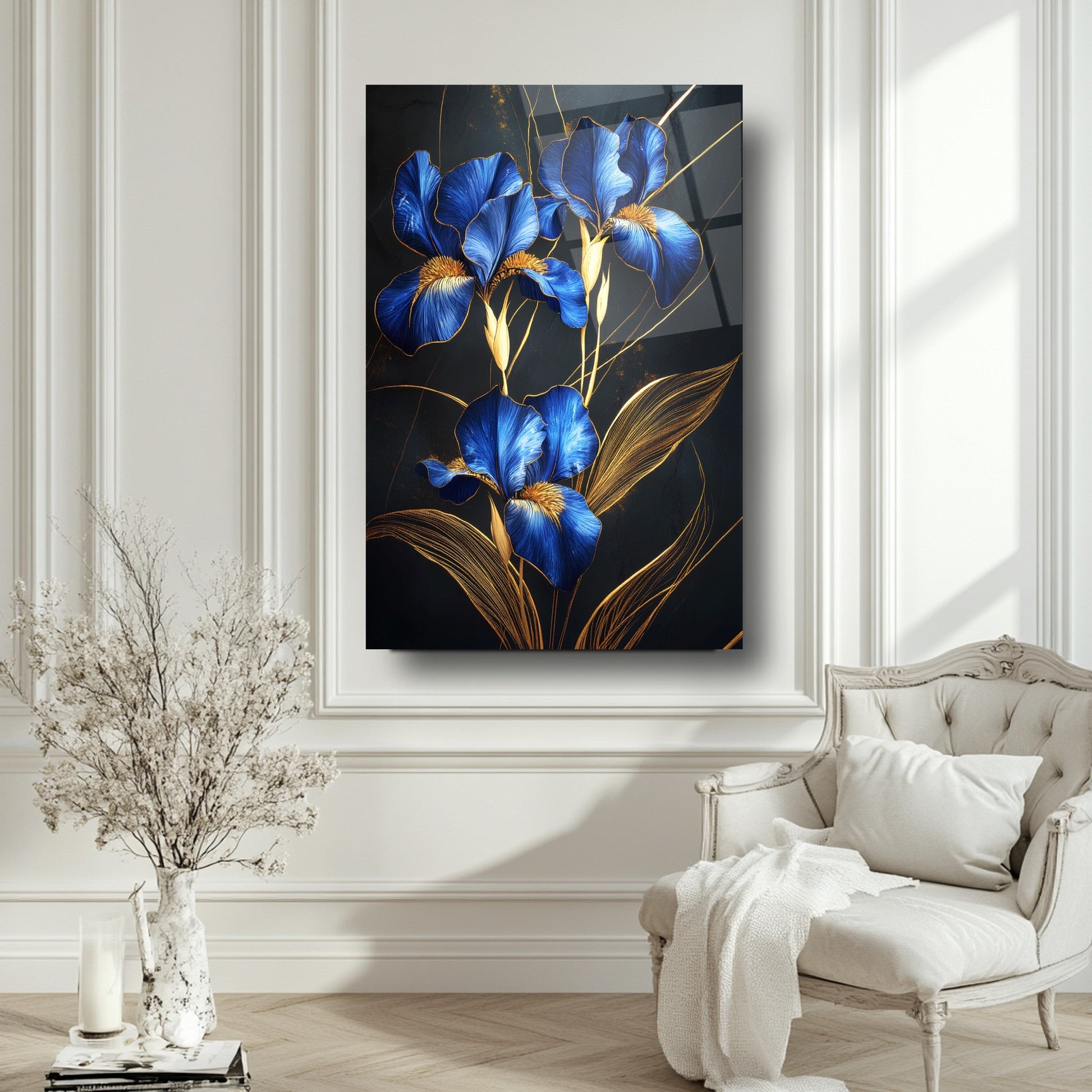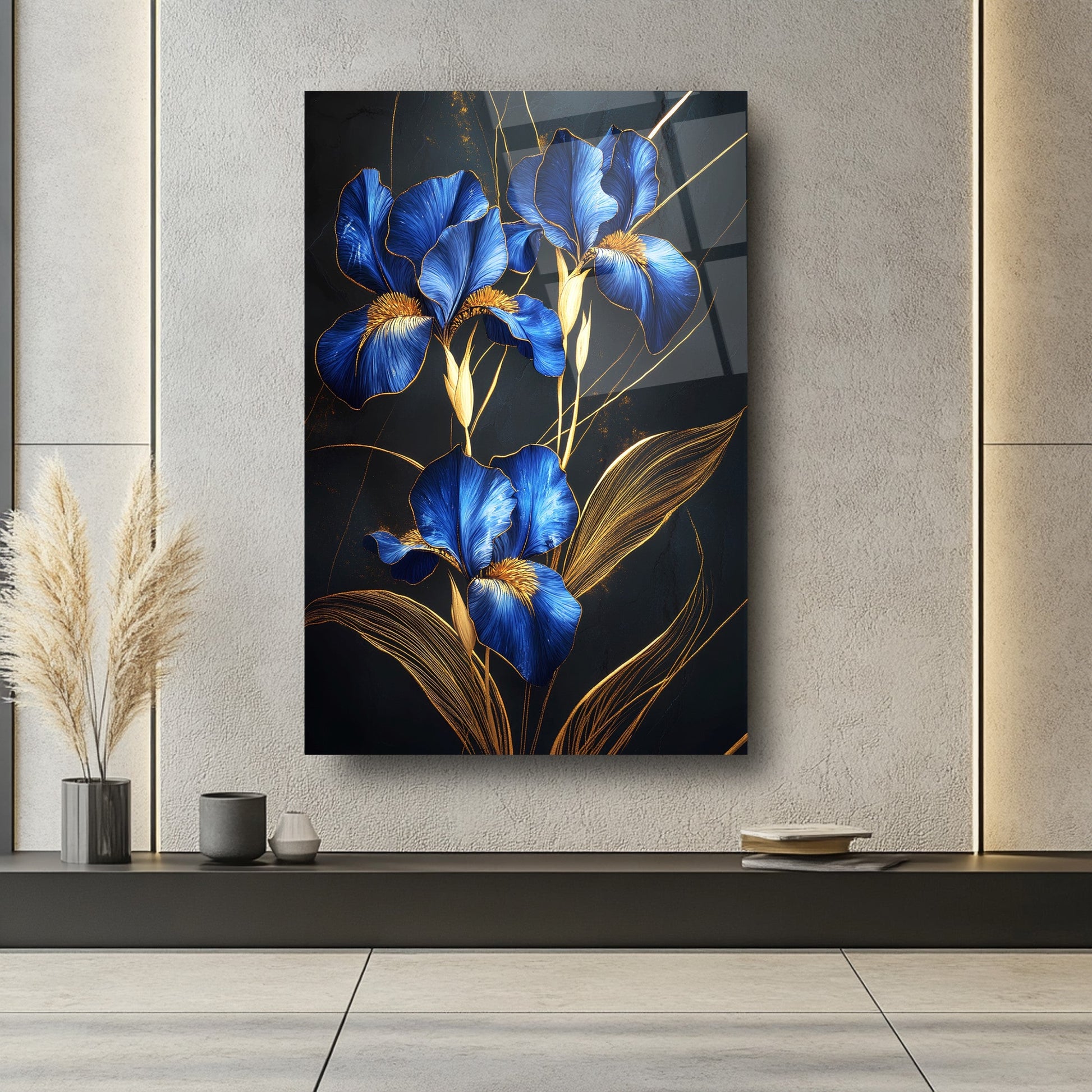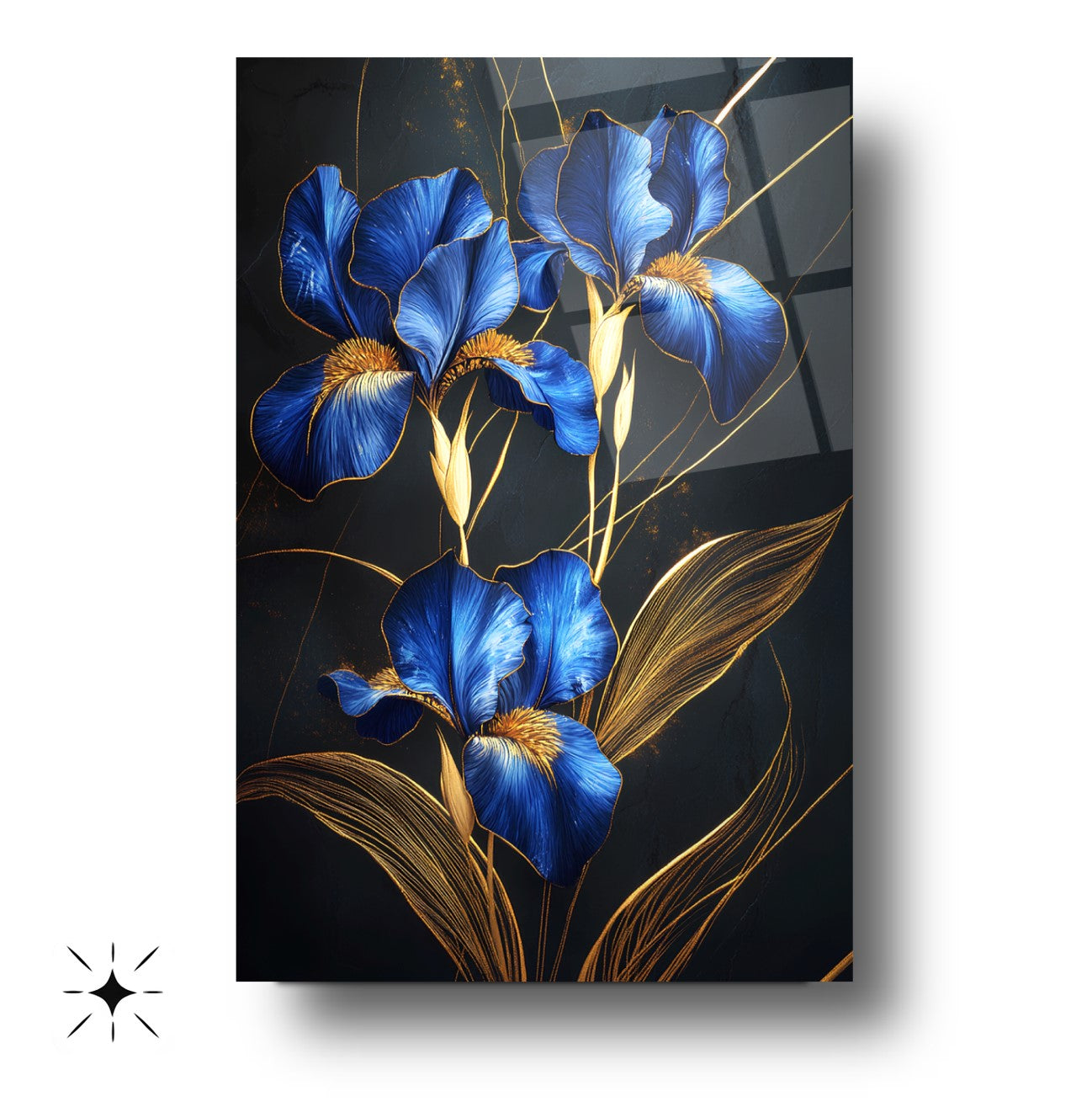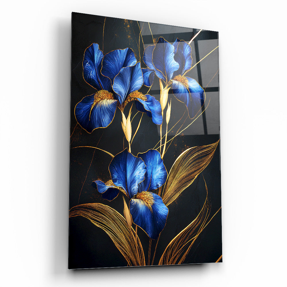 Duvarlarınıza Doğanın Işıltısı: Gold Detay Mavi Çiçek Modern Kırılmaz Cam Tablo