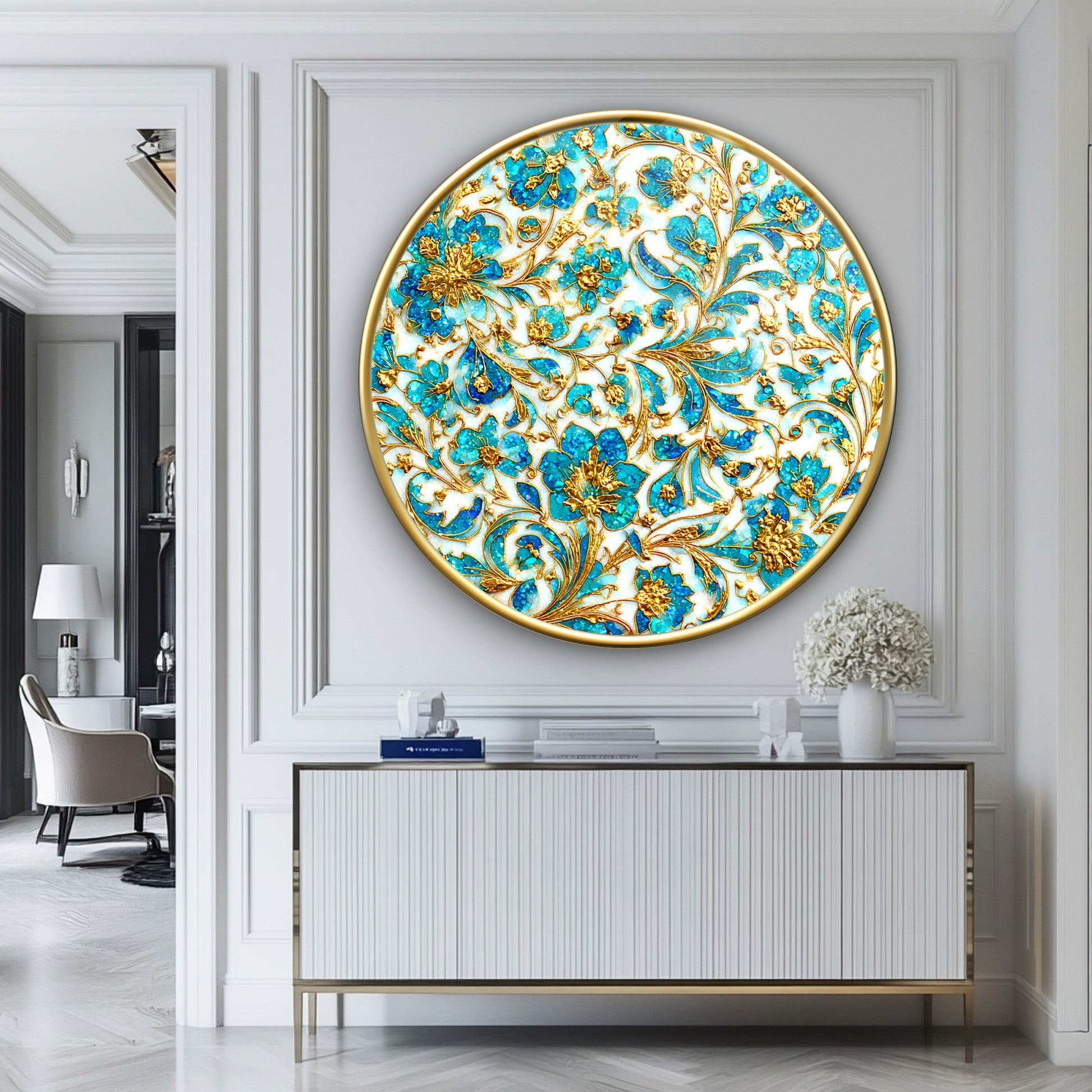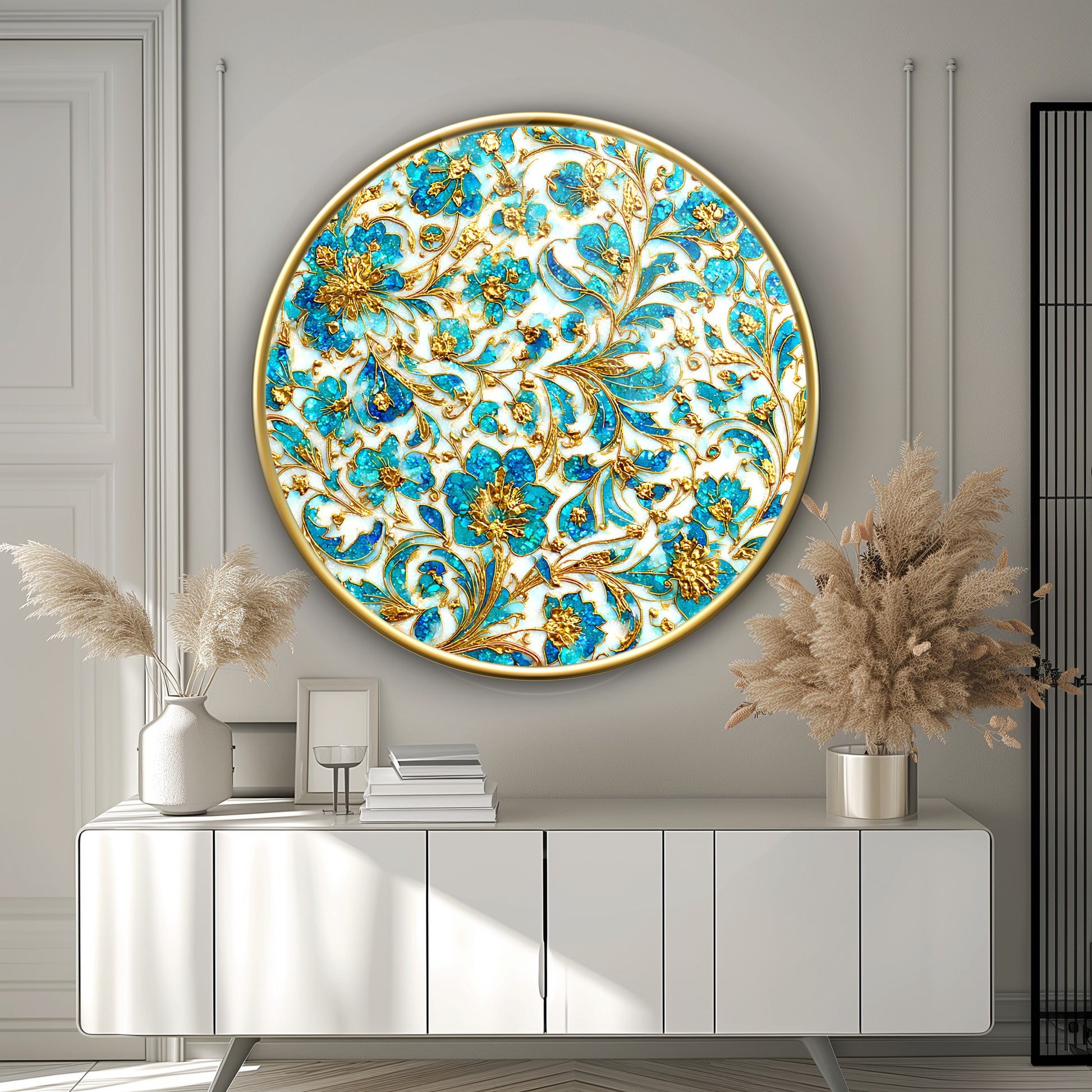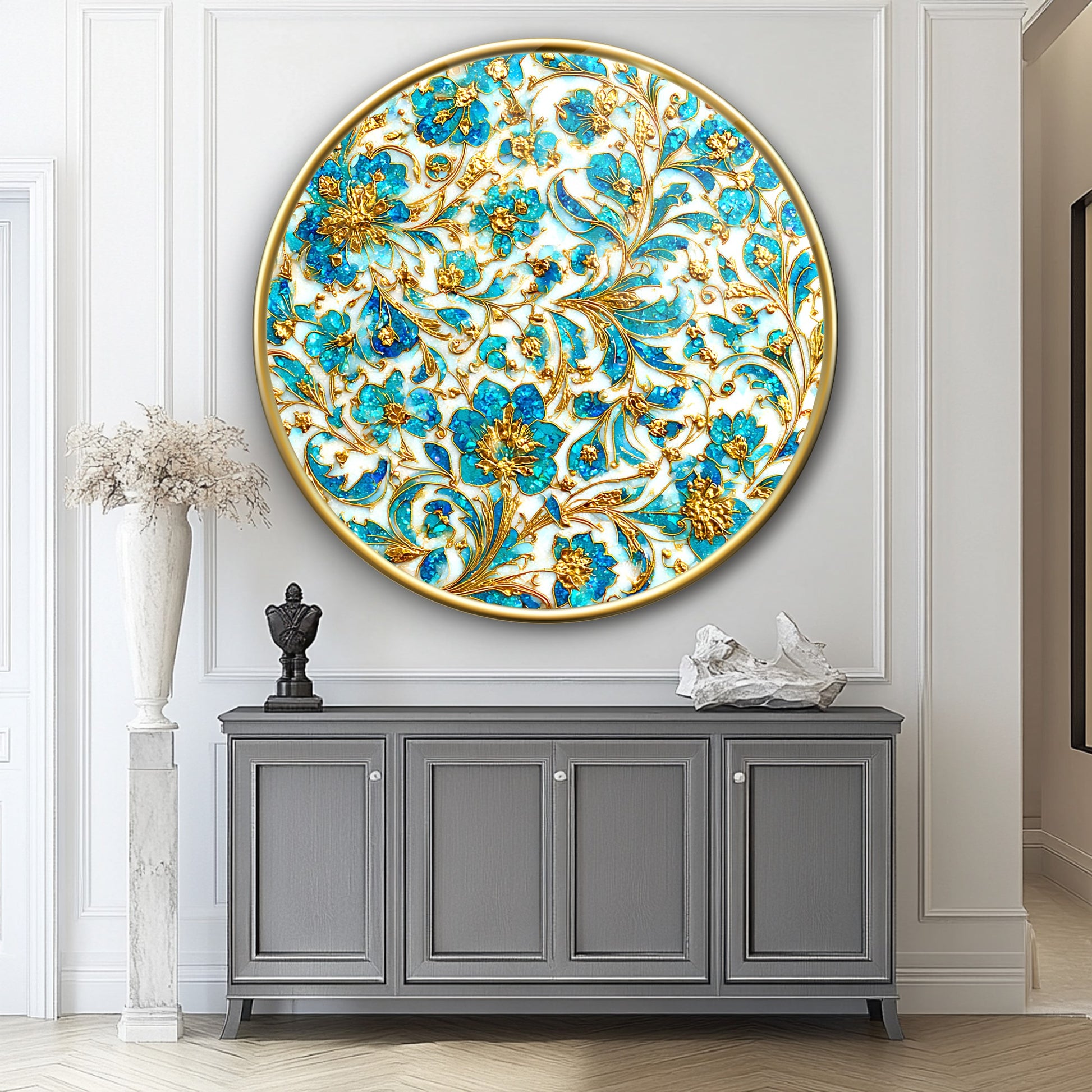 Gold Turkuaz Çiçekler Yuvarlak Cam Tablo