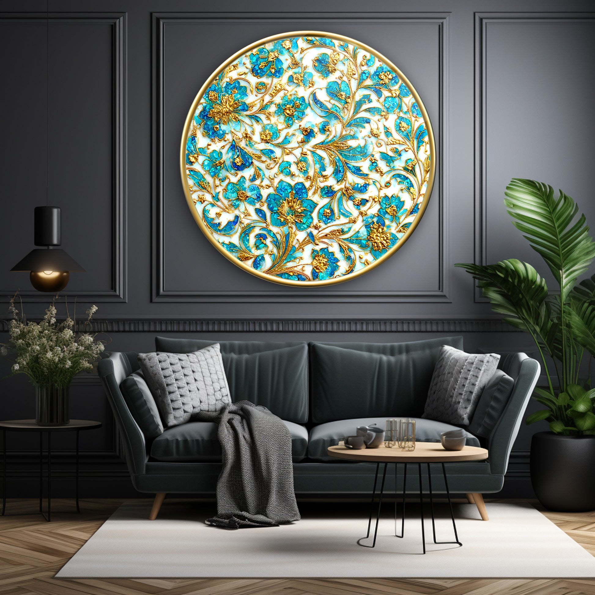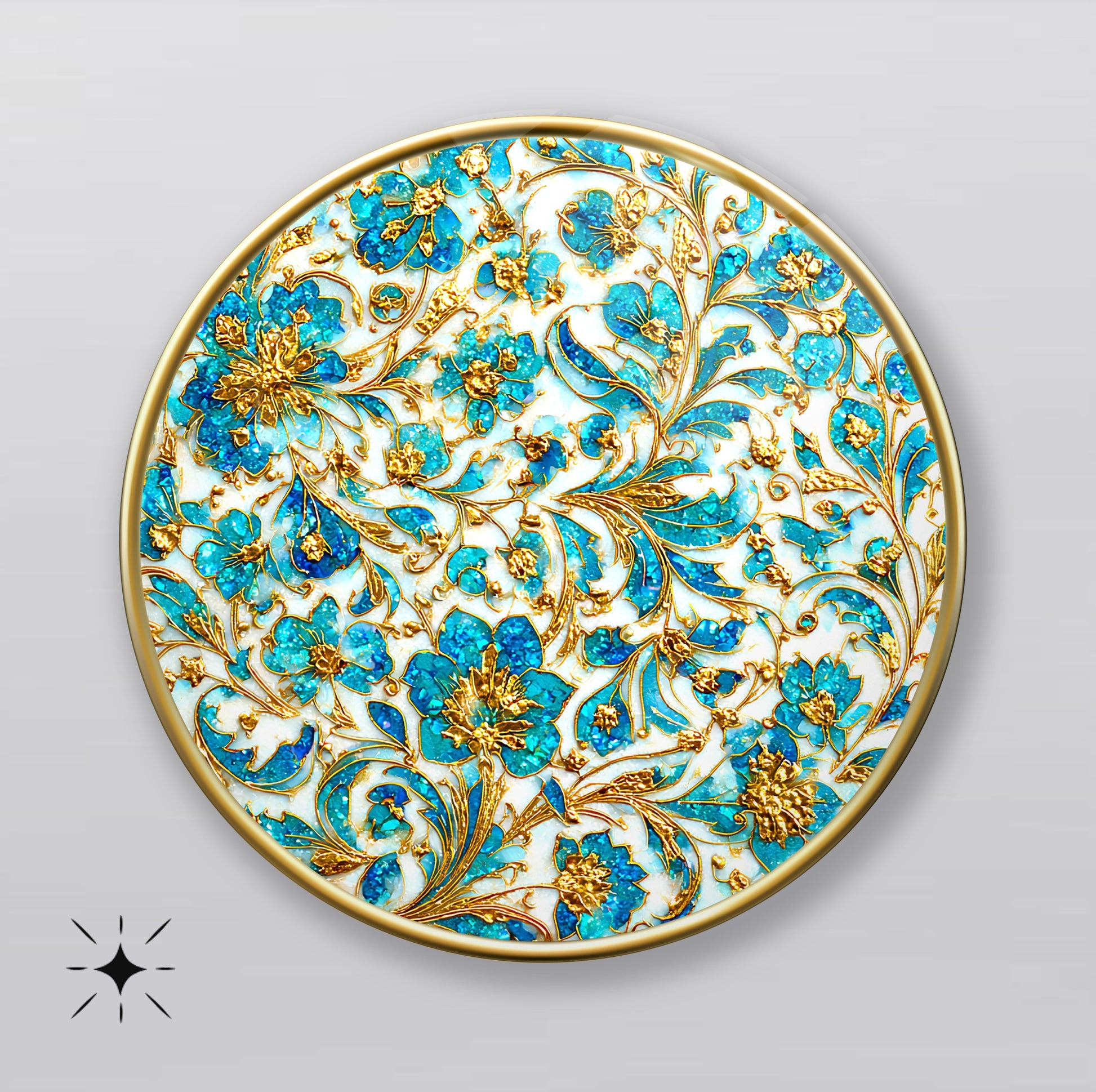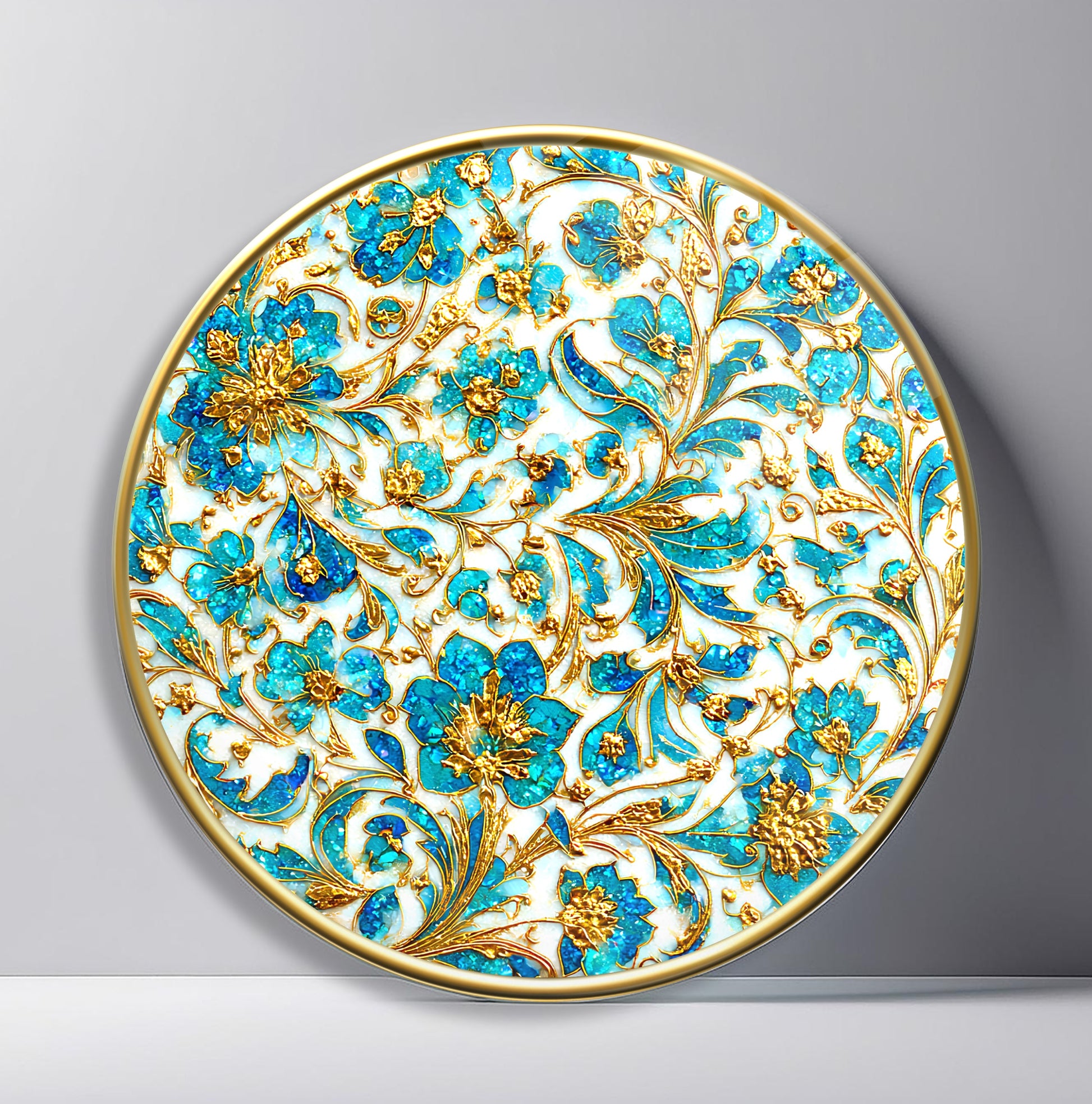 Gold Turkuaz Çiçekler Yuvarlak Cam Tablo