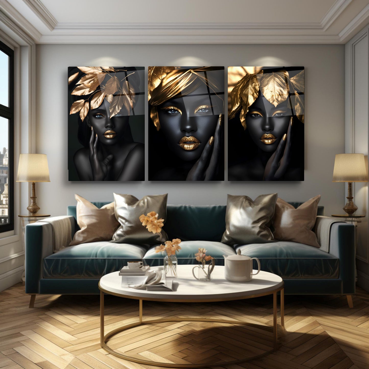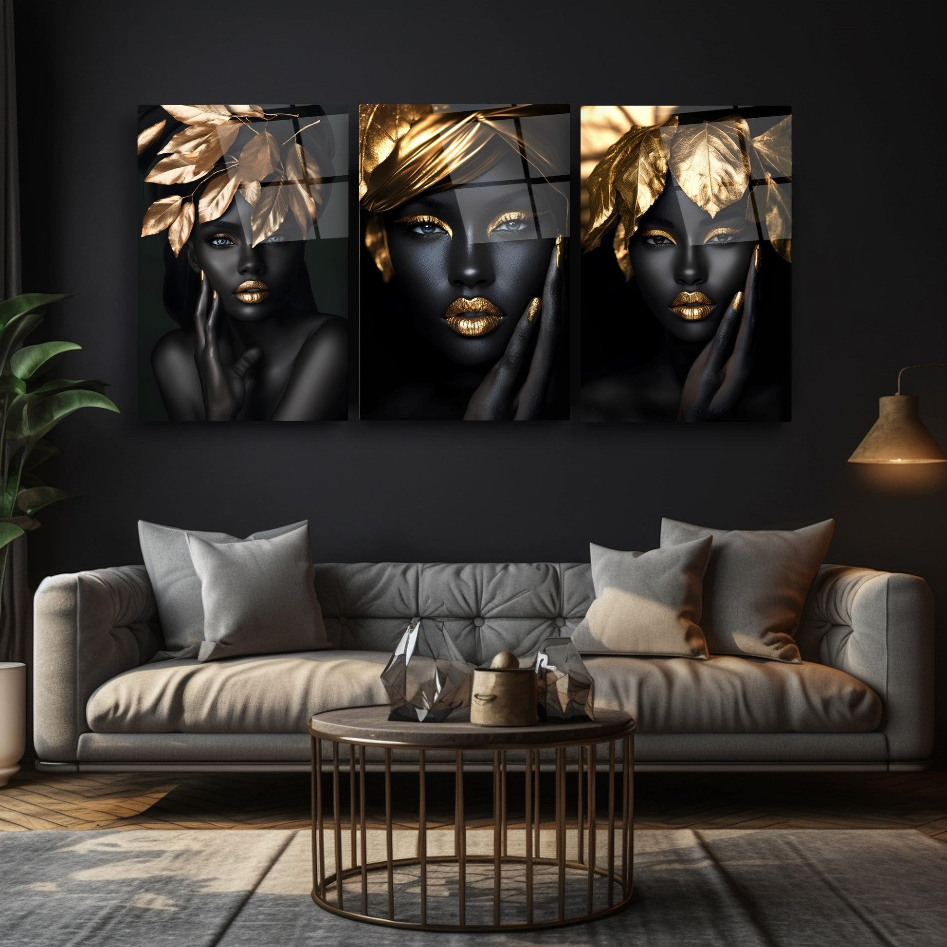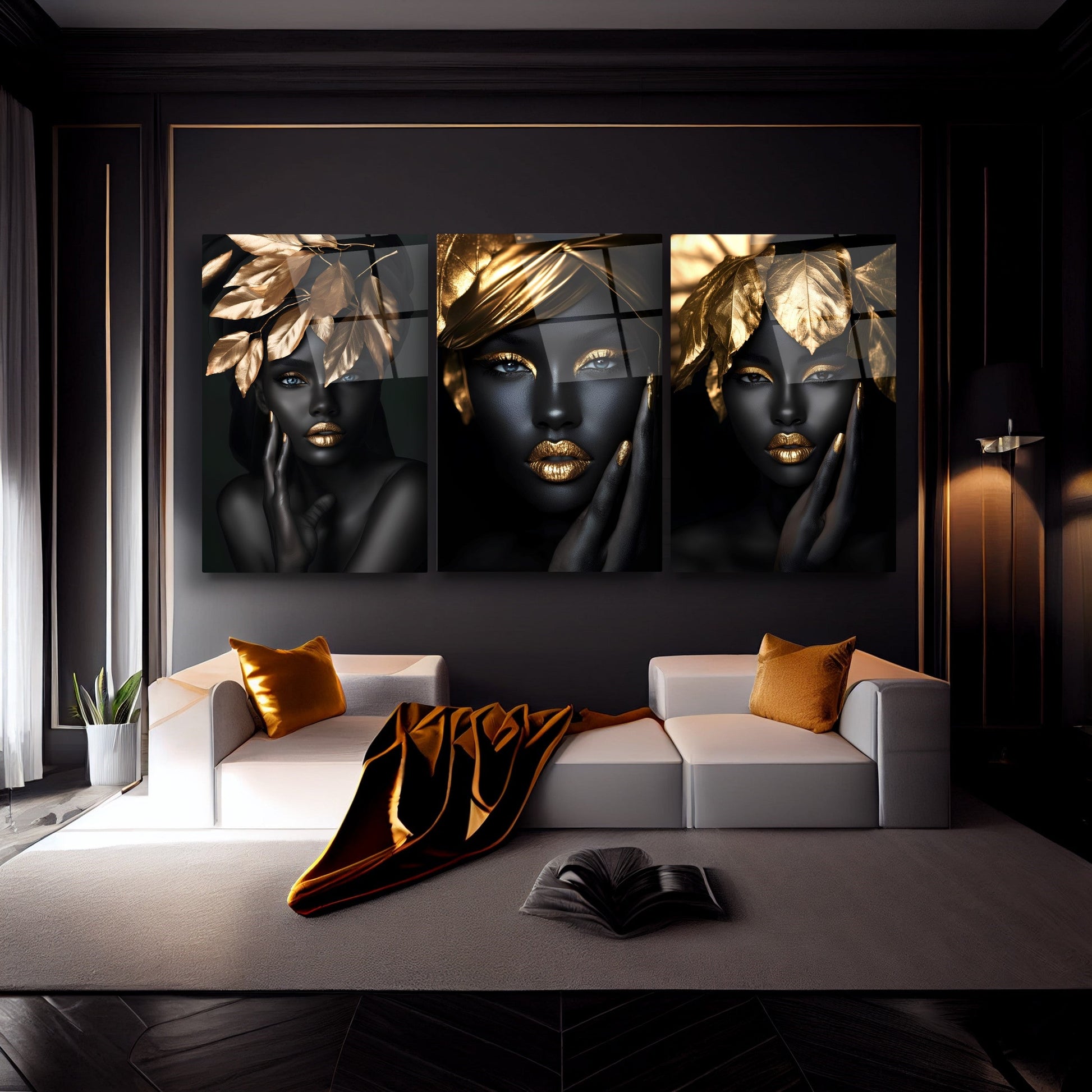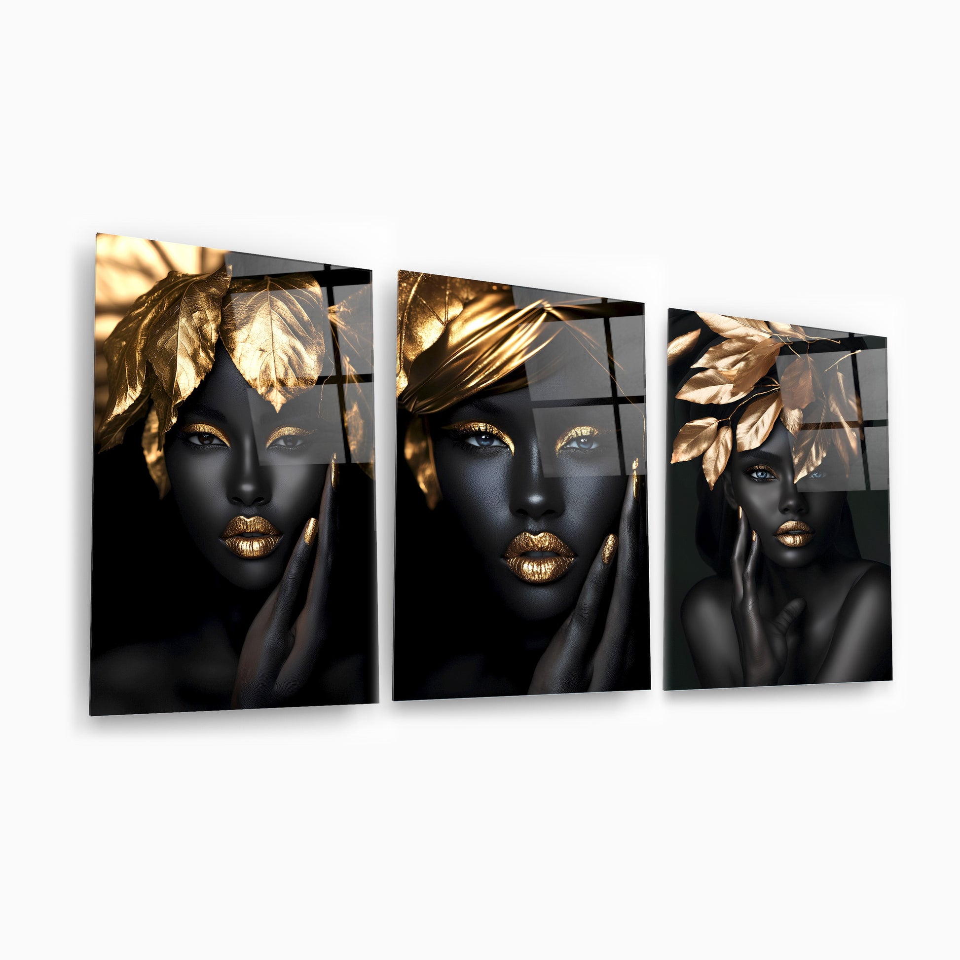 Gold Yapraklı Siyahi Kadın Üçlü Set Cam Tablo