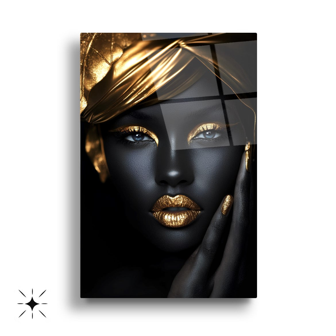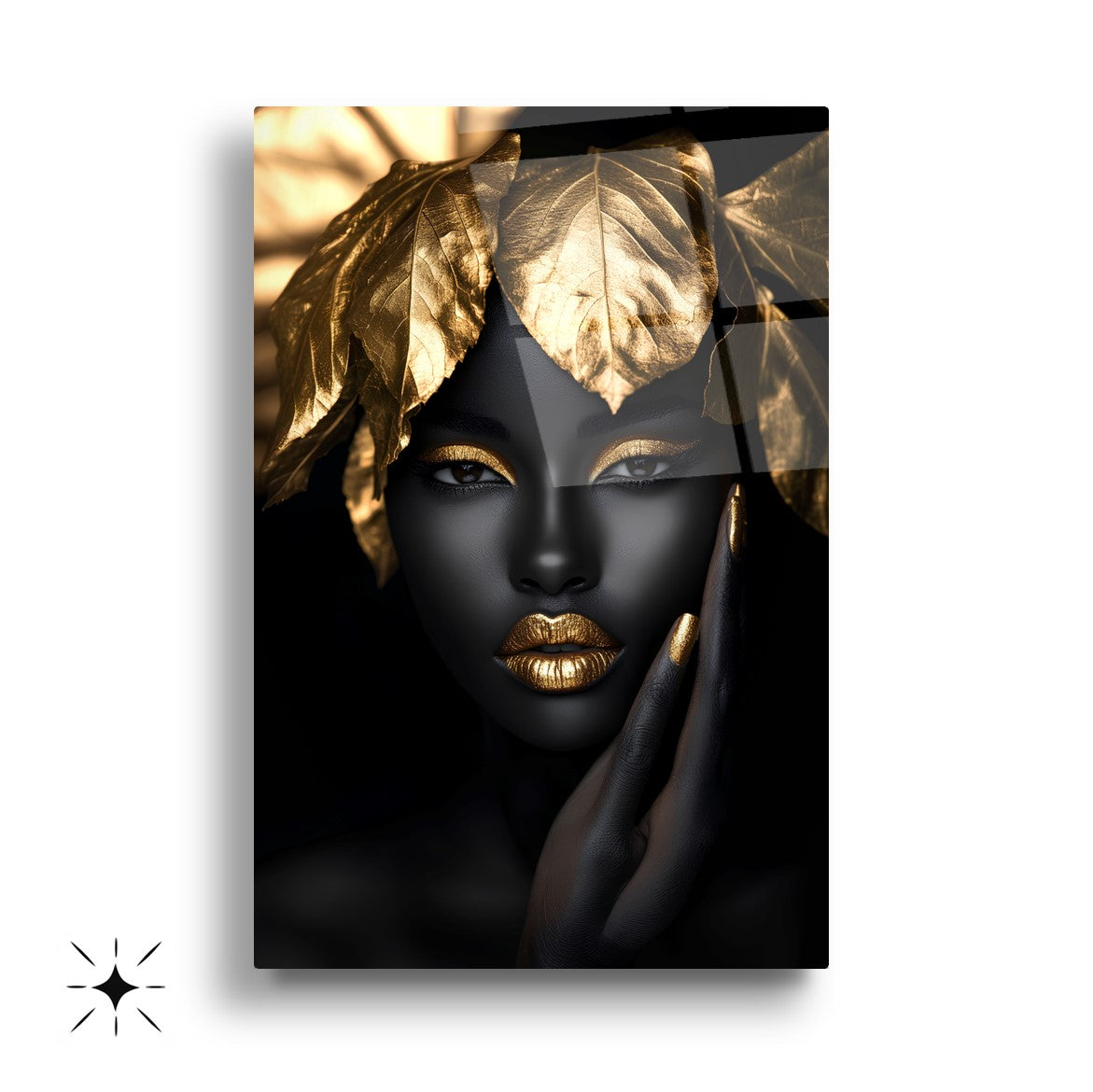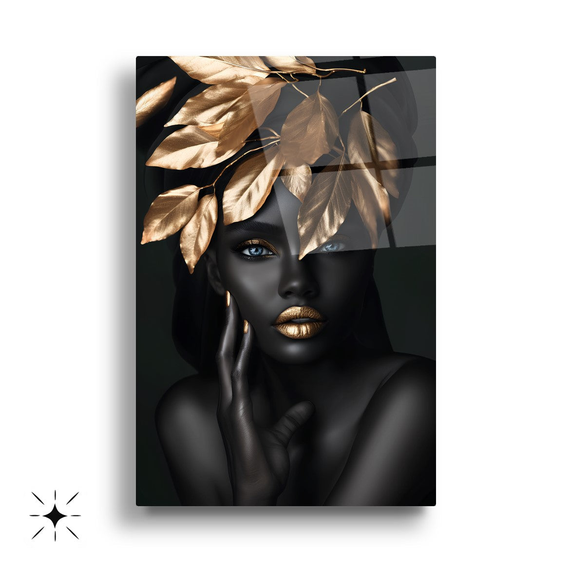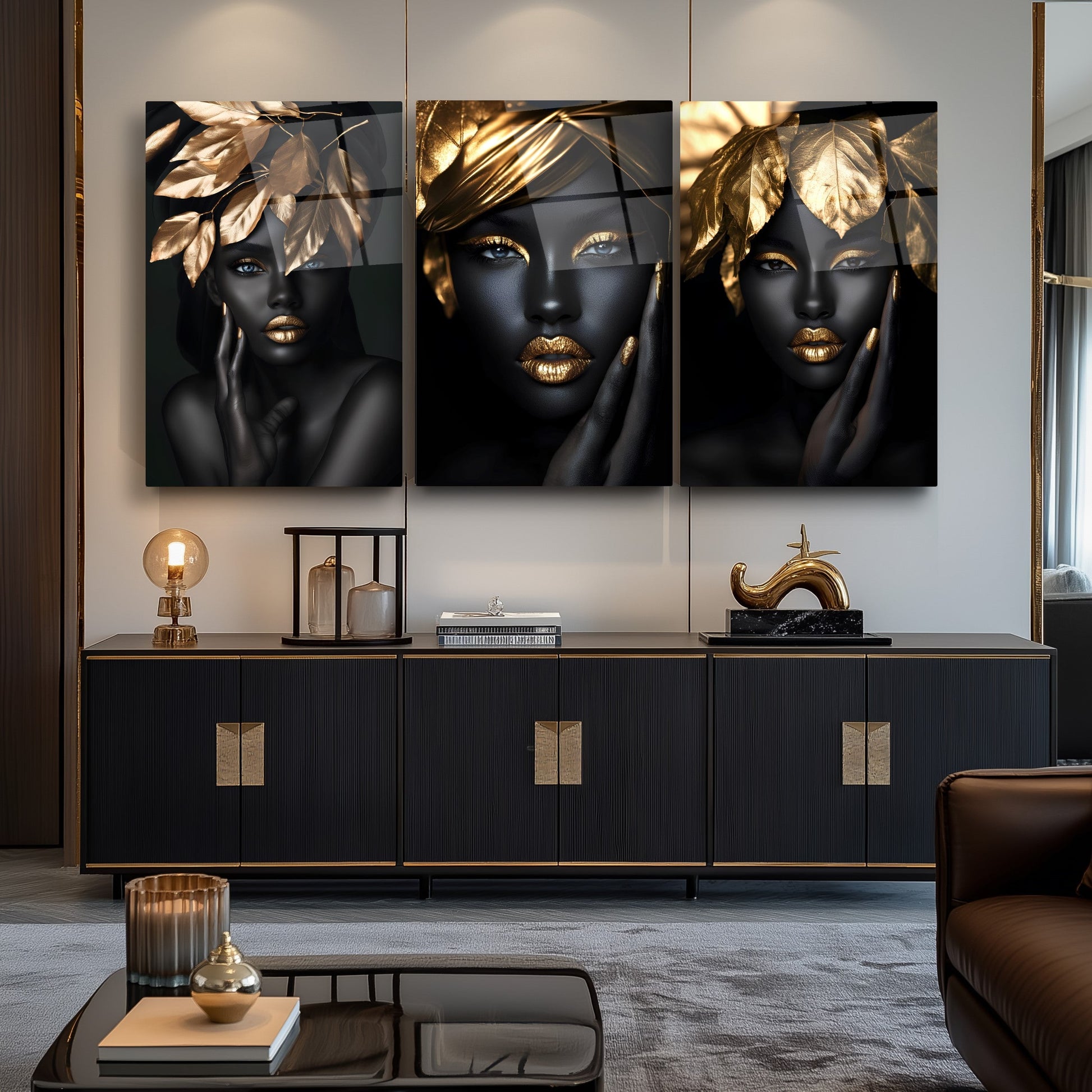 Gold Yapraklı Siyahi Kadın Üçlü Set Cam Tablo