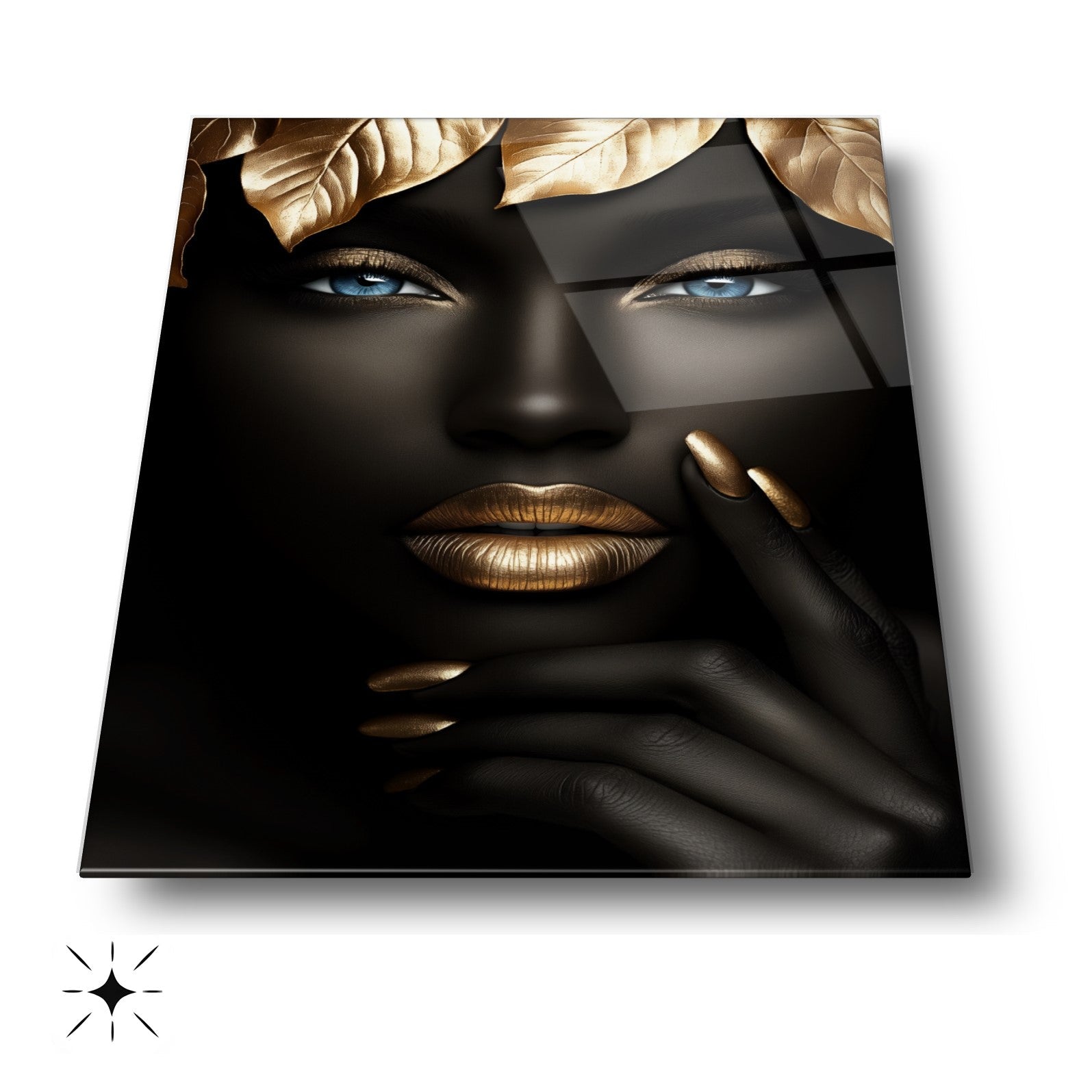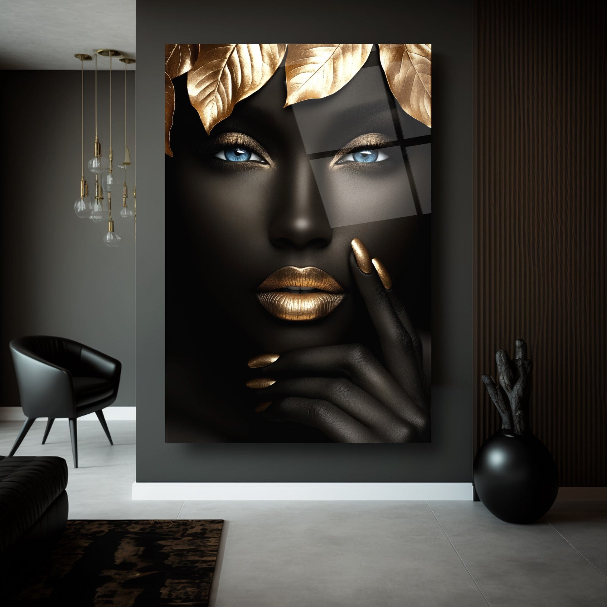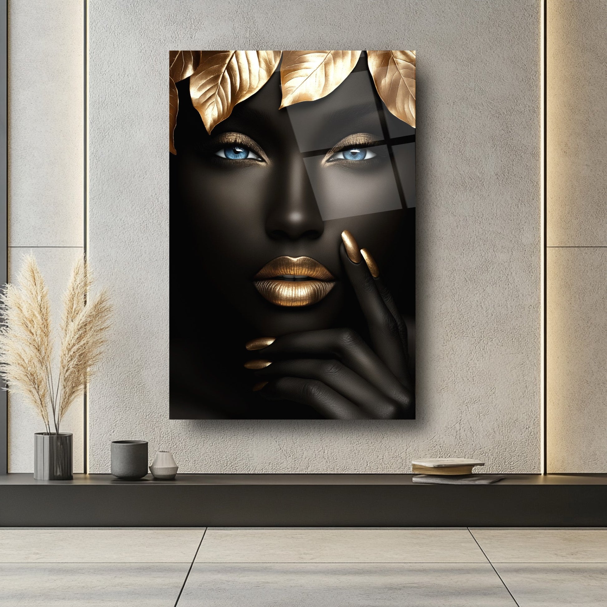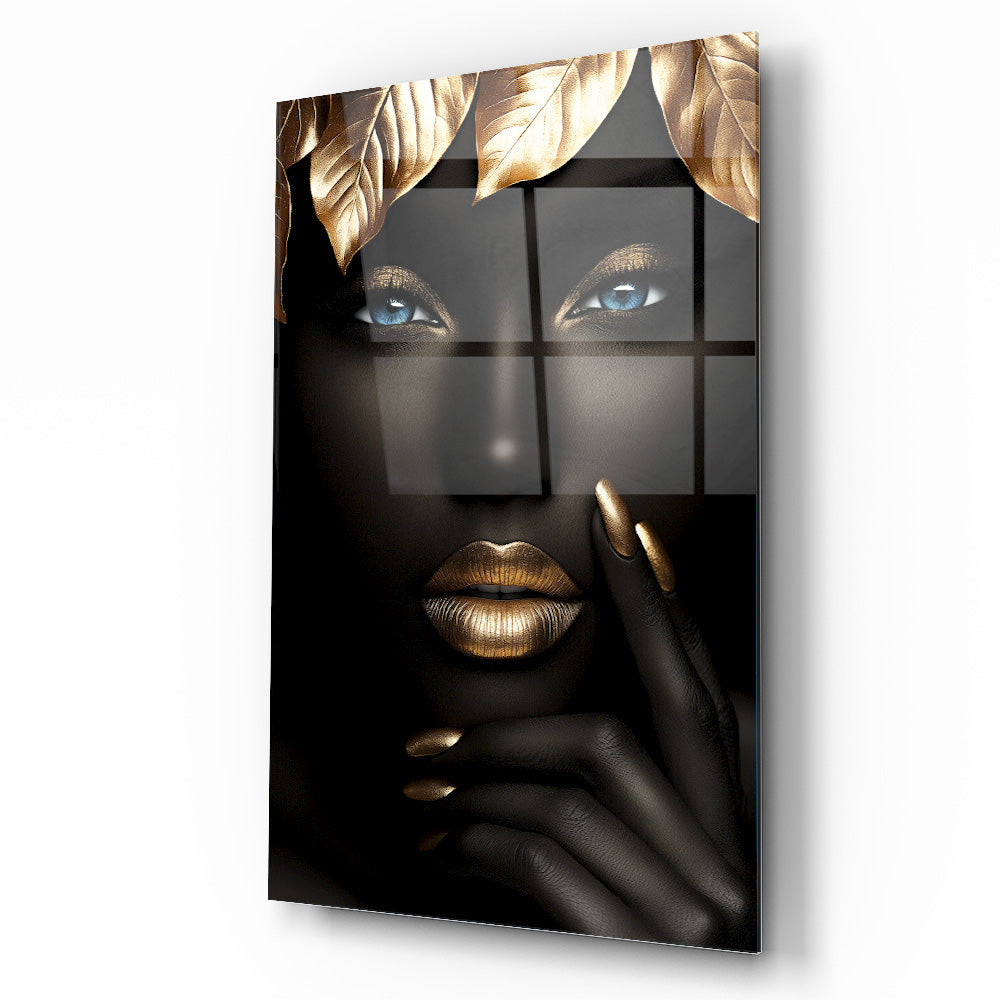 Güzellik Mekanlarınıza Doğal ve Lüks Bir Dokunuş: Gold Yapraklı Afrikalı Siyah Kadın Cam Tablo