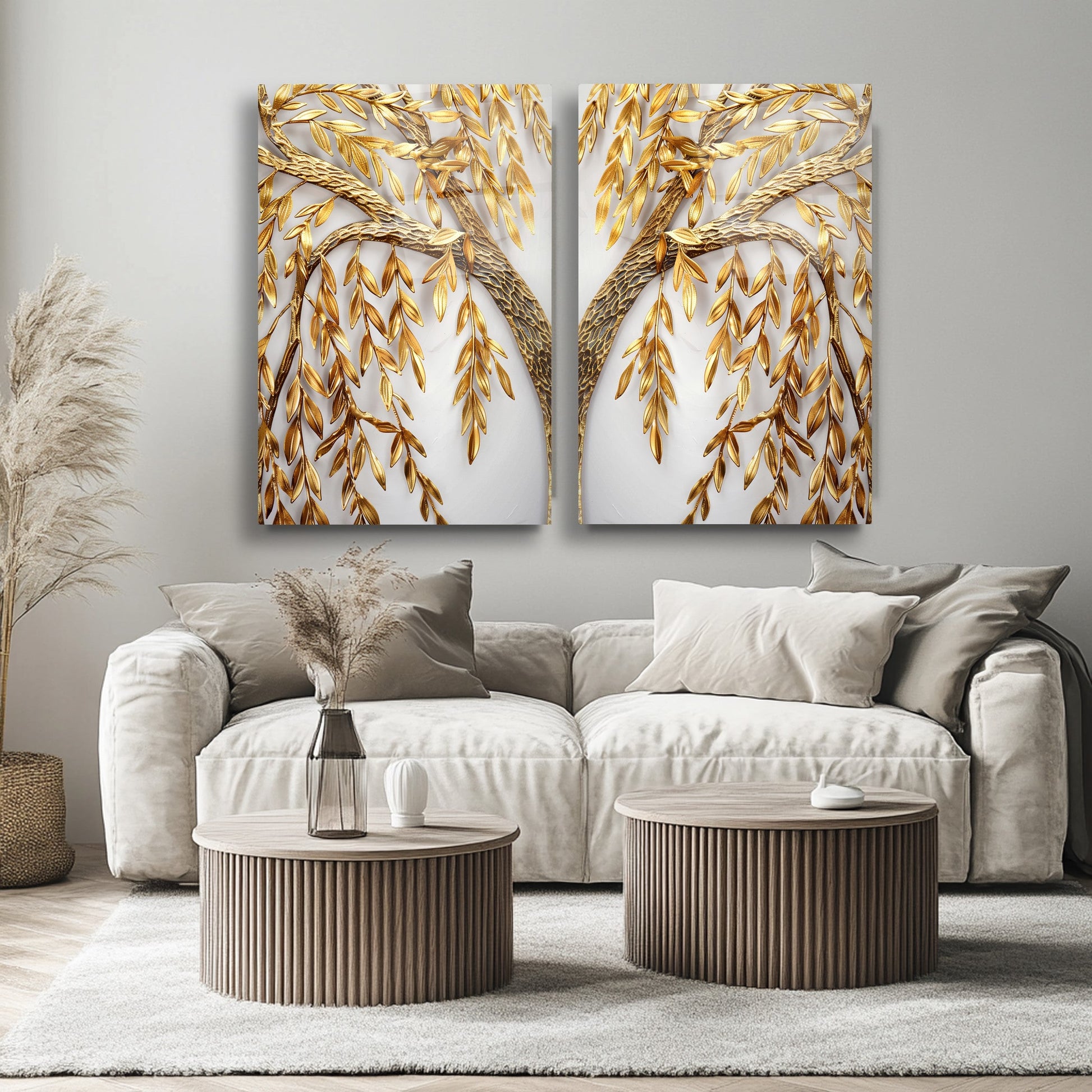 Gold Yapraklı Ağaç mega boy ikili cam tablo seti, modern ve zarif tasarımıyla salon ve ofislerinize sofistike bir hava katıyor. Temperli ve kırılmaz cam üzerine UV baskı tekniğiyle hazırlanan bu set, hem dayanıklı hem de uzun ömürlüdür. Altın tonlardaki yaprak detayları, şıklığı ve doğadan ilham alan estetiği bir araya getirerek mekanlarınıza sıcaklık ve lüks dokunuşlar sunar. CamDeko kalitesiyle öne çıkan bu ikili tablo seti, modern dekorasyonlar için ideal bir seçim olup, yaşam alanlarınızda fark yaratır.