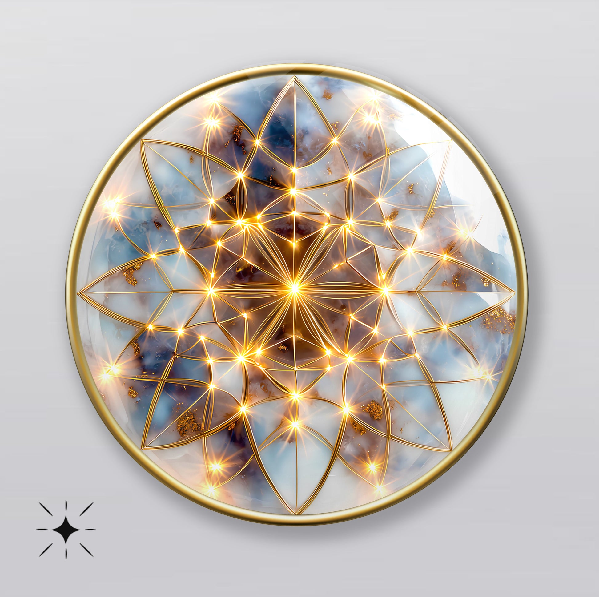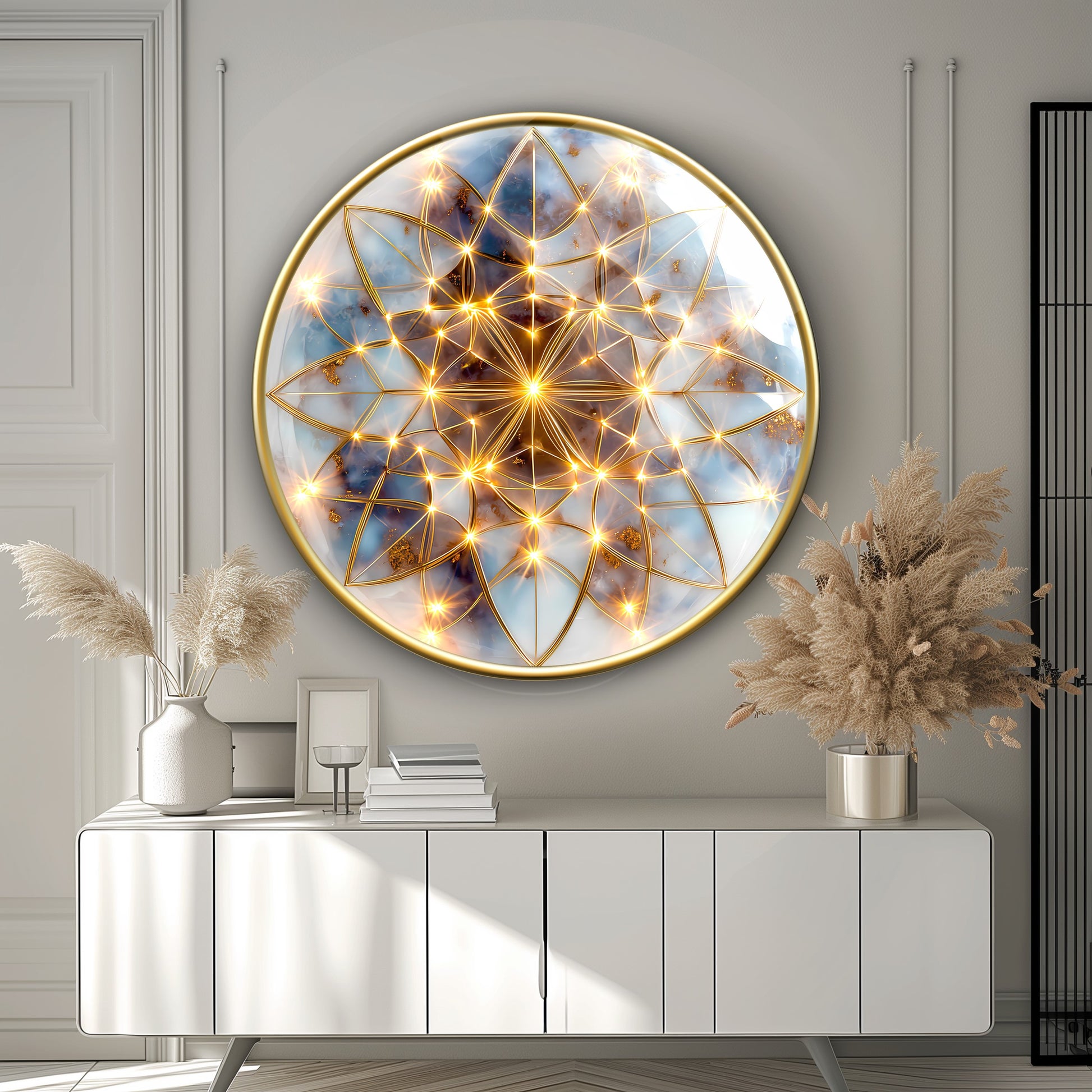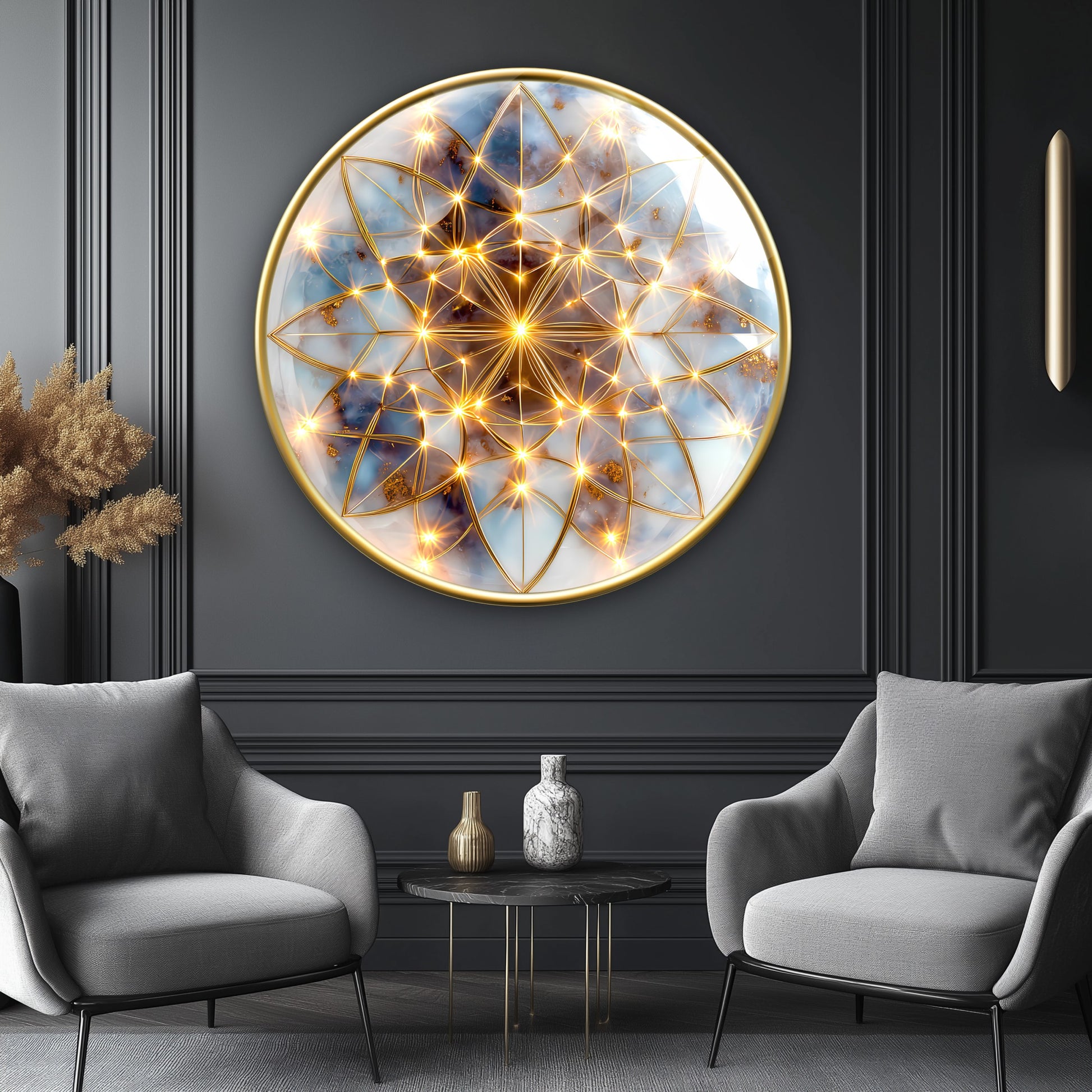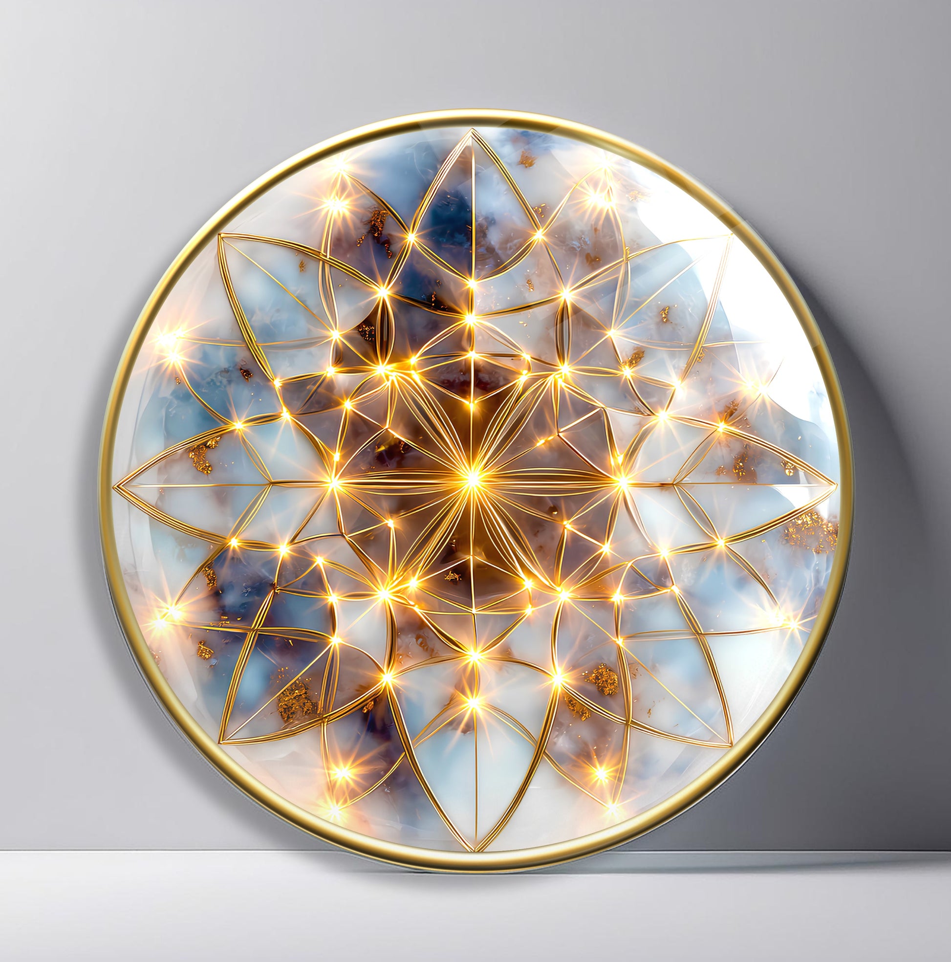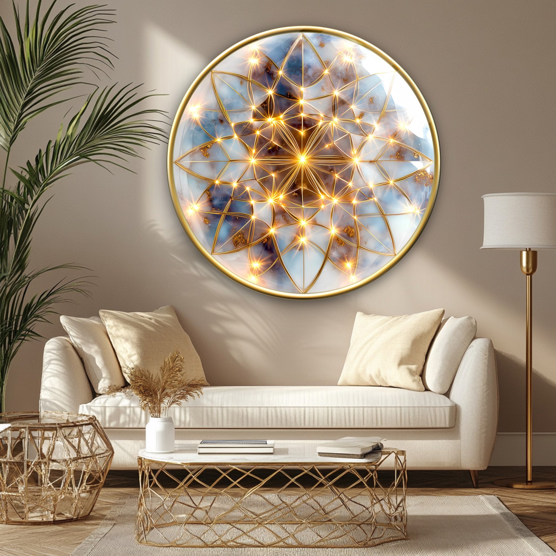 Soyut Gold Yaşam Çiçeği Yuvarlak Cam Tablo