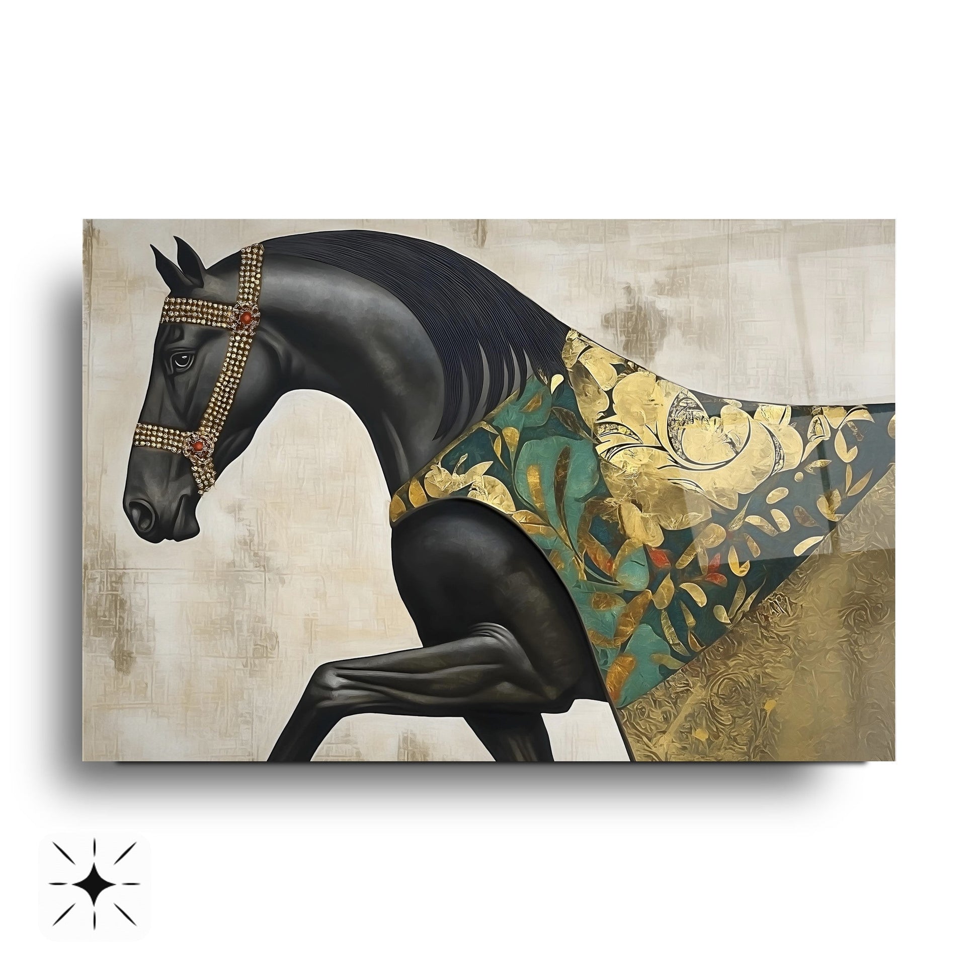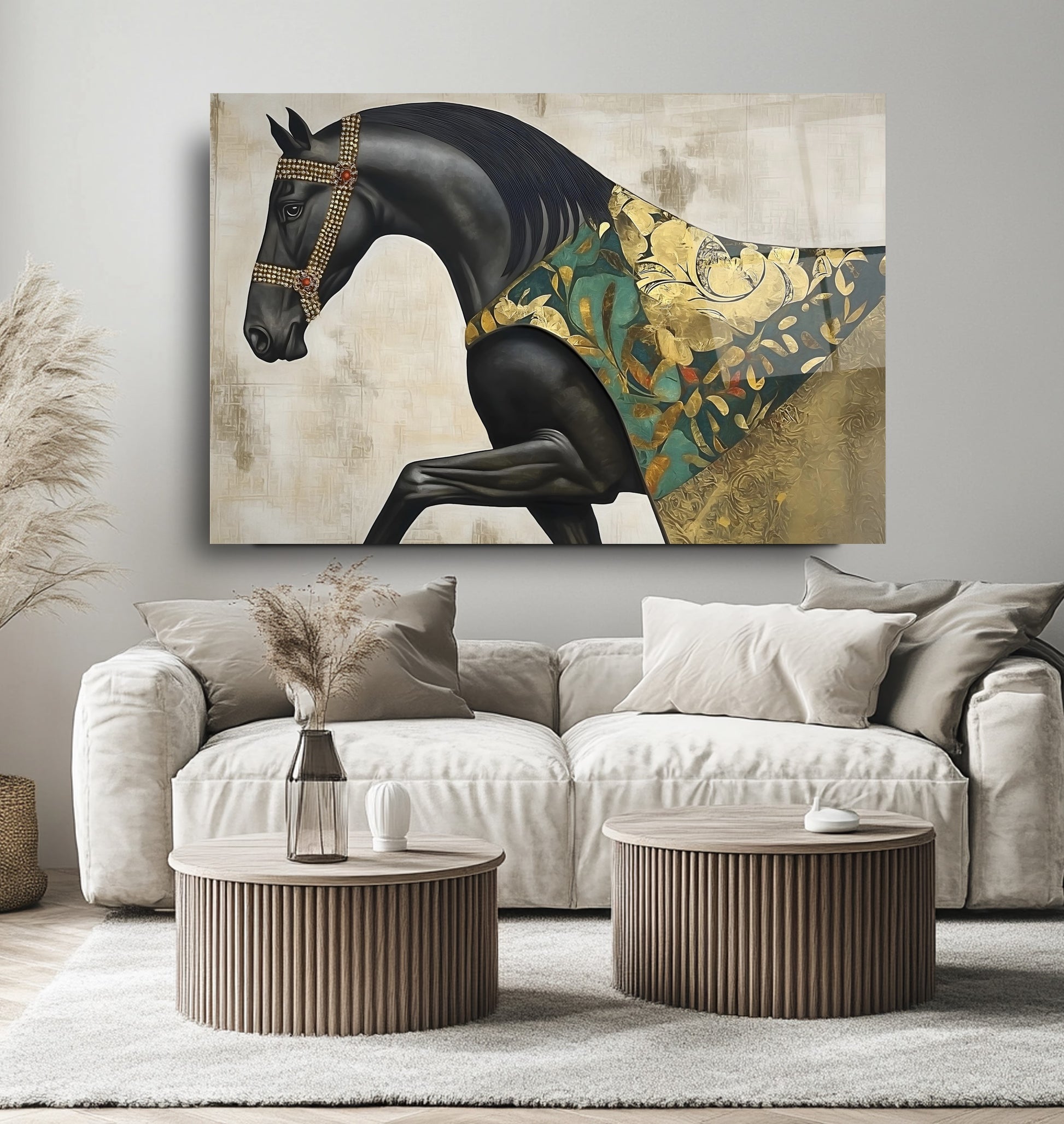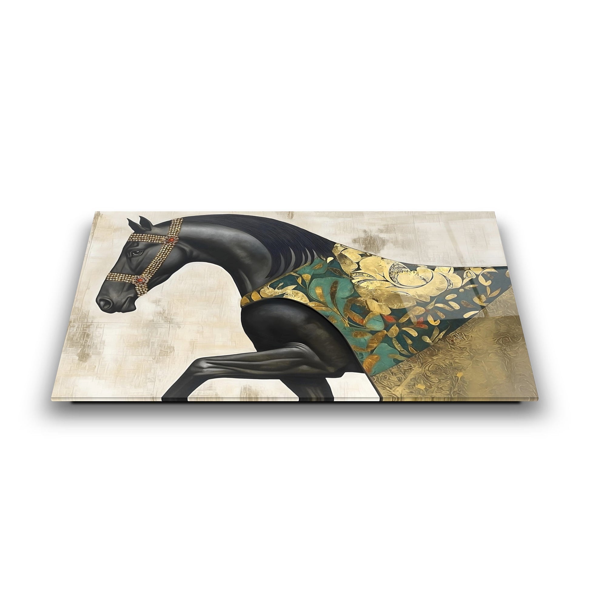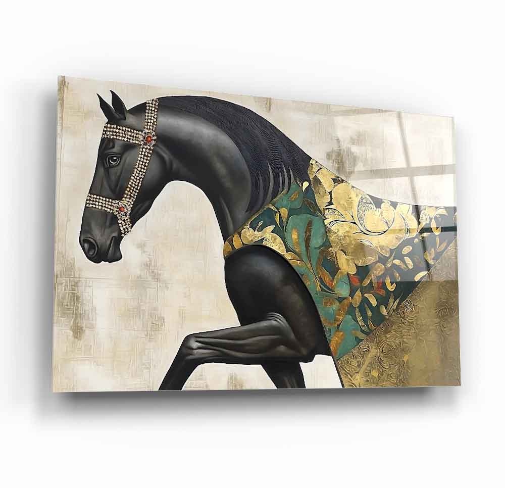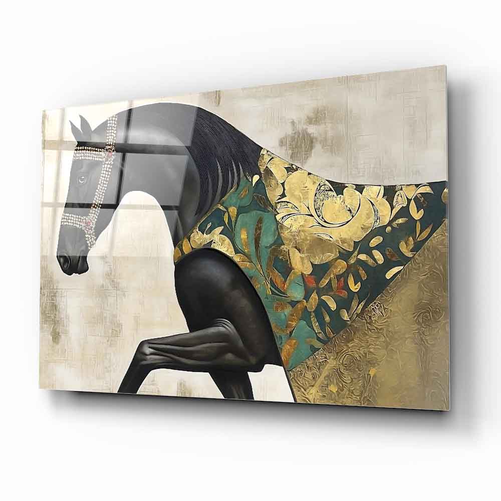 Bu büyüleyici cam tabloda; siyah zemin üzerine yerleştirilmiş güçlü pelerinli at figürü, gold ve yeşil tonlarda detaylarla dikkat çekiyor. Ayrıntılı kas çizgileri ve kabartmalı dokular tabloya derinlik ve karakter katıyor. UV baskı teknolojisi sayesinde renkler uzun süre canlı kalırken, temperli cam yapısı sağlamlık sunuyor. Çerçevesiz ve modern tasarımı ile salon, ofis ya da antre dekorasyonlarınıza sofistike ve sanatsal bir hava katmak isteyenler için ideal bir tercih.