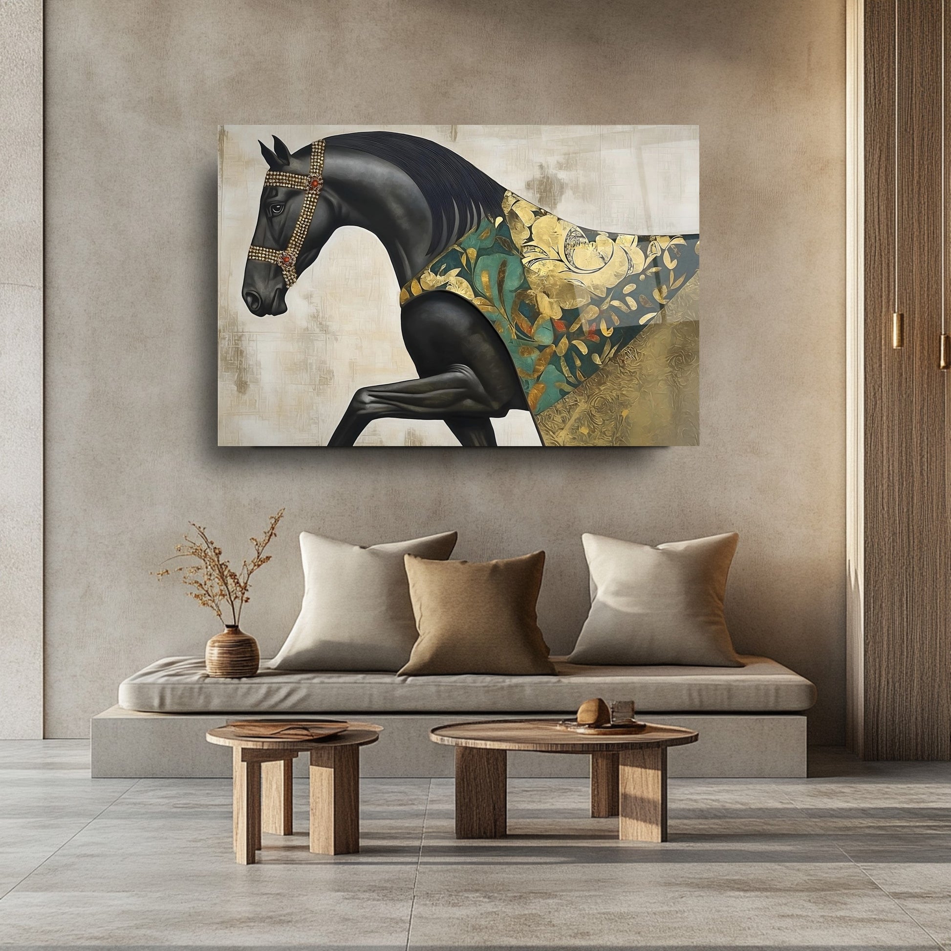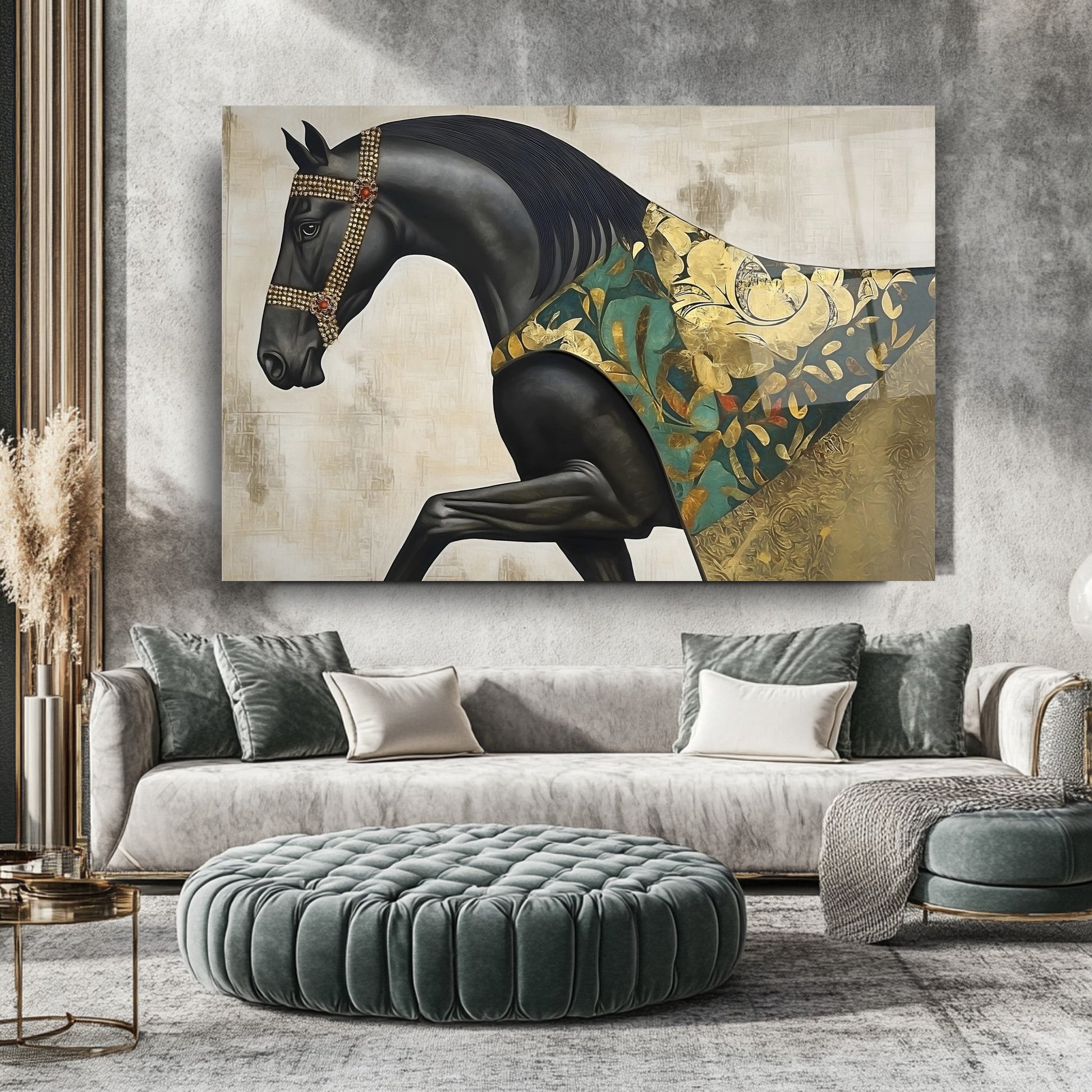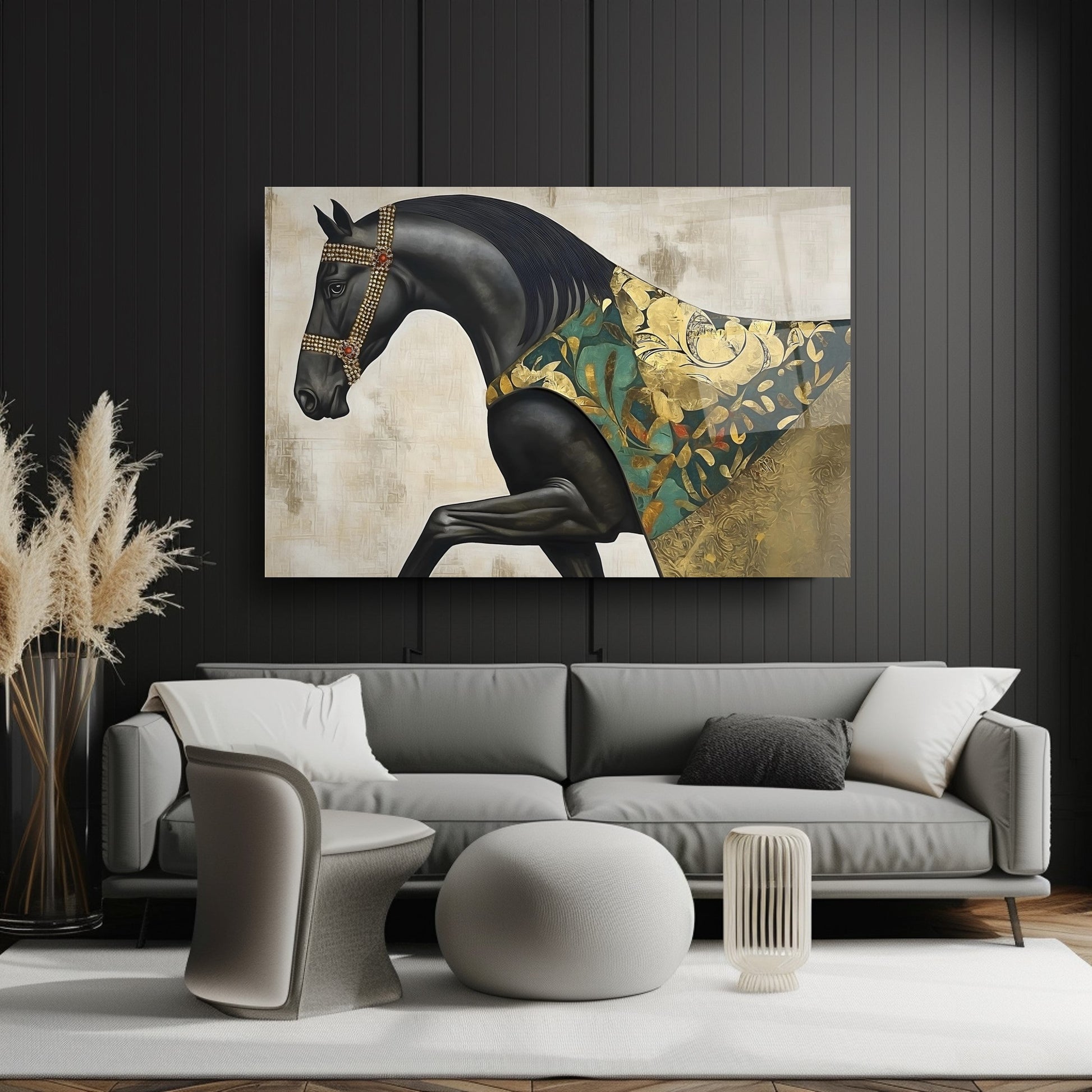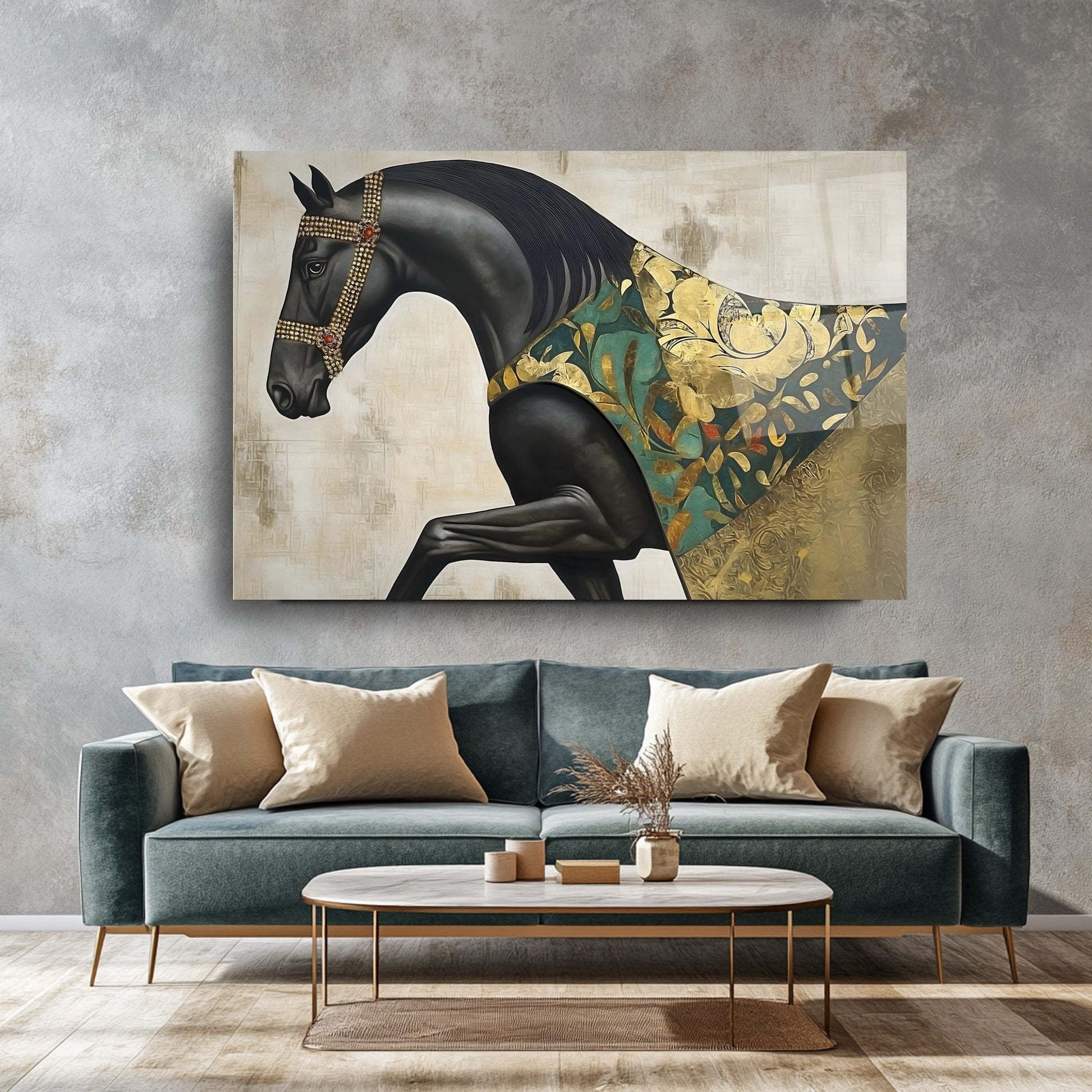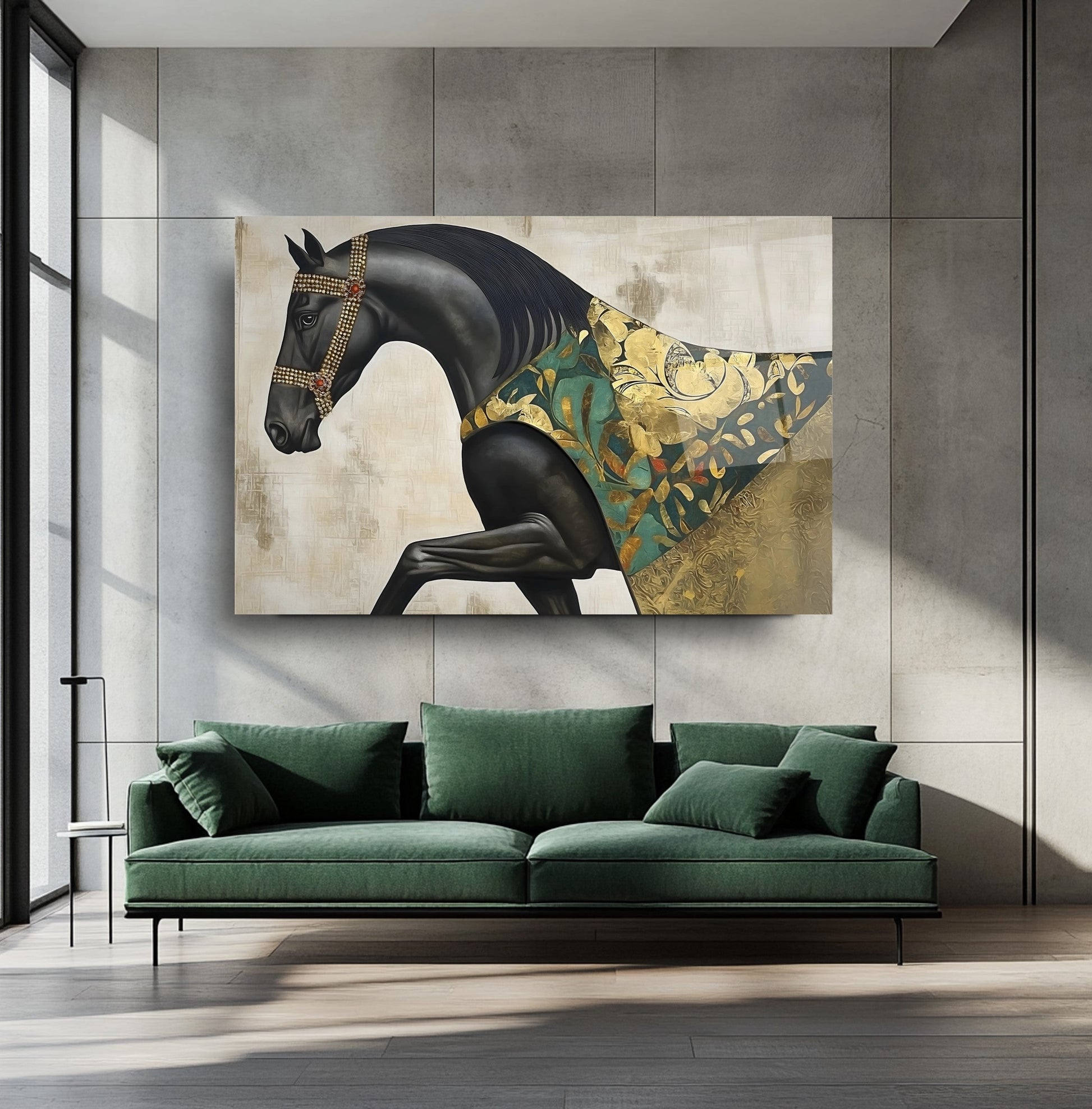 Bu büyüleyici cam tabloda; siyah zemin üzerine yerleştirilmiş güçlü pelerinli at figürü, gold ve yeşil tonlarda detaylarla dikkat çekiyor. Ayrıntılı kas çizgileri ve kabartmalı dokular tabloya derinlik ve karakter katıyor. UV baskı teknolojisi sayesinde renkler uzun süre canlı kalırken, temperli cam yapısı sağlamlık sunuyor. Çerçevesiz ve modern tasarımı ile salon, ofis ya da antre dekorasyonlarınıza sofistike ve sanatsal bir hava katmak isteyenler için ideal bir tercih.