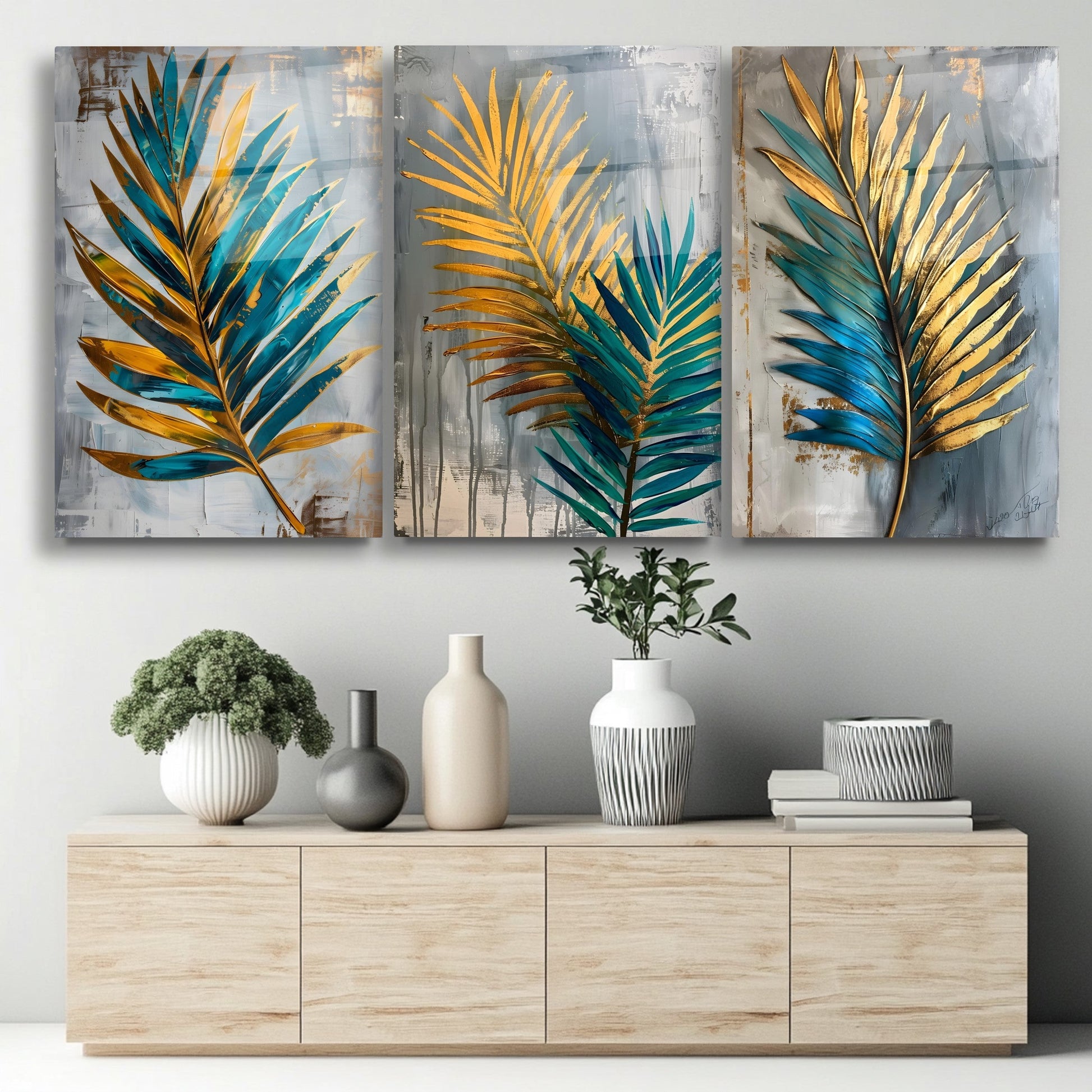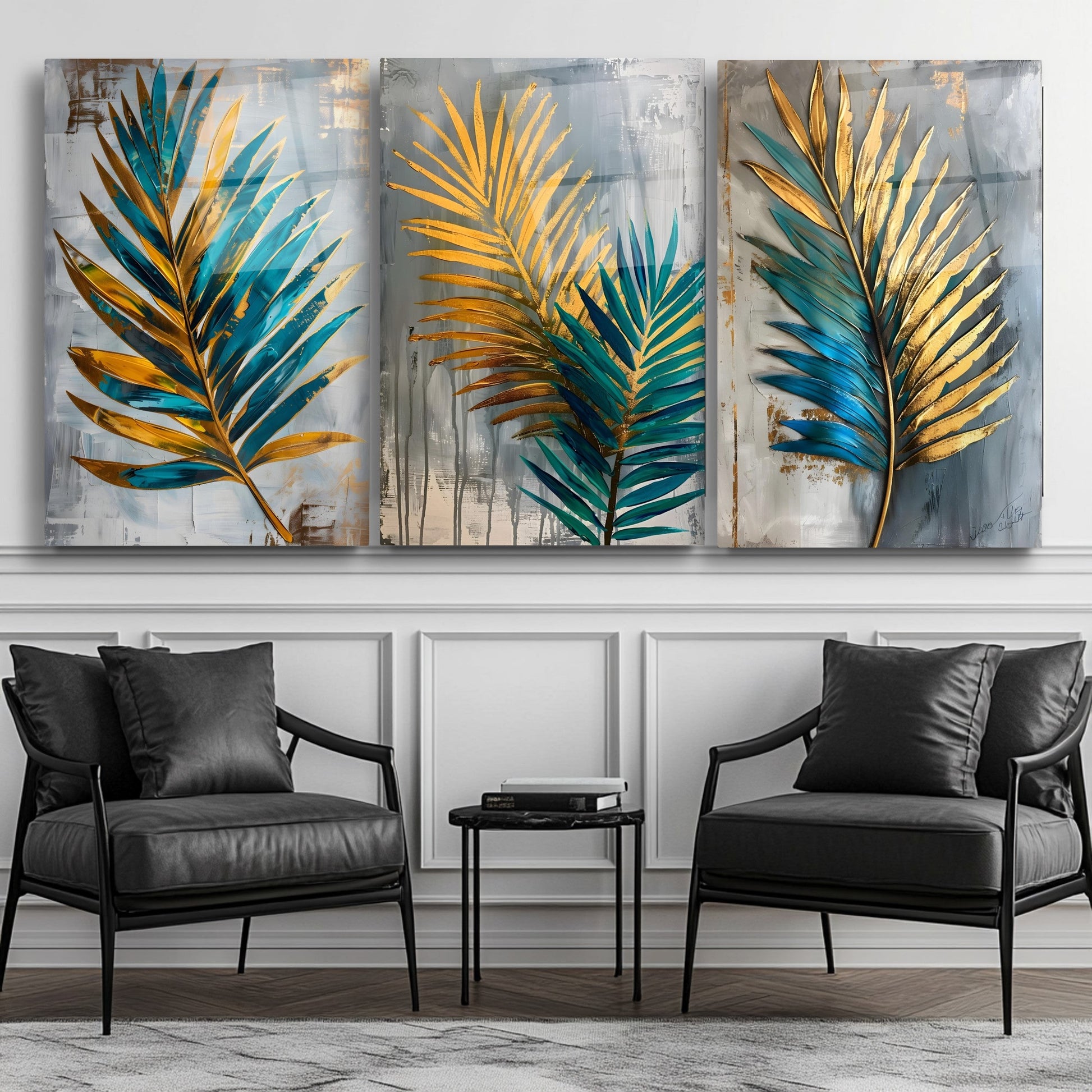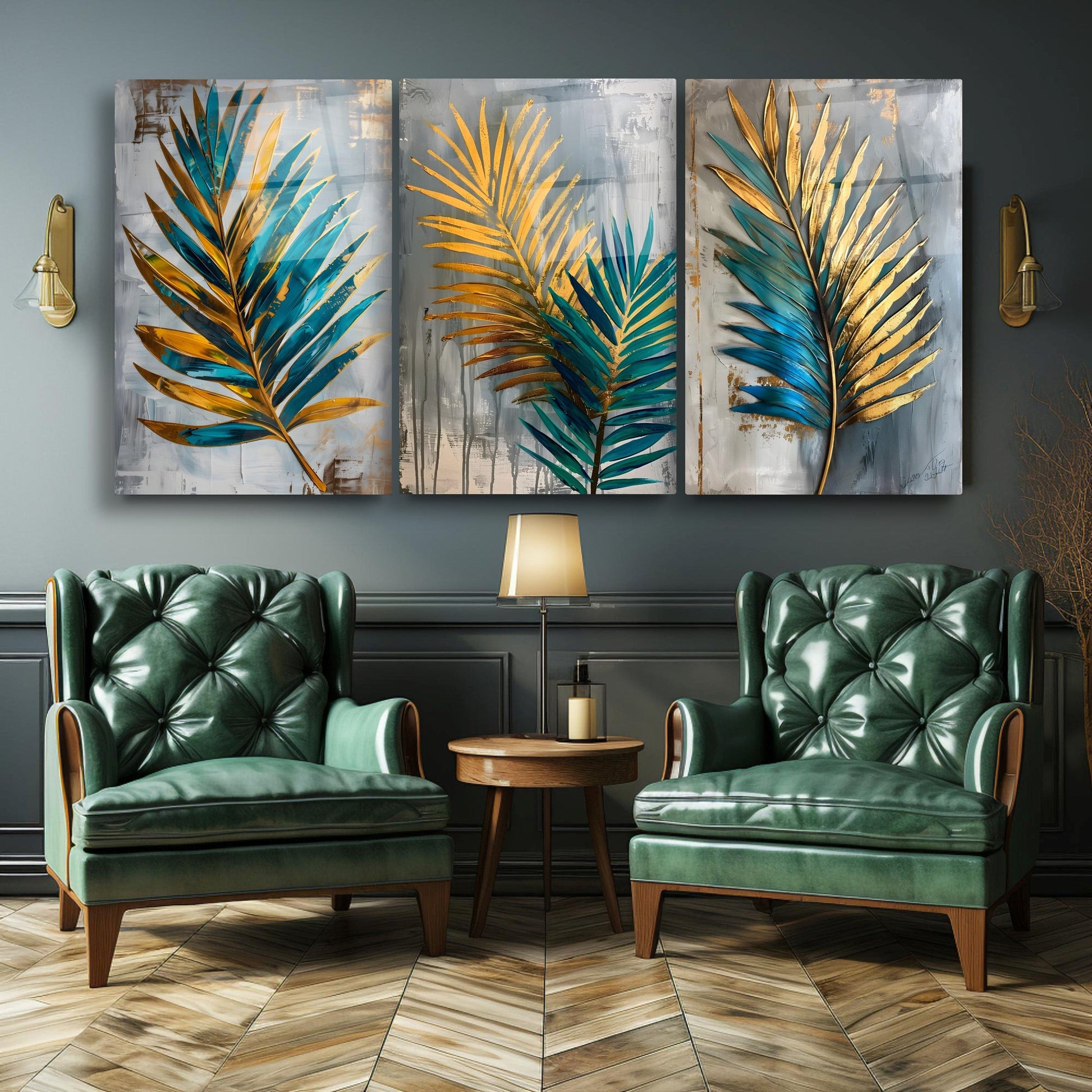 Yesil Gold Palmiye Yaprakları Üçlü Set Cam Tablo