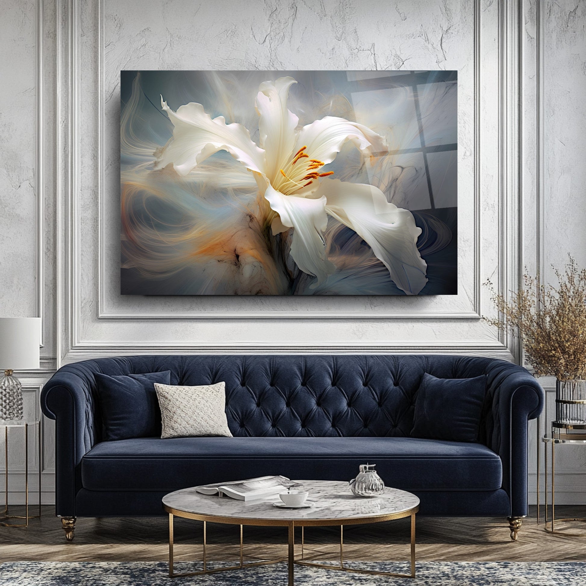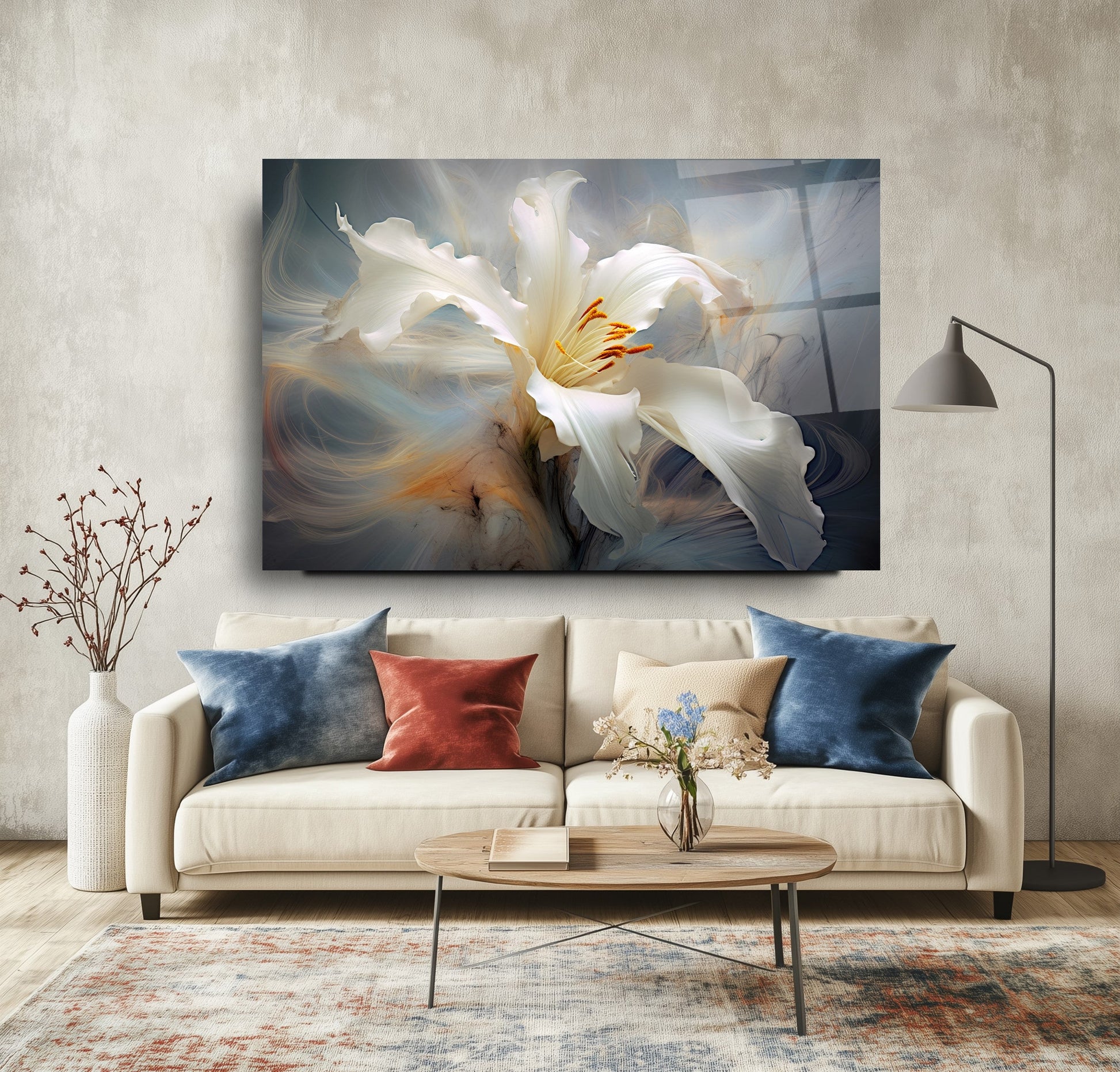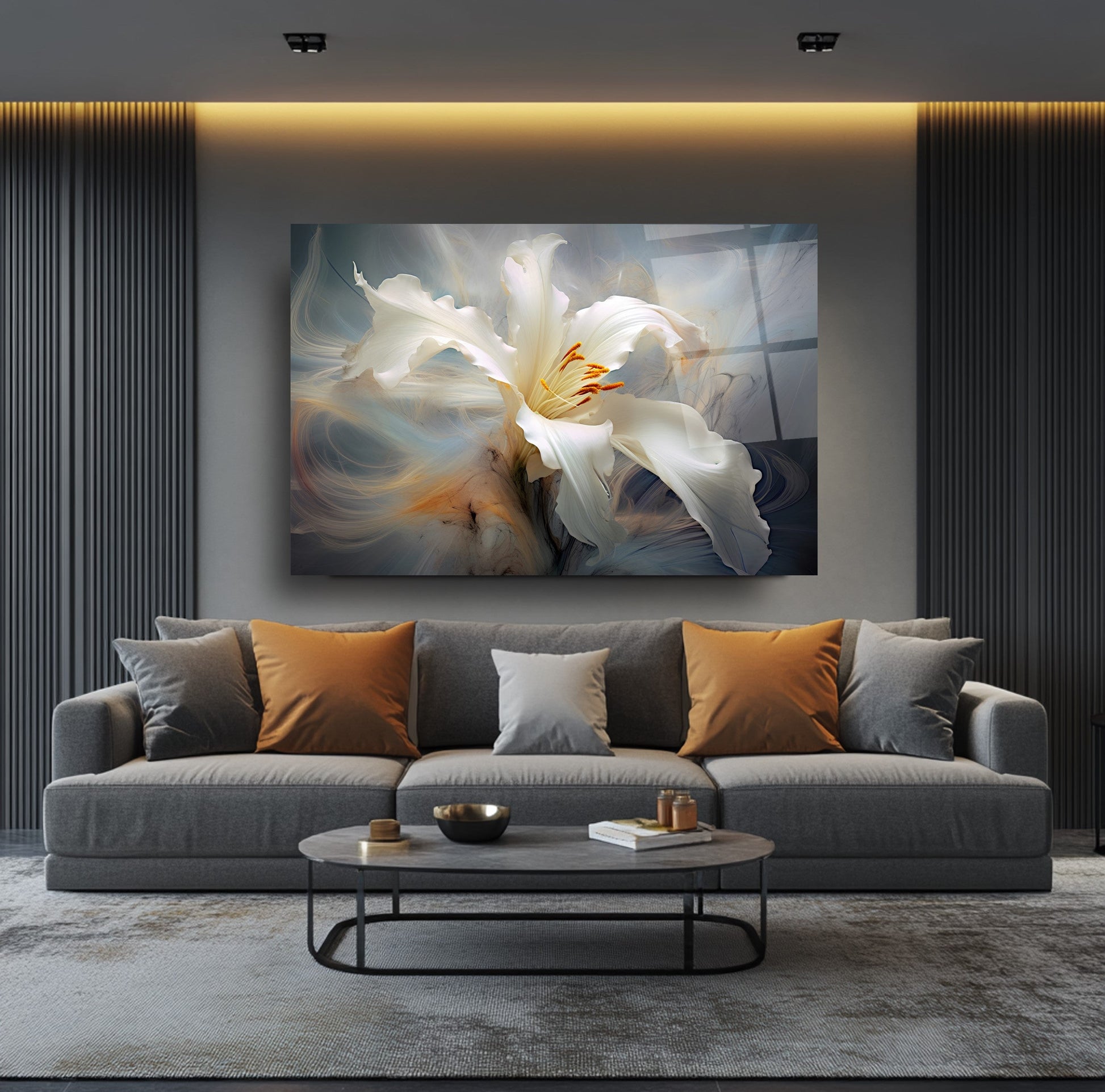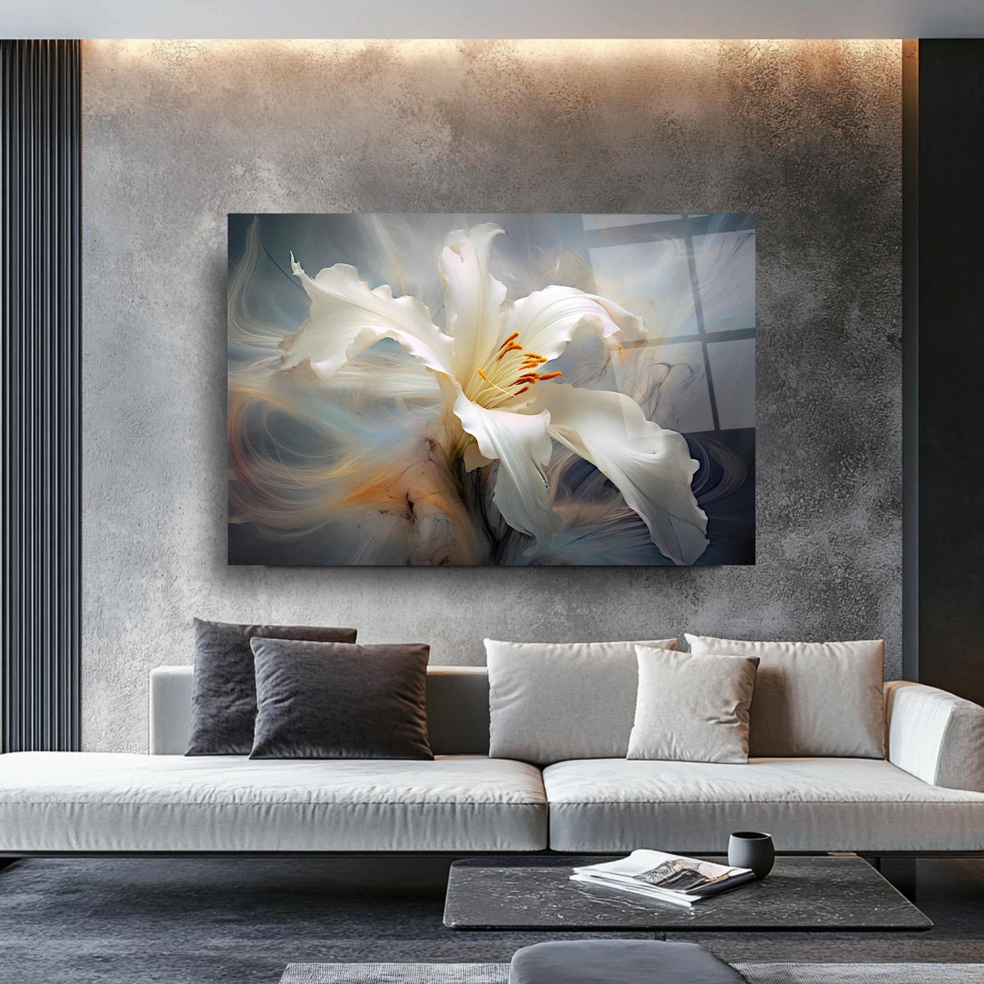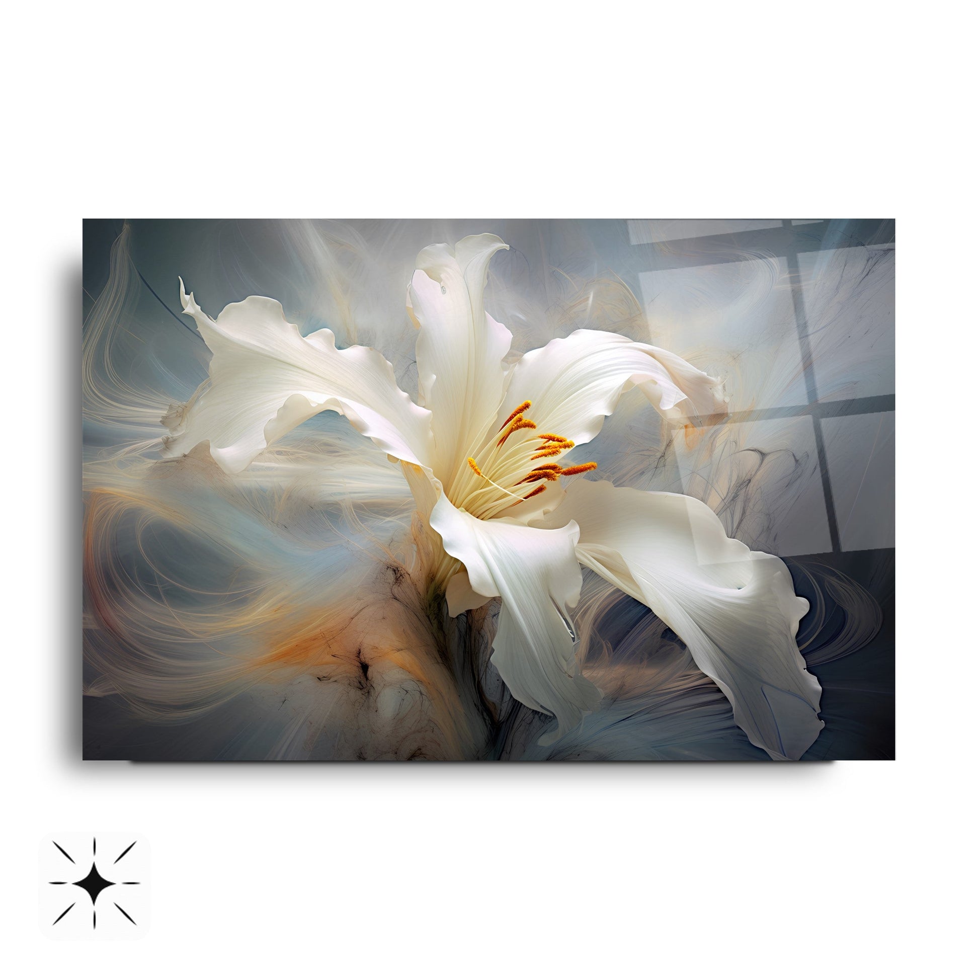 Gri arka plan ve duman efektiyle hareketlenen beyaz turuncu çiçek figürü, bu gerçek cam tabloya zarif bir derinlik kazandırır. Kırılmaz temperli cam tablo yapısıyla hem dayanıklı hem estetik bir dekorasyon seçeneğidir. Modern ve şık mekanlarda estetik bir vurgu arayanlar için ideal bir cam tablo tercihidir.