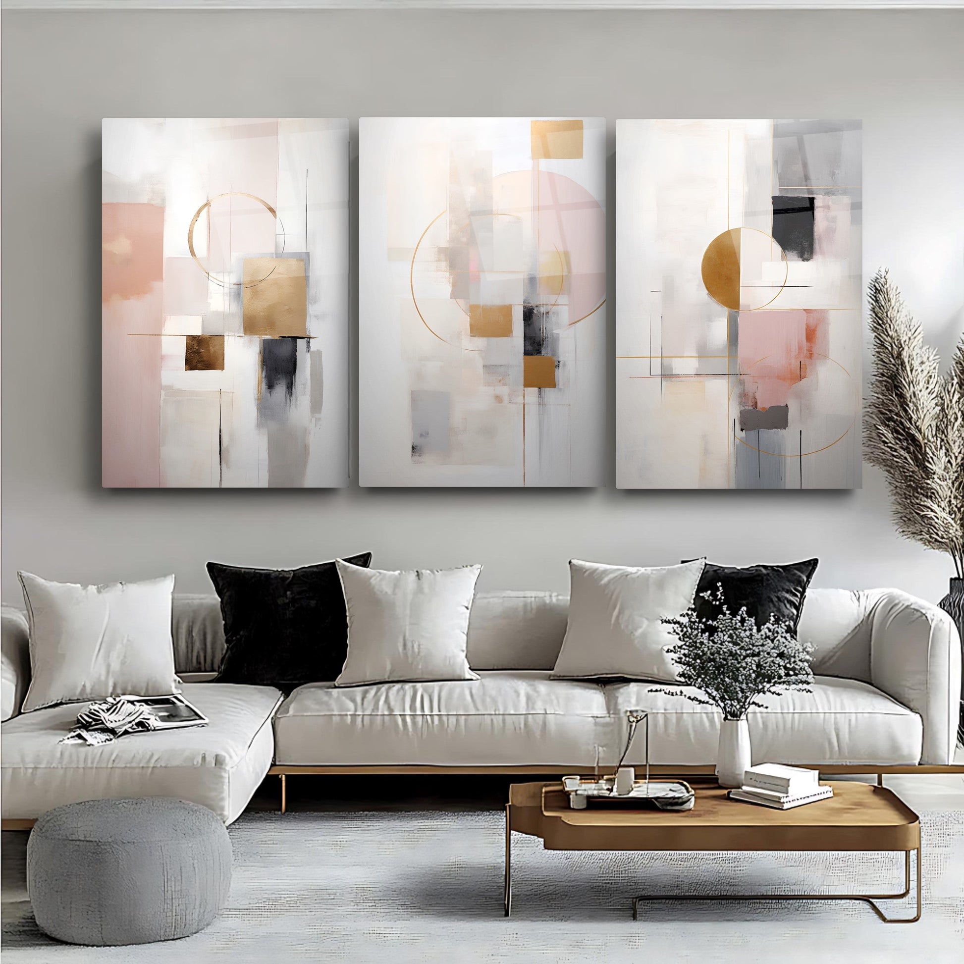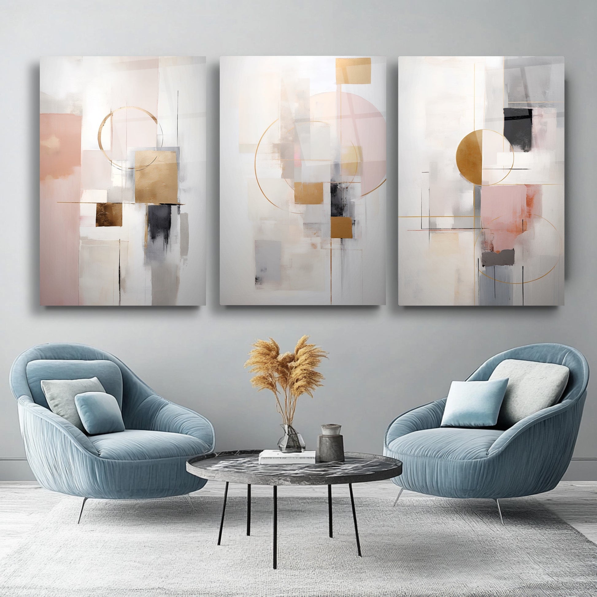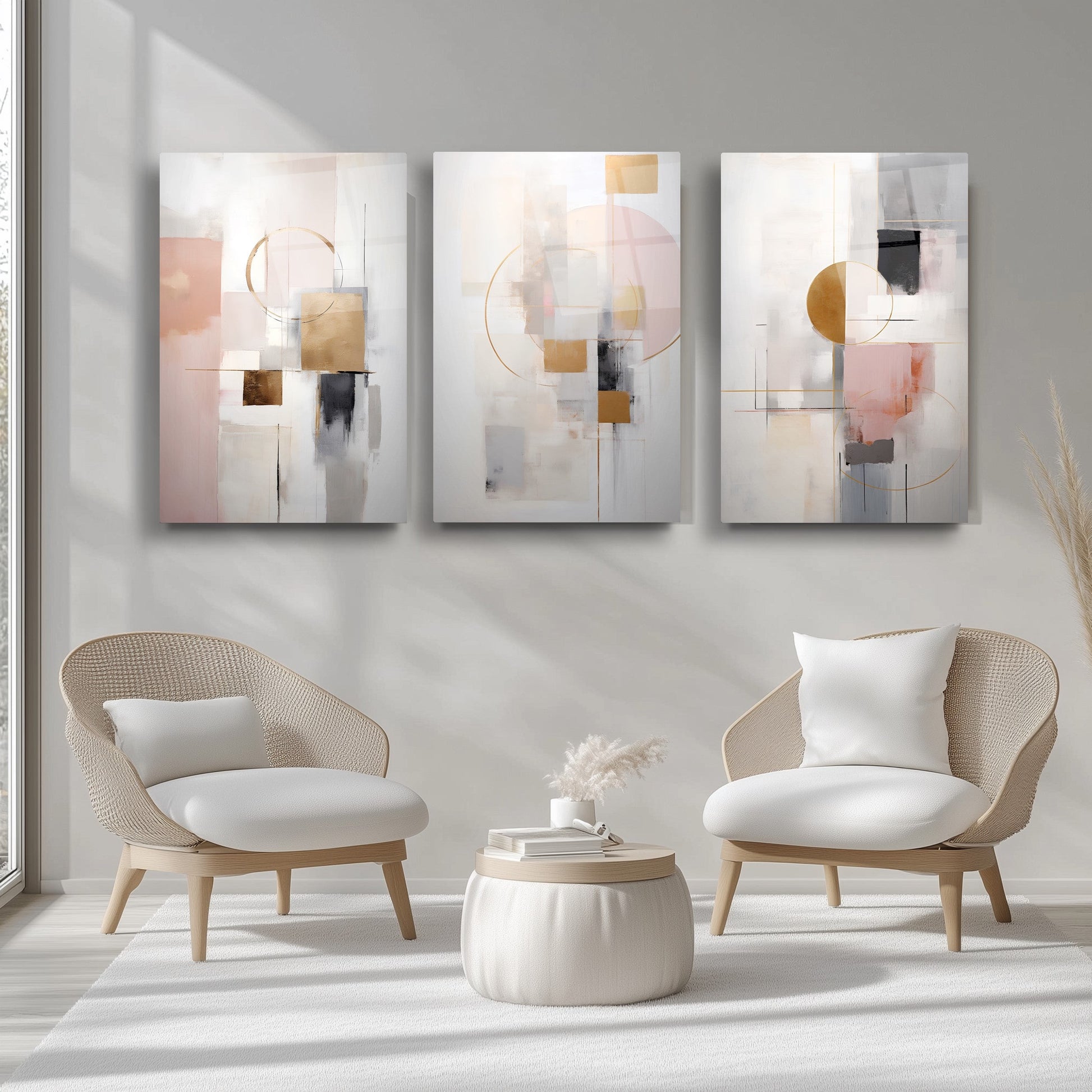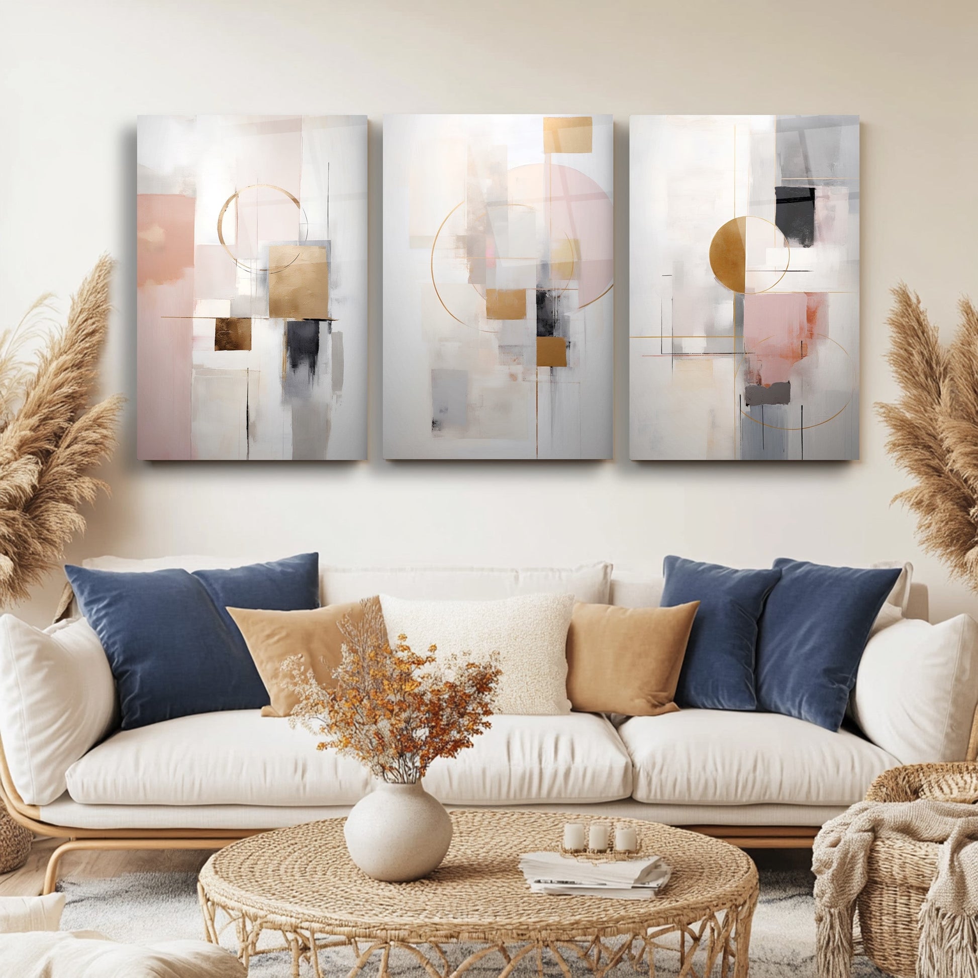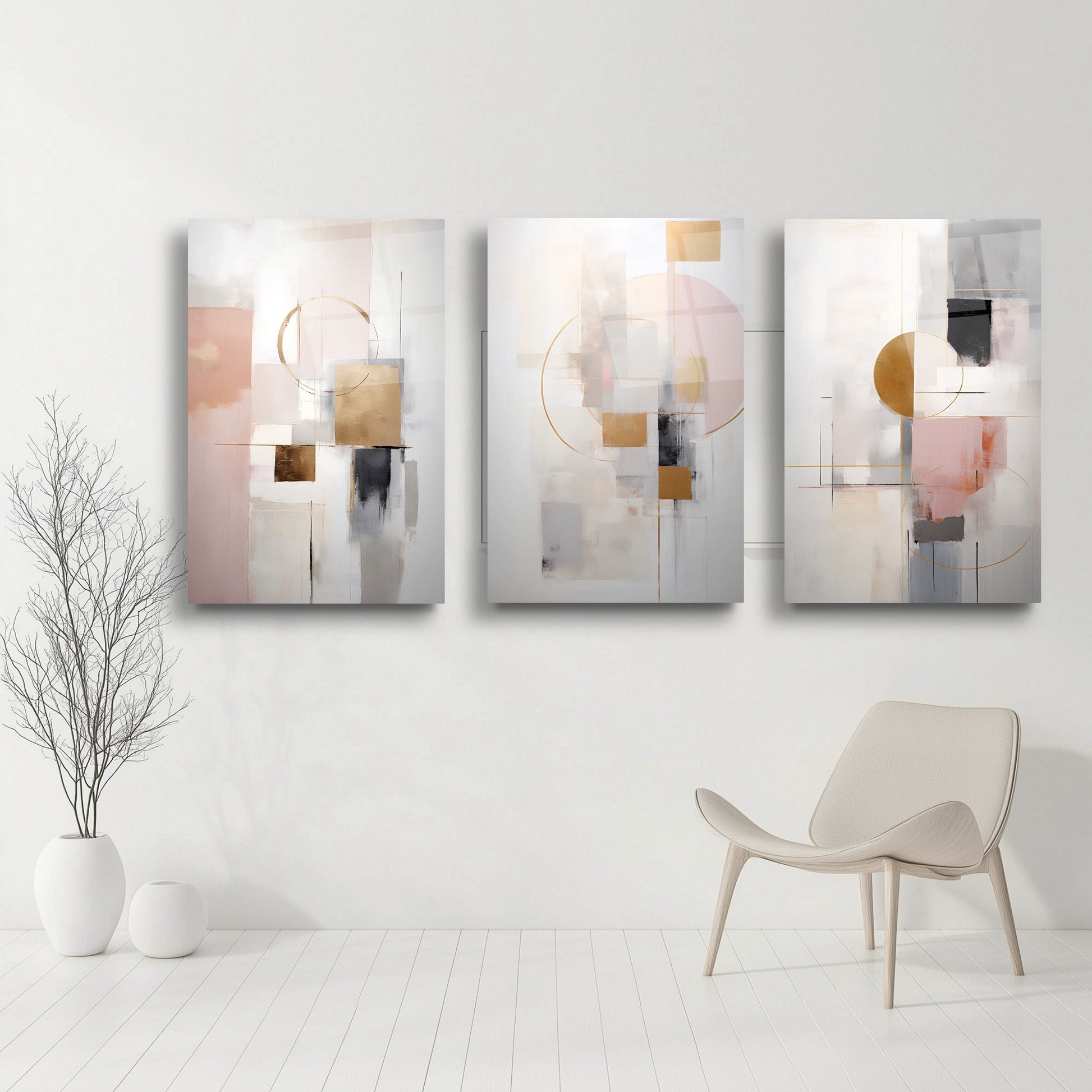 Gri zemin üzerinde gold, siyah ve pembe renklerle oluşturulan soyut boho desenler, bu kırılmaz cam tablo üçlü setiyle modern mekanlara estetik bir yorum kazandırır. Minimal çizgileriyle göz yormadan dikkat çeker. Dayanıklı cam yüzeyi uzun ömürlü kullanım sunar. Zarif ve dengeli kompozisyonuyla nordik ve çağdaş dekorasyonlar için ideal bir tamamlayıcıdır.