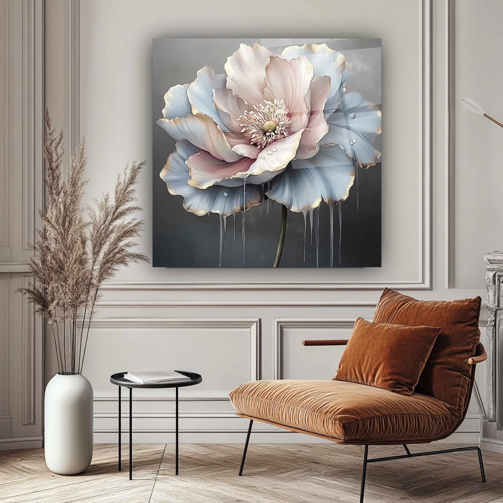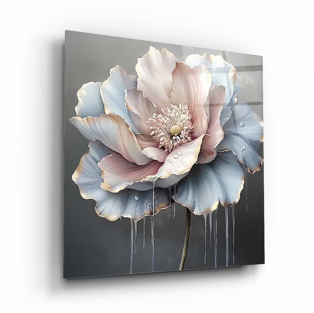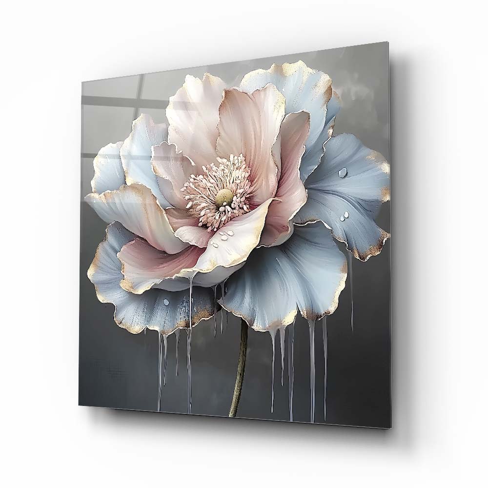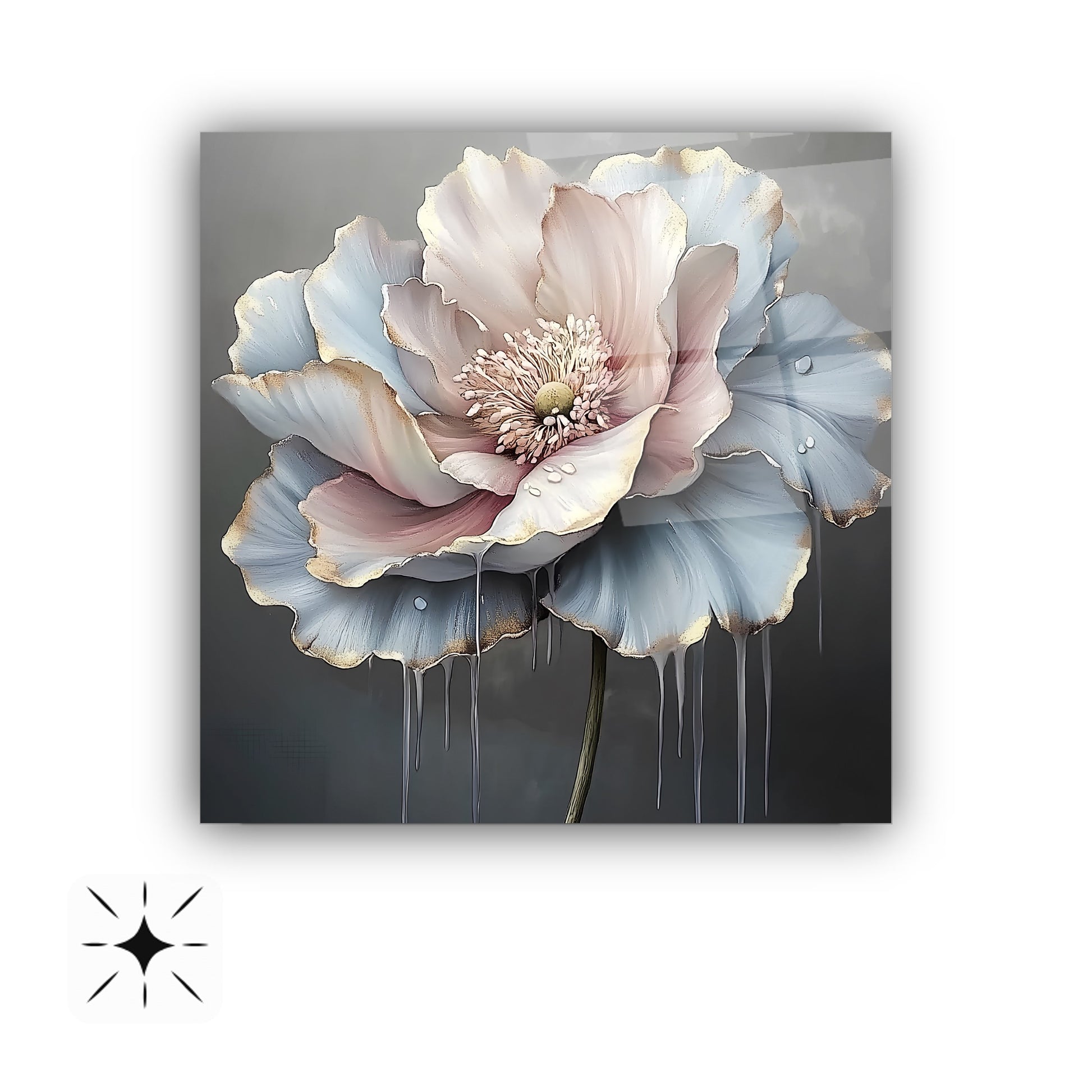 Gri zemin üzerinde mor, mavi ve beyaz detaylarla bezenmiş kabartmalı çiçekler, gold işlemelerle zarif bir bütünlük sunar. Bu gerçek cam tablo, yaşam alanlarına hem renk hem de şıklık katar. Kırılmaz cam tablo yapısıyla dayanıklı ve estetik bir dekorasyon seçeneğidir. Modern ve sofistike mekanlar için göz alıcı bir tercih sunar.