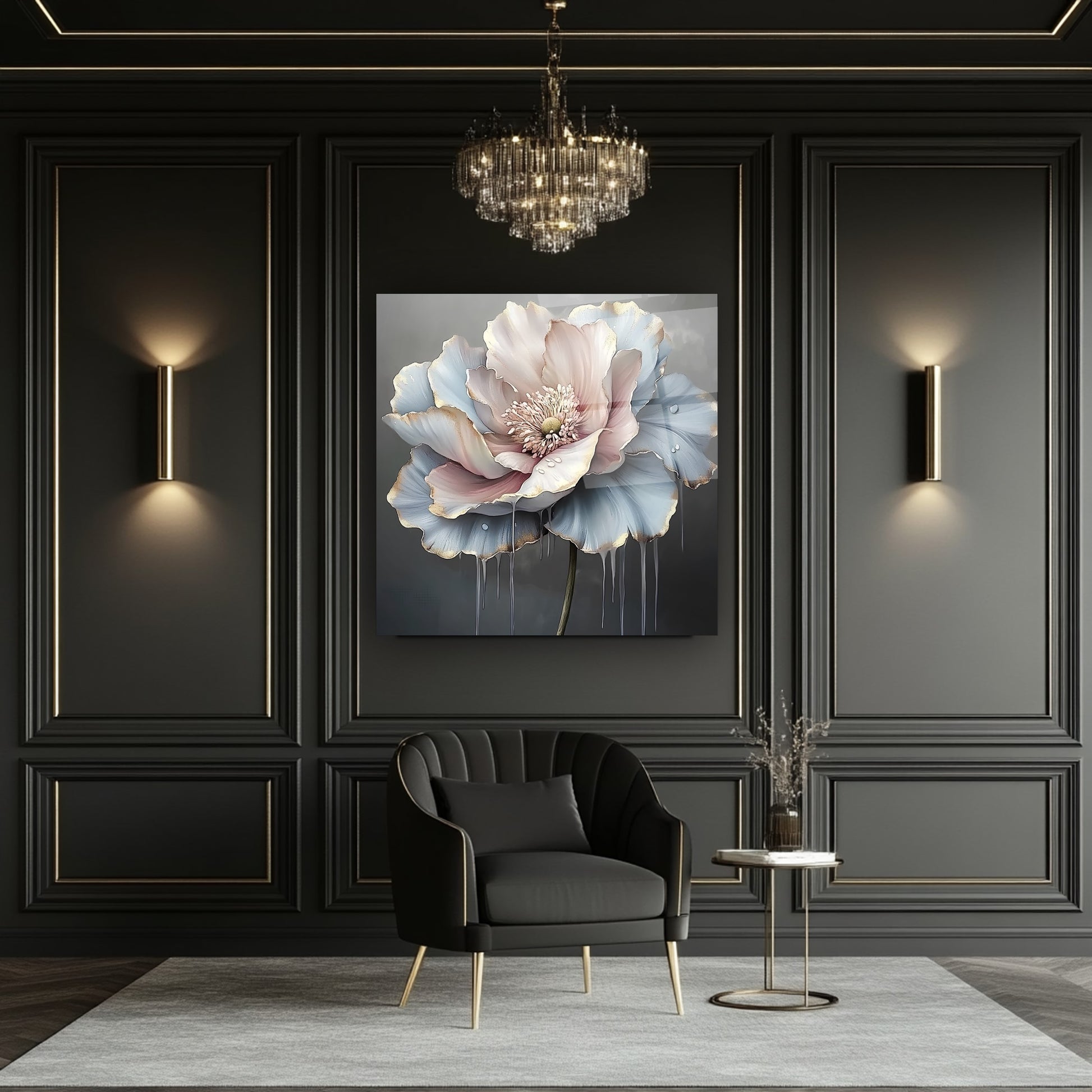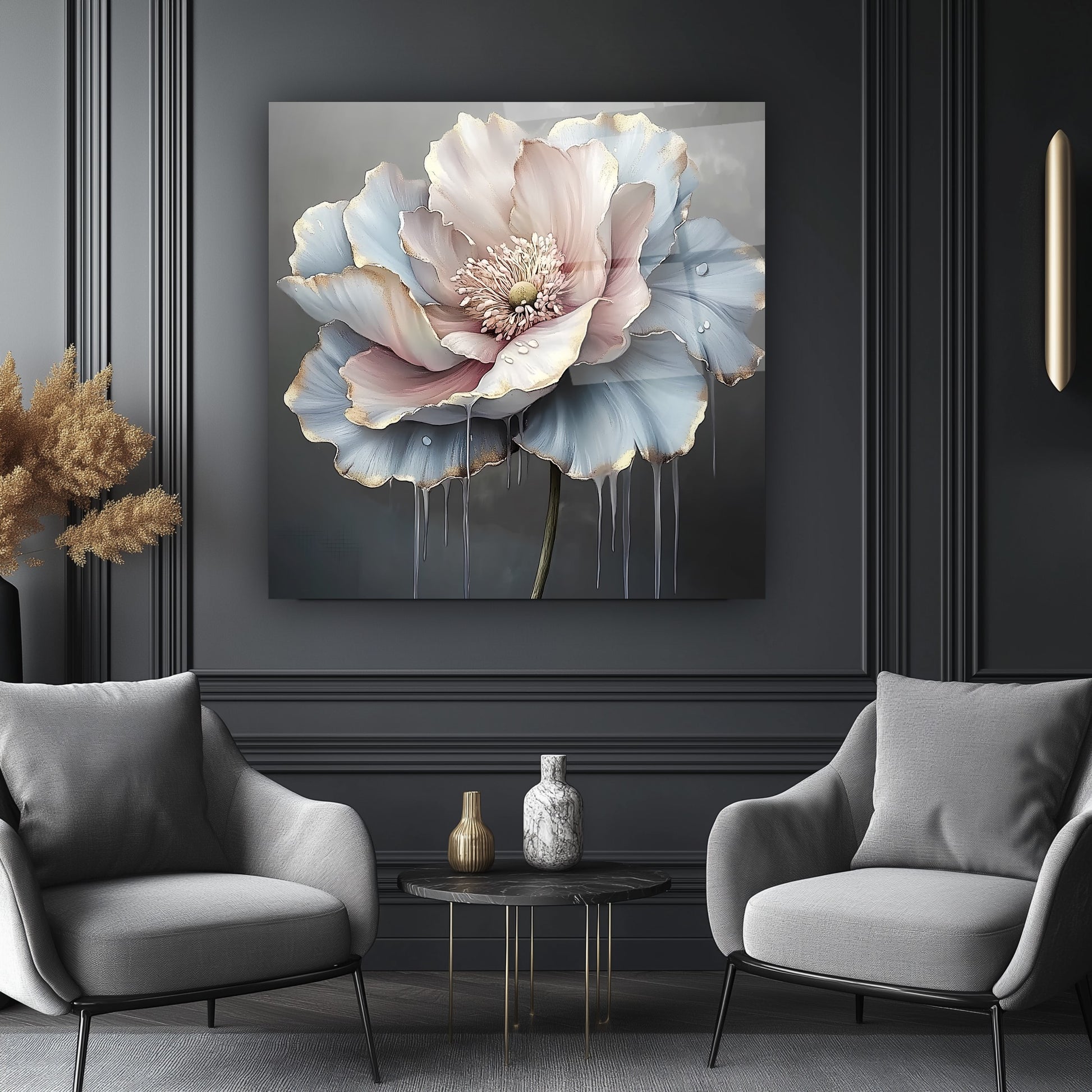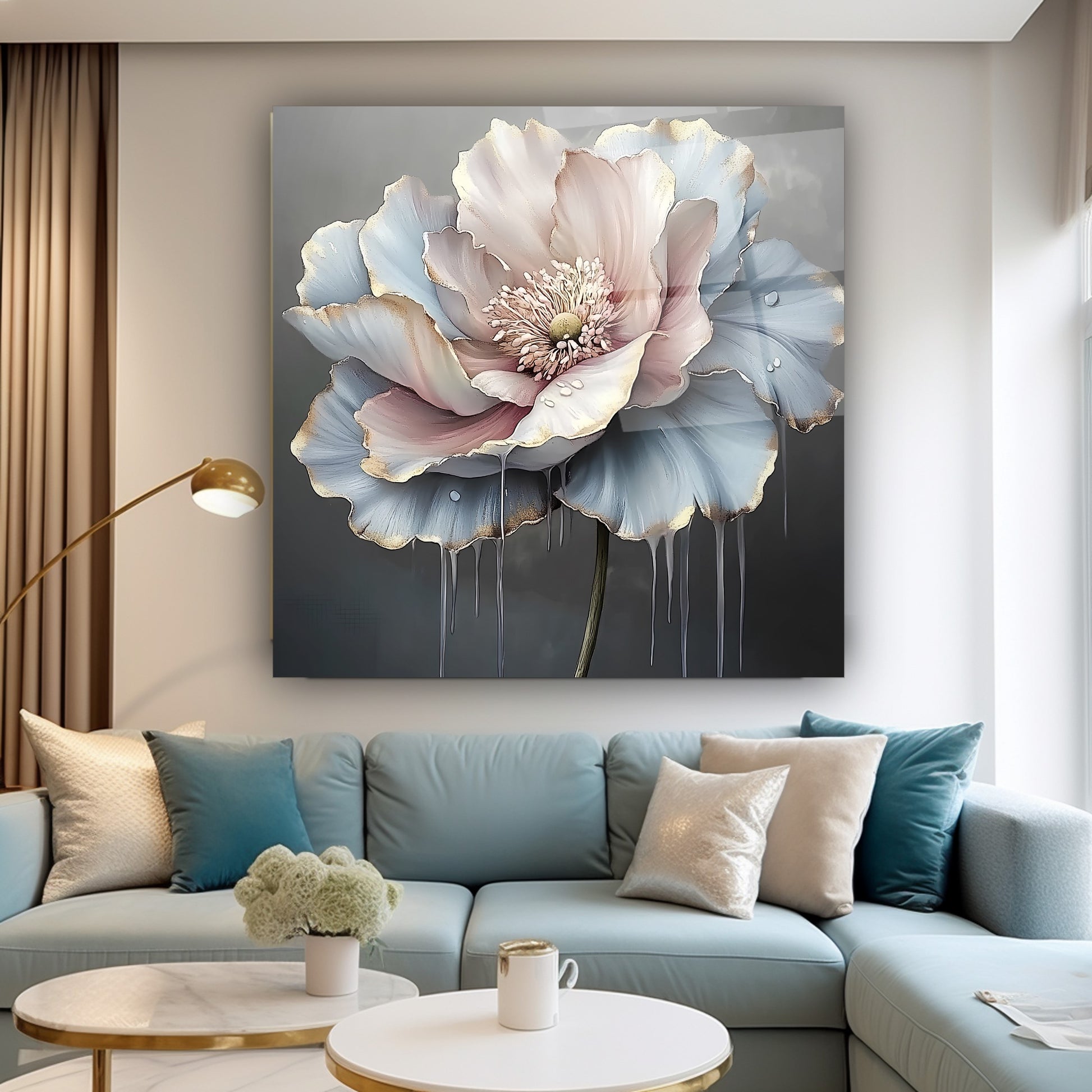 Gri zemin üzerinde mor, mavi ve beyaz detaylarla bezenmiş kabartmalı çiçekler, gold işlemelerle zarif bir bütünlük sunar. Bu gerçek cam tablo, yaşam alanlarına hem renk hem de şıklık katar. Kırılmaz cam tablo yapısıyla dayanıklı ve estetik bir dekorasyon seçeneğidir. Modern ve sofistike mekanlar için göz alıcı bir tercih sunar.