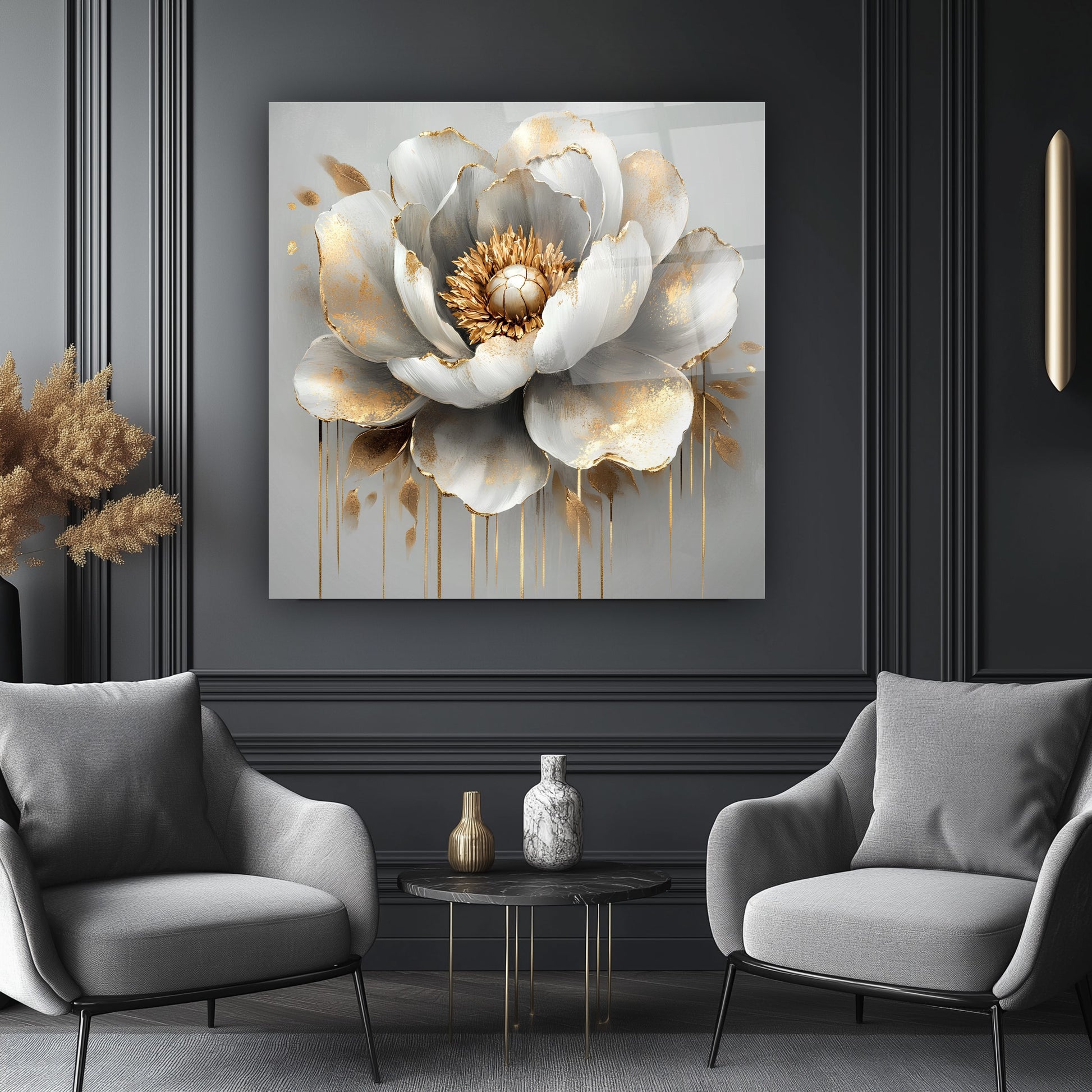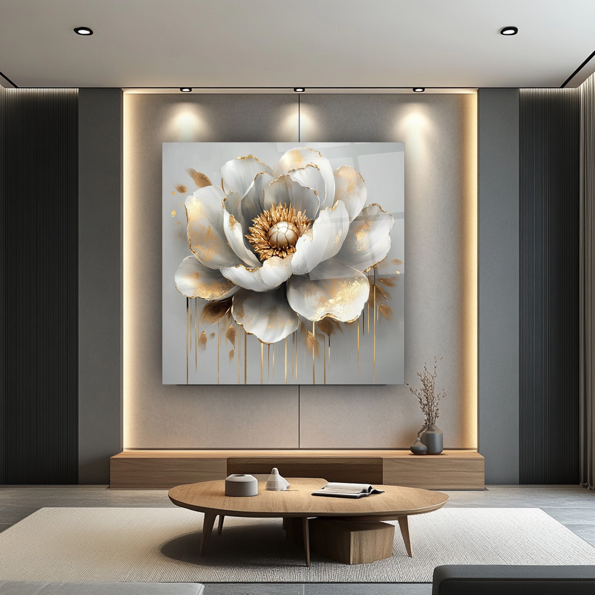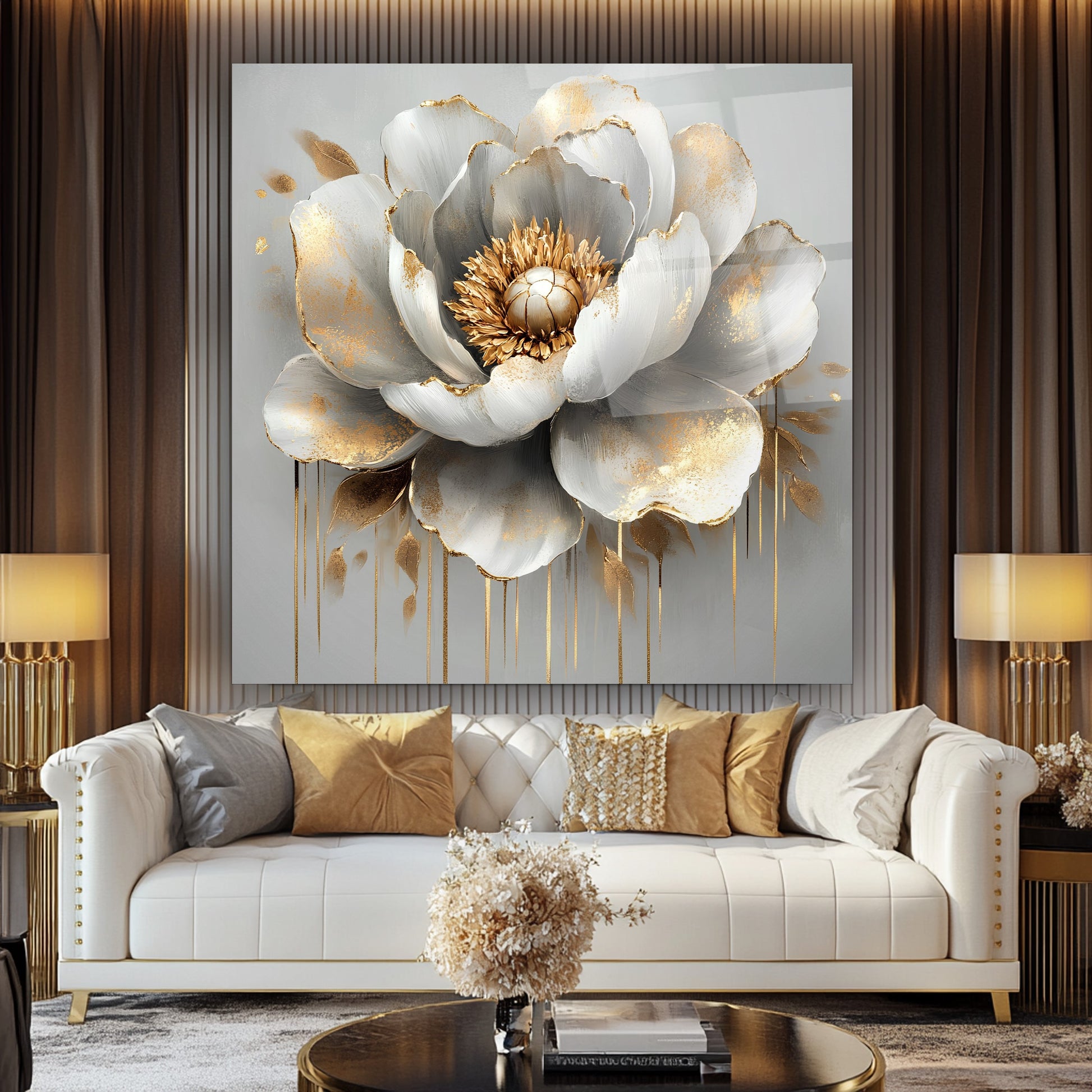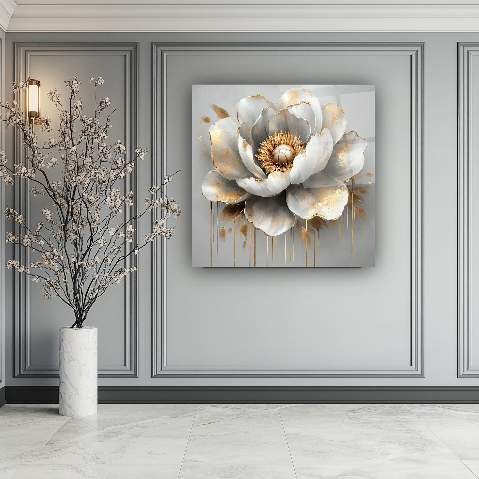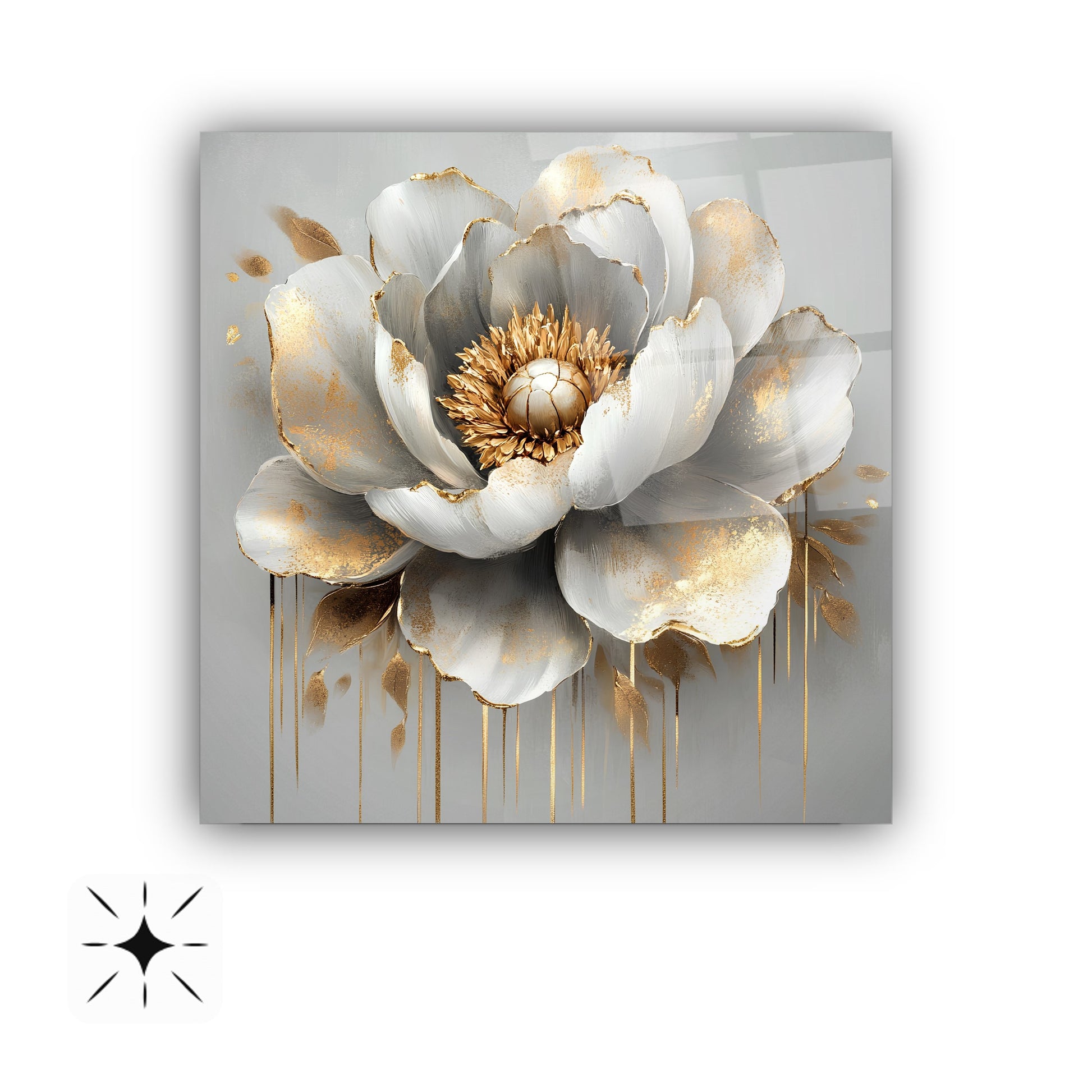 Gri zeminle bütünleşen gold detaylar ve kabartmalı beyaz çiçekler, bu gerçek cam tabloya zarif ve modern bir hava kazandırır. Derinlik hissi uyandıran tasarım, mekanlara estetik bir dokunuş sunar. Kırılmaz cam tablo yapısıyla hem şık hem uzun ömürlü bir dekorasyon seçeneğidir. Sade ve sofistike bir atmosfer arayanlar için ideal tercihtir.