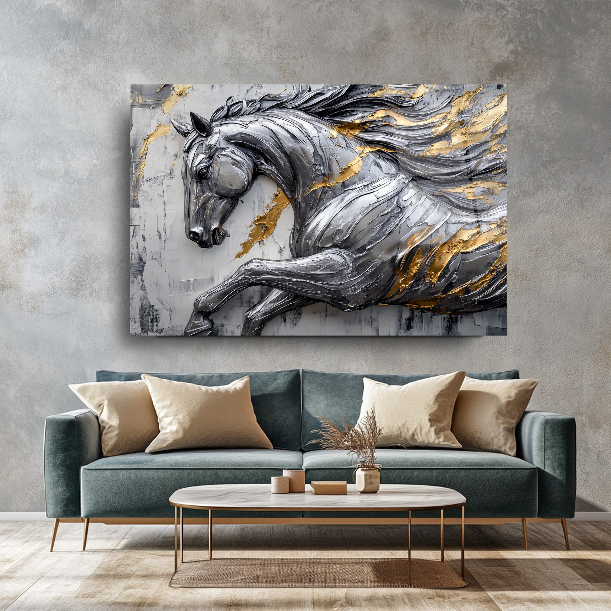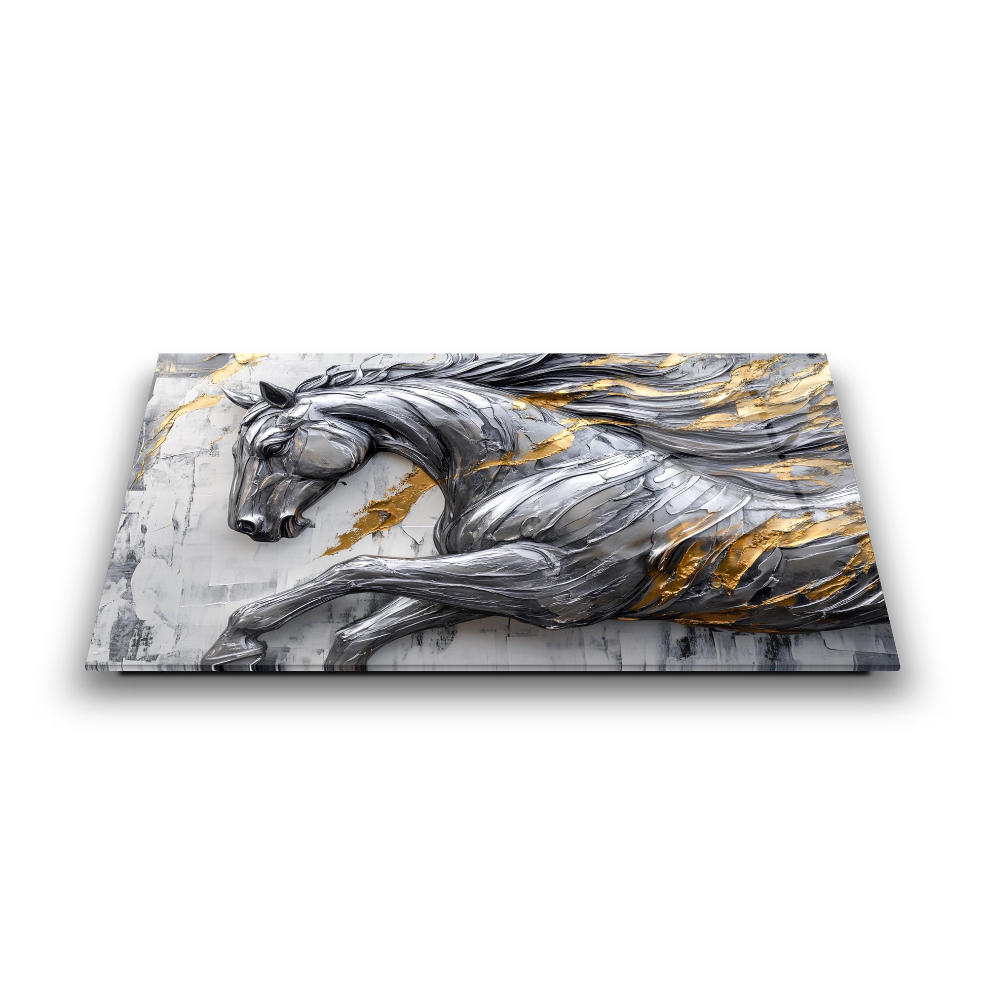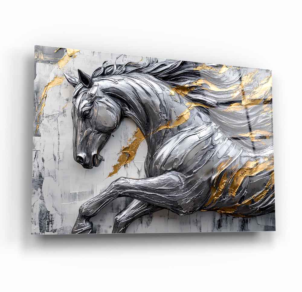 Asaletin ve Lüksün Yeni Boyutu: Gümüş Gold Detaylı Kabartma Efektli Şahlanan At Cam Tablo