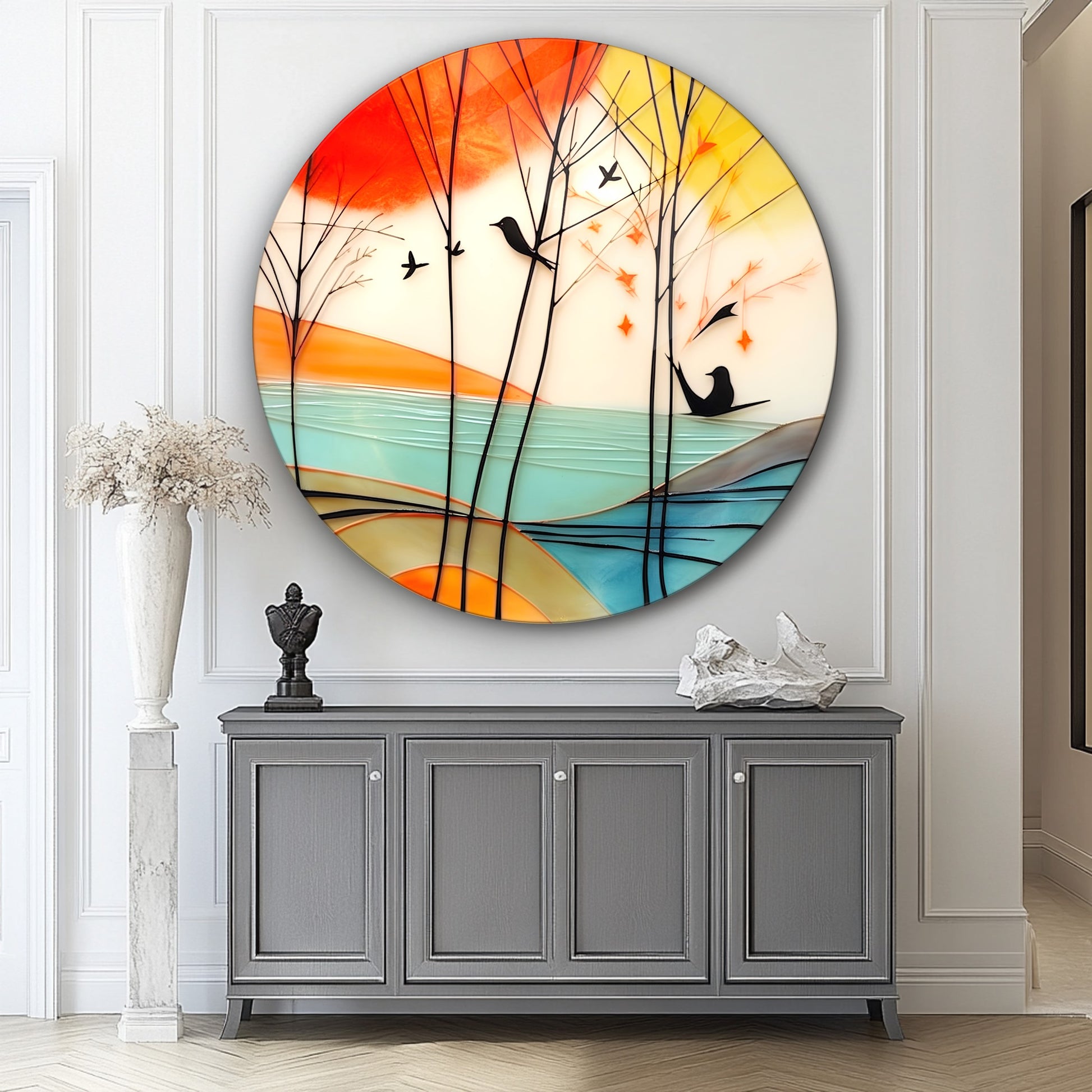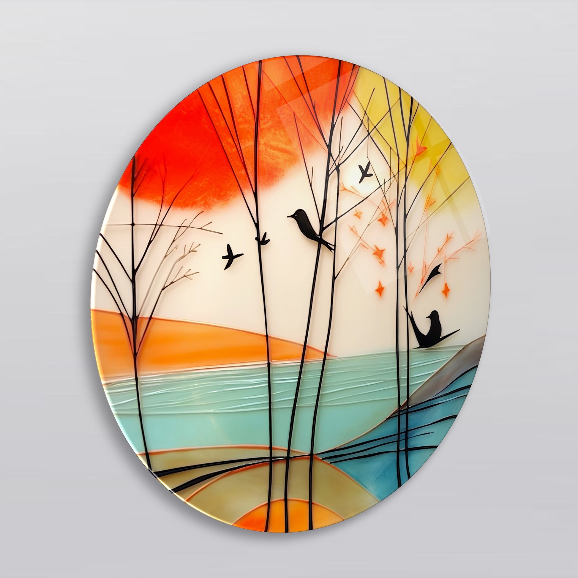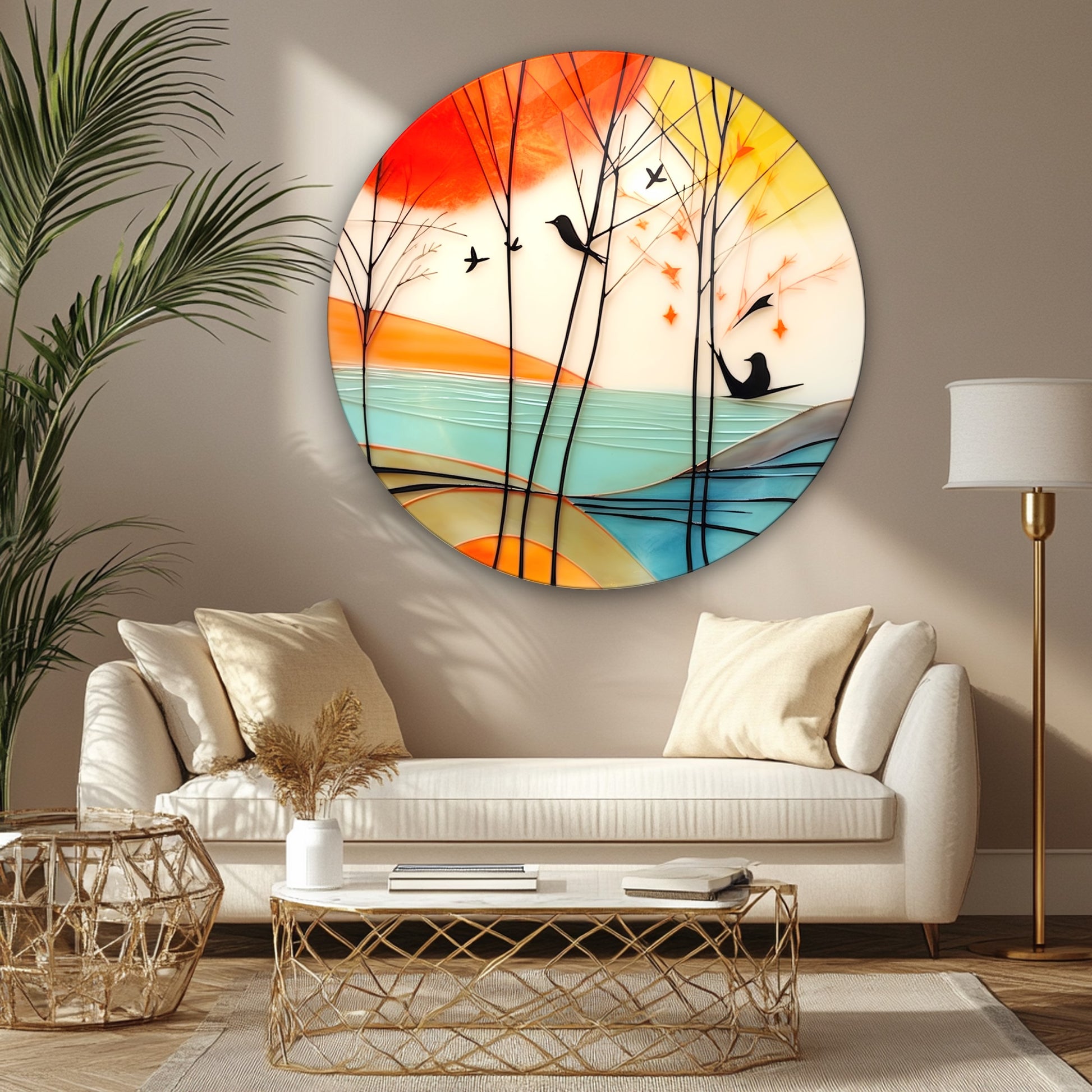Soyut Gün Batımı ve Kuşlar Yuvarlak Cam Tablo